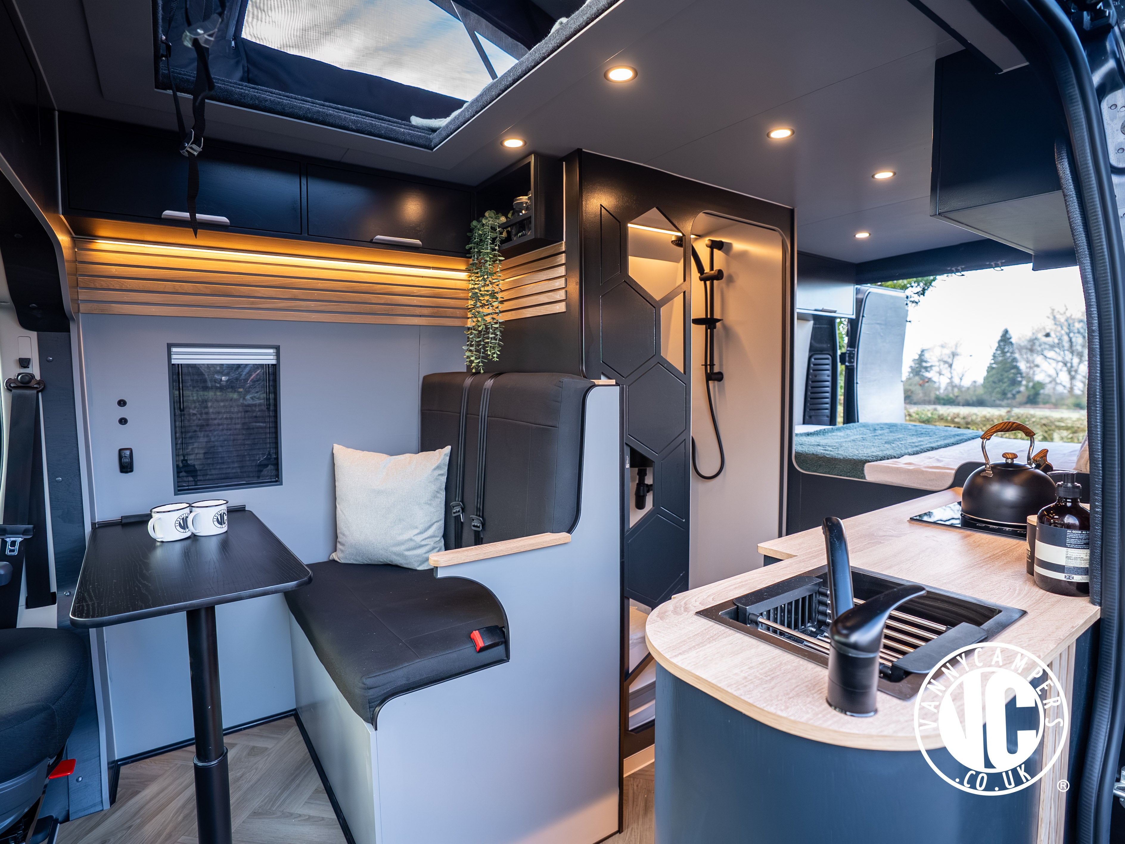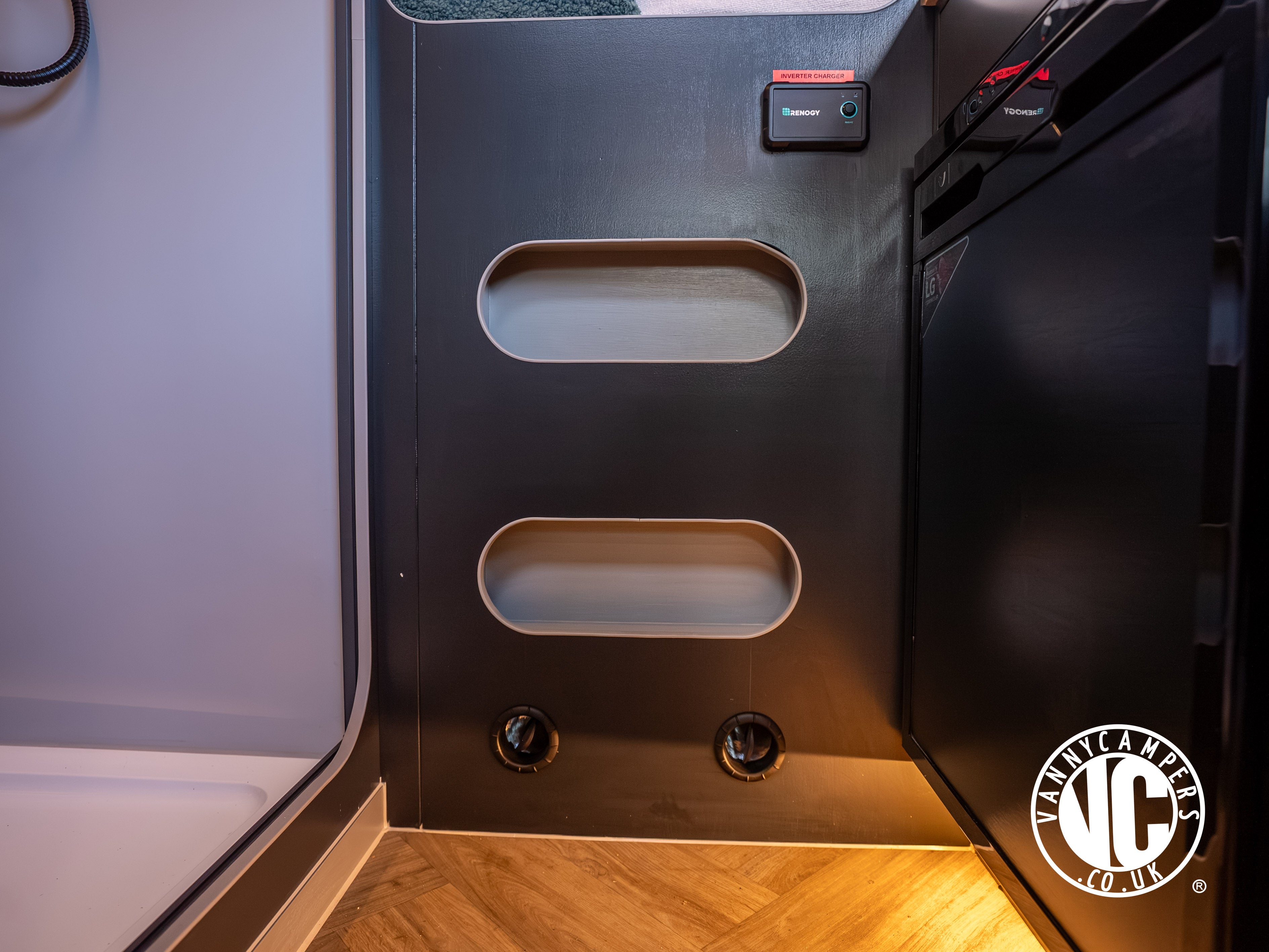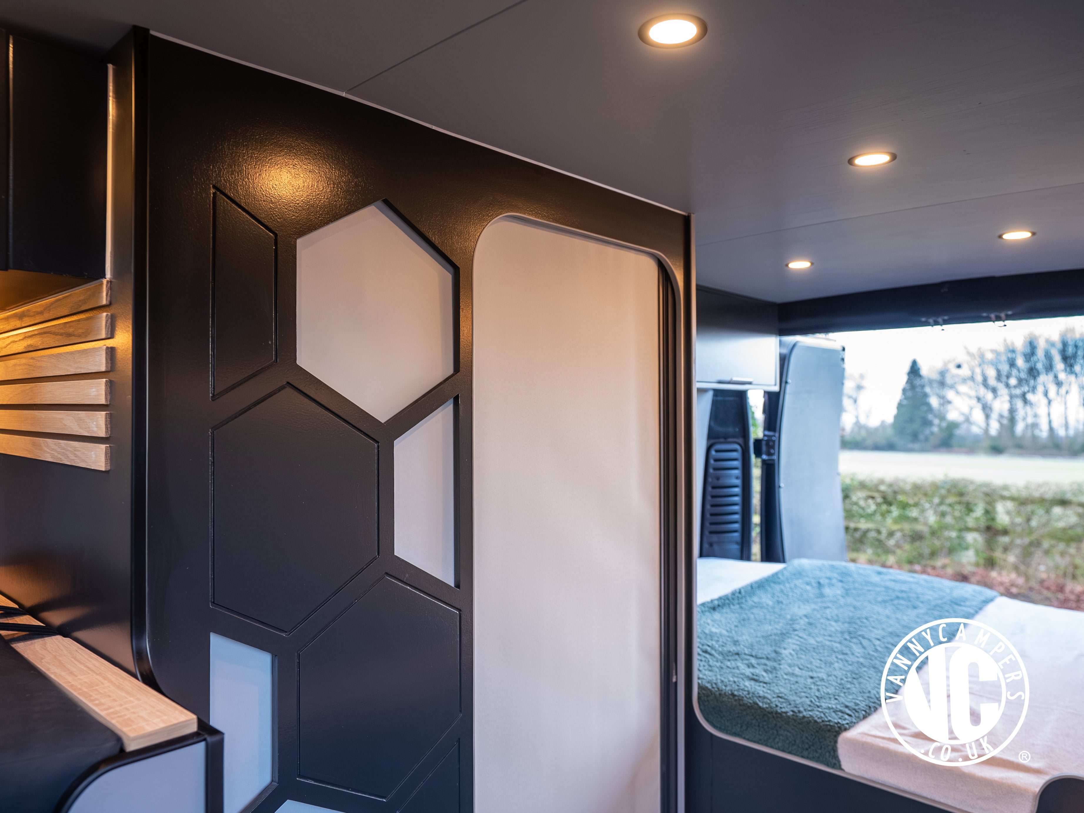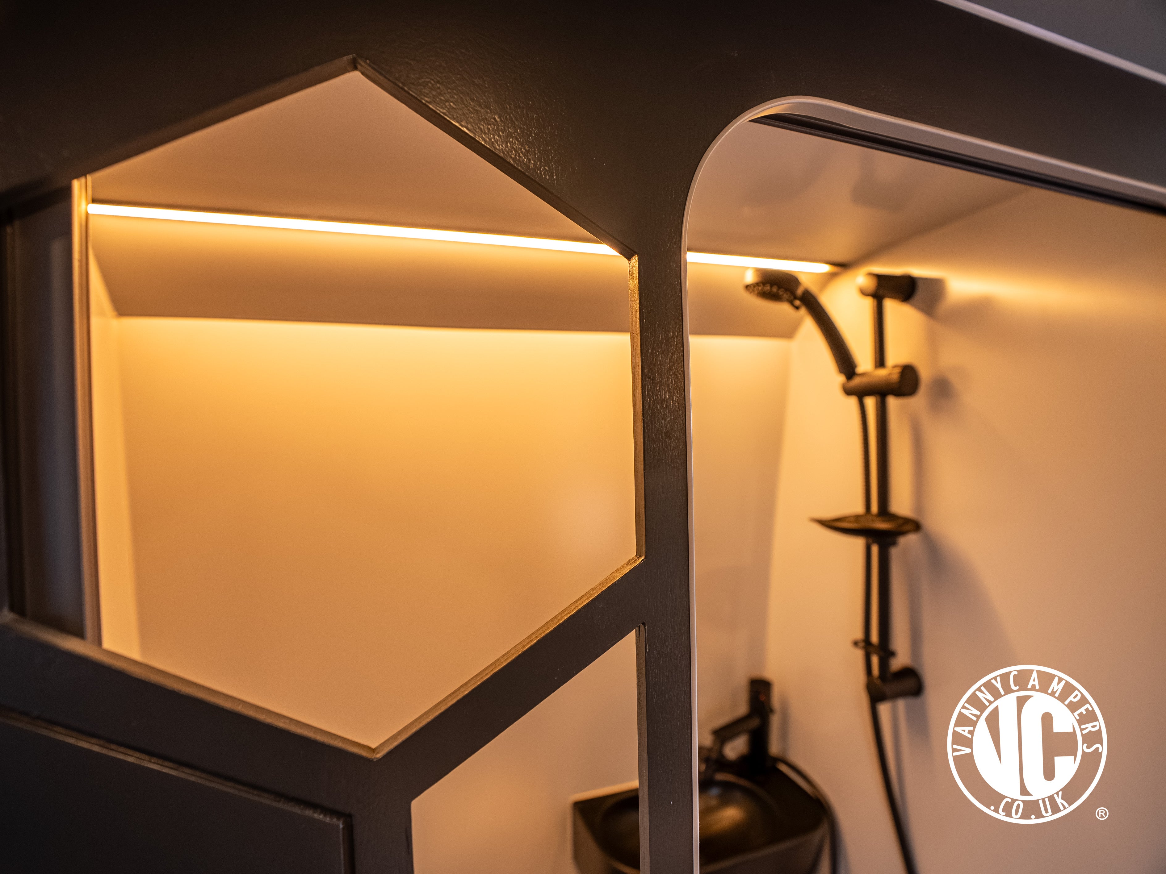 Thoughtfully designed to feel intentional rather than just there because it has to be, this bathroom balances privacy with light and openness. The hex-pattern feature wall breaks up the darker surfaces, allows light to move through the space, and provides privacy without closing the van in. It’s a practical setup with all the functionality you need for daily life on the road but without that typical “camping bathroom” feel making it a genuine design feature rather than an afterthought.