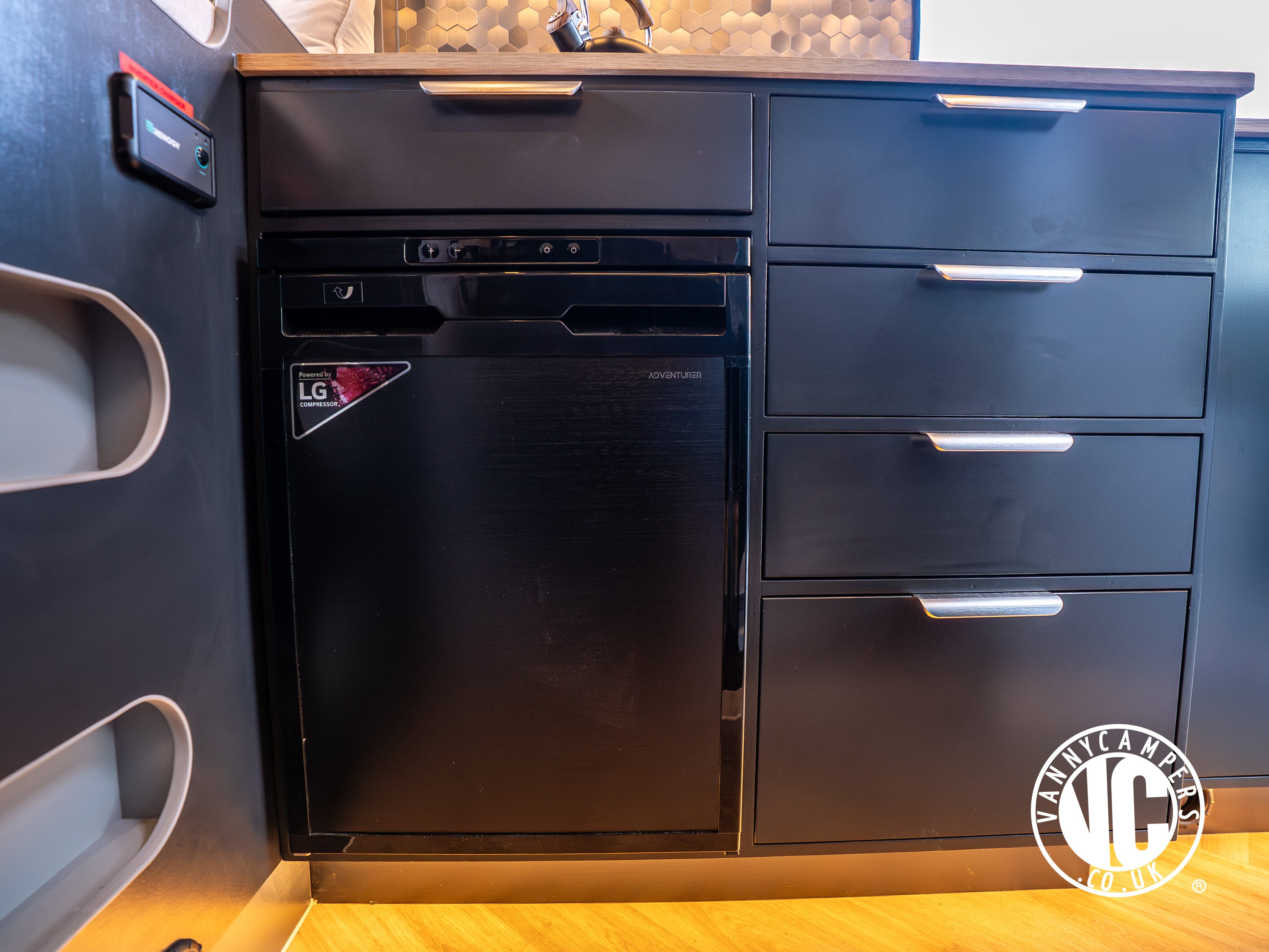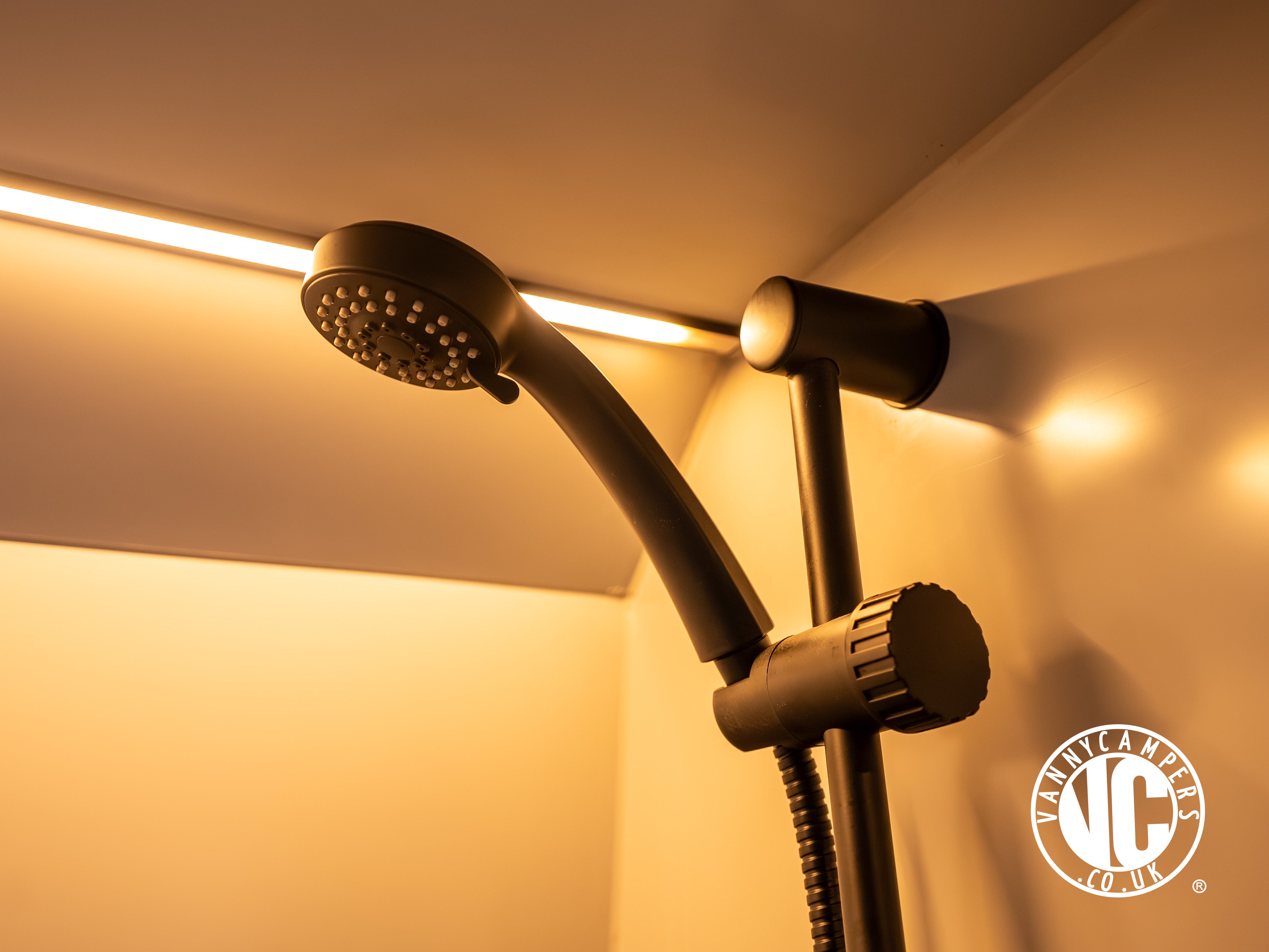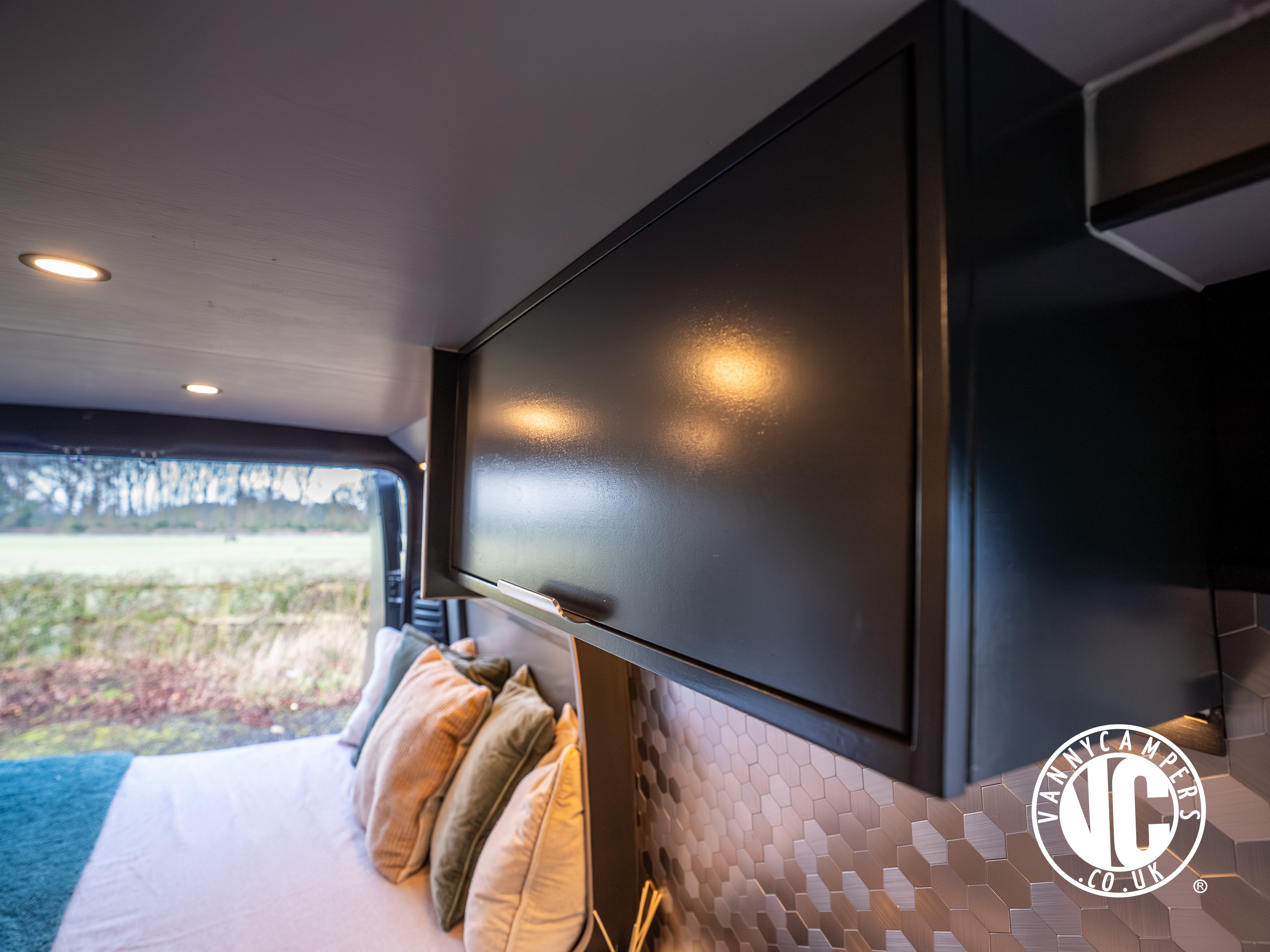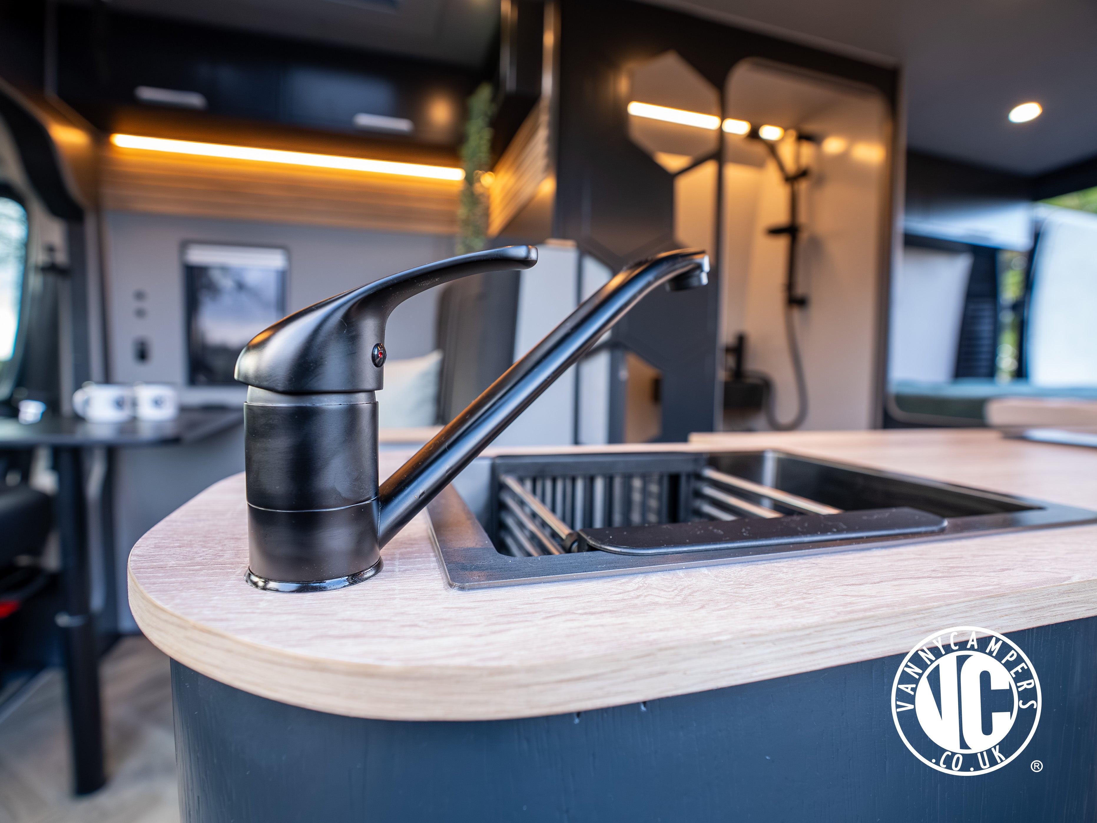 Thoughtfully designed to feel intentional rather than just there because it has to be, this bathroom balances privacy with light and openness. The hex-pattern feature wall breaks up the darker surfaces, allows light to move through the space, and provides privacy without closing the van in. It’s a practical setup with all the functionality you need for daily life on the road but without that typical “camping bathroom” feel making it a genuine design feature rather than an afterthought.