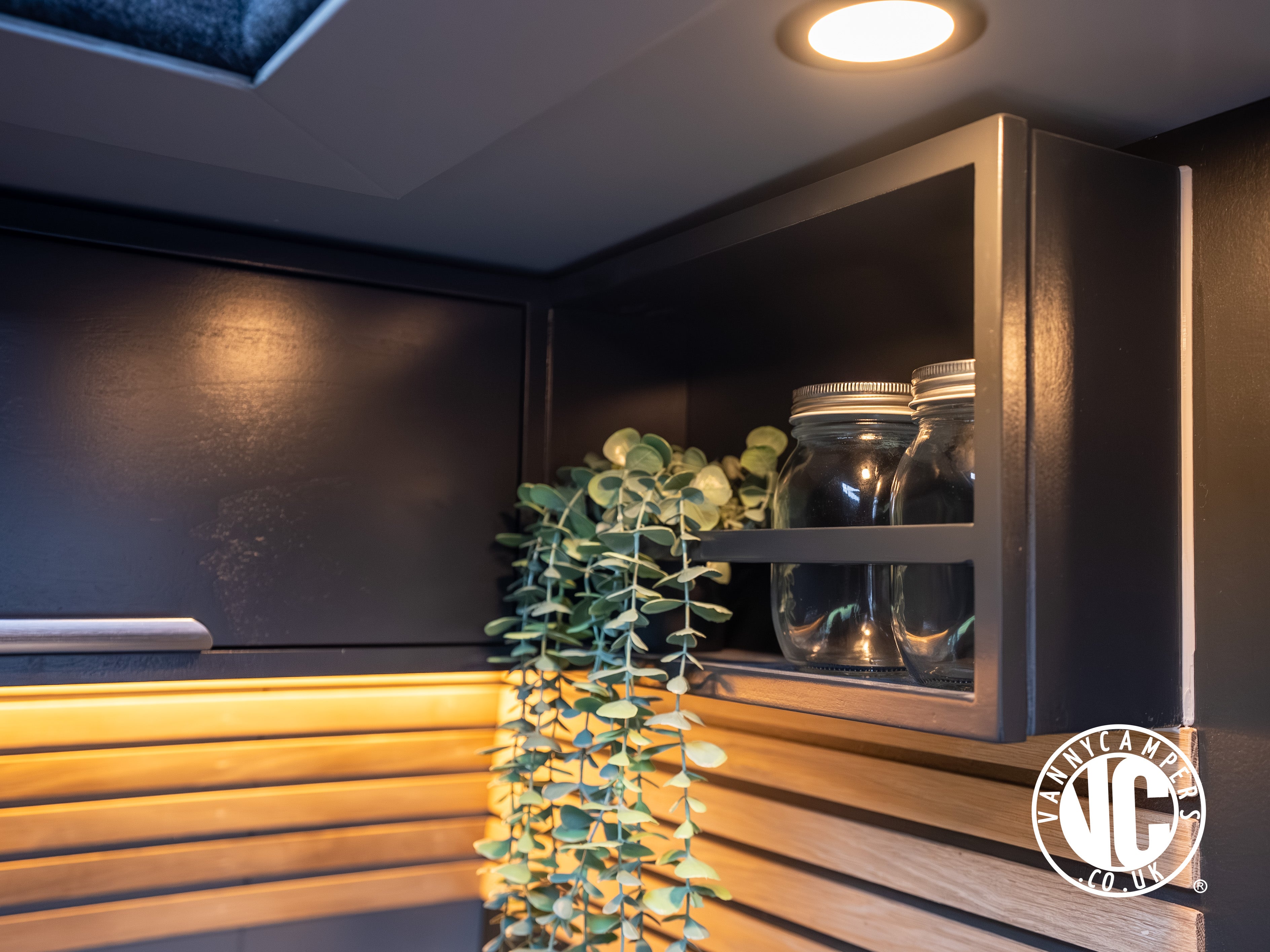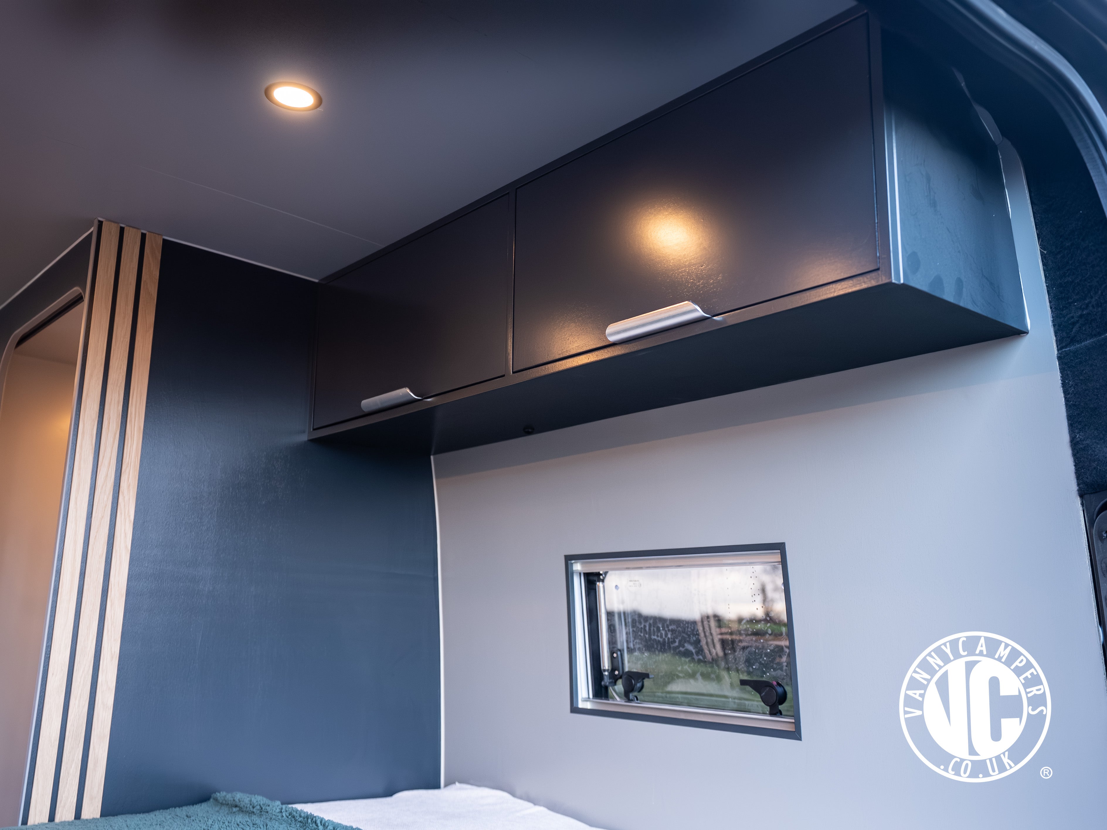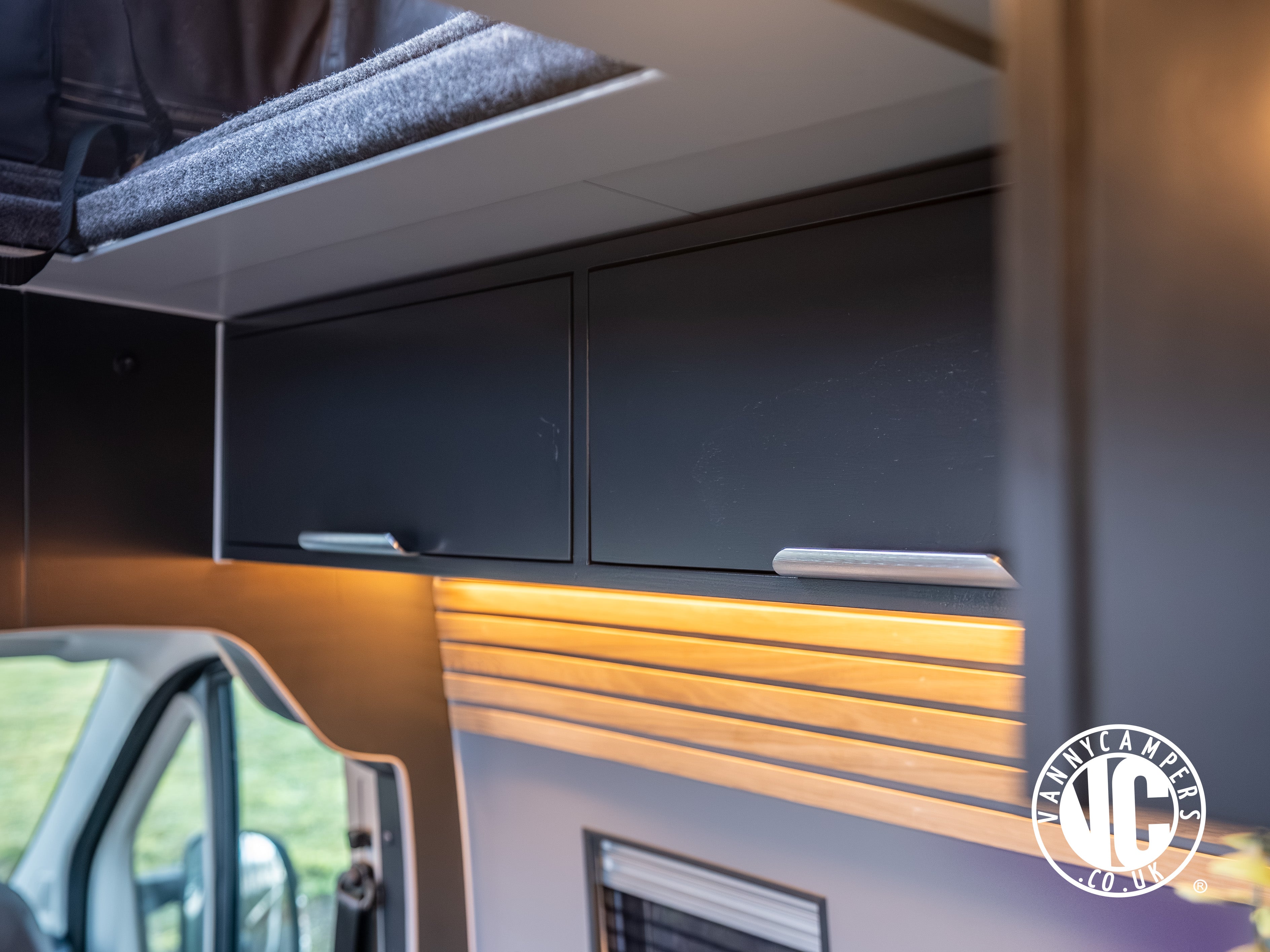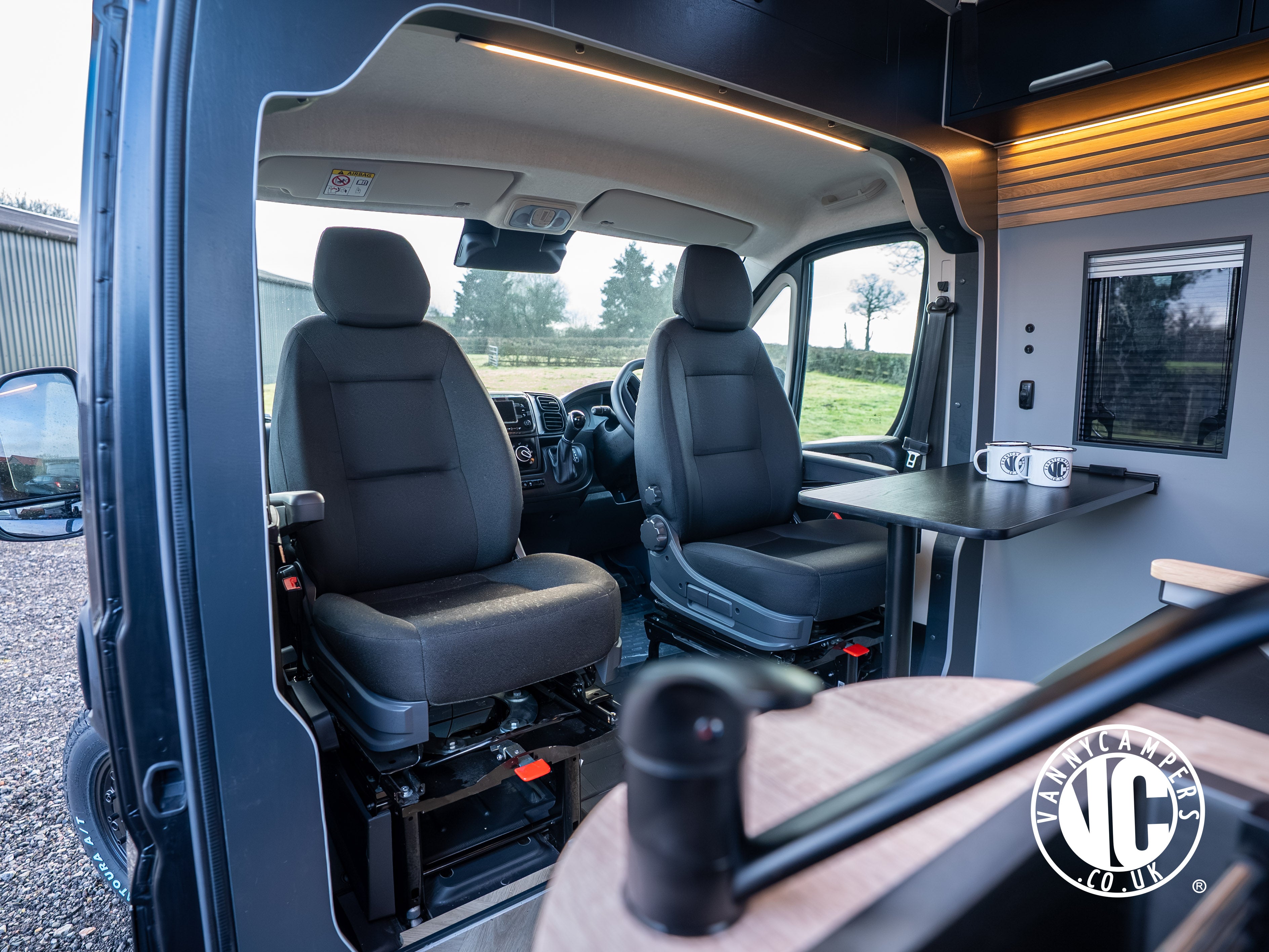 The living area is designed for comfort, flexibility, and style, a space that adapts effortlessly from morning coffee to evening relaxation. The walls and ceiling are painted in Farrow & Ball “Plummet”, while the parquet-style, hard-wearing vinyl floor and cabinets finished in Farrow & Ball “Off Black” add depth and texture. Spotlights in the ceiling and LED accent lighting create a warm, inviting glow, enhancing the bold, modern interior vibe. With swivel cab seats, an adjustable table, and clever over-cab storage, this space is as practical as it is stylish, perfect for lounging, dining, or planning your next adventure