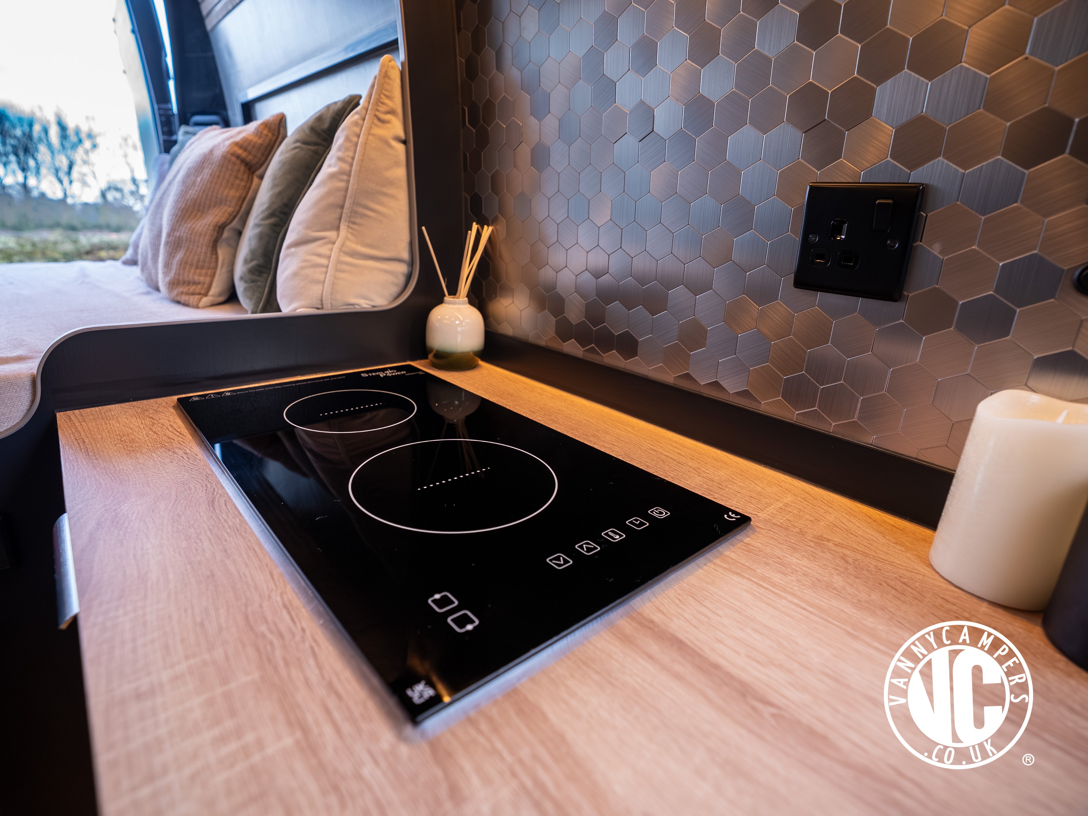 Cook, prep, and enjoy your meals in a kitchen that’s as practical as it is stylish. The compact galley layout keeps everything within easy reach without getting in the way, while thoughtful touches like a pull-out worktop section give you extra prep space when you need it. Durable materials and high-quality appliances make this kitchen perfect for daily use on the road, all while keeping the van feeling open and spacious.