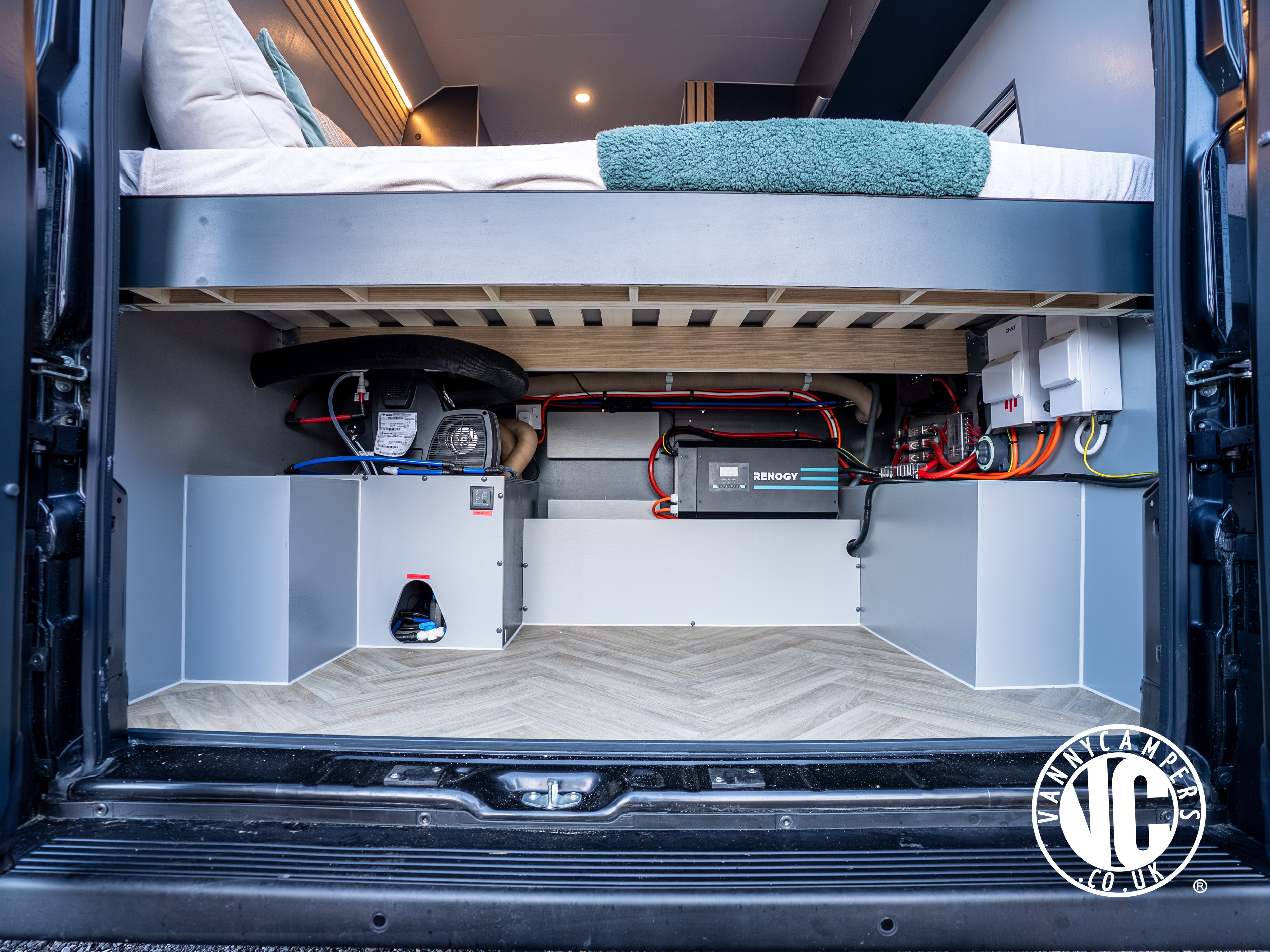 The rear garage offers a generous, practical storage space designed to keep everything organised and easily accessible. It houses the electrical and heating systems neatly, while still leaving plenty of room for outdoor gear, luggage, or adventure essentials. On the exterior, a powerful LED light bar mounted to the front of the van, controlled directly from the driver’s seat, adds extra visibility and confidence when driving off-grid or navigating darker roads.
