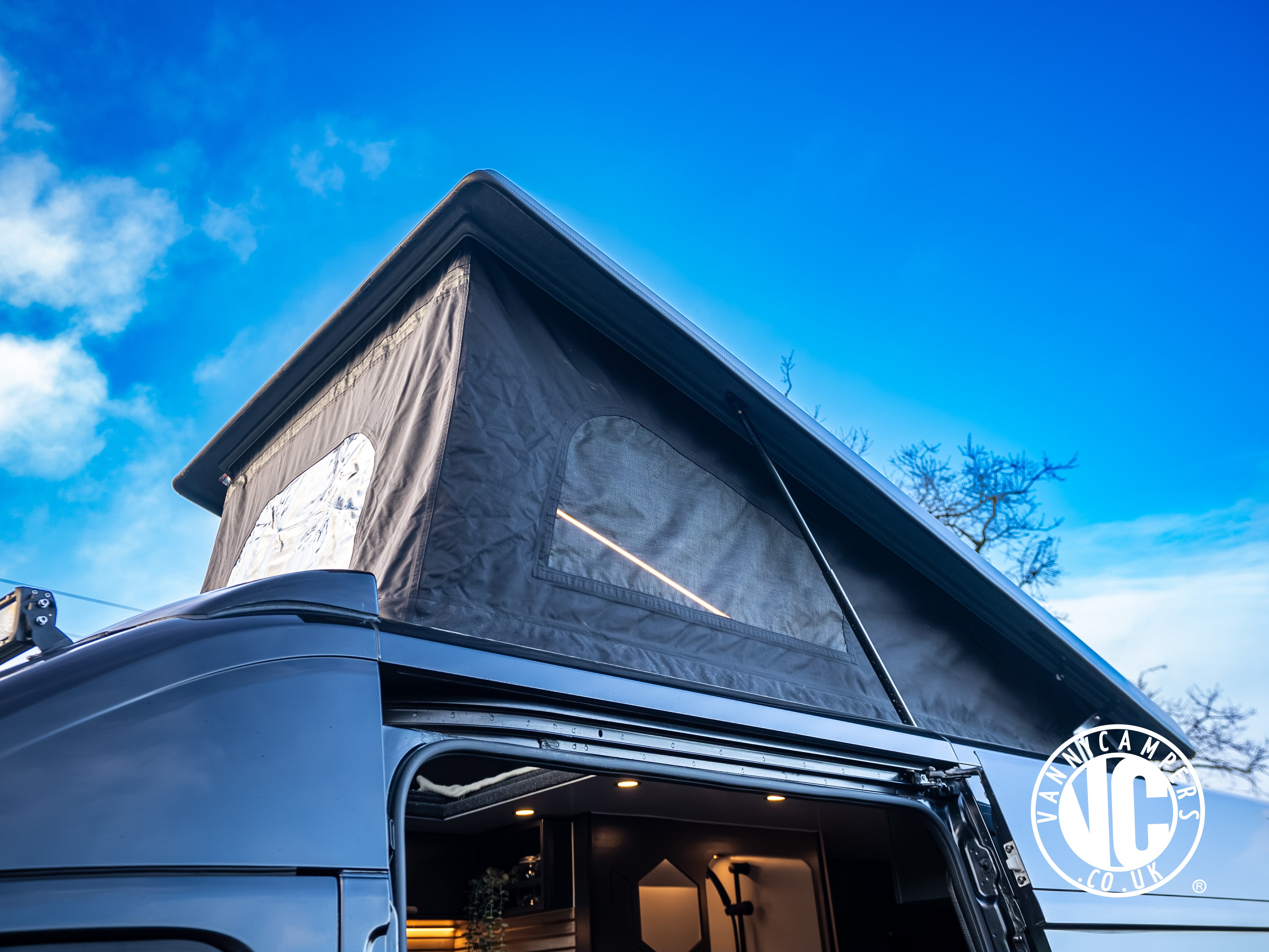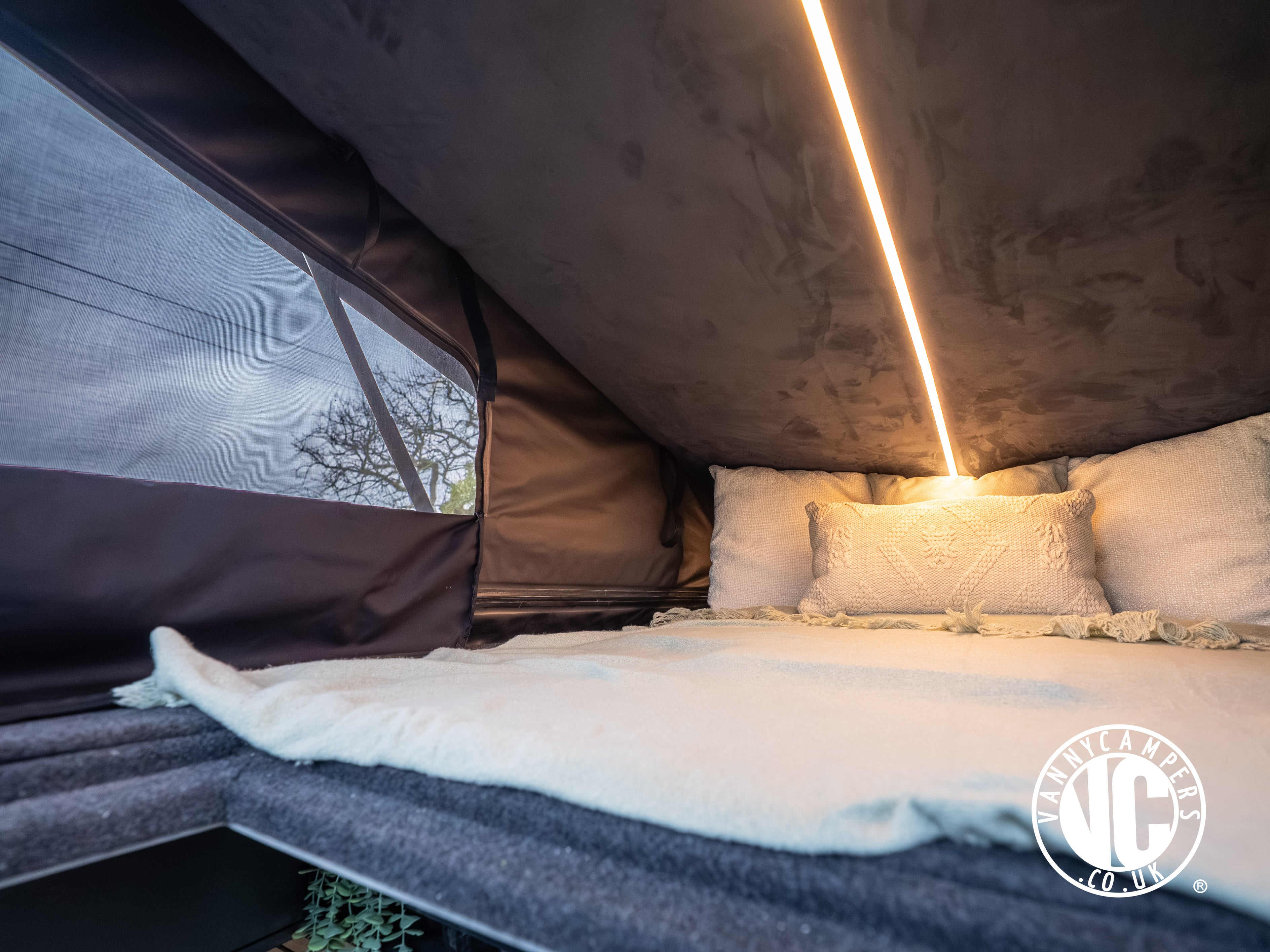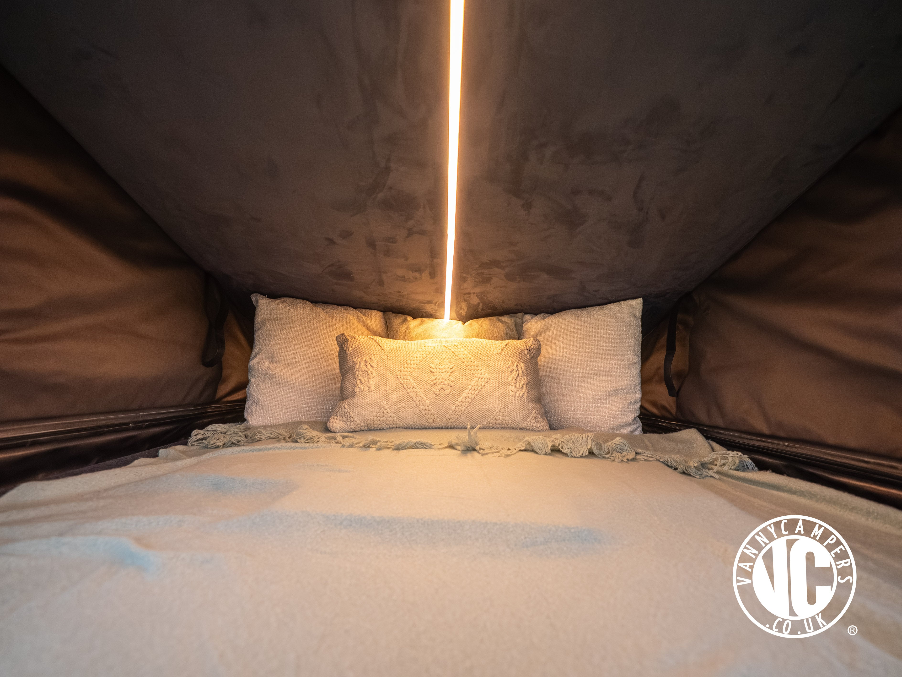 The pop-top sleeping area is a bright, airy, and comfortable space for two. Featuring a built-in strip light for reading and ambience, and a fully unzip-able canvas, it’s perfect for soaking up fresh summer air or enjoying cosy nights on the road. With 300W of solar panels on the roof, the pop-top bedroom is as practical as it is inviting, keeping your van powered wherever your adventures take you.
