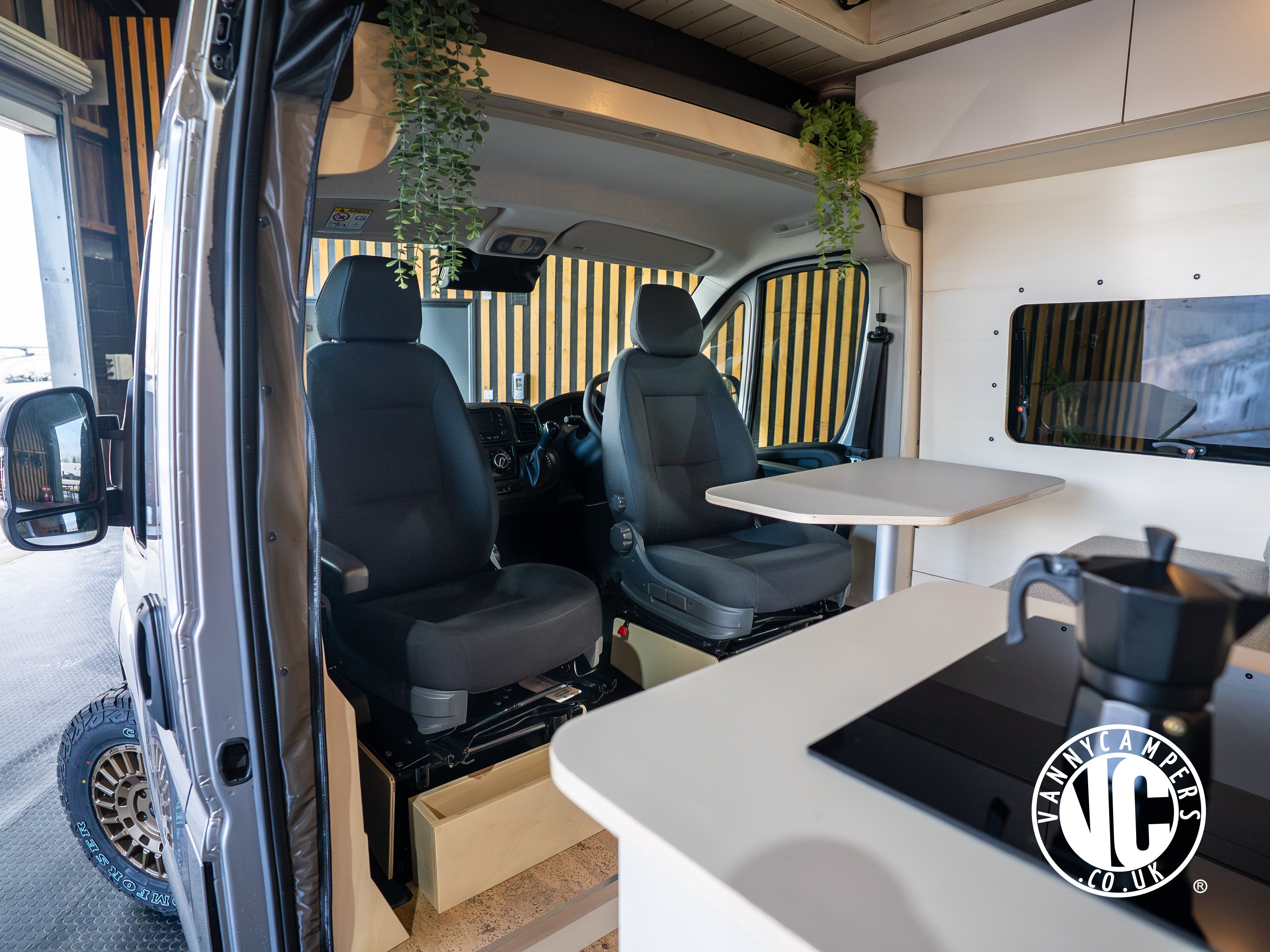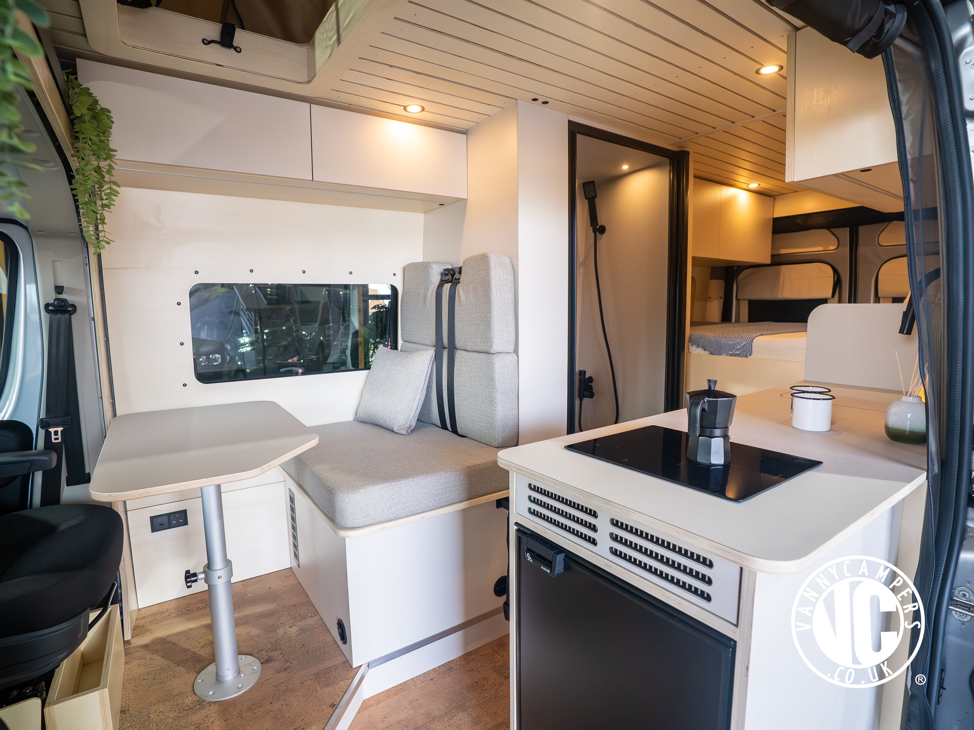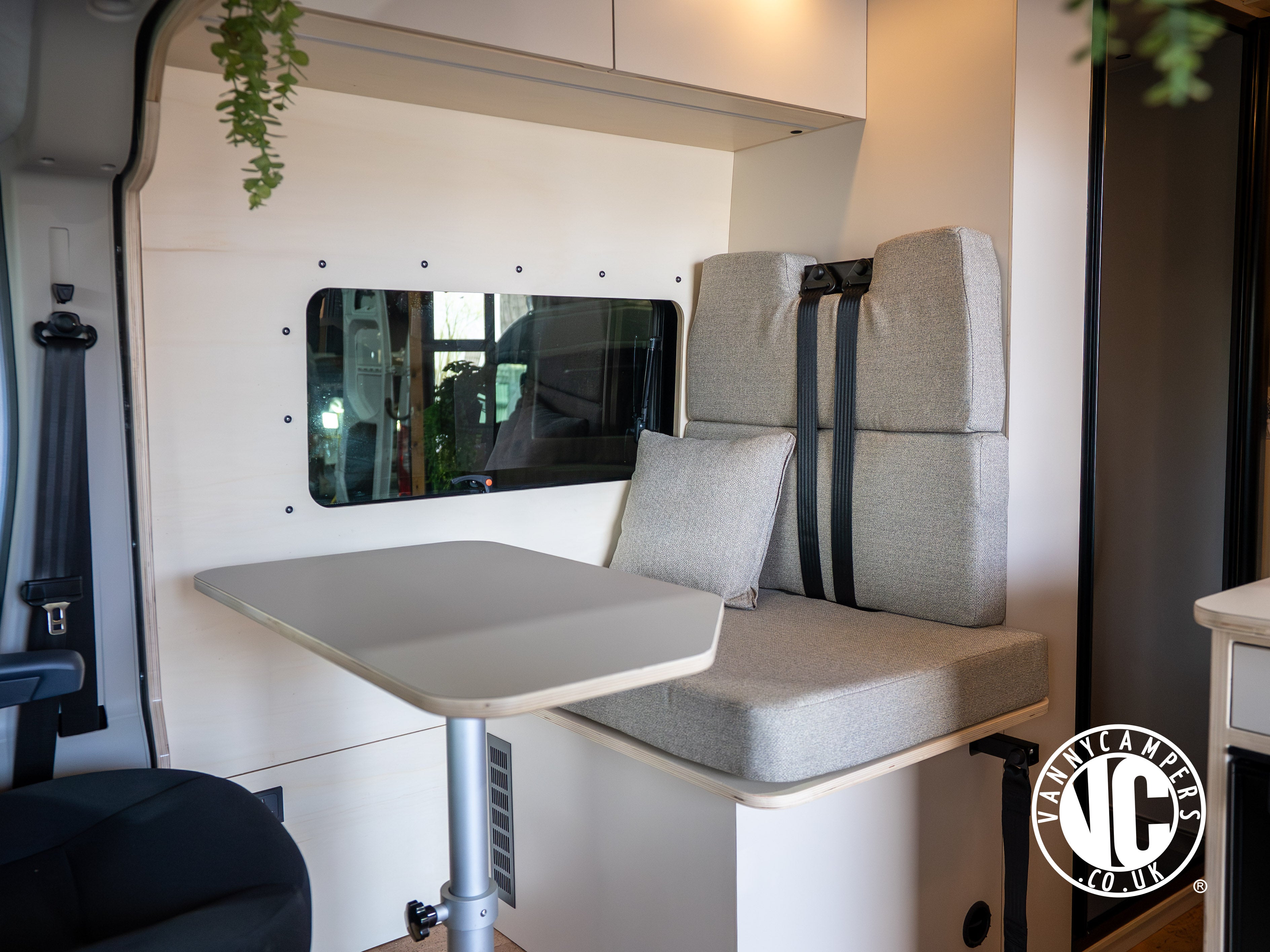 The tranquil living, working, and dining space area features a wood slatted roof and an Evo double seat frame with a seat box and combi boiler housing unit. Hard-wearing, durable, removable, and washable upholstery ensures comfort and practicality, while swivel plates allow the driver and passenger seats to rotate. An overhead unit with dimmable LED underlighting adds a warm, ambient glow, complemented by cork flooring with a laminated top layer that’s waterproof and thermally efficient. The space also includes a removable table, fly nets for side and rear doors, keep the bugs out while letting the fresh air in and multiple USB, USB-C, and 230V sockets for all your connectivity needs.