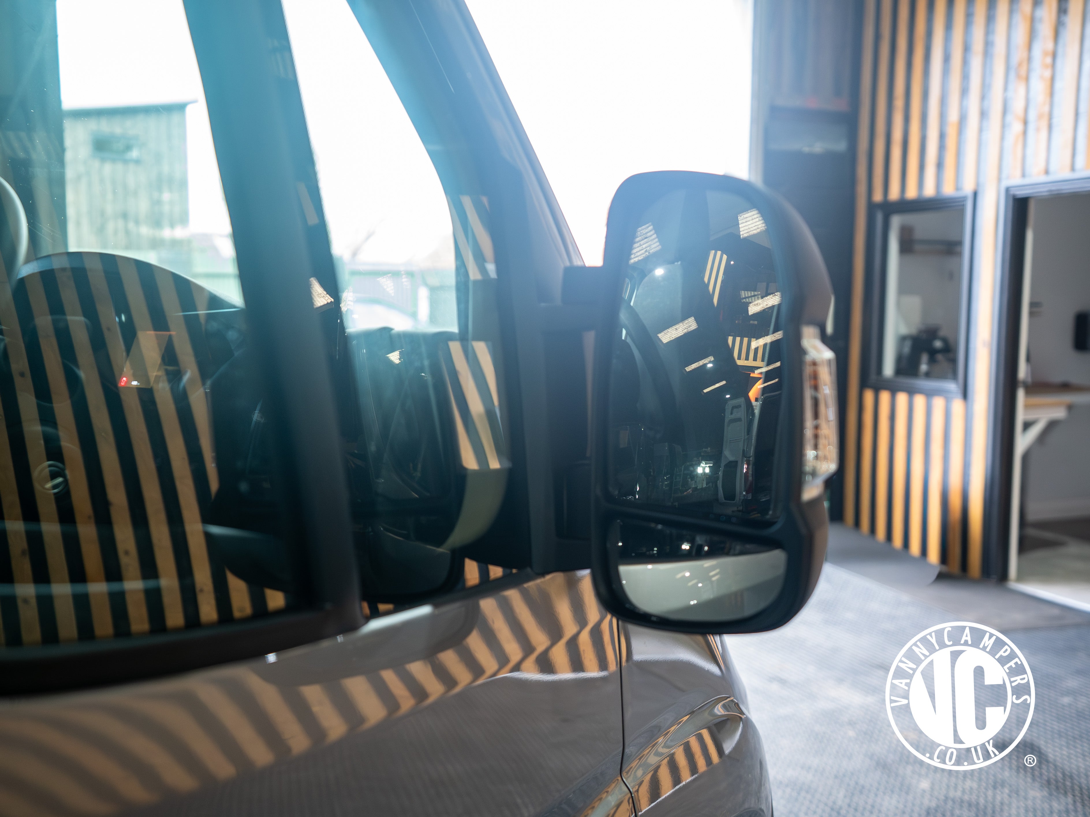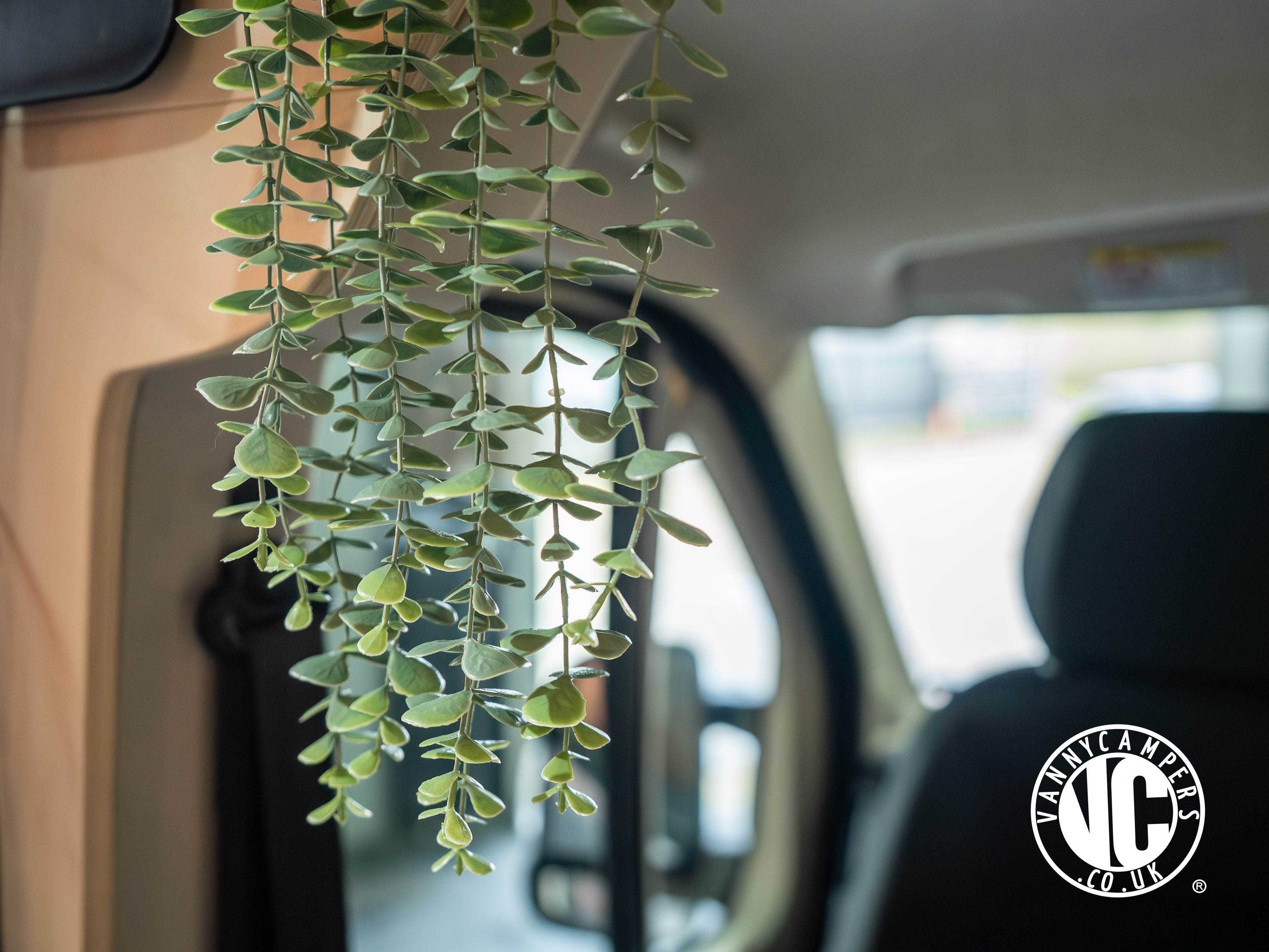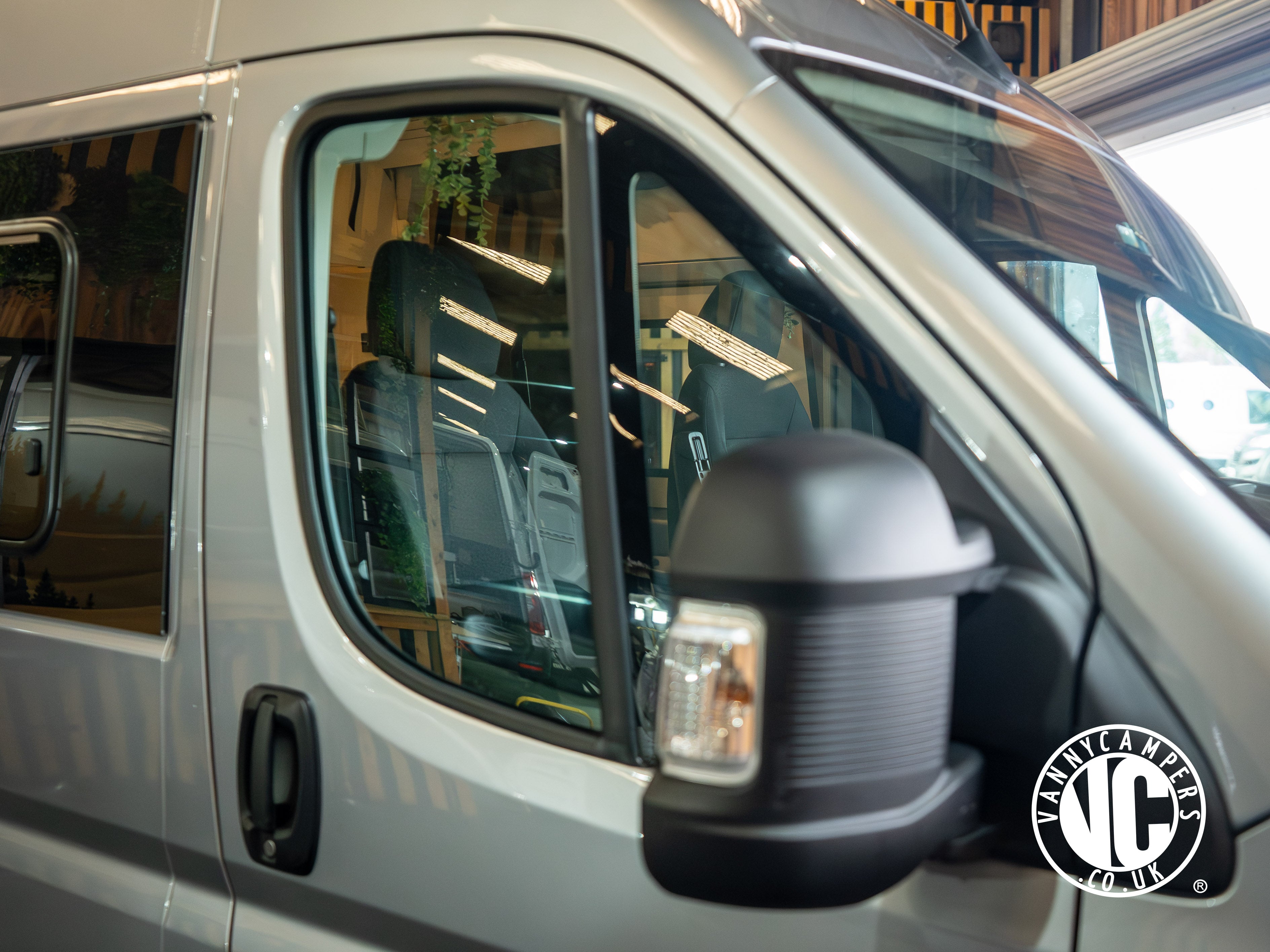 The tranquil living, working, and dining space area features a wood slatted roof and an Evo double seat frame with a seat box and combi boiler housing unit. Hard-wearing, durable, removable, and washable upholstery ensures comfort and practicality, while swivel plates allow the driver and passenger seats to rotate. An overhead unit with dimmable LED underlighting adds a warm, ambient glow, complemented by cork flooring with a laminated top layer that’s waterproof and thermally efficient. The space also includes a removable table, fly nets for side and rear doors, keep the bugs out while letting the fresh air in and multiple USB, USB-C, and 230V sockets for all your connectivity needs.