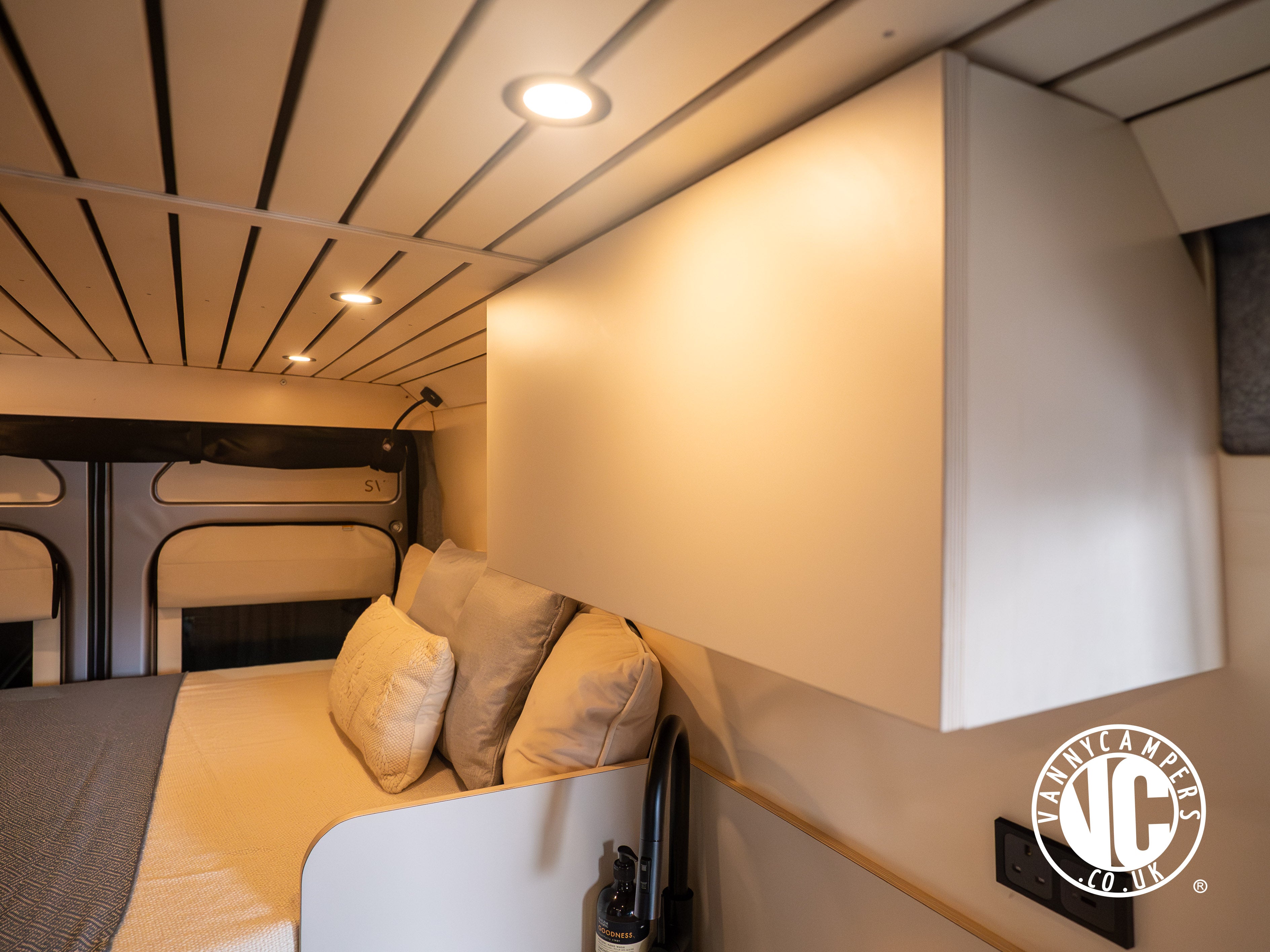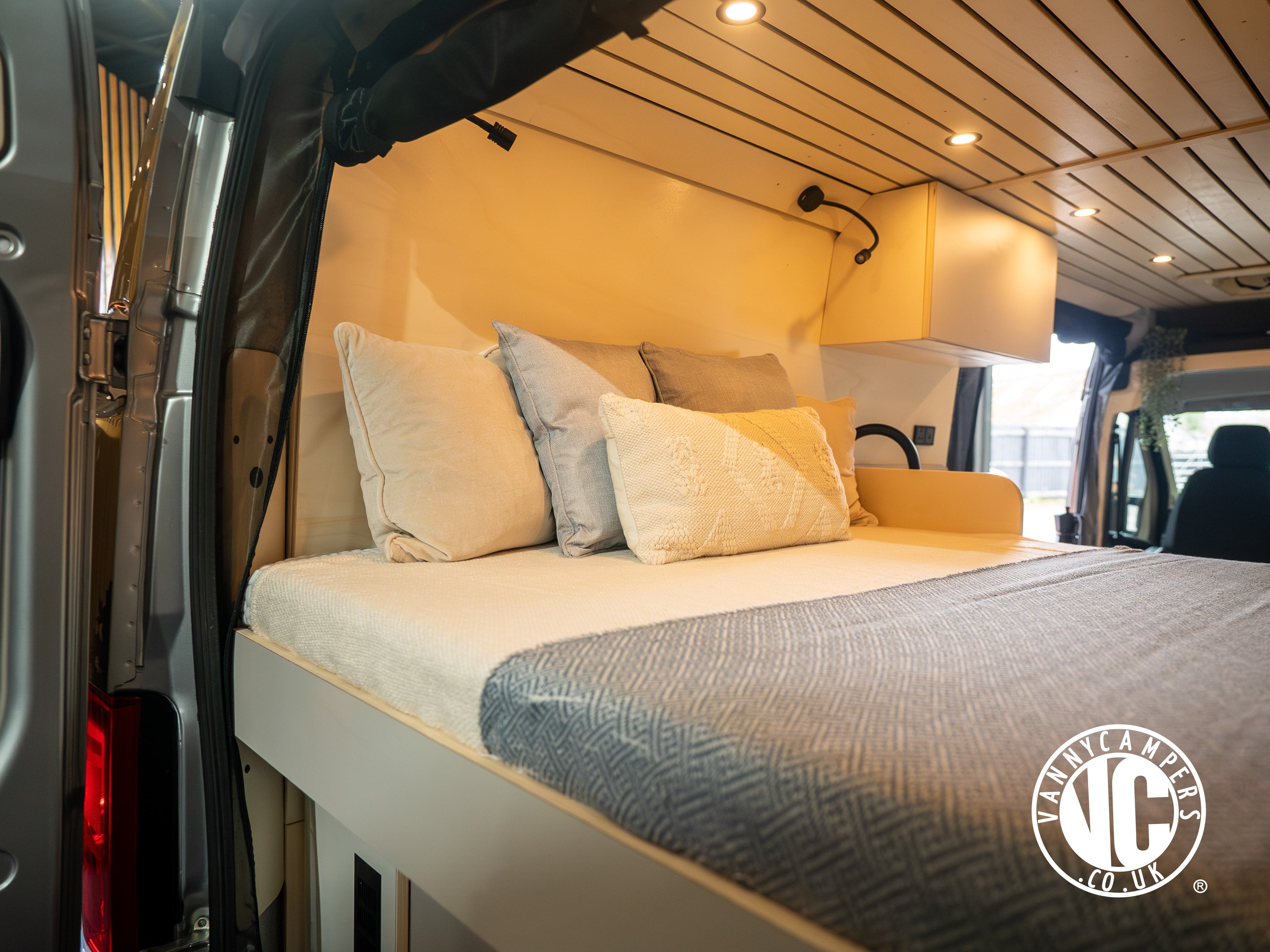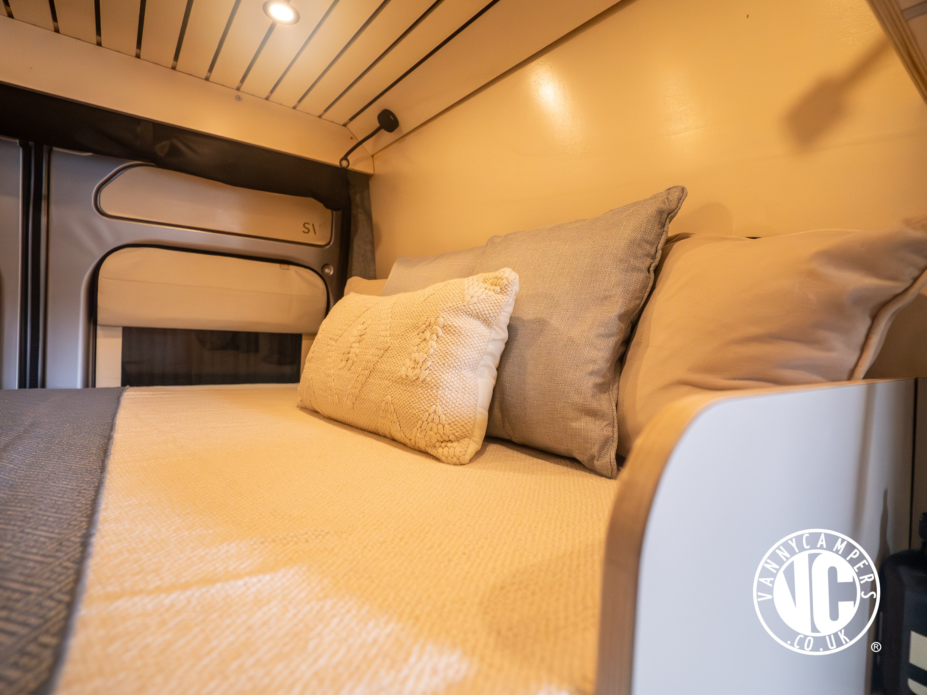 The bedroom in this campervan is designed for comfort and practicality, easily accommodating four people — two in the pop-top and two at the rear. The beds feature a custom foam mattress resting on a lightweight steel frame in sleek matt black. Matt black reading lights with integrated USB ports make late-night reading or device charging a breeze, while a streamlined overhead unit adds extra storage without compromising the clean, modern look.