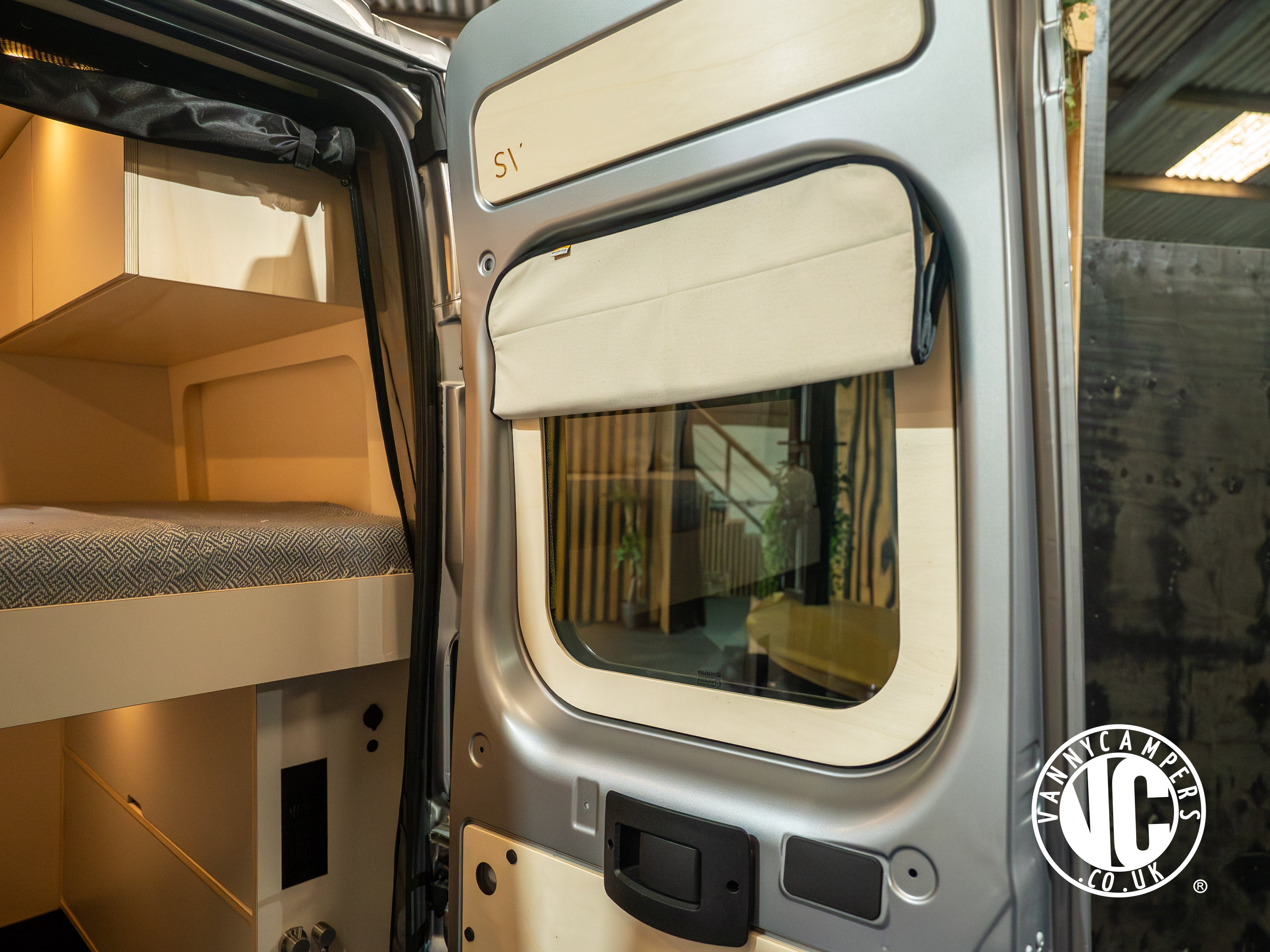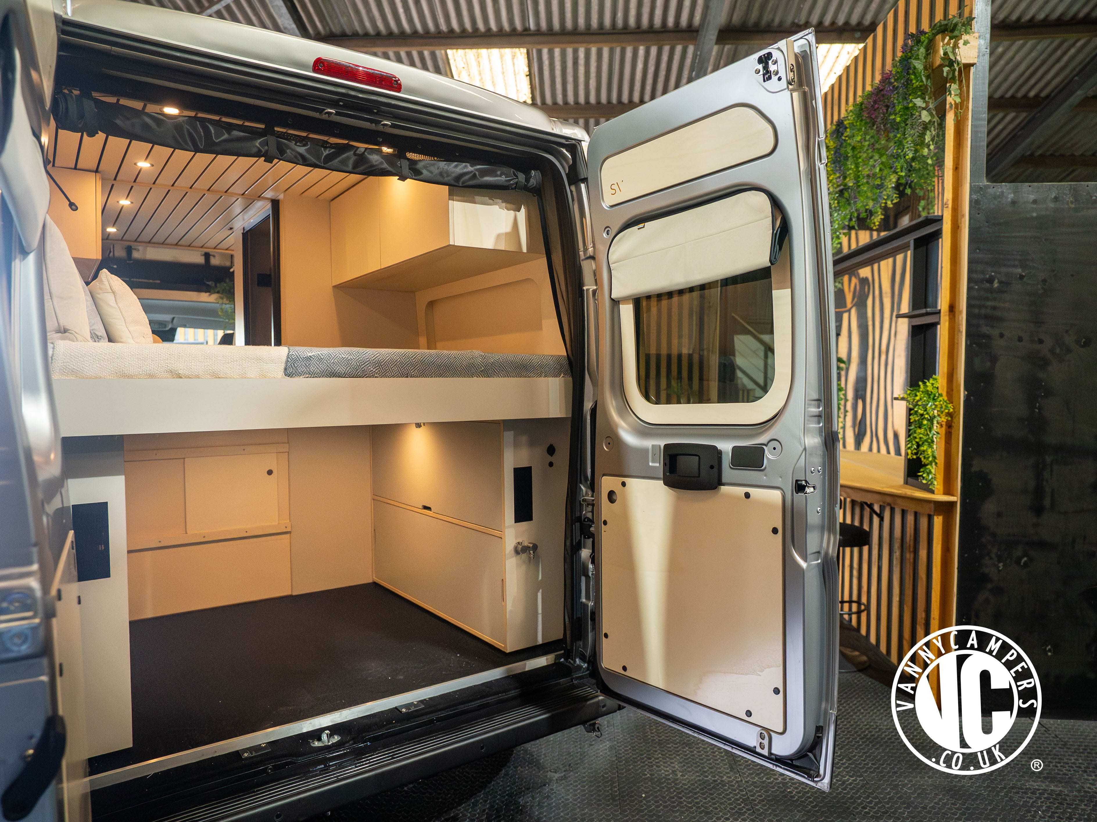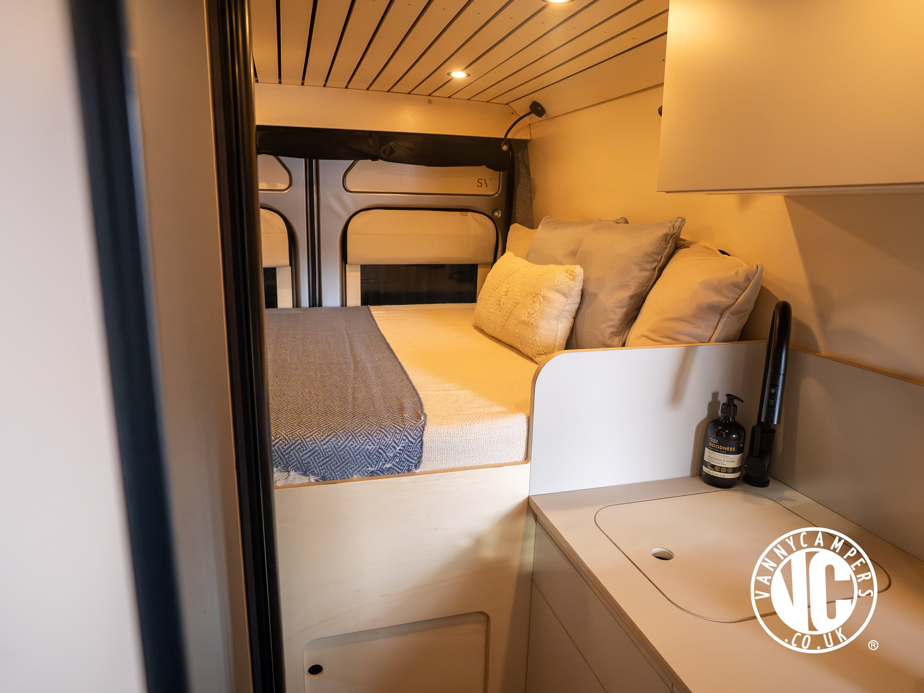 The bedroom in this campervan is designed for comfort and practicality, easily accommodating four people — two in the pop-top and two at the rear. The beds feature a custom foam mattress resting on a lightweight steel frame in sleek matt black. Matt black reading lights with integrated USB ports make late-night reading or device charging a breeze, while a streamlined overhead unit adds extra storage without compromising the clean, modern look.