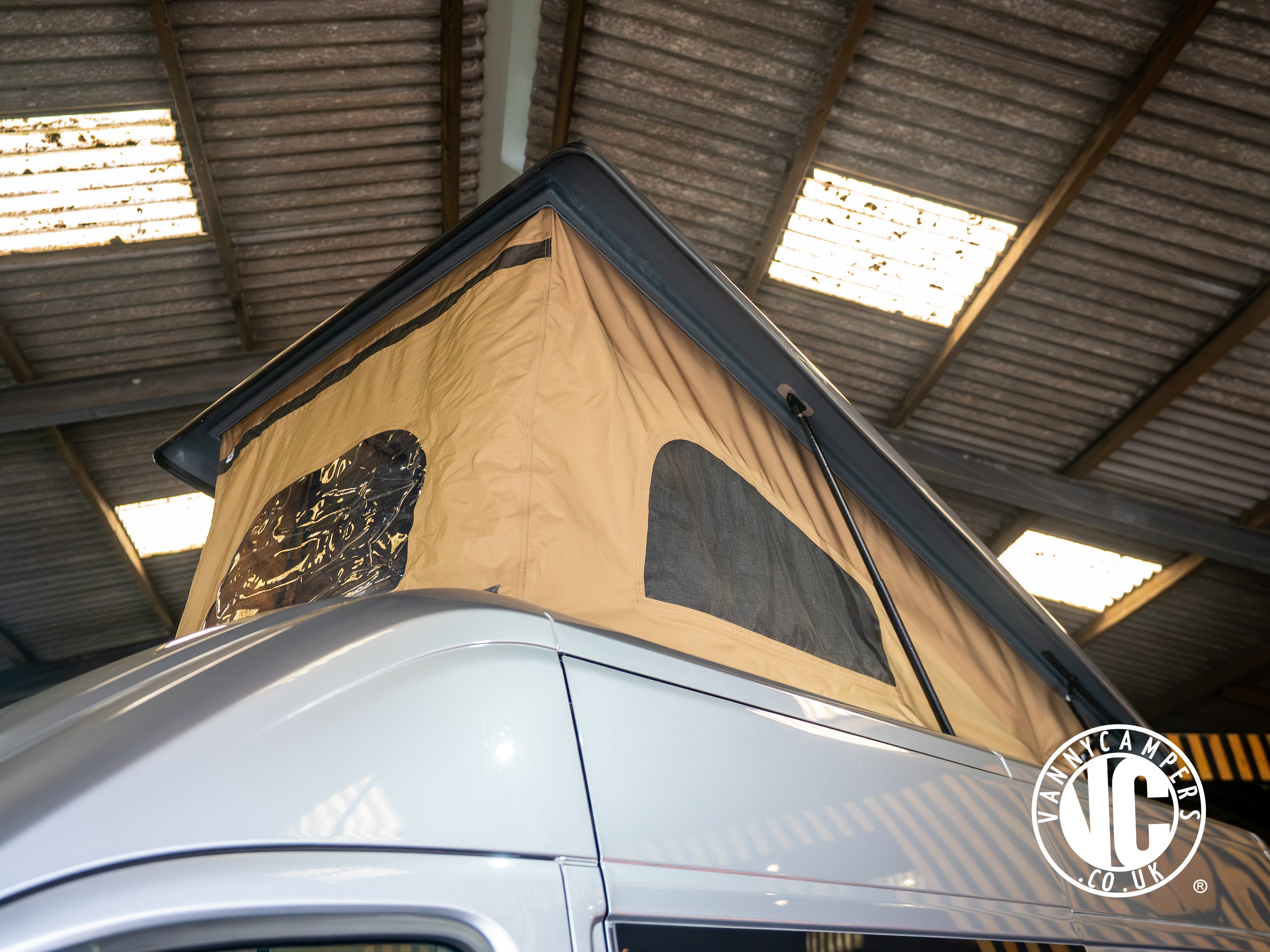 The pop-top bedroom offers a scenic rooftop space with plenty of headroom, fully carpeted for added comfort and fitted with two adjustable reading lights for those relaxed evenings. Crafted from durable canvas, the pop-top also features a handy zip-up window, perfect for letting in natural light and a touch of fresh air, even on chillier days, so you can stay warm and cosy while still enjoying the outdoors.