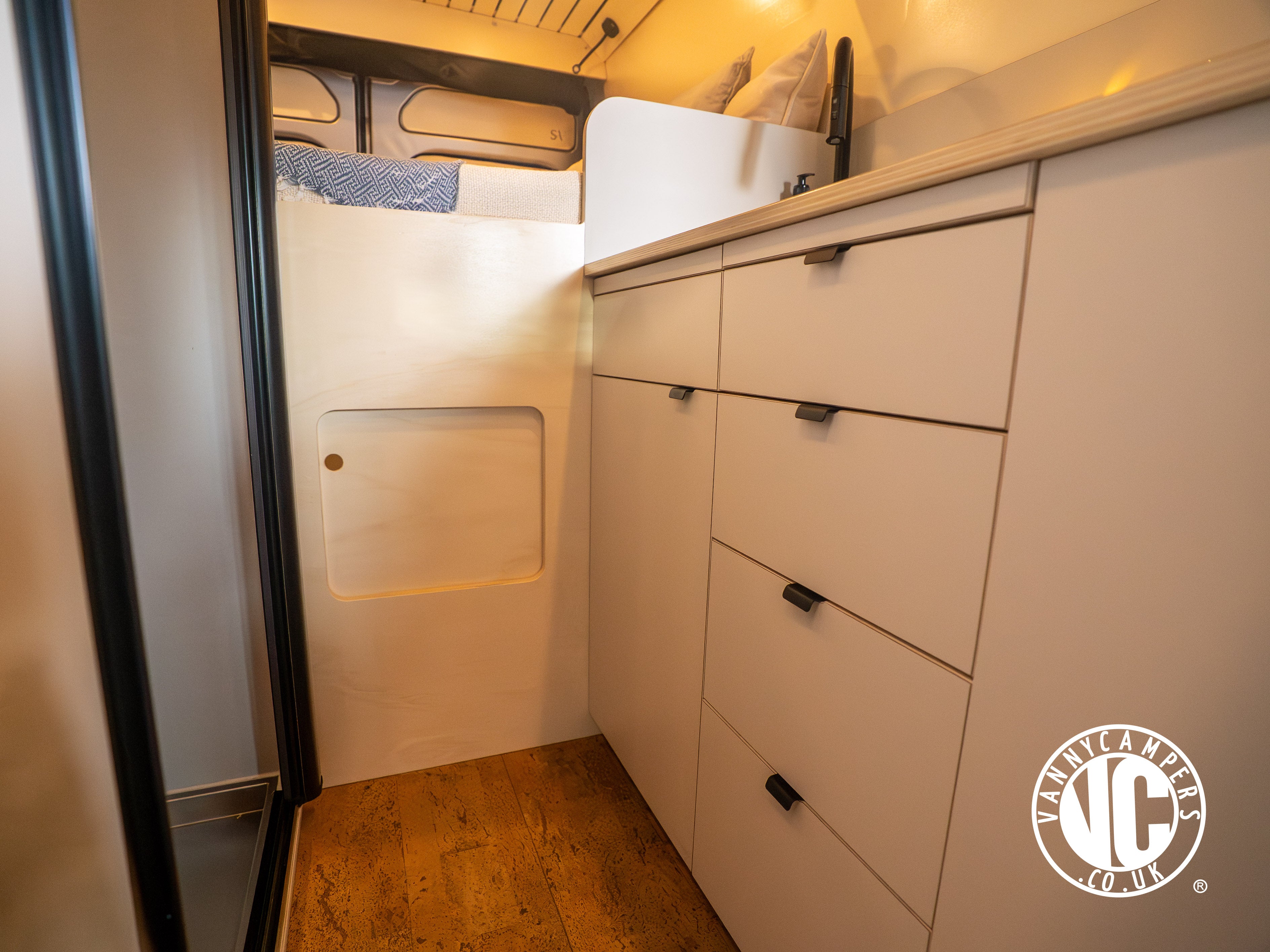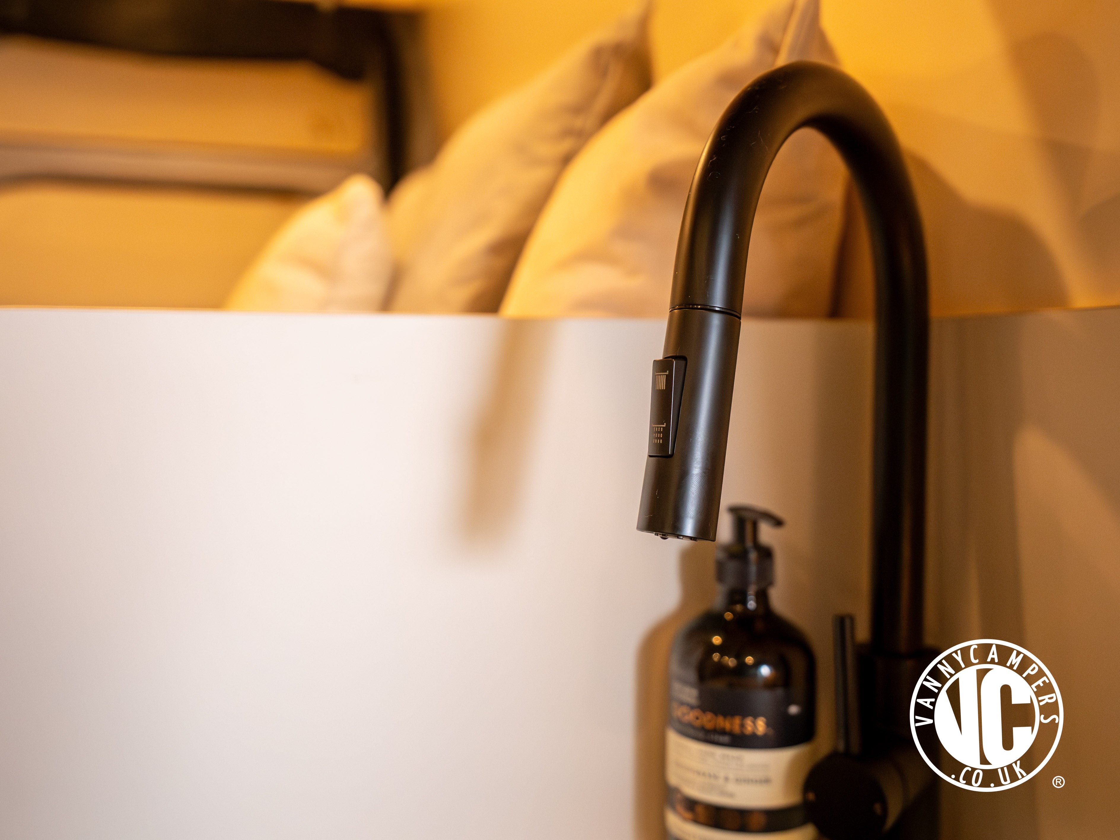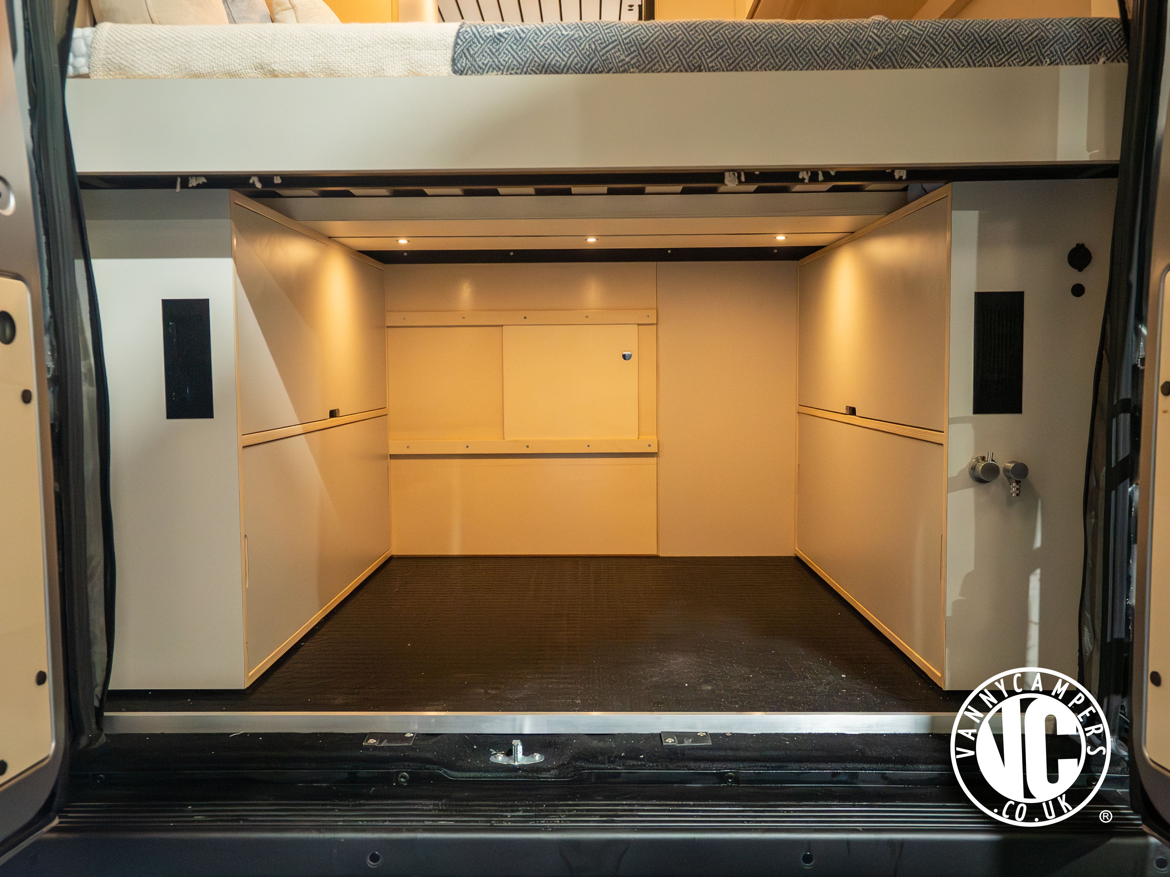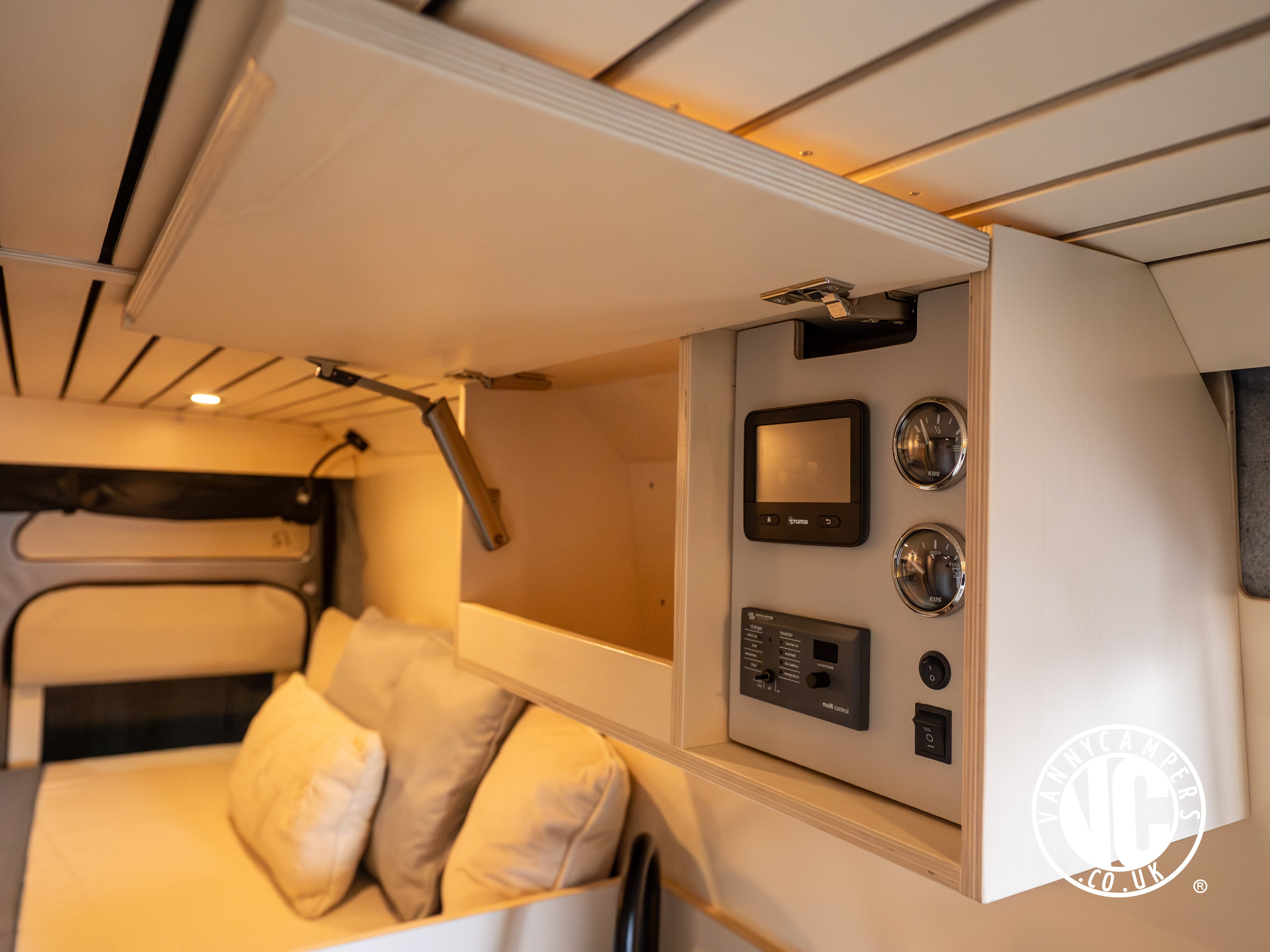 The garage and rear of the van feature a 12V cigarette socket, a stainless-steel external shower point, and durable rubber flooring. There’s even a clever little hatch that slides open from the garage into the main living space. Perfect for grabbing gear without stepping outside or letting your mucky pups pop through straight from the garage to join you, no muddy paws on the van floor! A dimmable LED light provides illumination, while plywood housing units neatly conceal the inverter, battery, and electrical system, with easy access to water connections for practical off-grid living.
