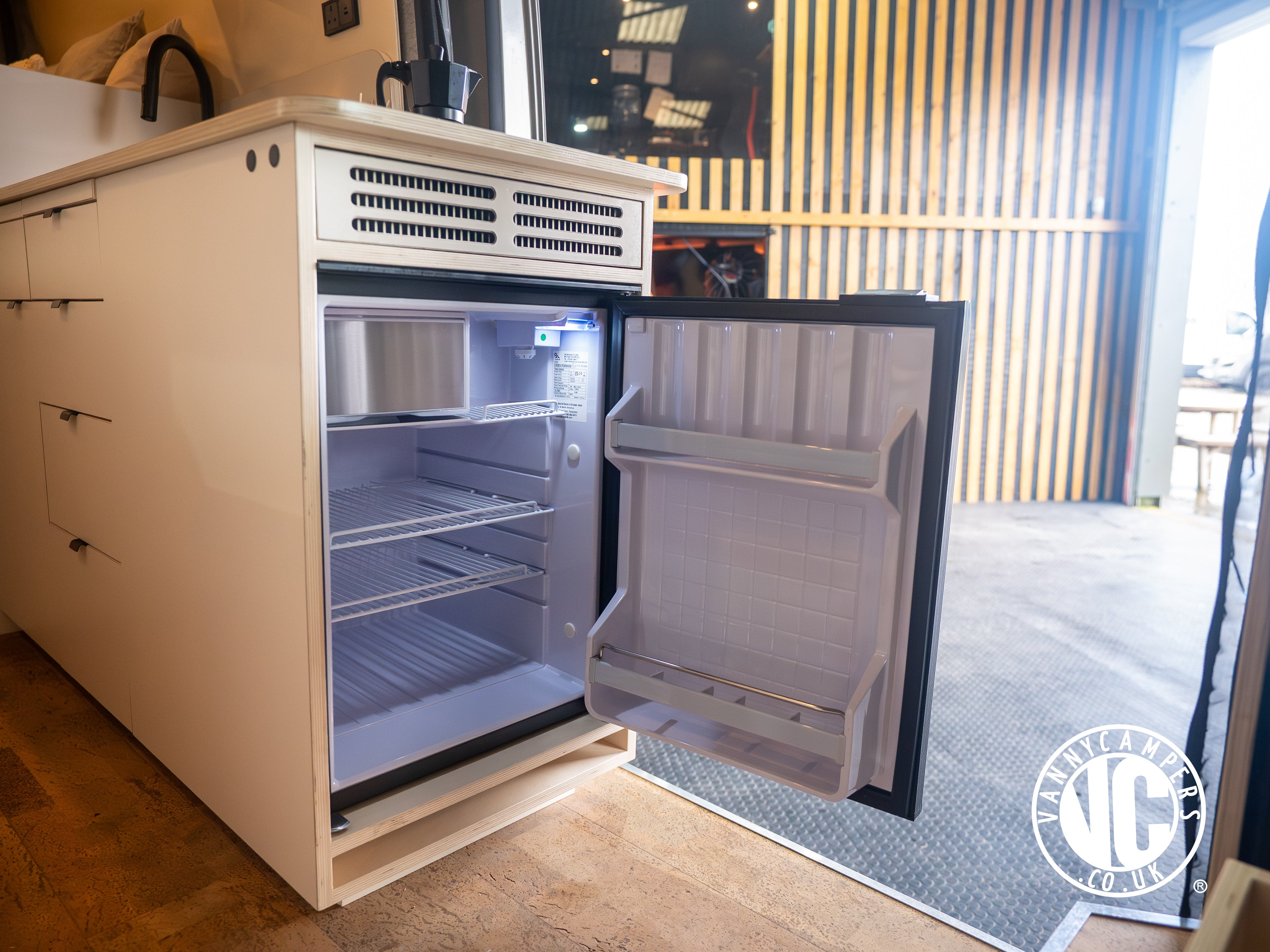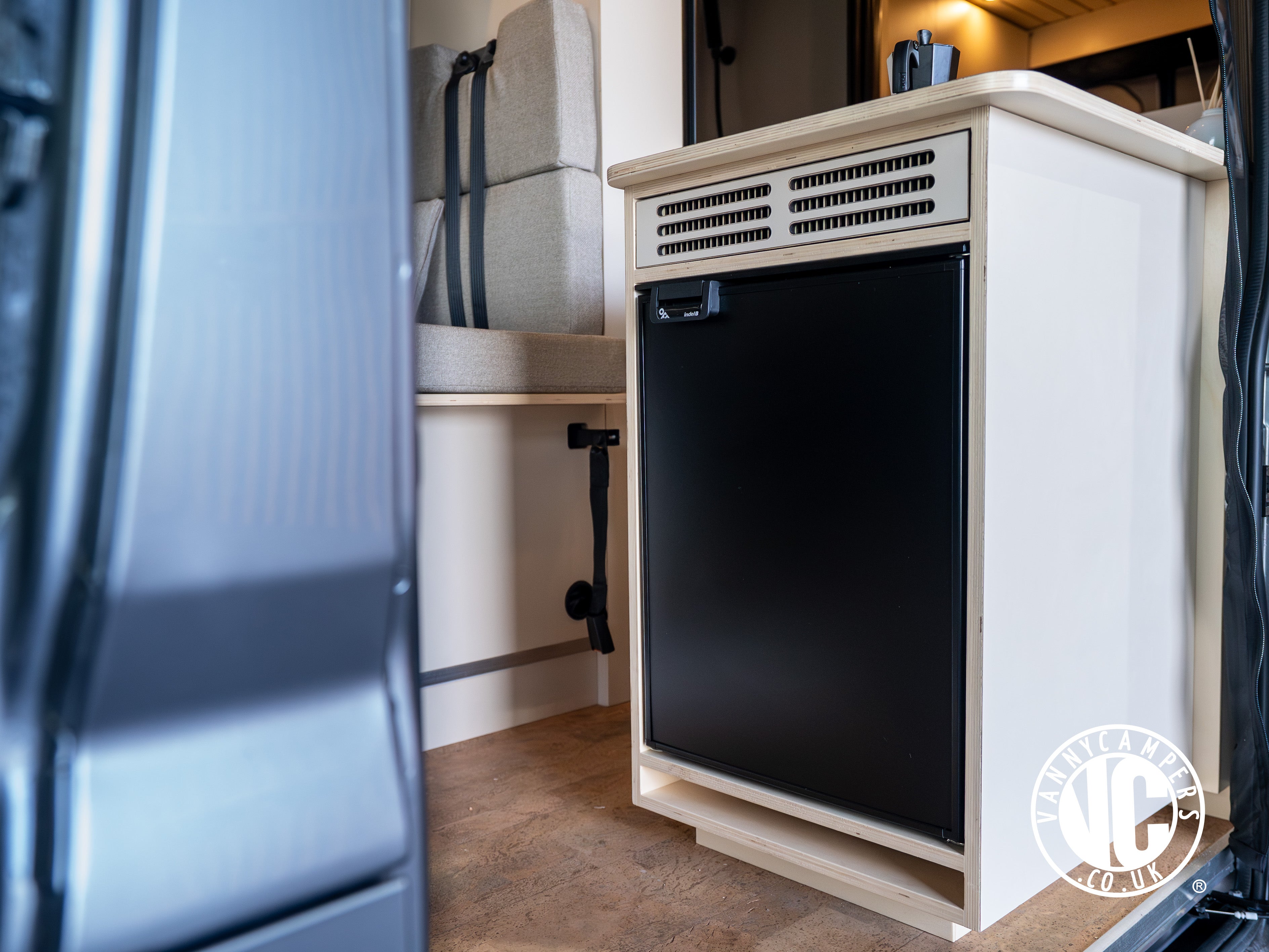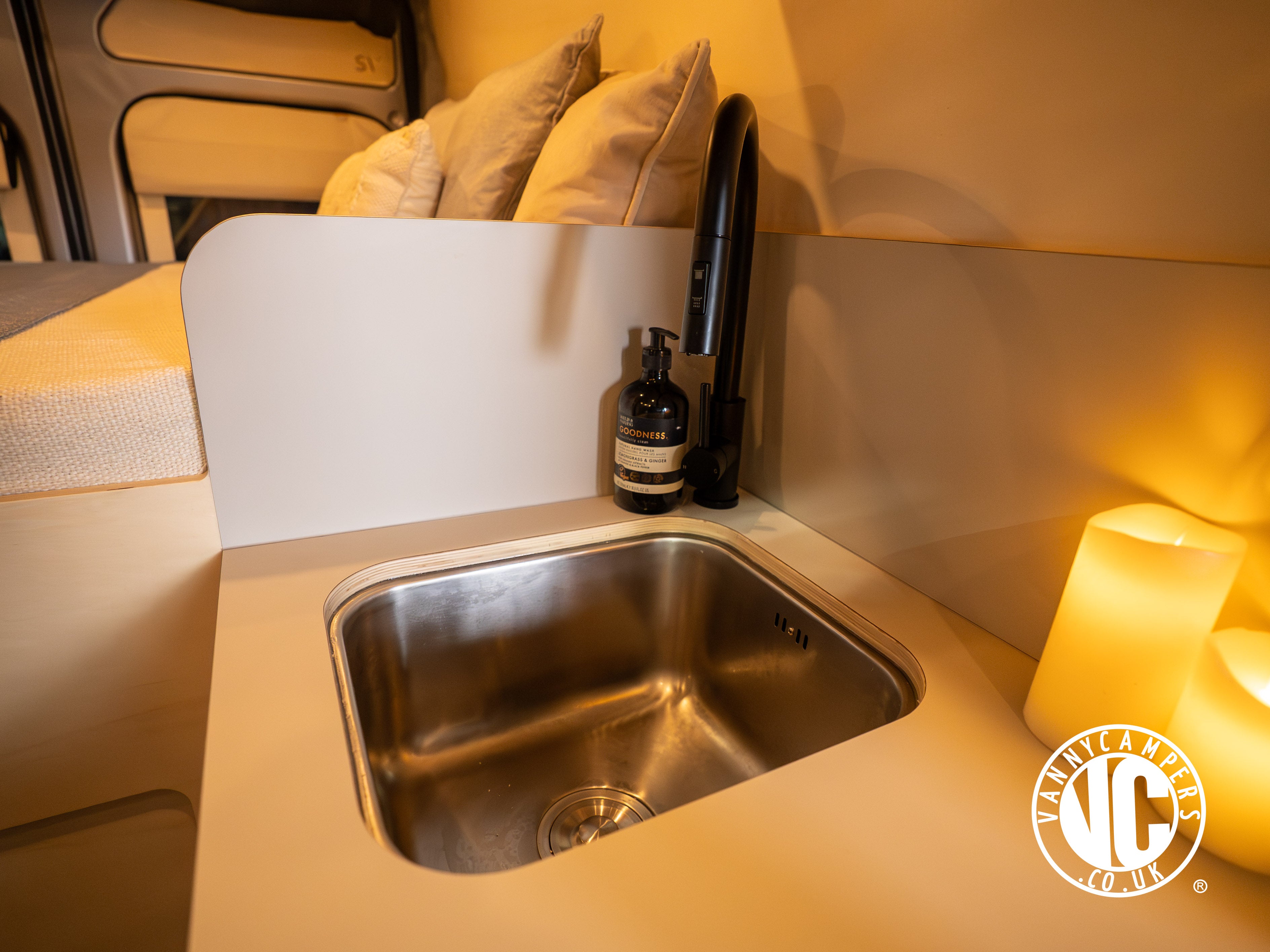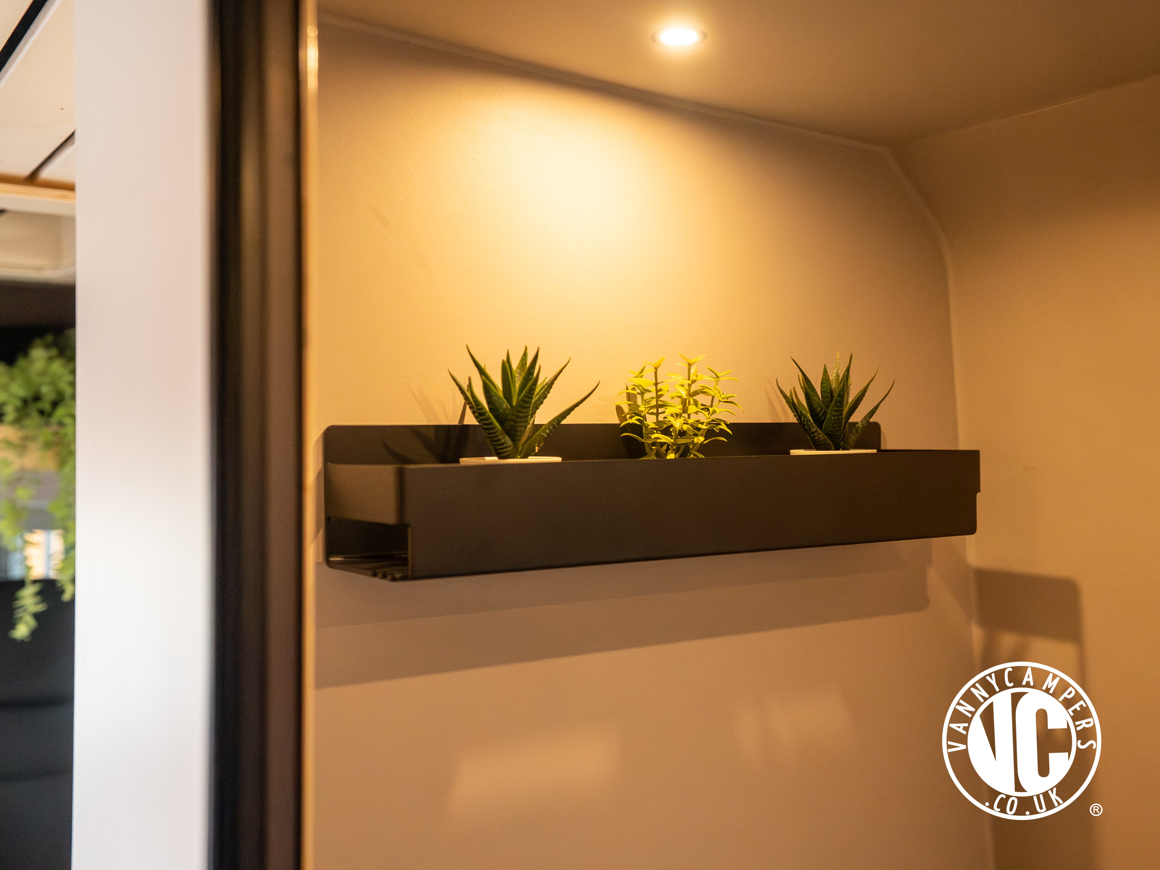 The garage and rear of the van feature a 12V cigarette socket, a stainless-steel external shower point, and durable rubber flooring. There’s even a clever little hatch that slides open from the garage into the main living space. Perfect for grabbing gear without stepping outside or letting your mucky pups pop through straight from the garage to join you, no muddy paws on the van floor! A dimmable LED light provides illumination, while plywood housing units neatly conceal the inverter, battery, and electrical system, with easy access to water connections for practical off-grid living.