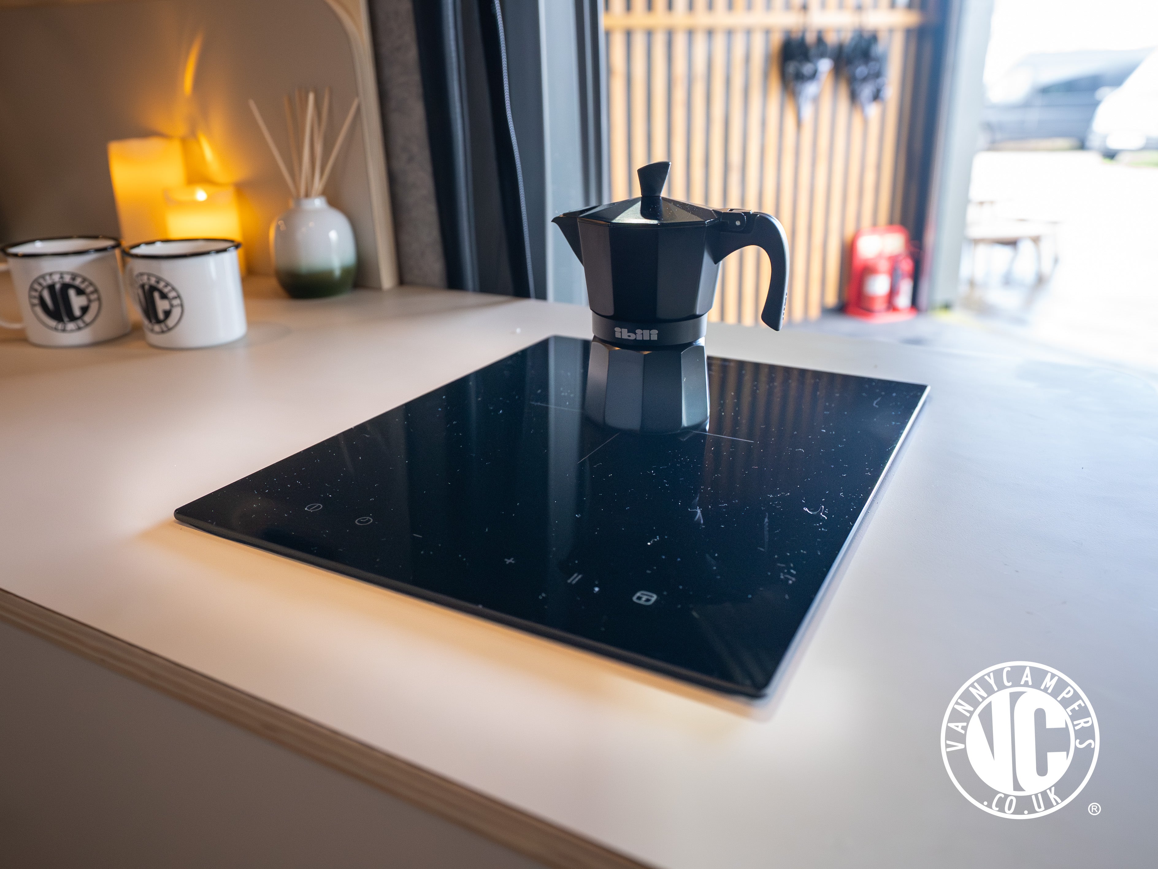 The kitchen in Alma is designed for both style and functionality. It features a stainless steel undermount sink with a matt black hot/cold pull-down sprayer tap, alongside a Waterdrop stainless steel water filter kit. The cabinets and drawers are crafted from exposed wood with laminated faces, paired with a durable laminated worktop and backsplash for a clean, modern finish. Cooking is covered with a single 2000W induction hob, and a whopping 85L 12V Indel B compressor fridge. There’s plenty of storage with a sink cupboard, four spacious drawers, and an overhead unit with dimmable LED under-lighting. Modern touches include USB/USB-C/230V sockets and dimmable LED lighting throughout the kitchen area.