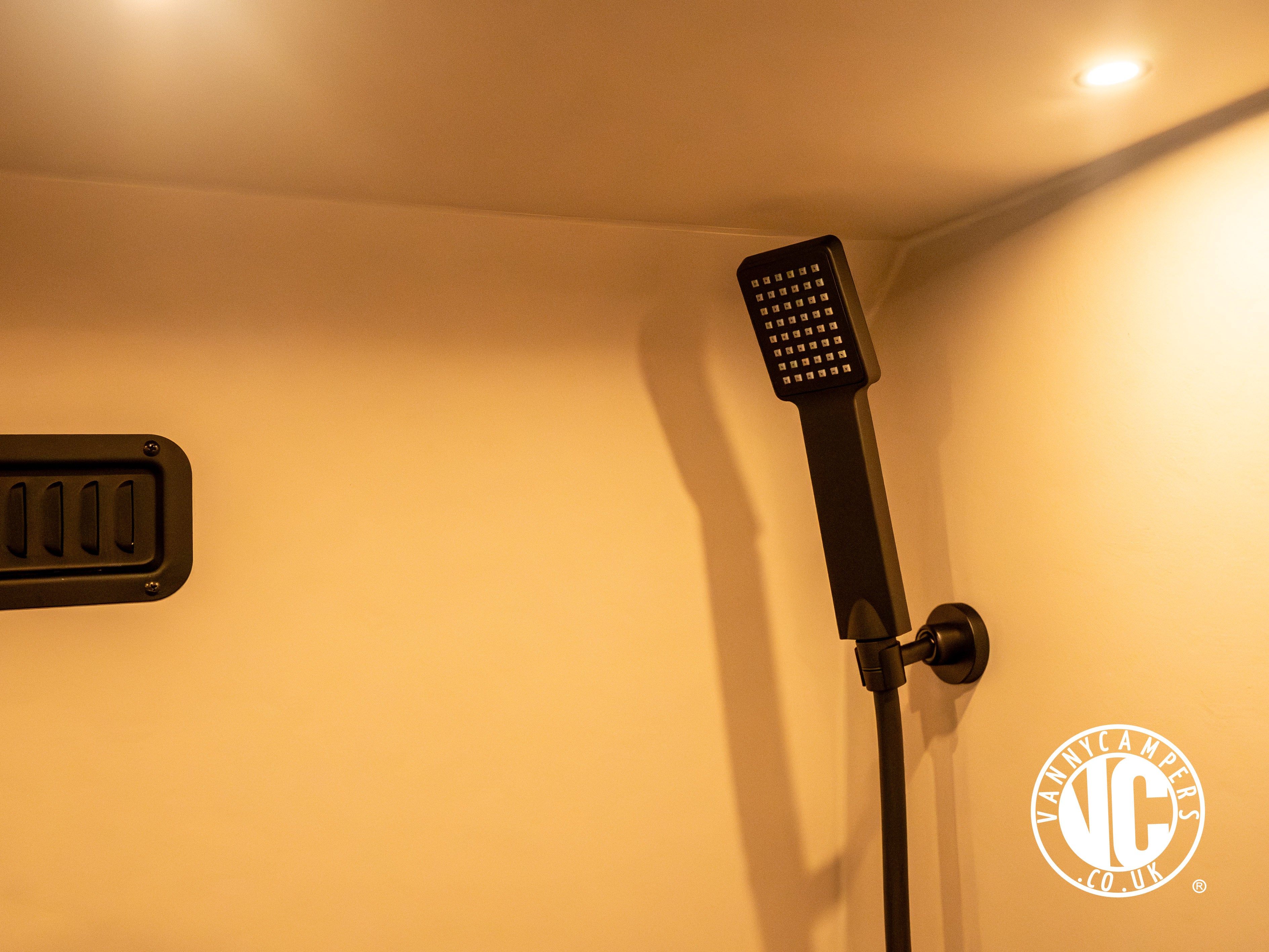 The bathroom features a Trelino EVO M composting toilet with its own removable storage area, a sleek Tamdour black aluminium bi-folding door, and a stylish black shower mixer and head with hot and cold water. A stainless-steel shower tray and plug, matt black hooks and shower caddy, and dimmable LED spot lighting make it both practical and modern. Wall-mounted fan keeps things fresh, while soft, natural Forbo wall panelling adds a warm, inviting touch.