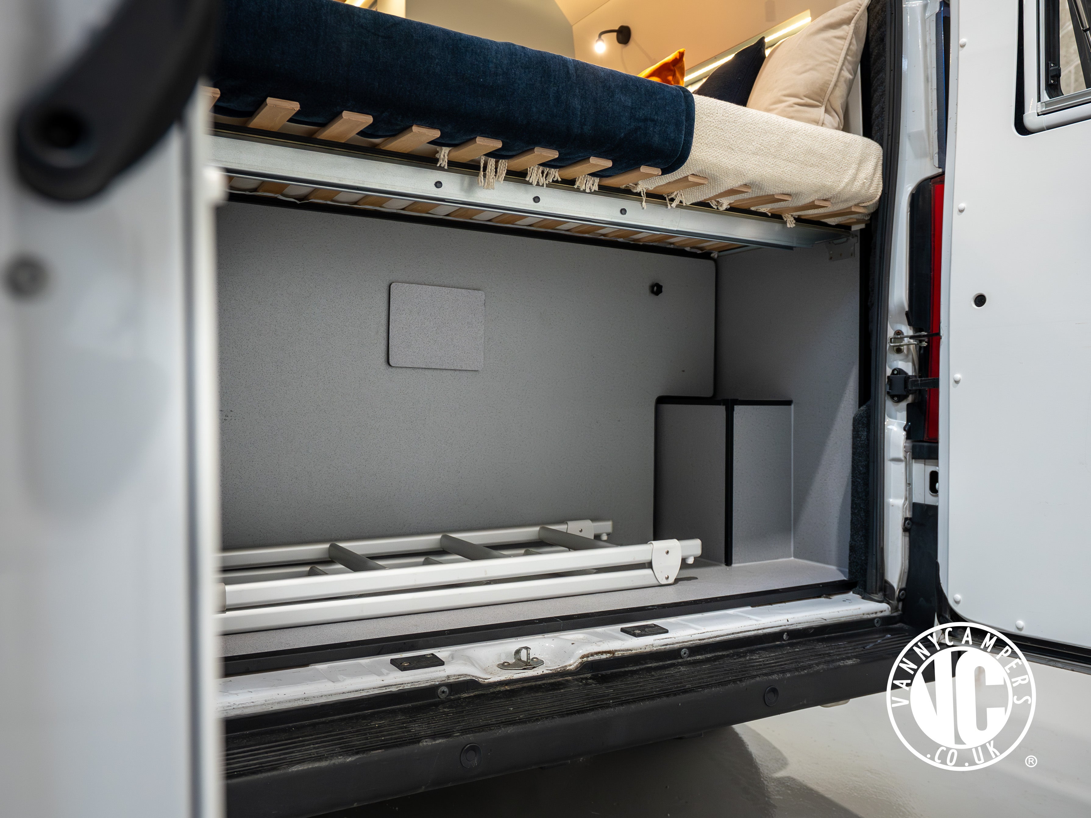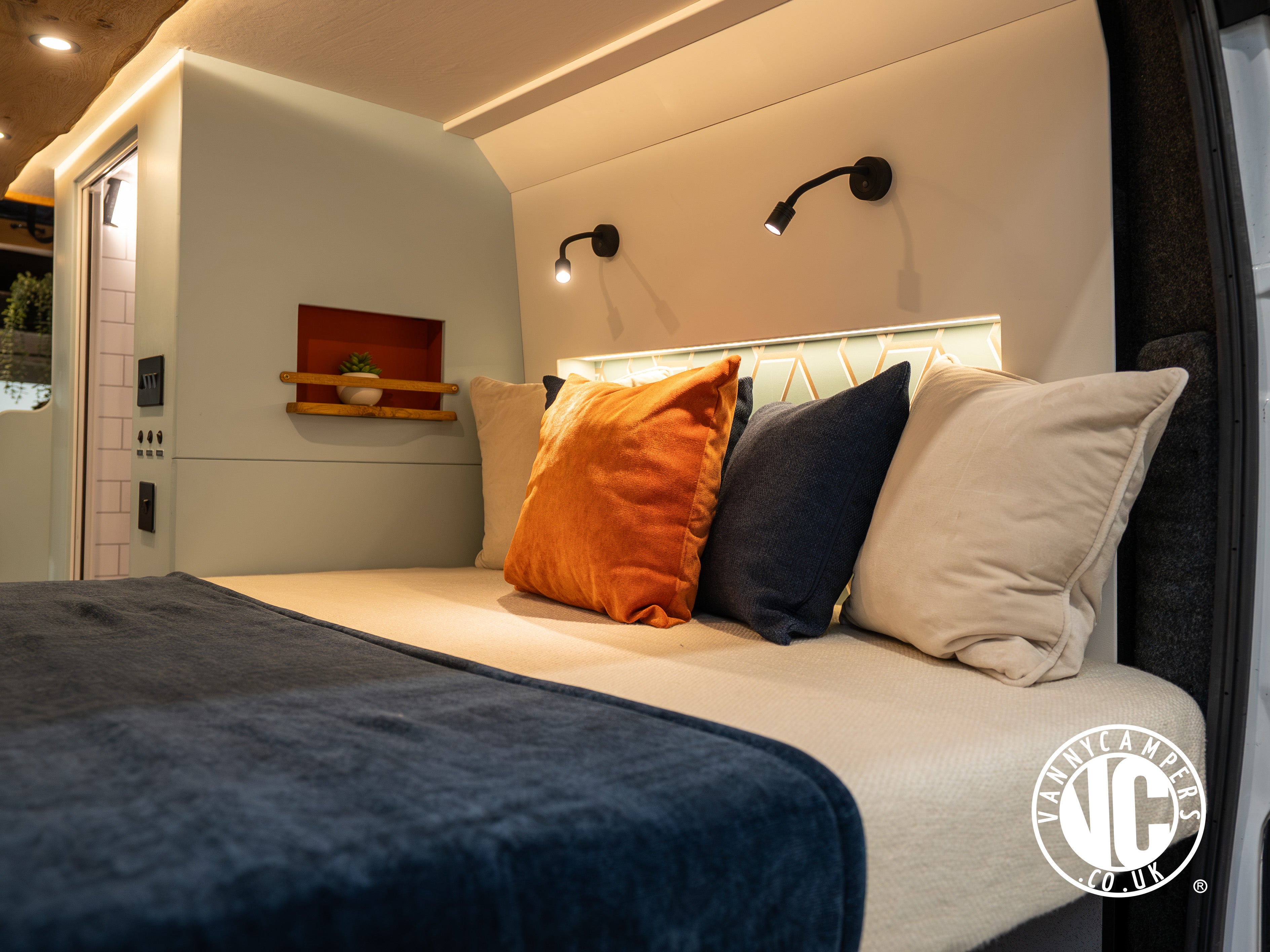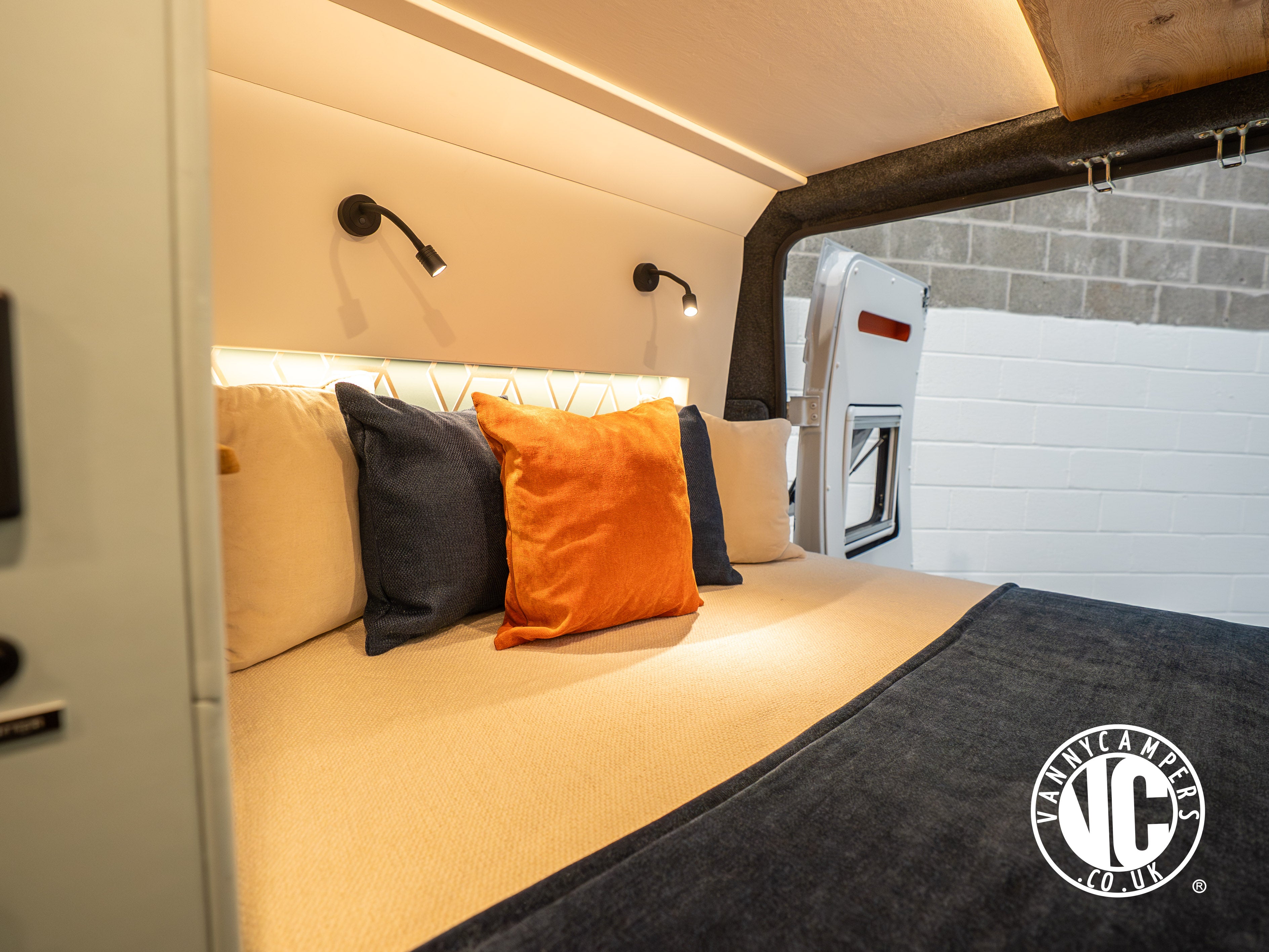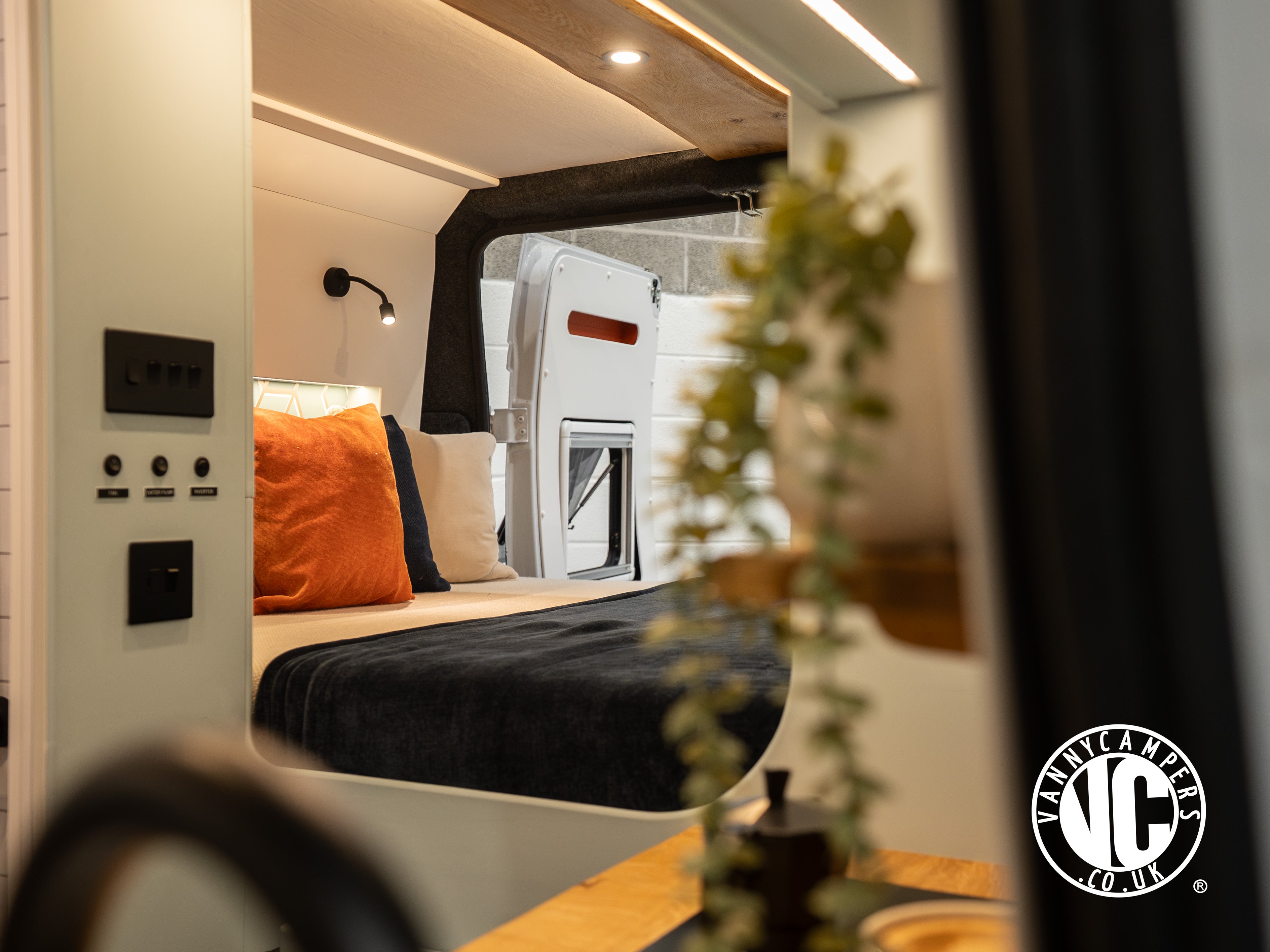 Livia comfortably sleeps four people across two thoughtfully designed beds. The main bed, larger than a standard double at 195 cm wide, stretches across the rear flares to give two adults plenty of space to relax. A custom-shaped, 10 cm thick firm reflex foam mattress covers the entire surface, ensuring comfort throughout the night, while feature reading lights add a touch of convenience. The second bed is in the pop-top, easily accessed via a ladder from the front of the van, making it perfect for extra family members or guests.
