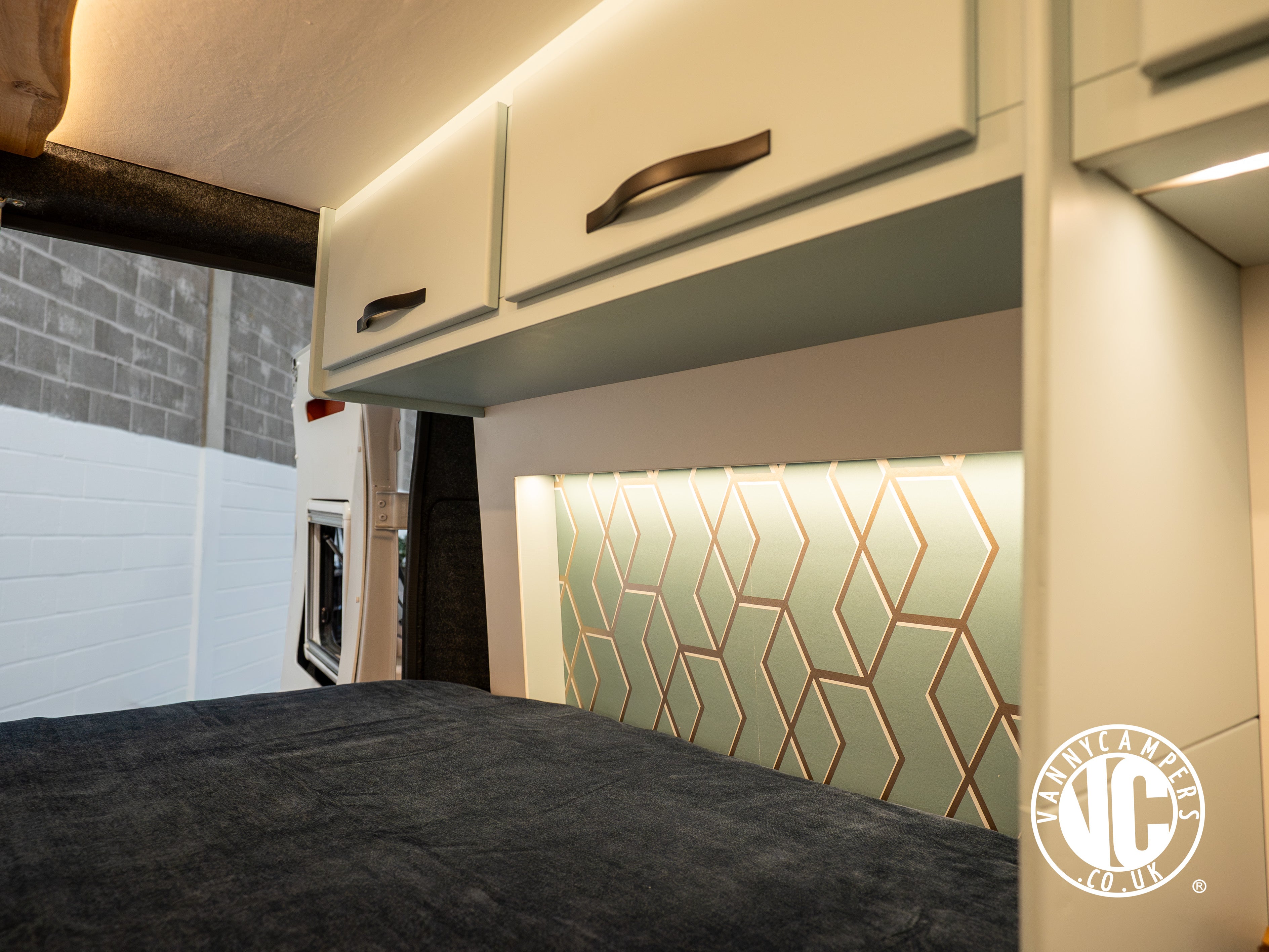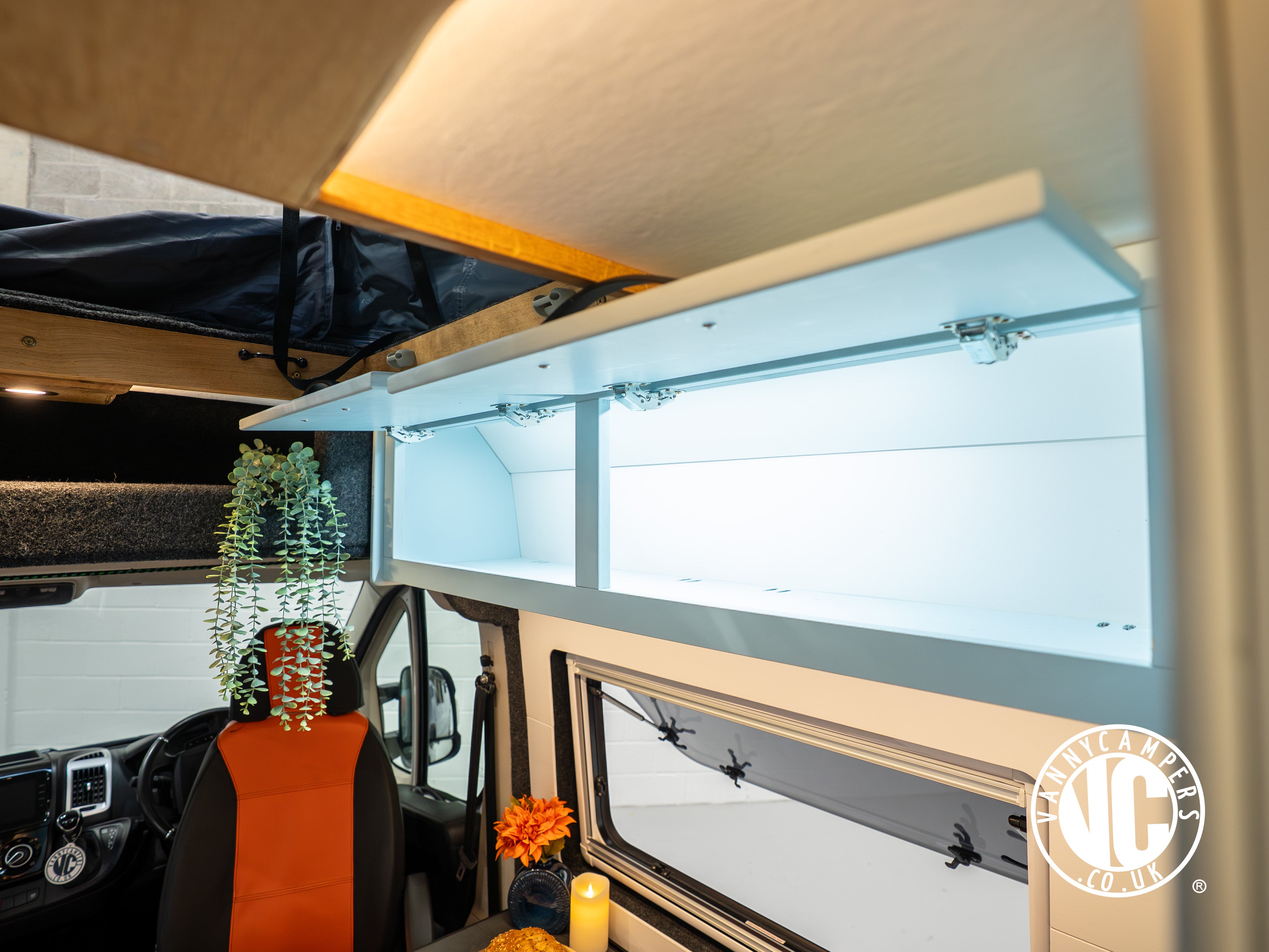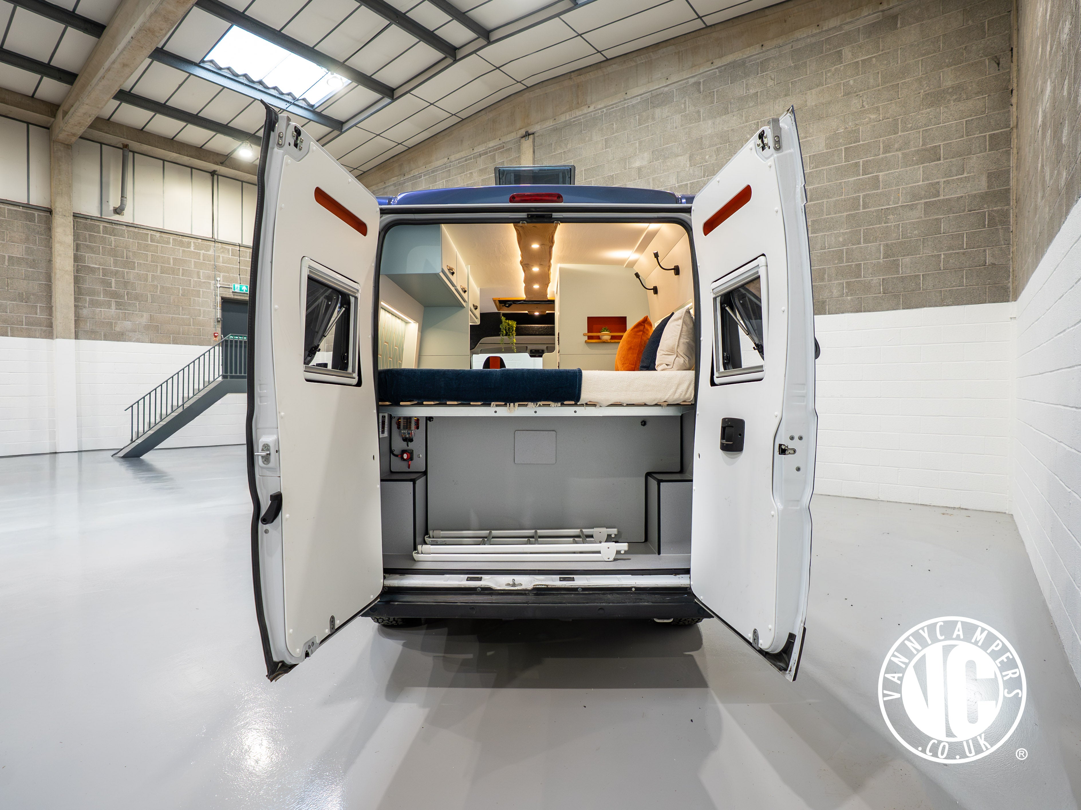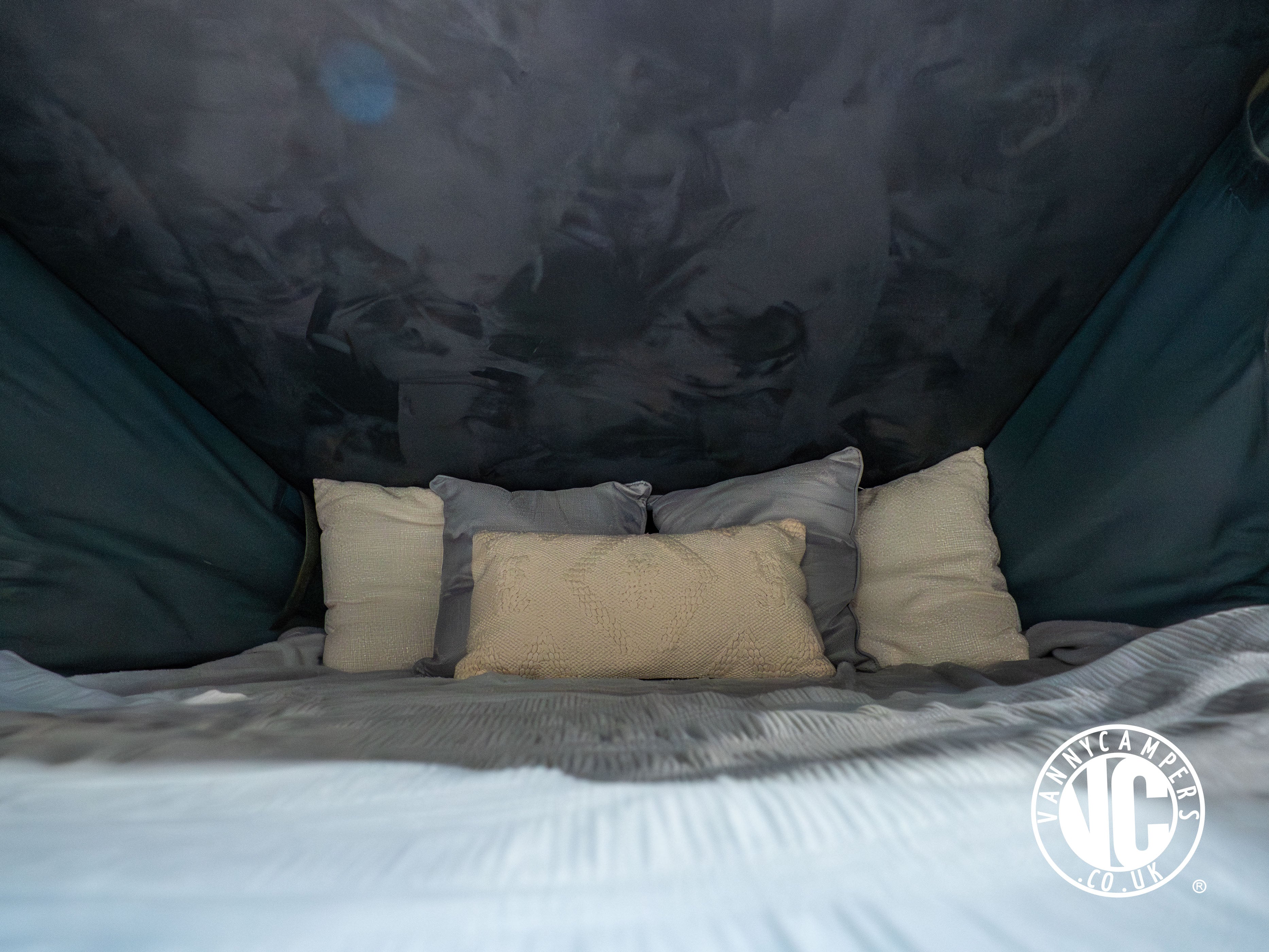 Livia comfortably sleeps four people across two thoughtfully designed beds. The main bed, larger than a standard double at 195 cm wide, stretches across the rear flares to give two adults plenty of space to relax. A custom-shaped, 10 cm thick firm reflex foam mattress covers the entire surface, ensuring comfort throughout the night, while feature reading lights add a touch of convenience. The second bed is in the pop-top, easily accessed via a ladder from the front of the van, making it perfect for extra family members or guests.