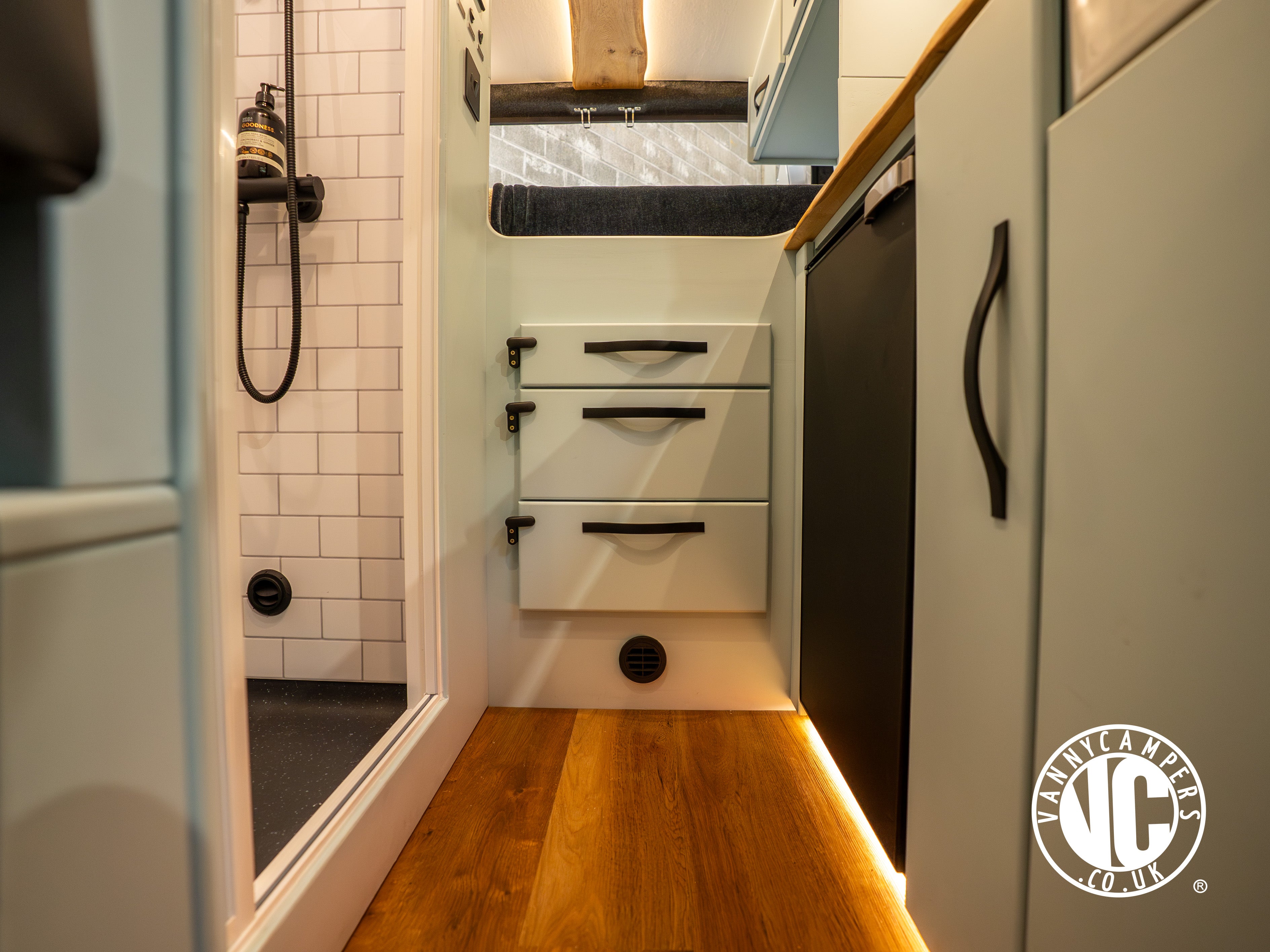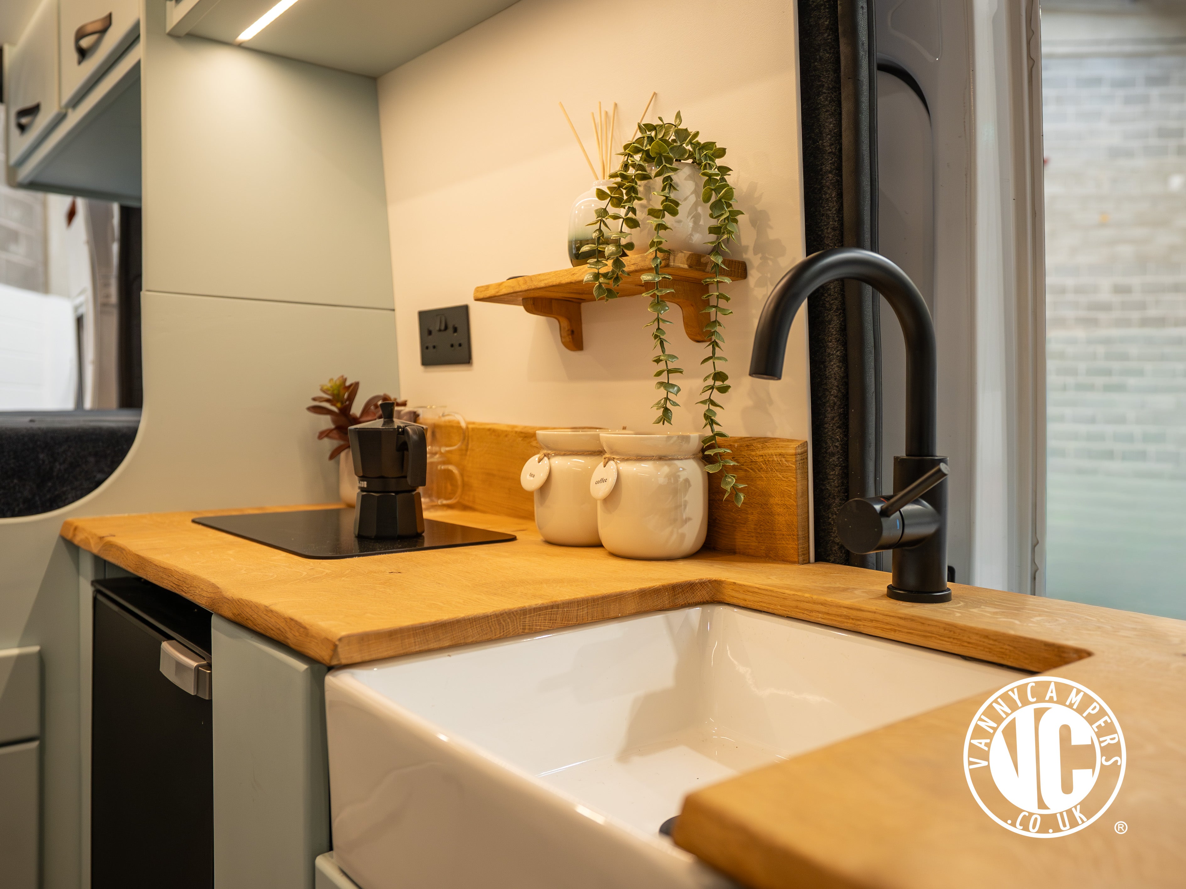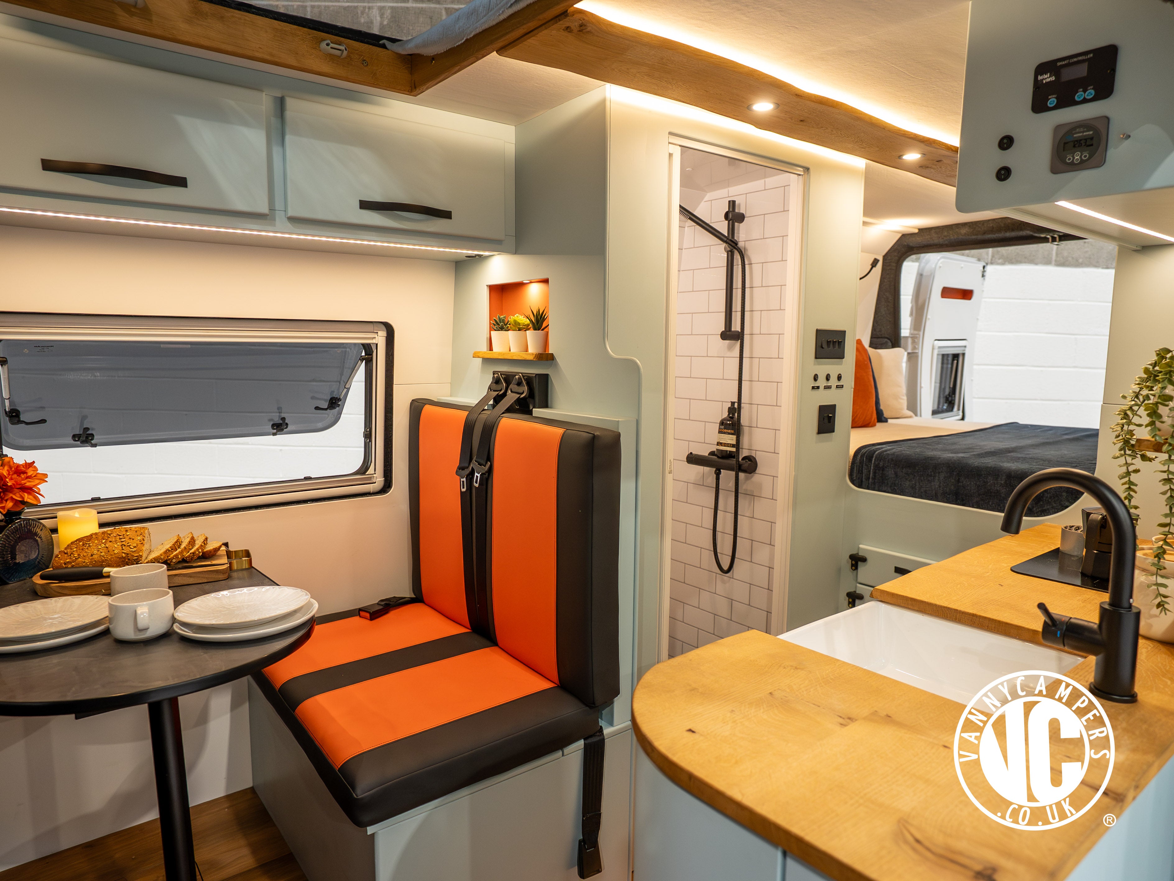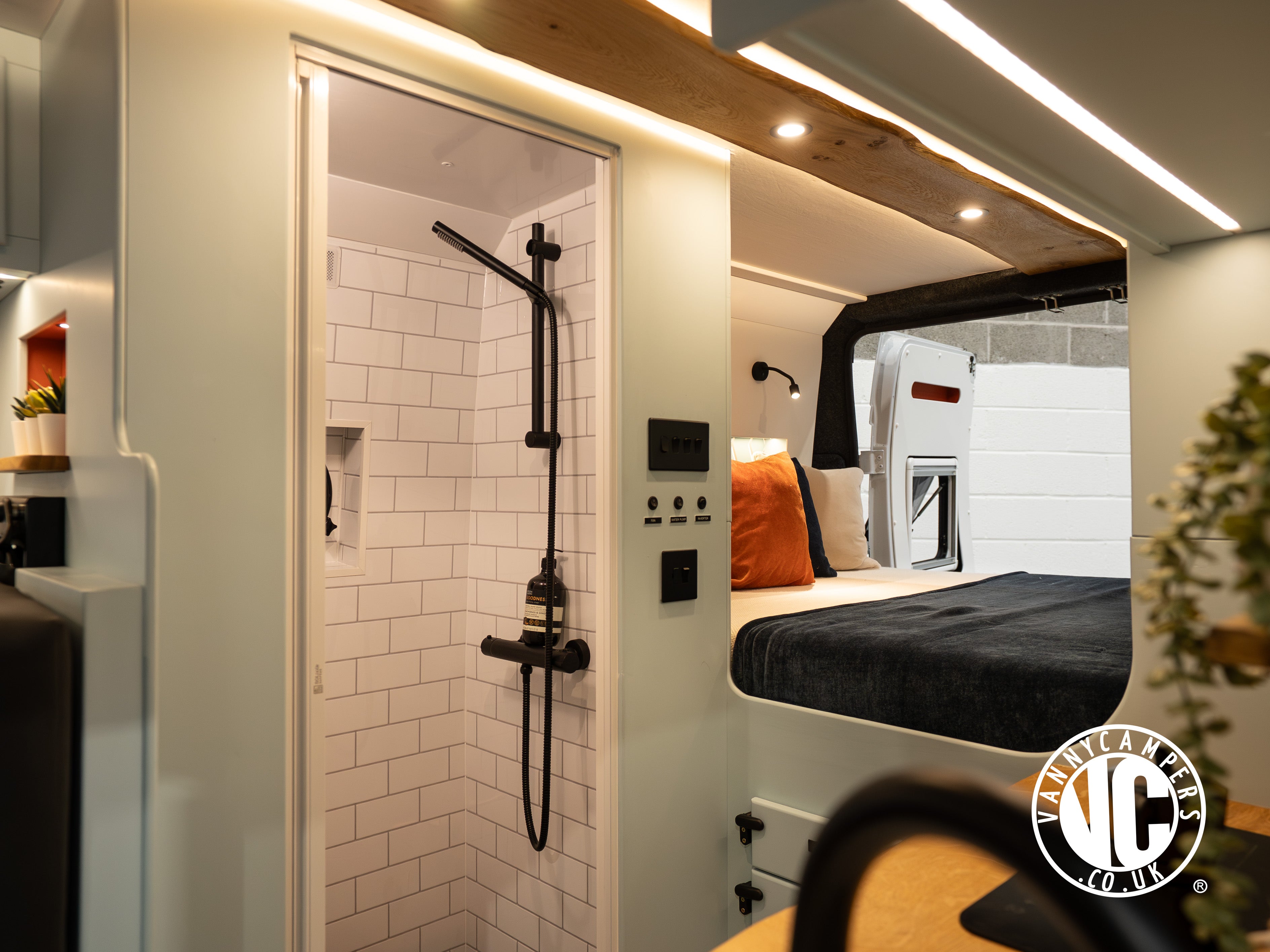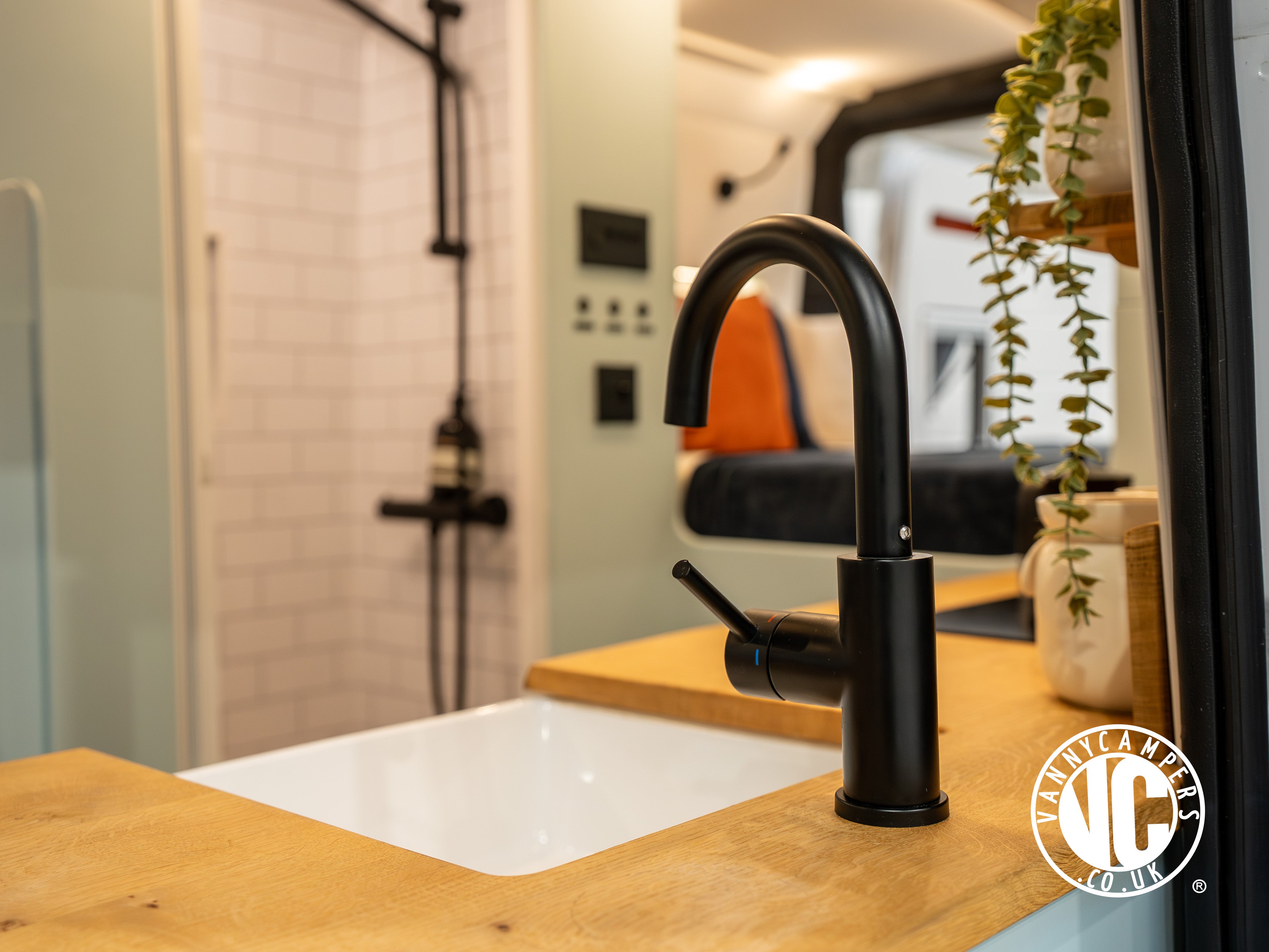 Livia features a beautifully handcrafted kitchen combining classic matt black fittings with solid oak worktops for a stylish yet practical finish. It includes a butler sink with matt black mixer tap, double induction hob, and an 85L Vitrifrigo 12V compressor fridge, along with plenty of storage through bespoke units, drawers, a cutlery drawer, and a handy pull-out pantry. A striking waney-edge oak splashback completes the look, while plinth and cupboard lighting add both style and practicality. Comfort is covered with an Autoterm 2kW diesel heater and a Bobil Vans diesel-powered hot water system, with a 95L freshwater tank and 62L waste tank mounted underneath to maximise interior space. A 400W solar panel on the pop-top helps keep everything powered for your adventures.