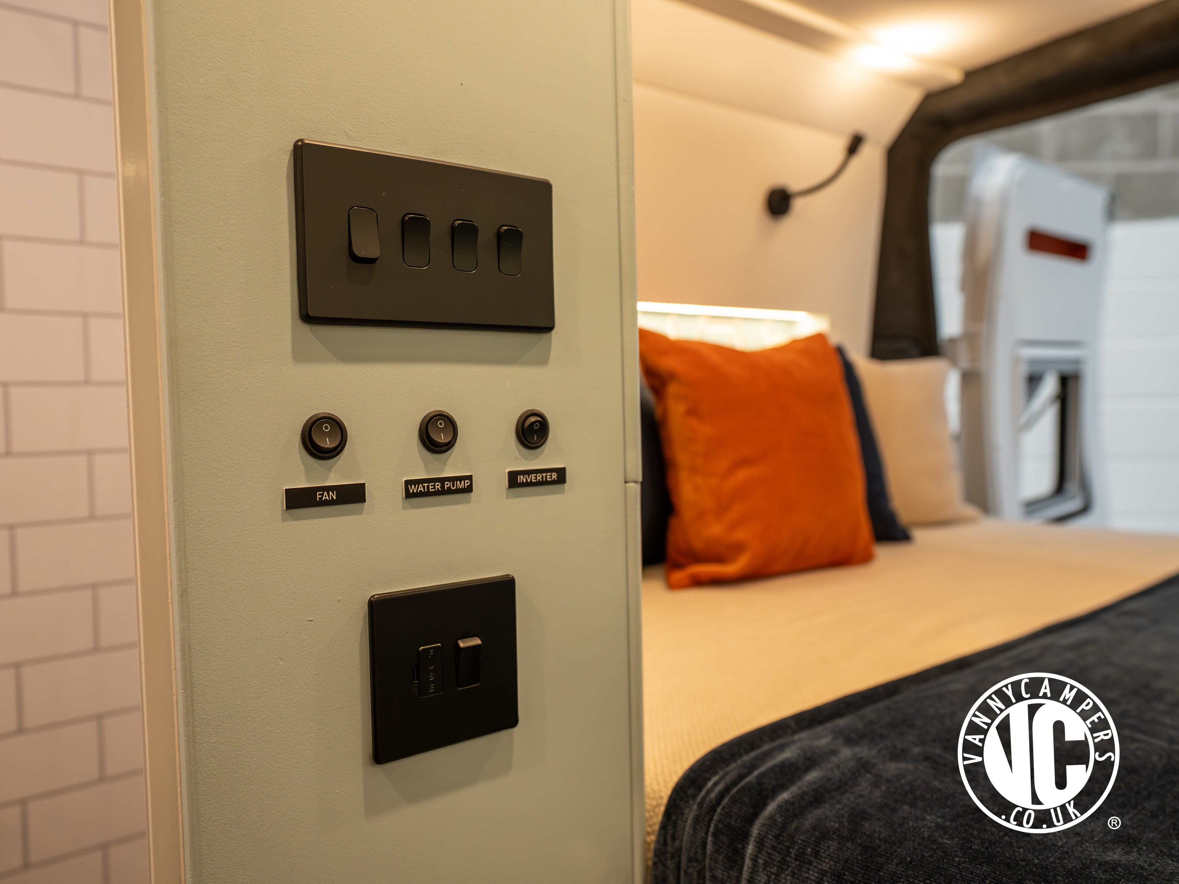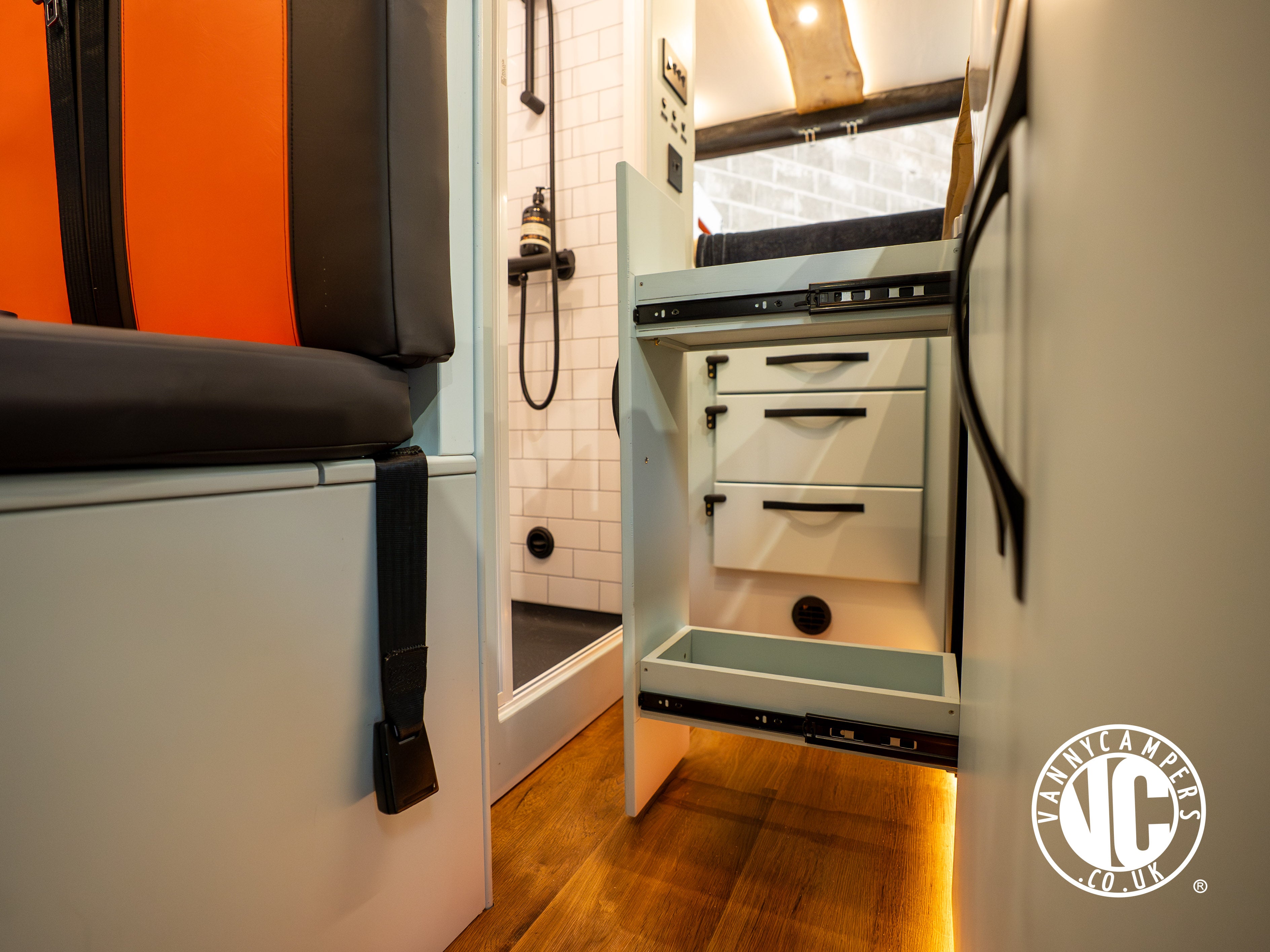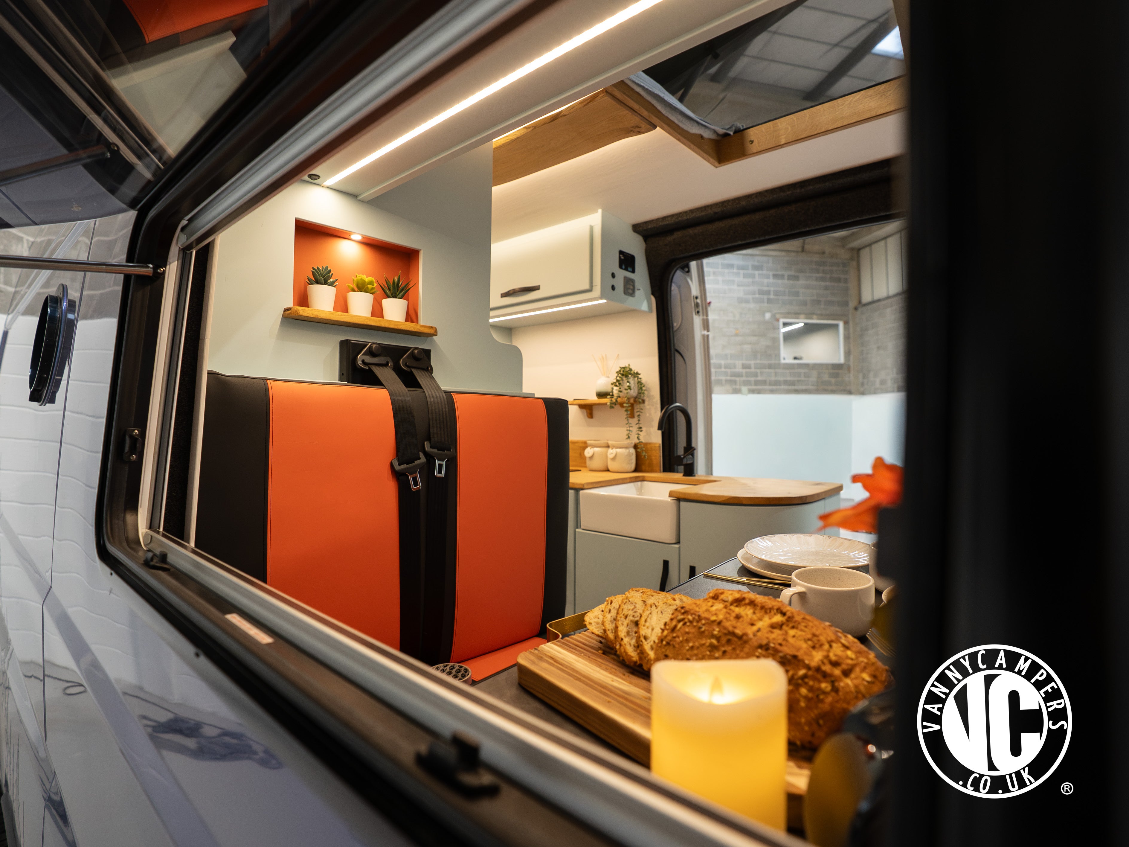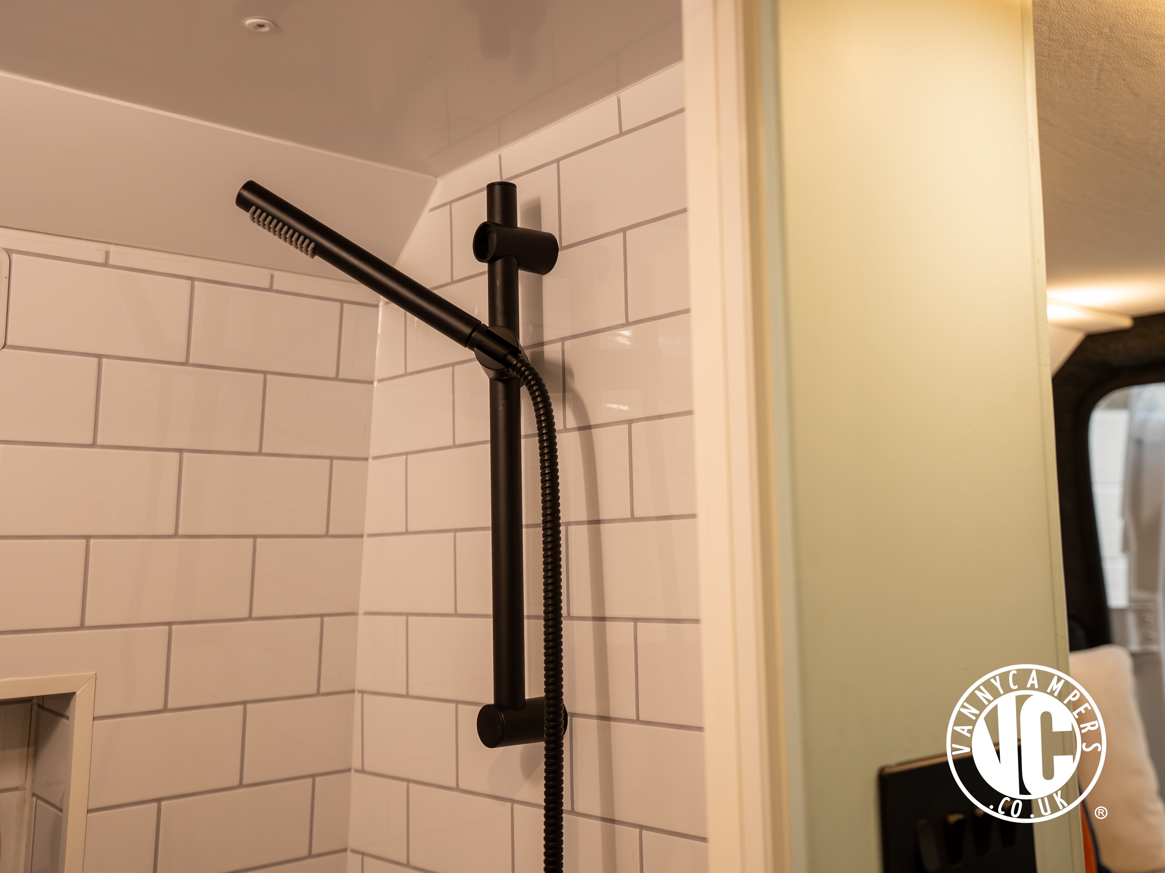 Livia features a beautifully handcrafted kitchen combining classic matt black fittings with solid oak worktops for a stylish yet practical finish. It includes a butler sink with matt black mixer tap, double induction hob, and an 85L Vitrifrigo 12V compressor fridge, along with plenty of storage through bespoke units, drawers, a cutlery drawer, and a handy pull-out pantry. A striking waney-edge oak splashback completes the look, while plinth and cupboard lighting add both style and practicality. Comfort is covered with an Autoterm 2kW diesel heater and a Bobil Vans diesel-powered hot water system, with a 95L freshwater tank and 62L waste tank mounted underneath to maximise interior space. A 400W solar panel on the pop-top helps keep everything powered for your adventures.