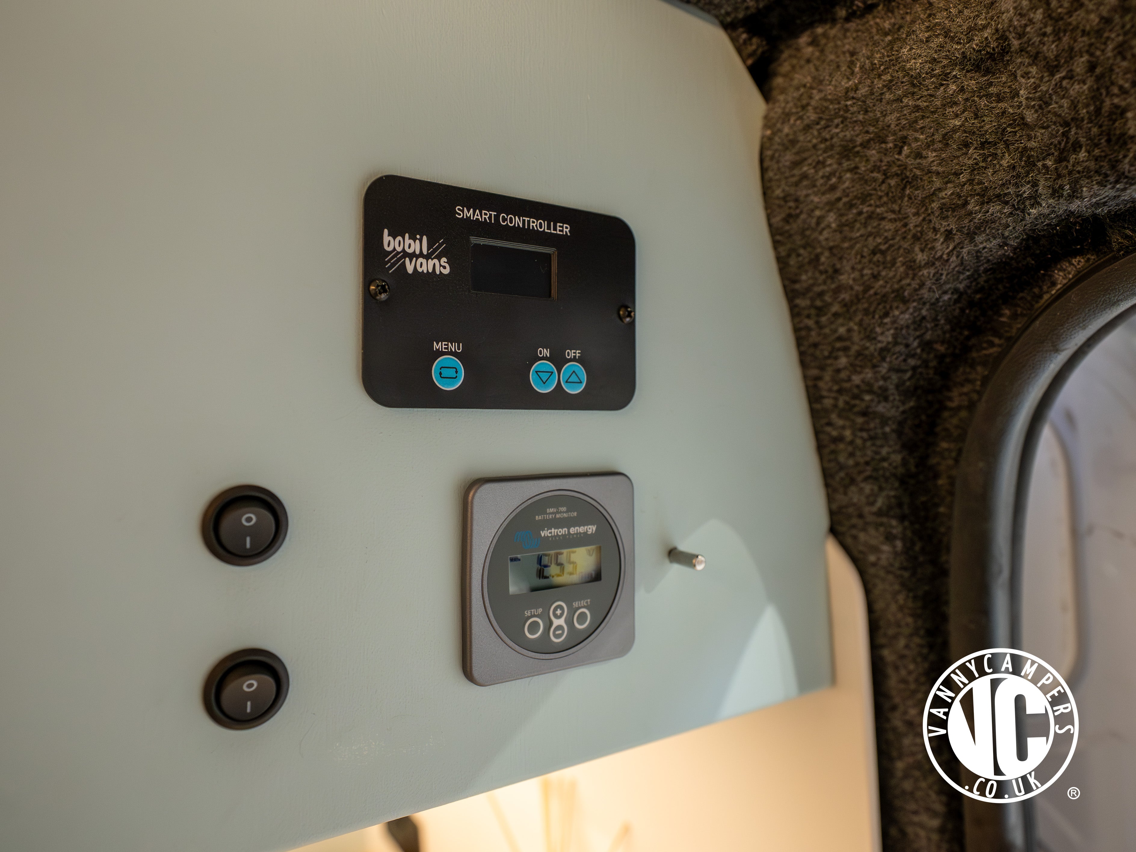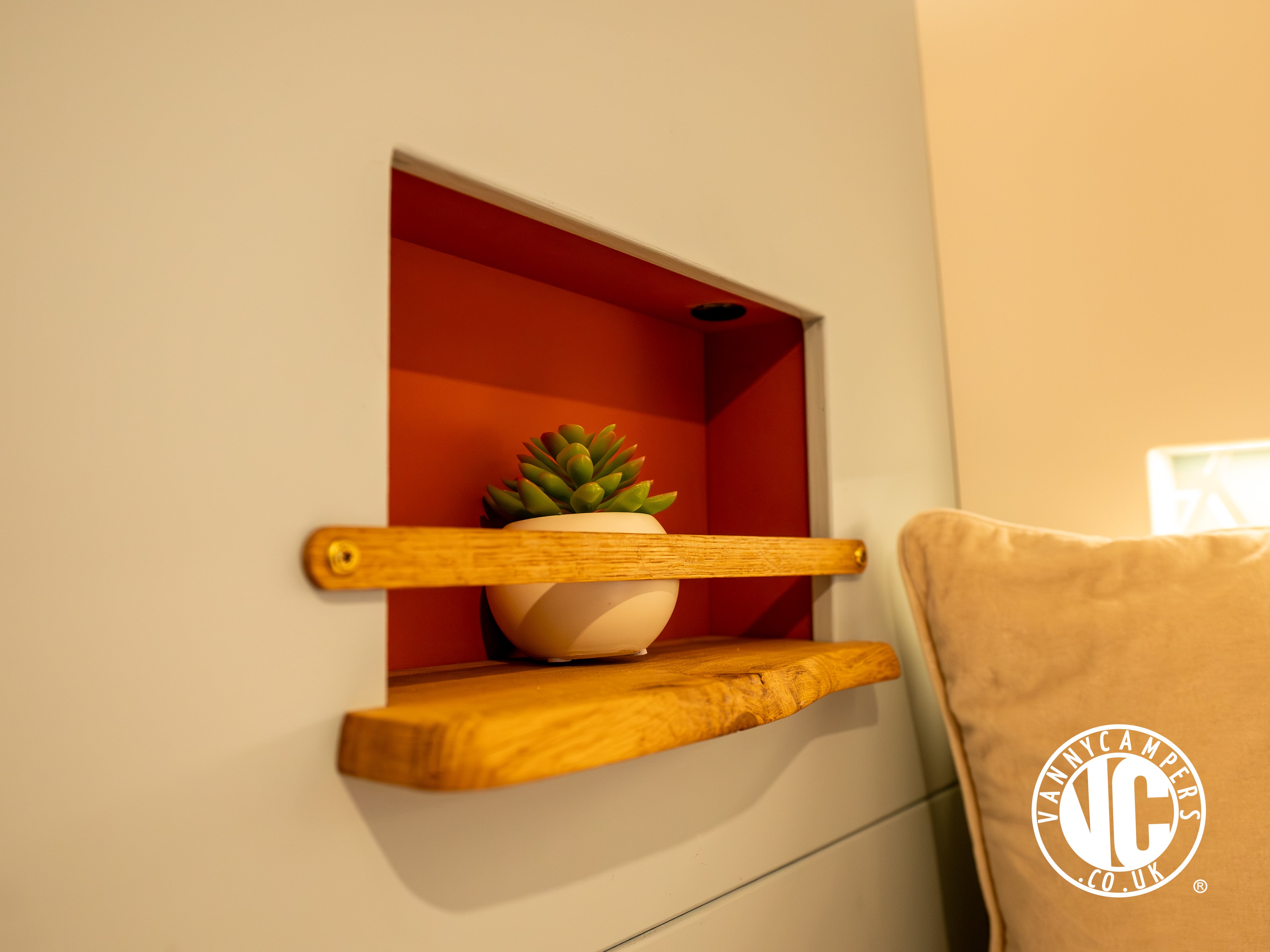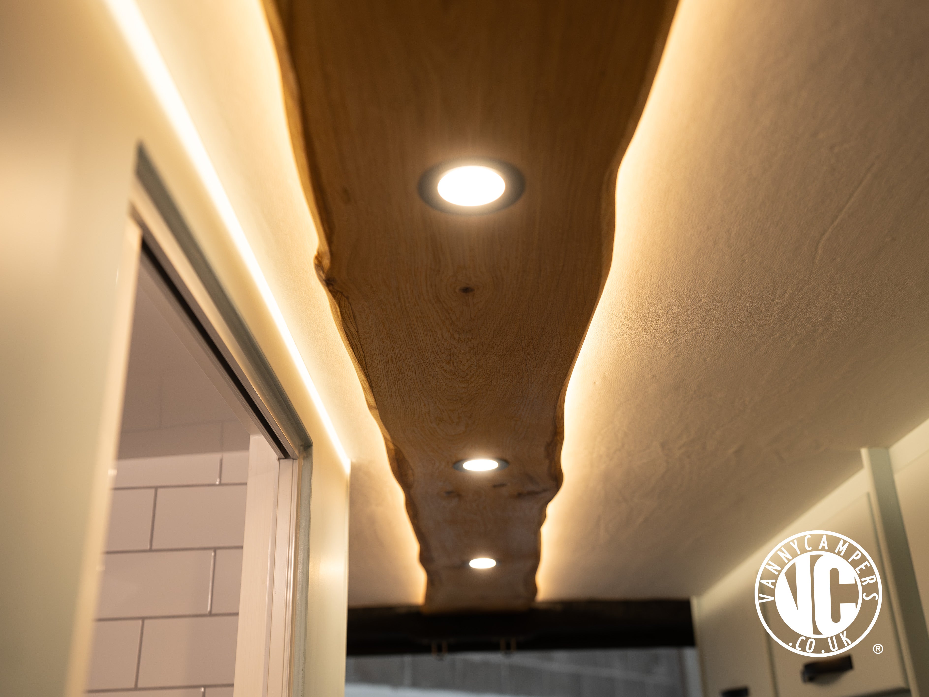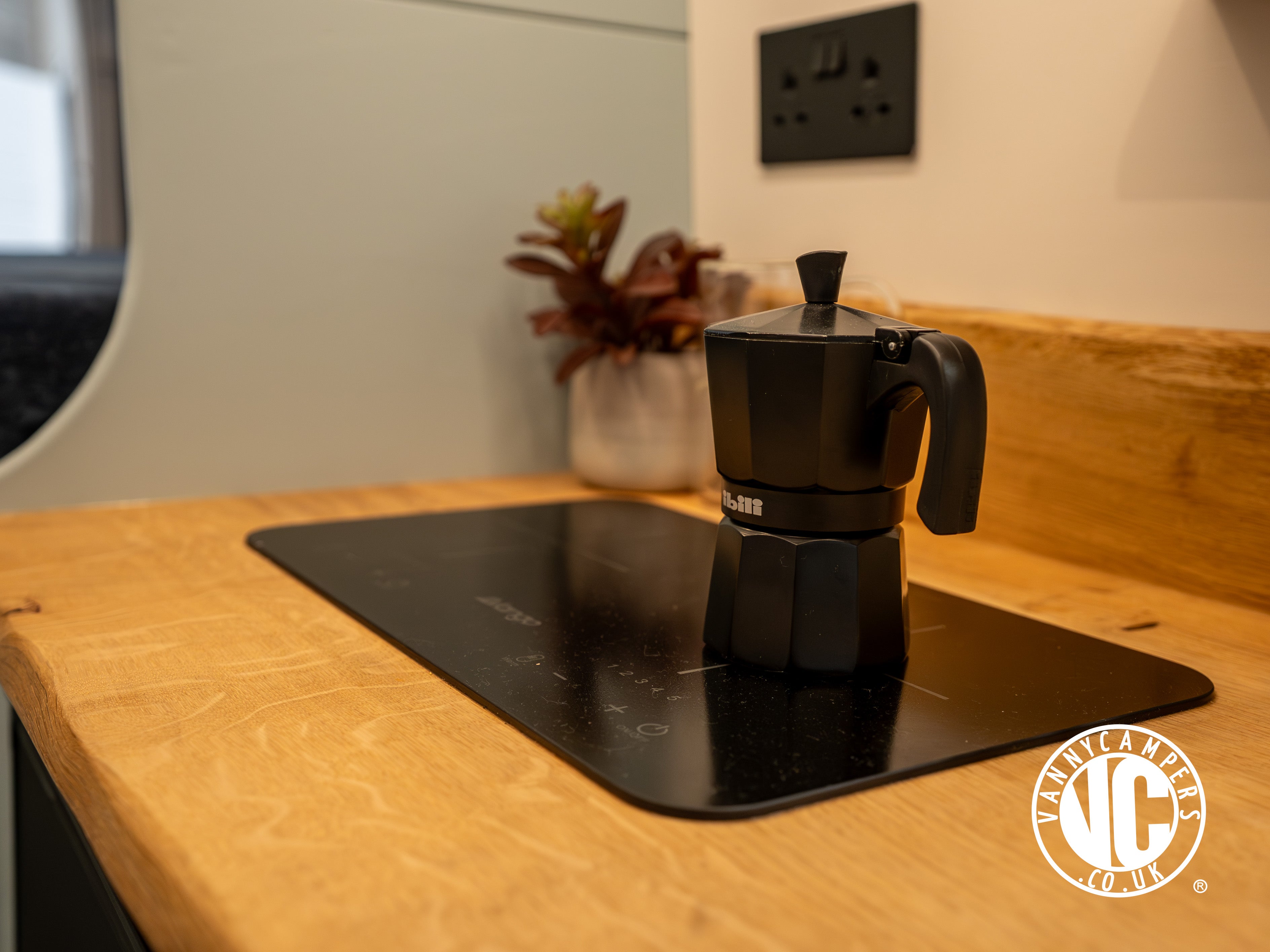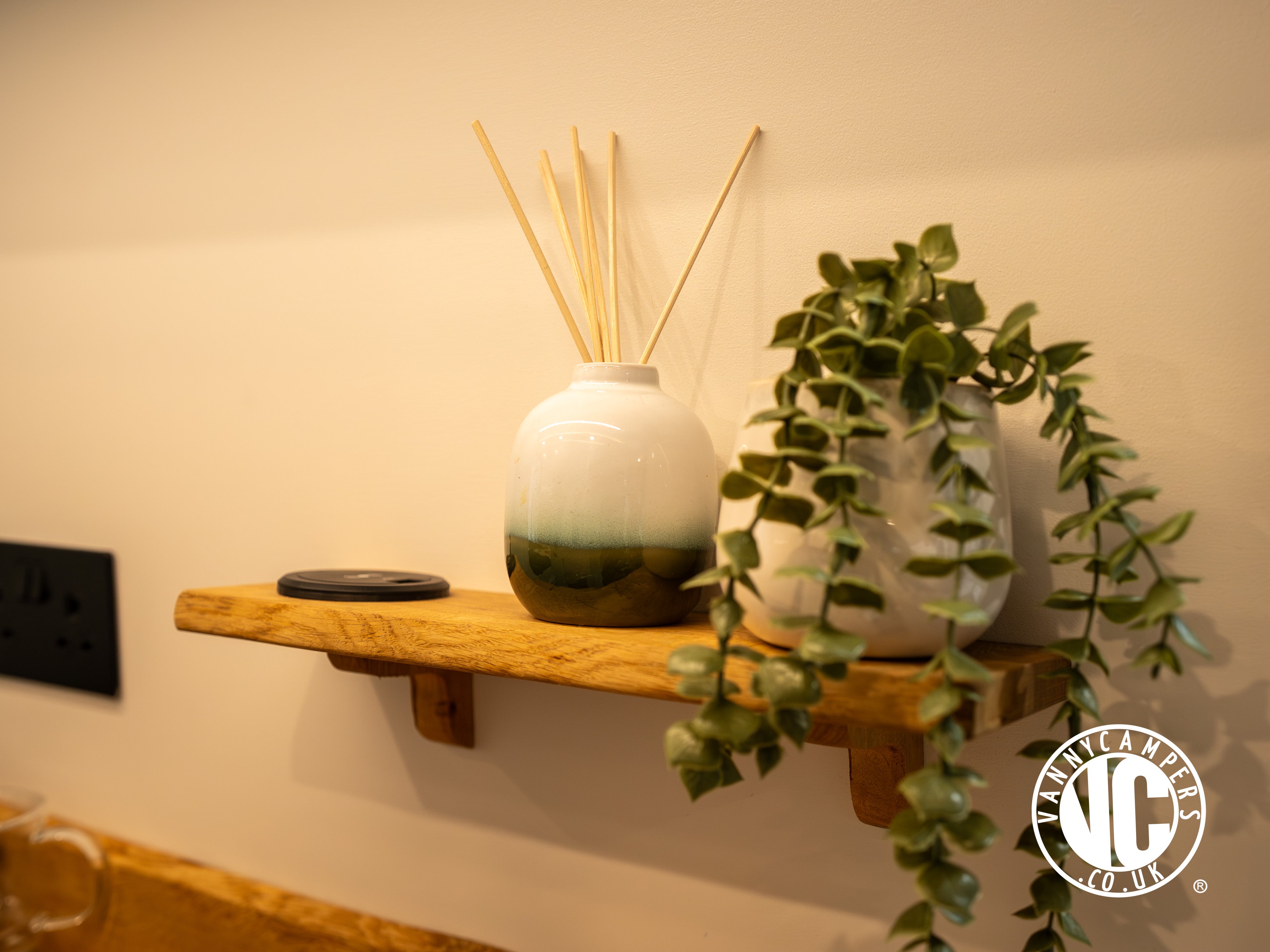 Livia features a beautifully handcrafted kitchen combining classic matt black fittings with solid oak worktops for a stylish yet practical finish. It includes a butler sink with matt black mixer tap, double induction hob, and an 85L Vitrifrigo 12V compressor fridge, along with plenty of storage through bespoke units, drawers, a cutlery drawer, and a handy pull-out pantry. A striking waney-edge oak splashback completes the look, while plinth and cupboard lighting add both style and practicality. Comfort is covered with an Autoterm 2kW diesel heater and a Bobil Vans diesel-powered hot water system, with a 95L freshwater tank and 62L waste tank mounted underneath to maximise interior space. A 400W solar panel on the pop-top helps keep everything powered for your adventures.