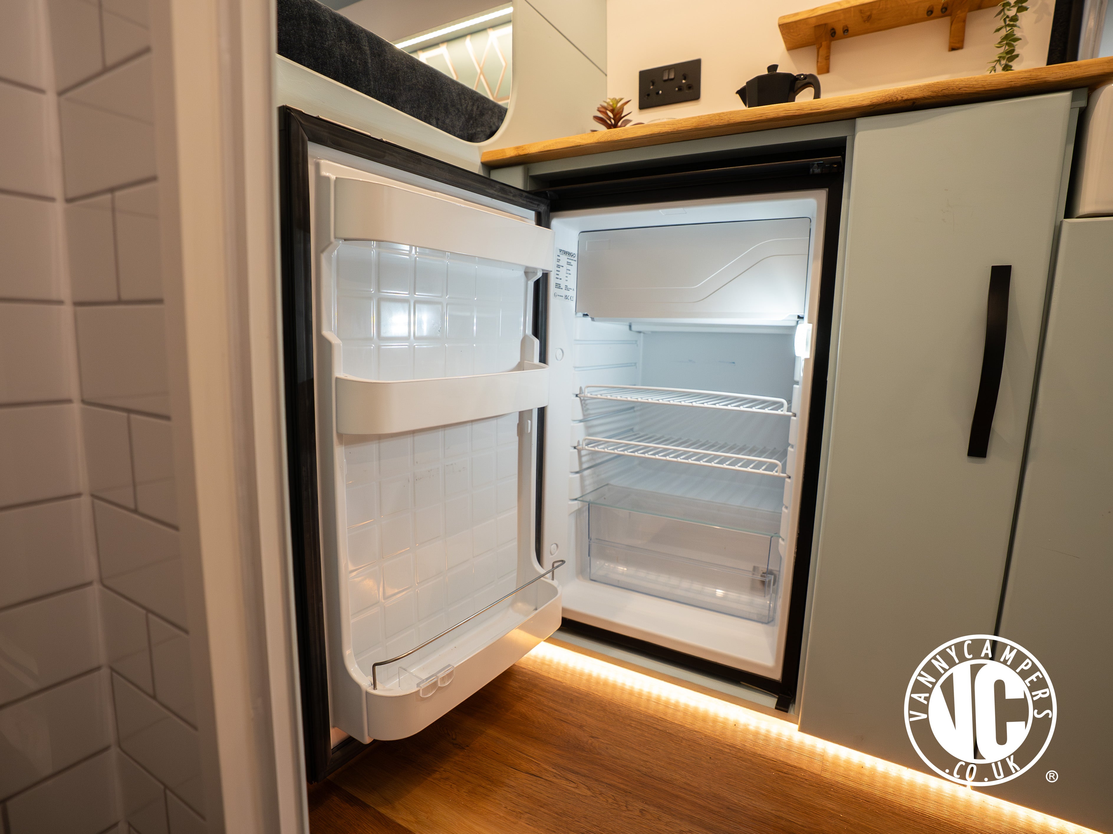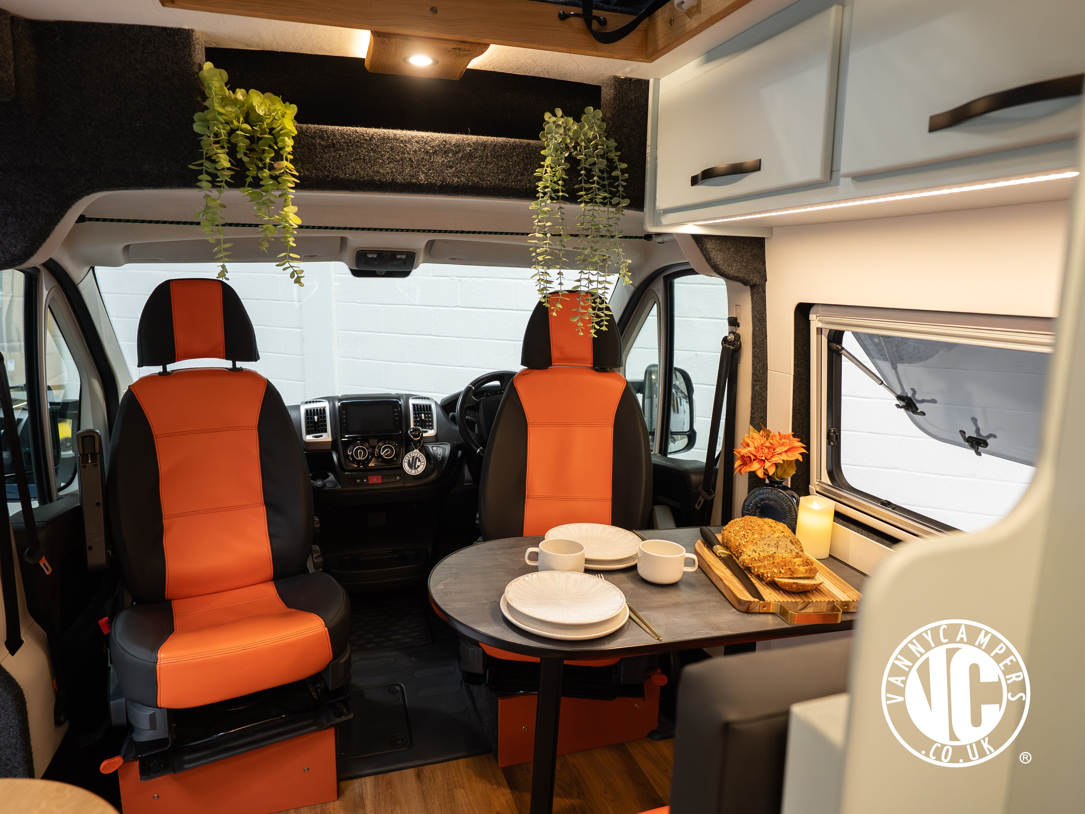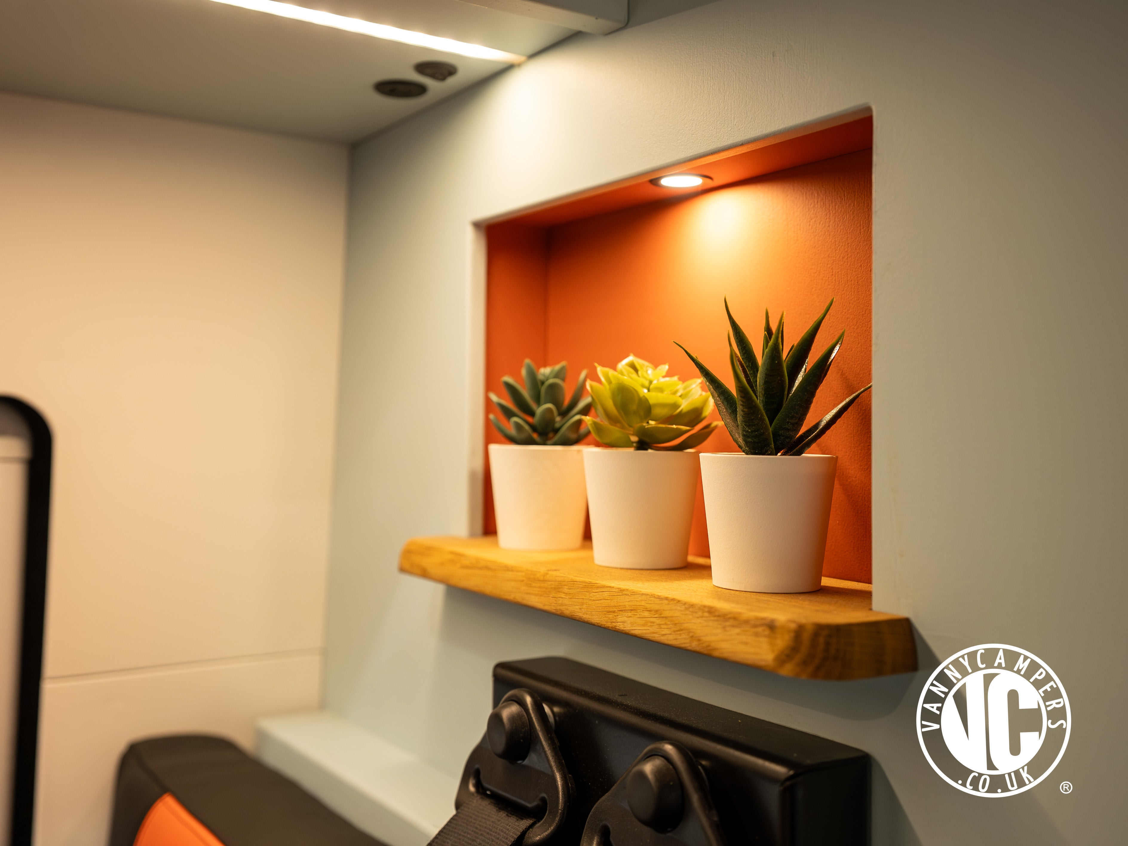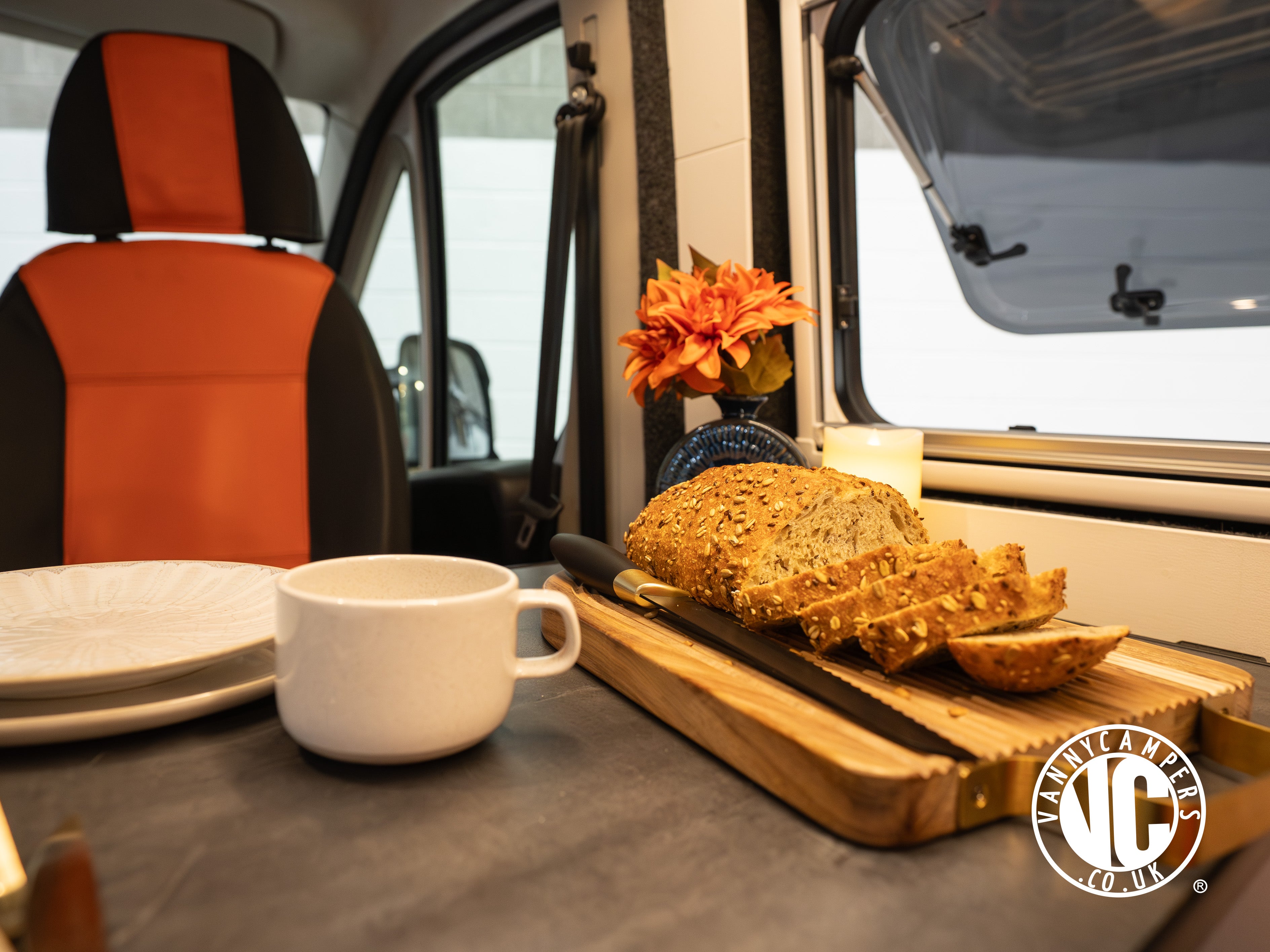 Livia features a beautifully handcrafted kitchen combining classic matt black fittings with solid oak worktops for a stylish yet practical finish. It includes a butler sink with matt black mixer tap, double induction hob, and an 85L Vitrifrigo 12V compressor fridge, along with plenty of storage through bespoke units, drawers, a cutlery drawer, and a handy pull-out pantry. A striking waney-edge oak splashback completes the look, while plinth and cupboard lighting add both style and practicality. Comfort is covered with an Autoterm 2kW diesel heater and a Bobil Vans diesel-powered hot water system, with a 95L freshwater tank and 62L waste tank mounted underneath to maximise interior space. A 400W solar panel on the pop-top helps keep everything powered for your adventures.