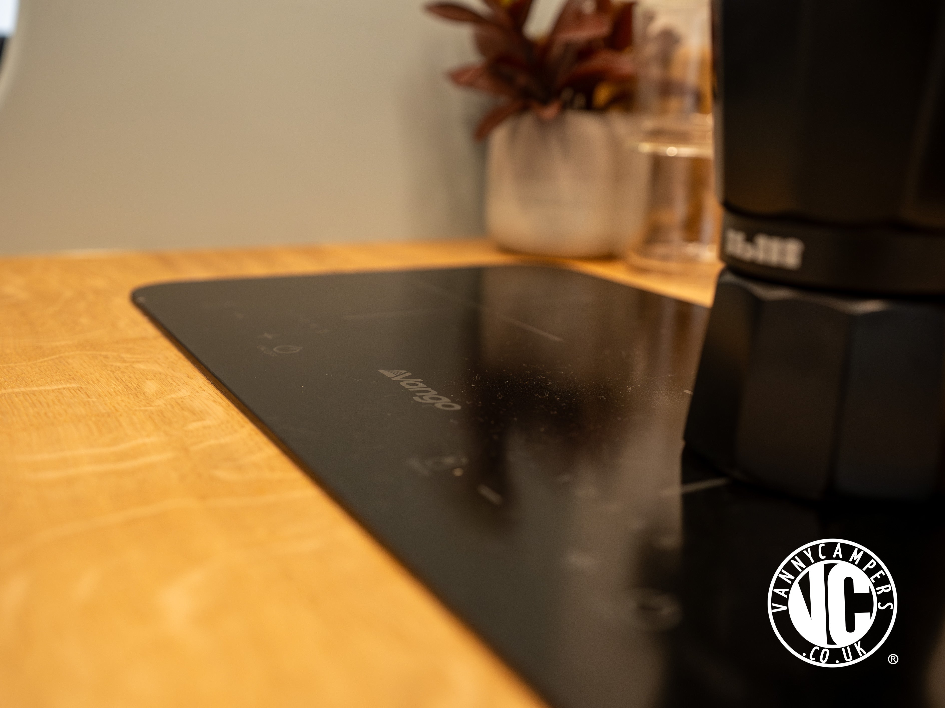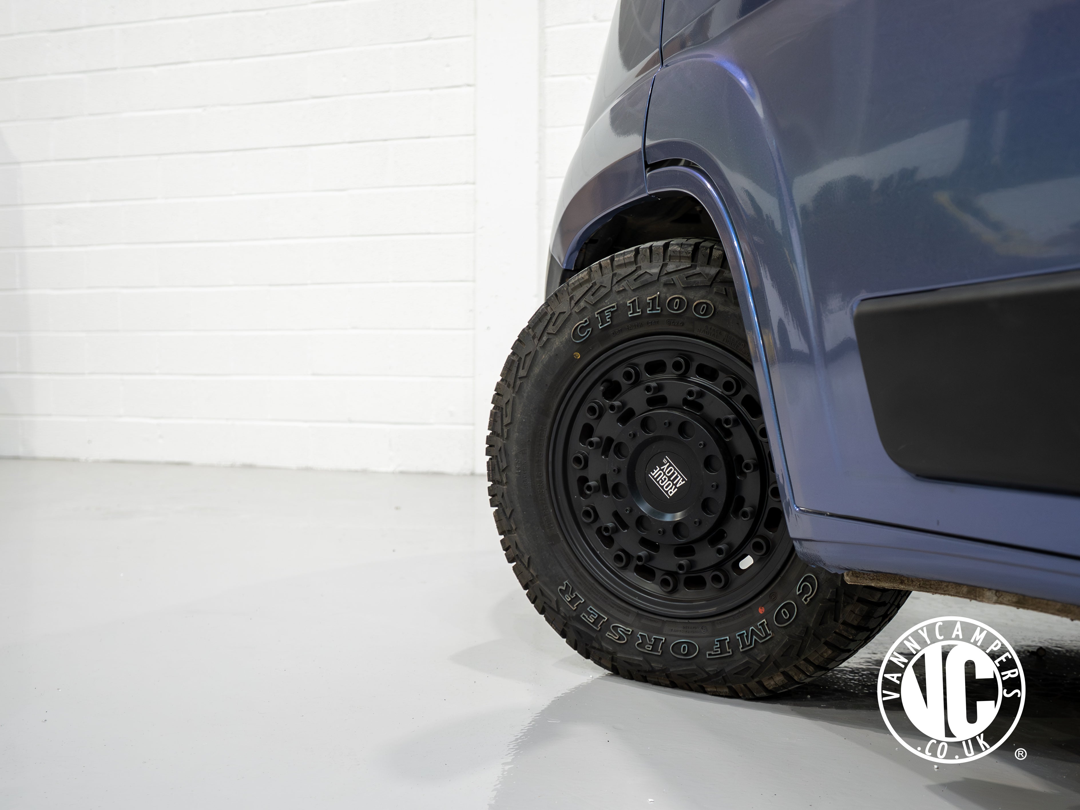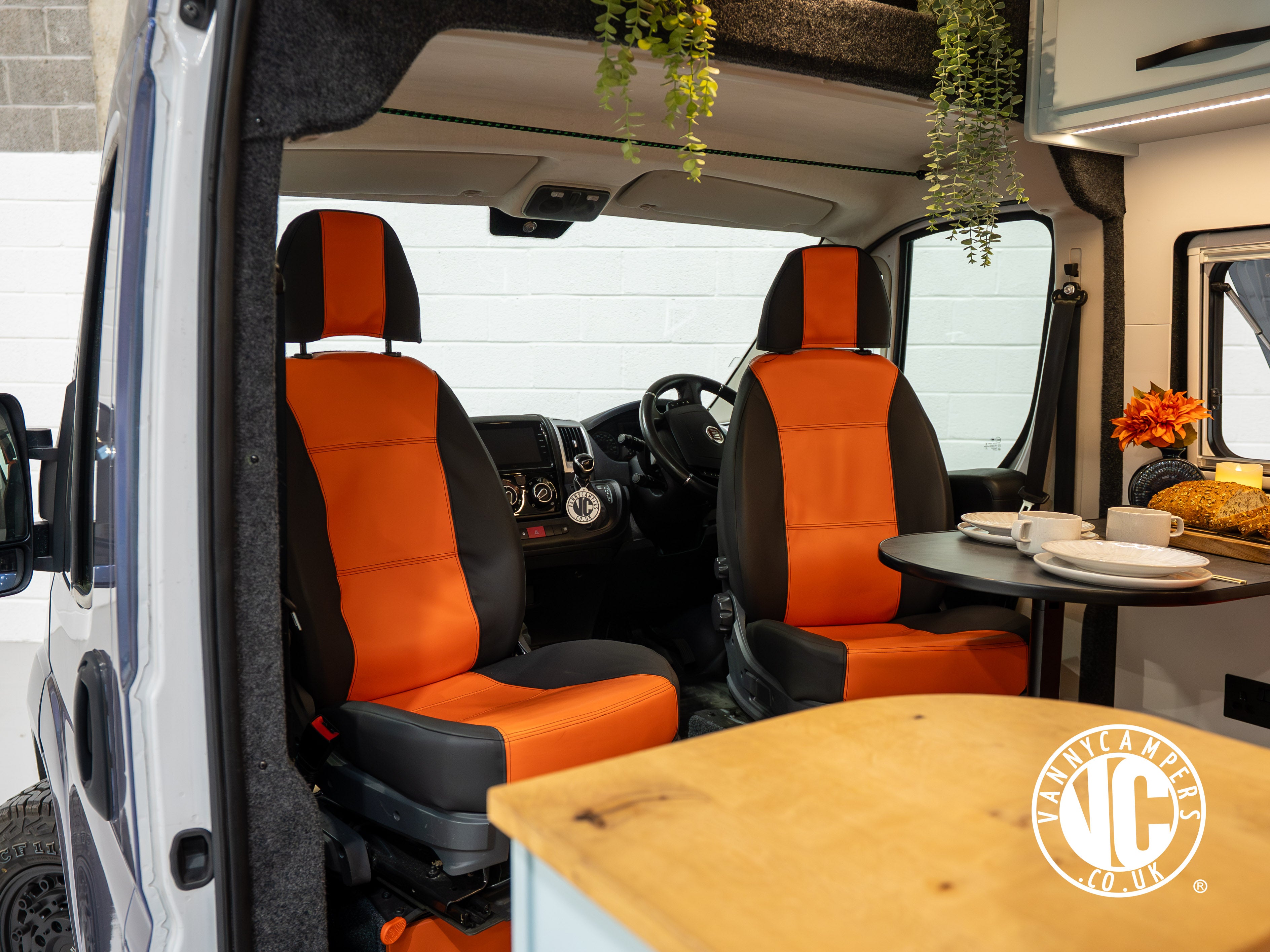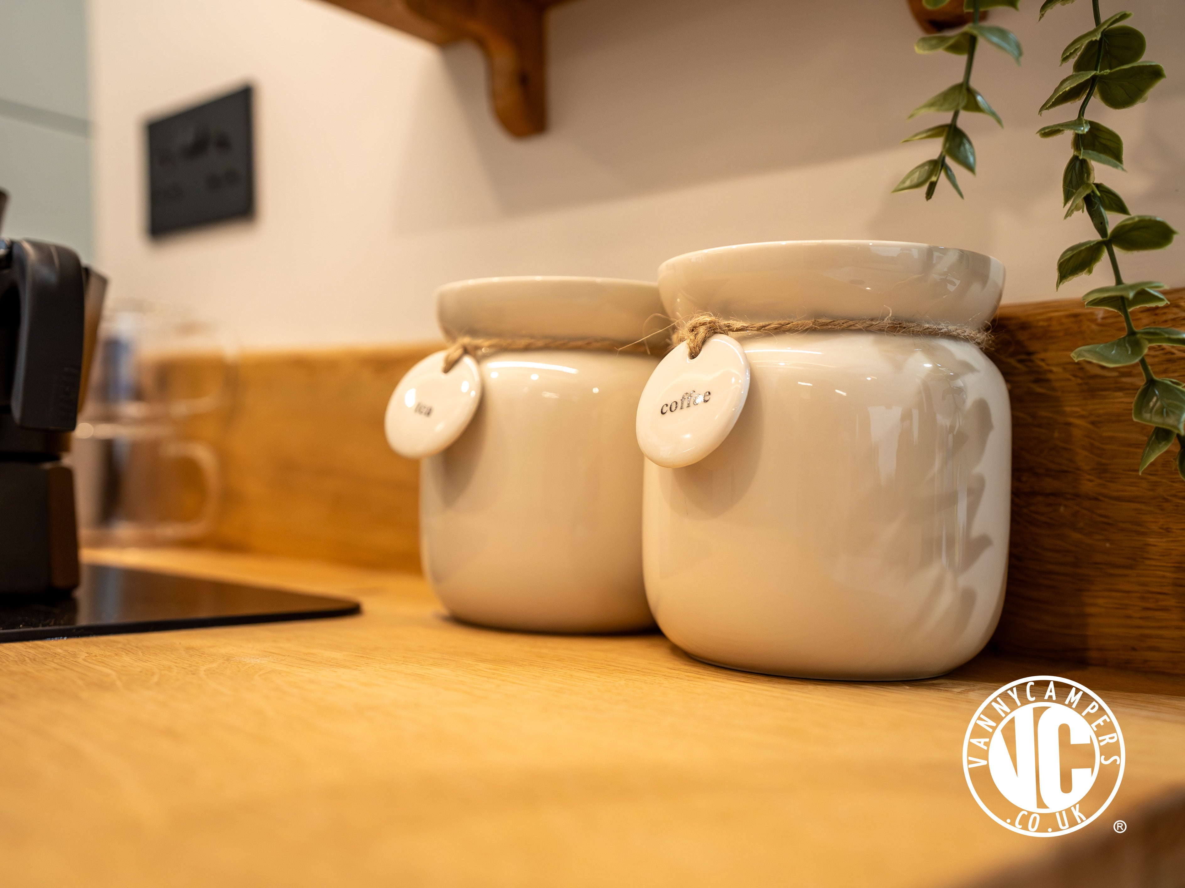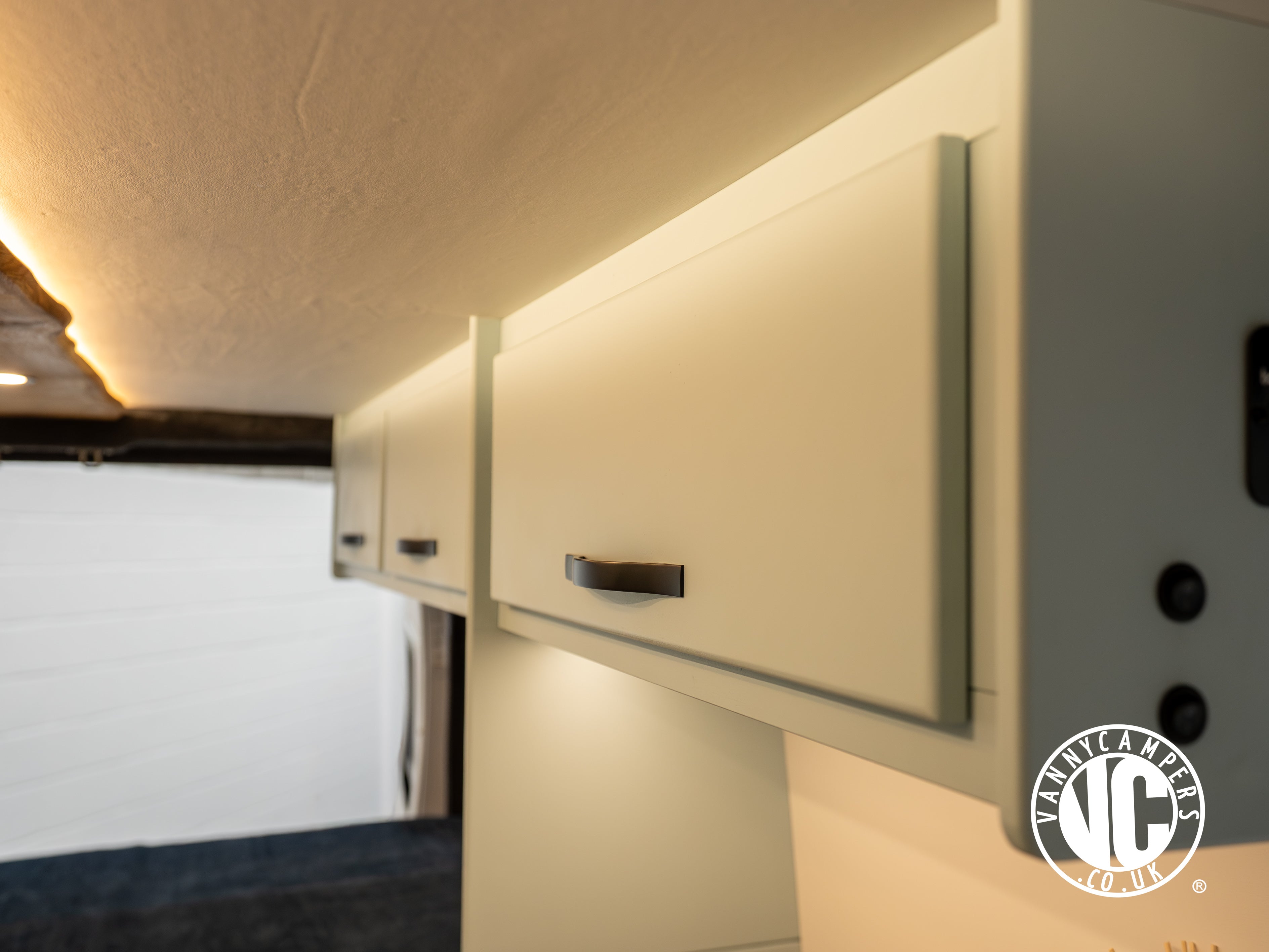 Livia features a beautifully handcrafted kitchen combining classic matt black fittings with solid oak worktops for a stylish yet practical finish. It includes a butler sink with matt black mixer tap, double induction hob, and an 85L Vitrifrigo 12V compressor fridge, along with plenty of storage through bespoke units, drawers, a cutlery drawer, and a handy pull-out pantry. A striking waney-edge oak splashback completes the look, while plinth and cupboard lighting add both style and practicality. Comfort is covered with an Autoterm 2kW diesel heater and a Bobil Vans diesel-powered hot water system, with a 95L freshwater tank and 62L waste tank mounted underneath to maximise interior space. A 400W solar panel on the pop-top helps keep everything powered for your adventures.