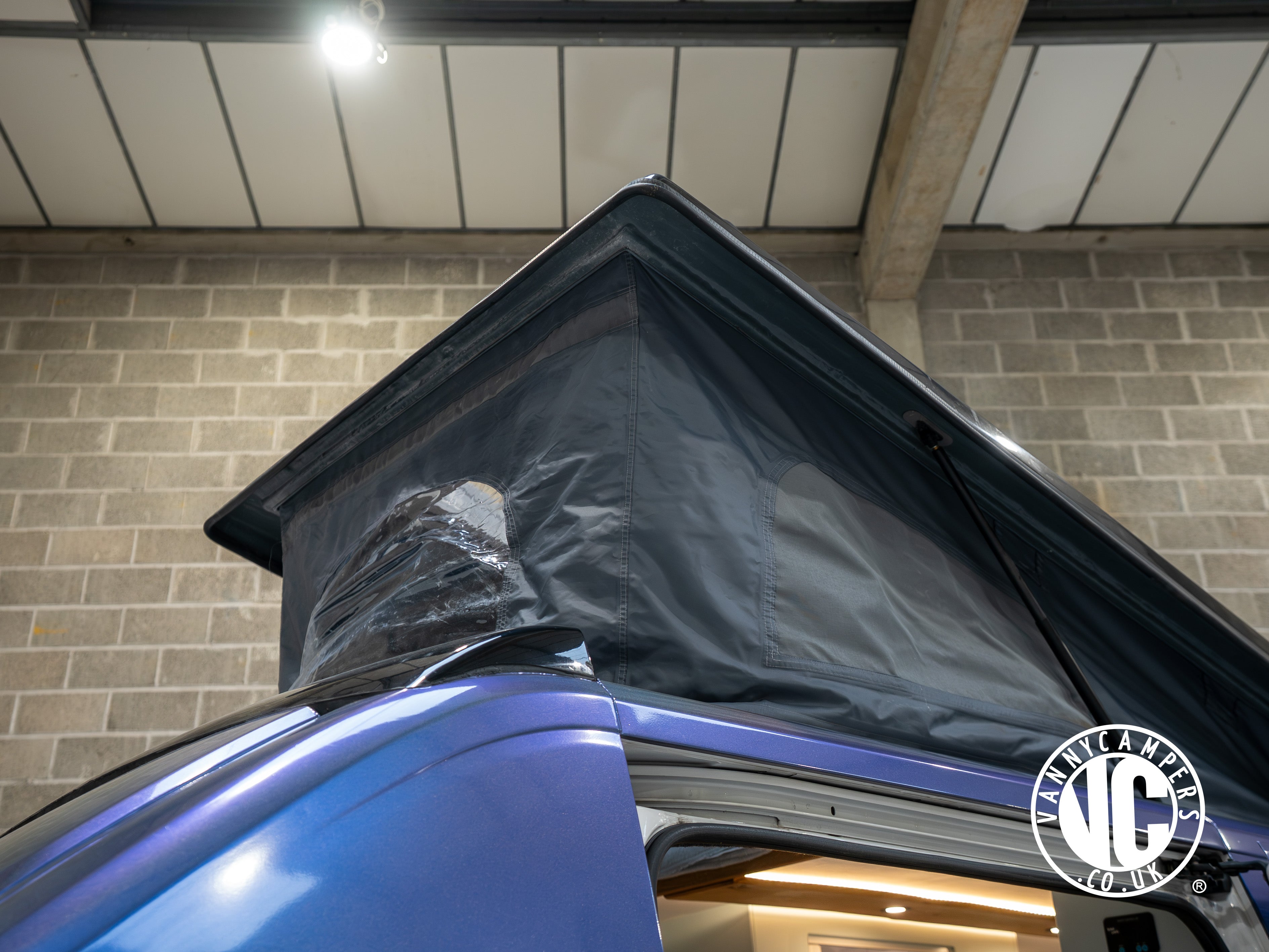The pop-top on Livia has been designed with both comfort and practicality in mind. Up top, 400W of solar panels keep your gadgets and devices powered while you’re off the grid, and the Maxxair Skymaxx brings extra light and ventilation to the space inside. Sleeping two people, the pop-top features cosy zip windows and a full zip canvas that can be opened completely to soak up the sun and enjoy panoramic views. Inside, thoughtful touches like a reading light, USB sockets, and a wireless phone charger make it a perfect blend of convenience, comfort, and adventure-ready freedom.