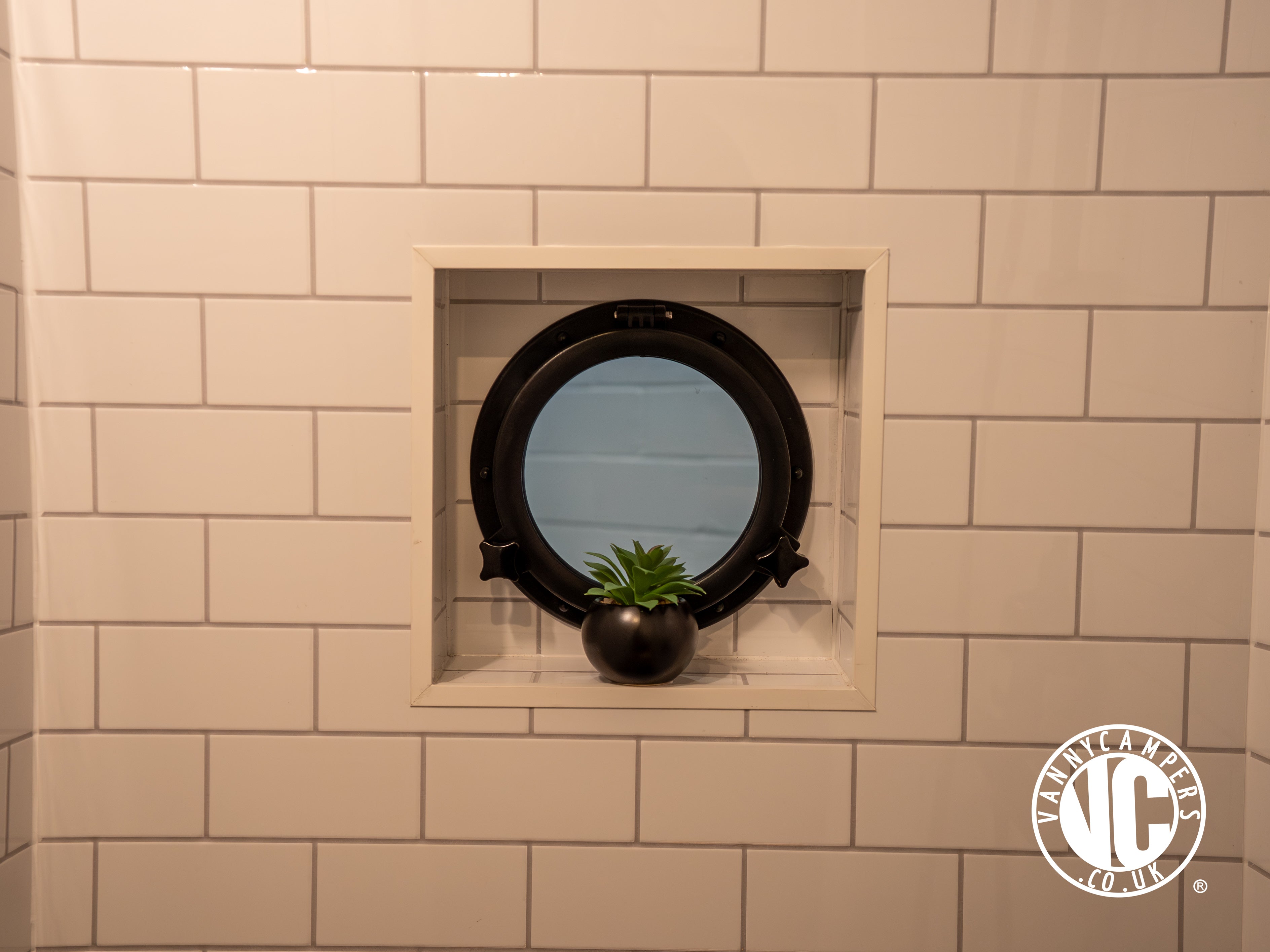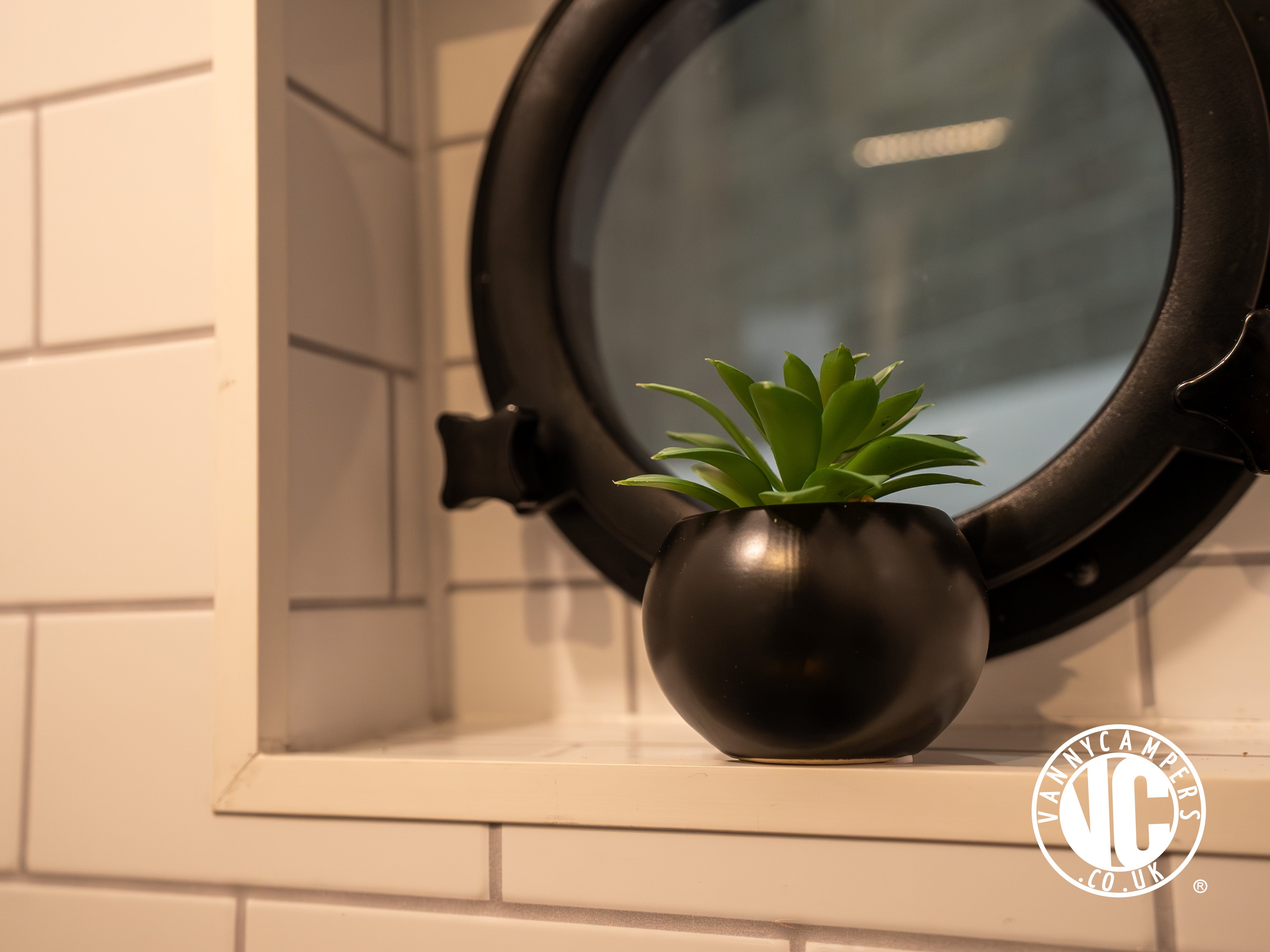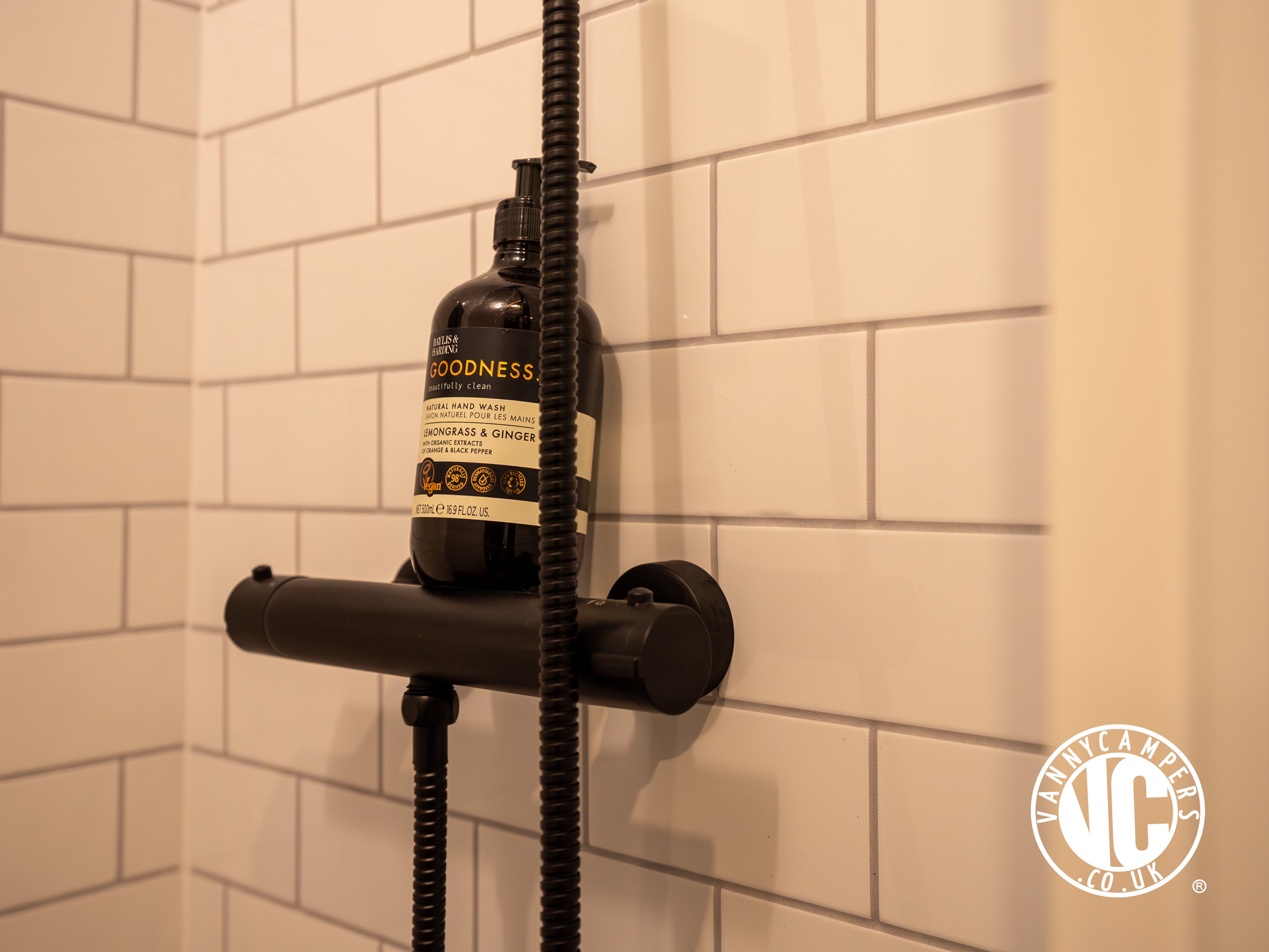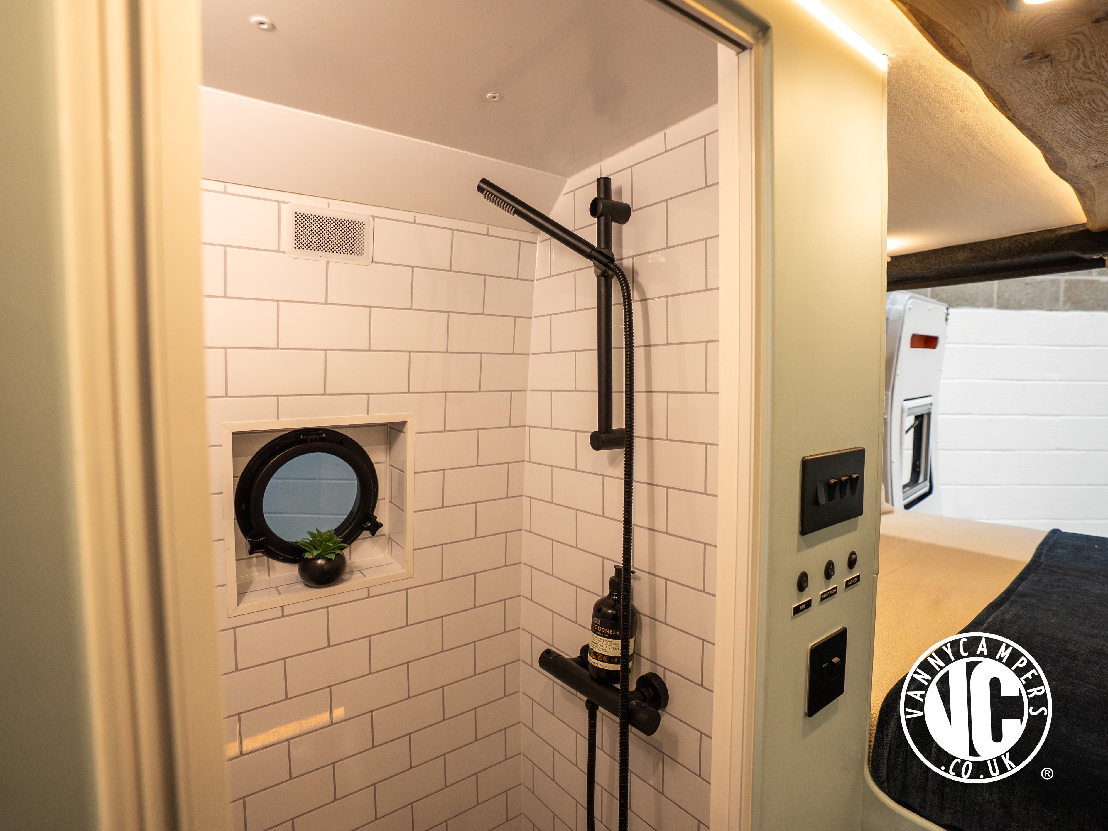 Livia also features a practical internal bathroom, perfect for those longer off-grid adventures. The shower room includes a hot water shower and a Trelino compost toilet, giving you the freedom to stay out in the wilderness for longer. While the rest of the camper has a cosy, homely feel, the bathroom is designed to be bright and airy, creating a fresh and functional space. It’s finished with a roller shower door, porthole window with ventilation fan, black shower mixer and head, durable Reco surfaces wall lining, and LED lighting.