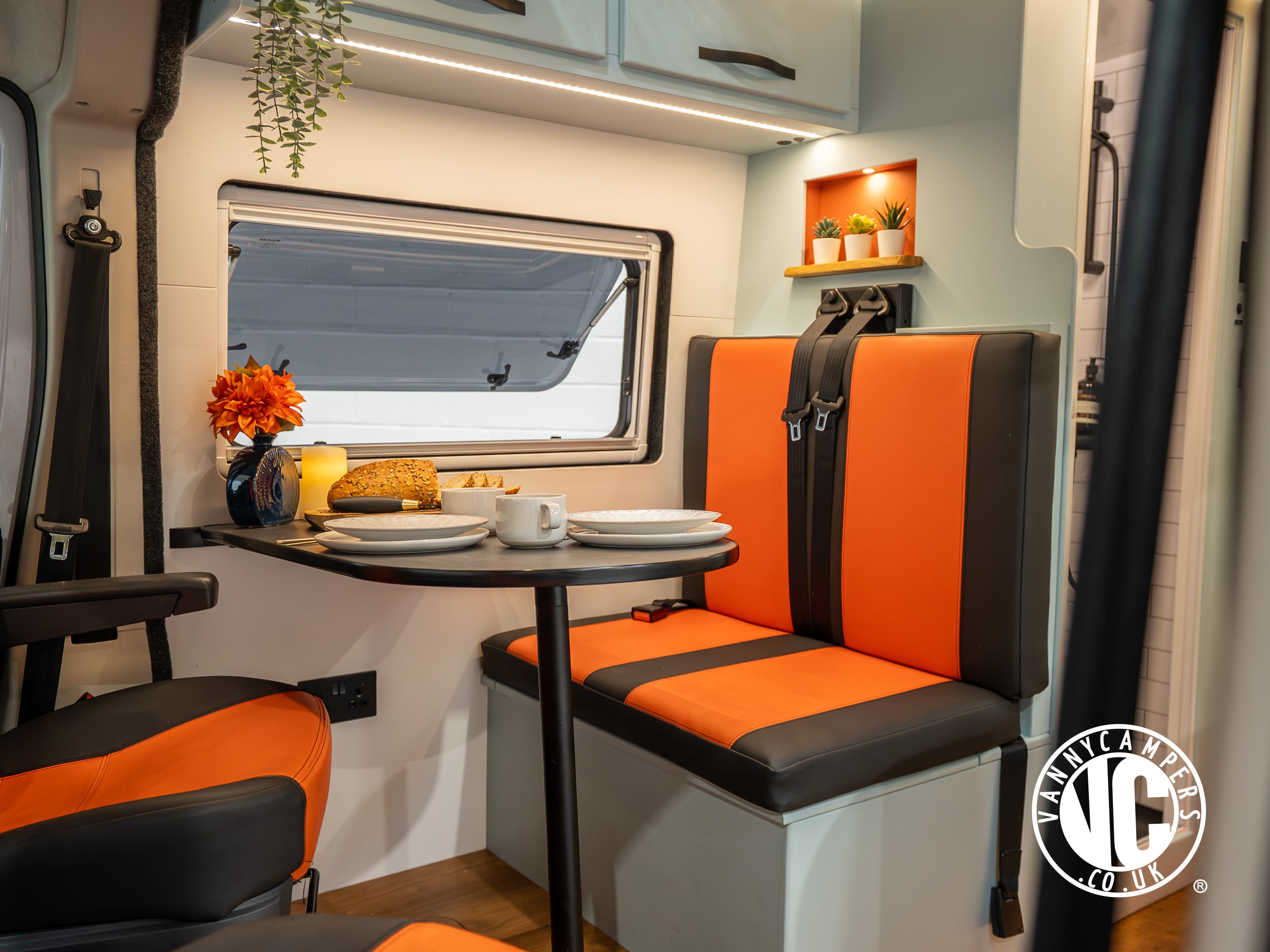 The front of Livia has been designed as a welcoming social hub, perfect for meal times with family and friends, rainy-day hangouts, or simply spending quality time together. Four seats around the table create a natural focal point for dining, playing games, or catching up, while clever storage solutions keep everything organised. The space includes two overhead cupboards with interior lighting, two USB ports, a double 240V socket, a skylight in the pop-top to bring in extra natural light, and a custom over-cab storage area — combining practicality, comfort, and style in one inviting area.
