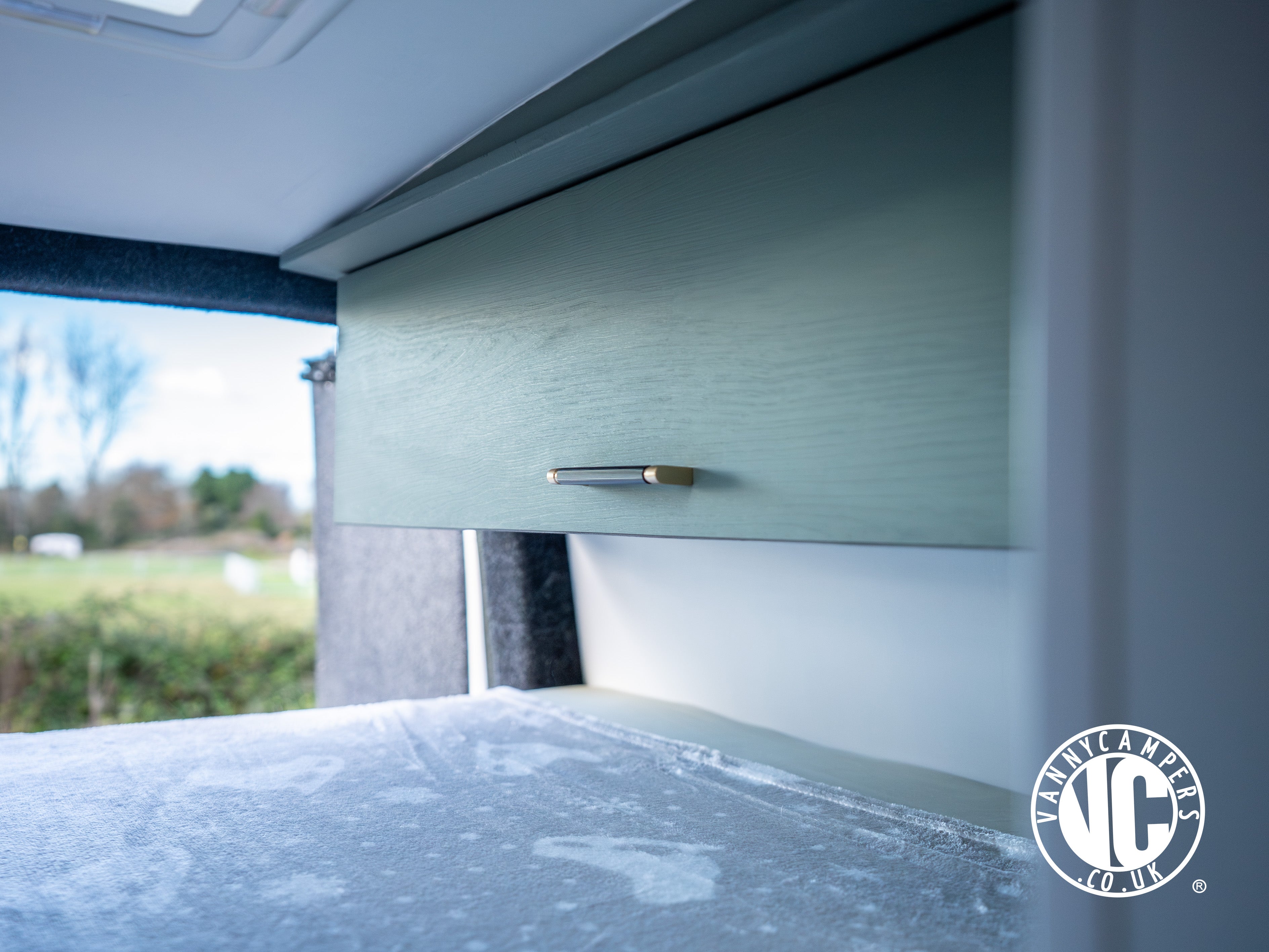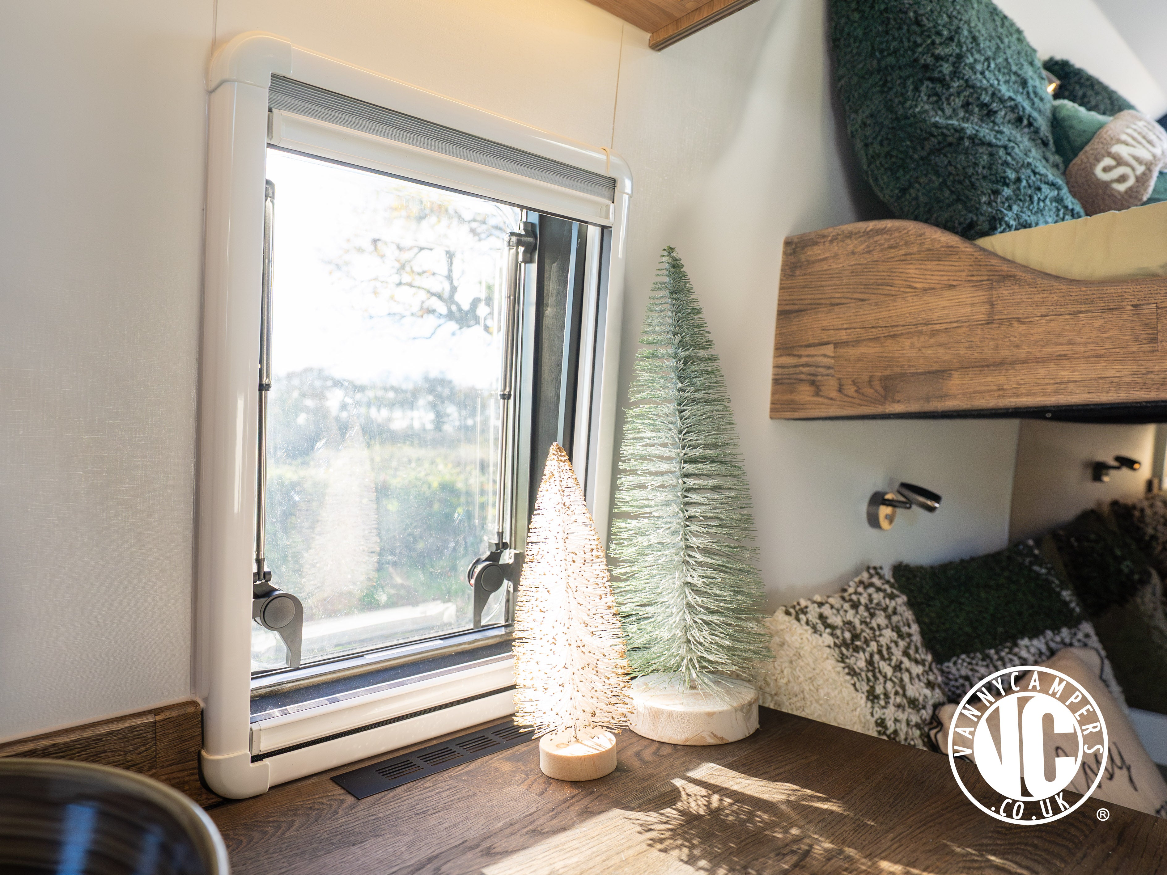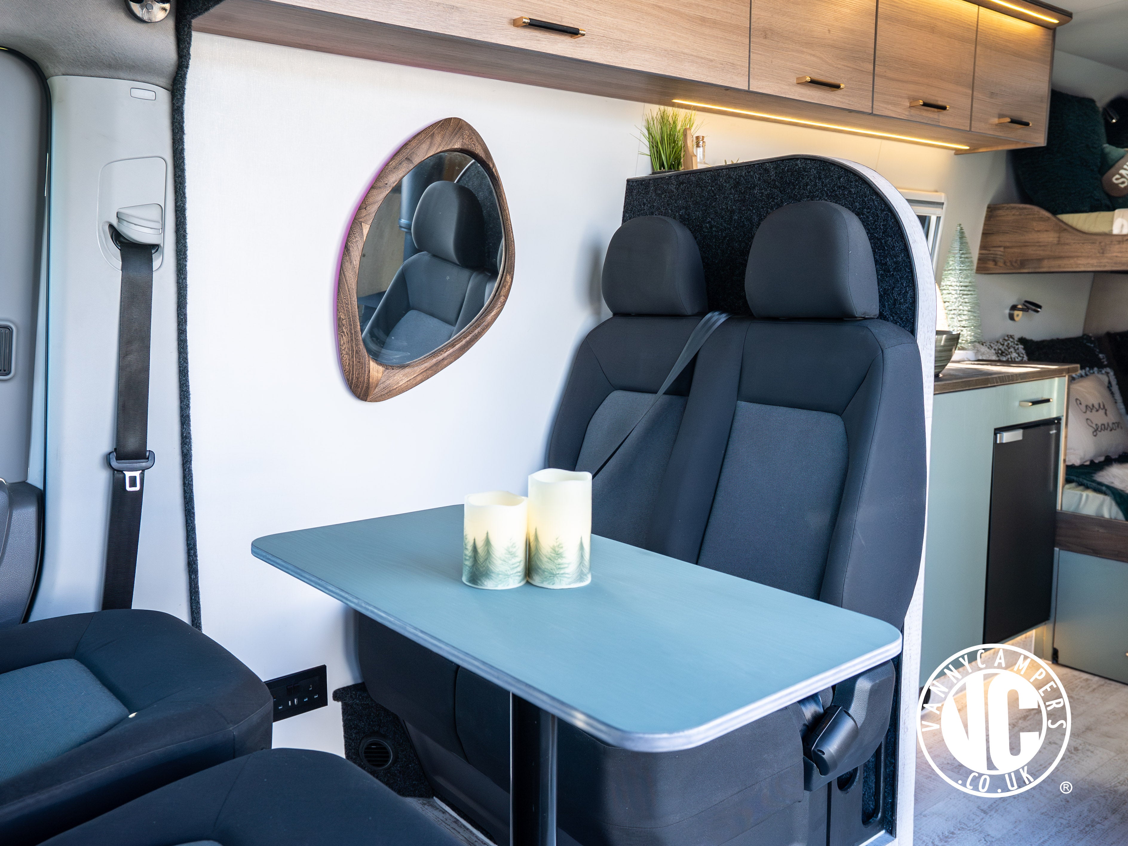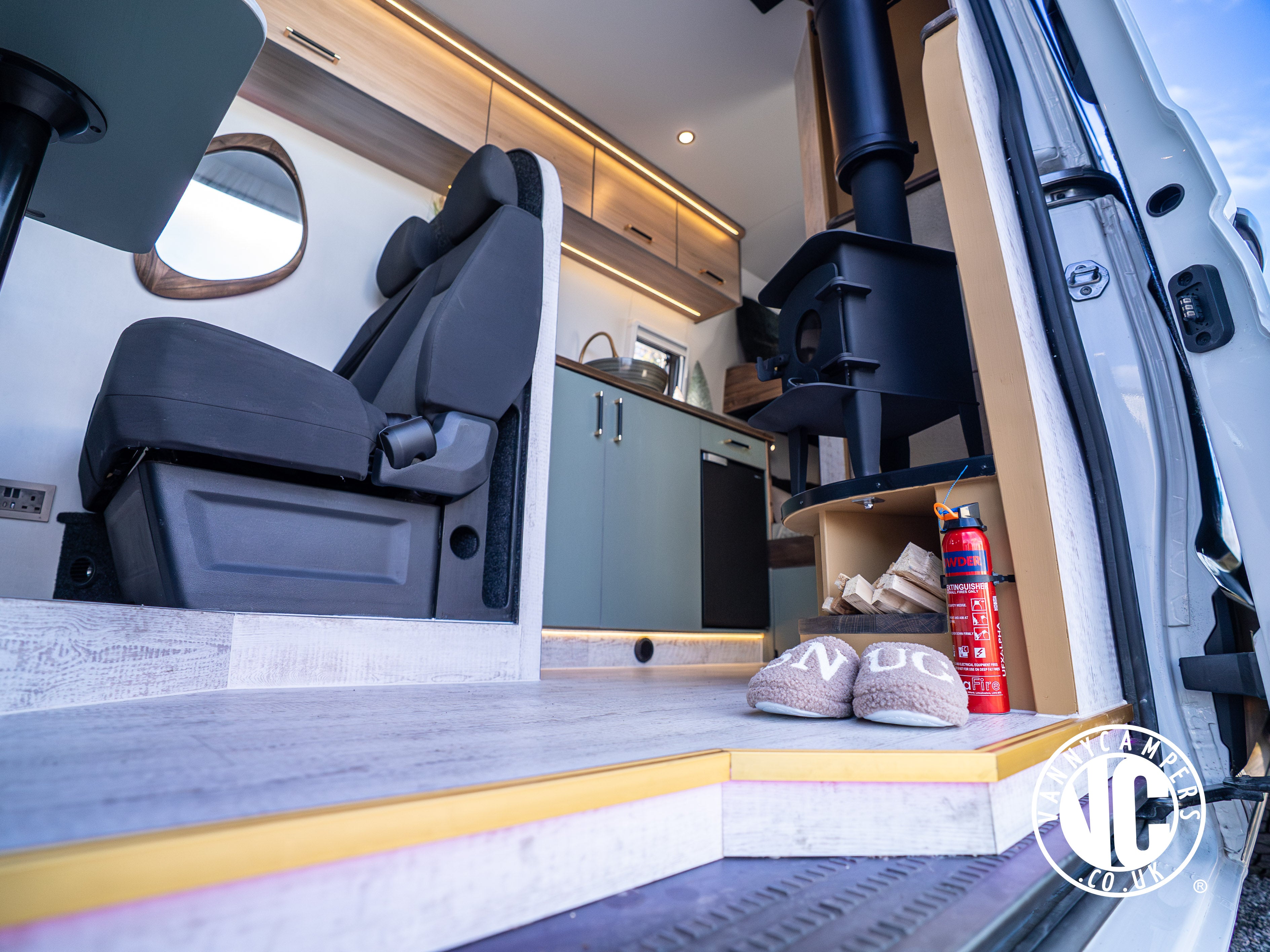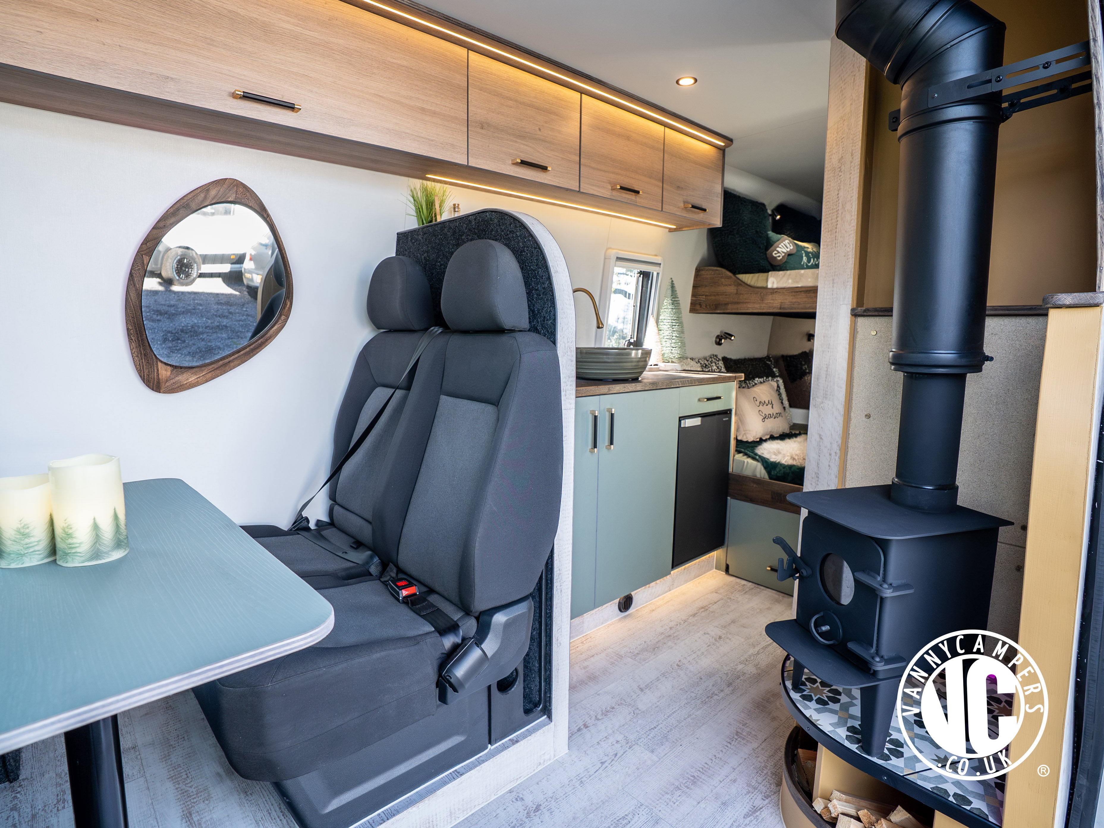 The living and social space is perfect for cosy winter evenings with the family, or as a hub for remote working, dining, and adventures complete with a mini black wood burner perfect for keeping the van warm and welcoming while you relax or work. Bespoke corner log store, luxury winter white LVT flooring, swivel cab seats, tuck-away muted green table, pop-out window, and USB reading lights make this space as practical as it is beautiful.