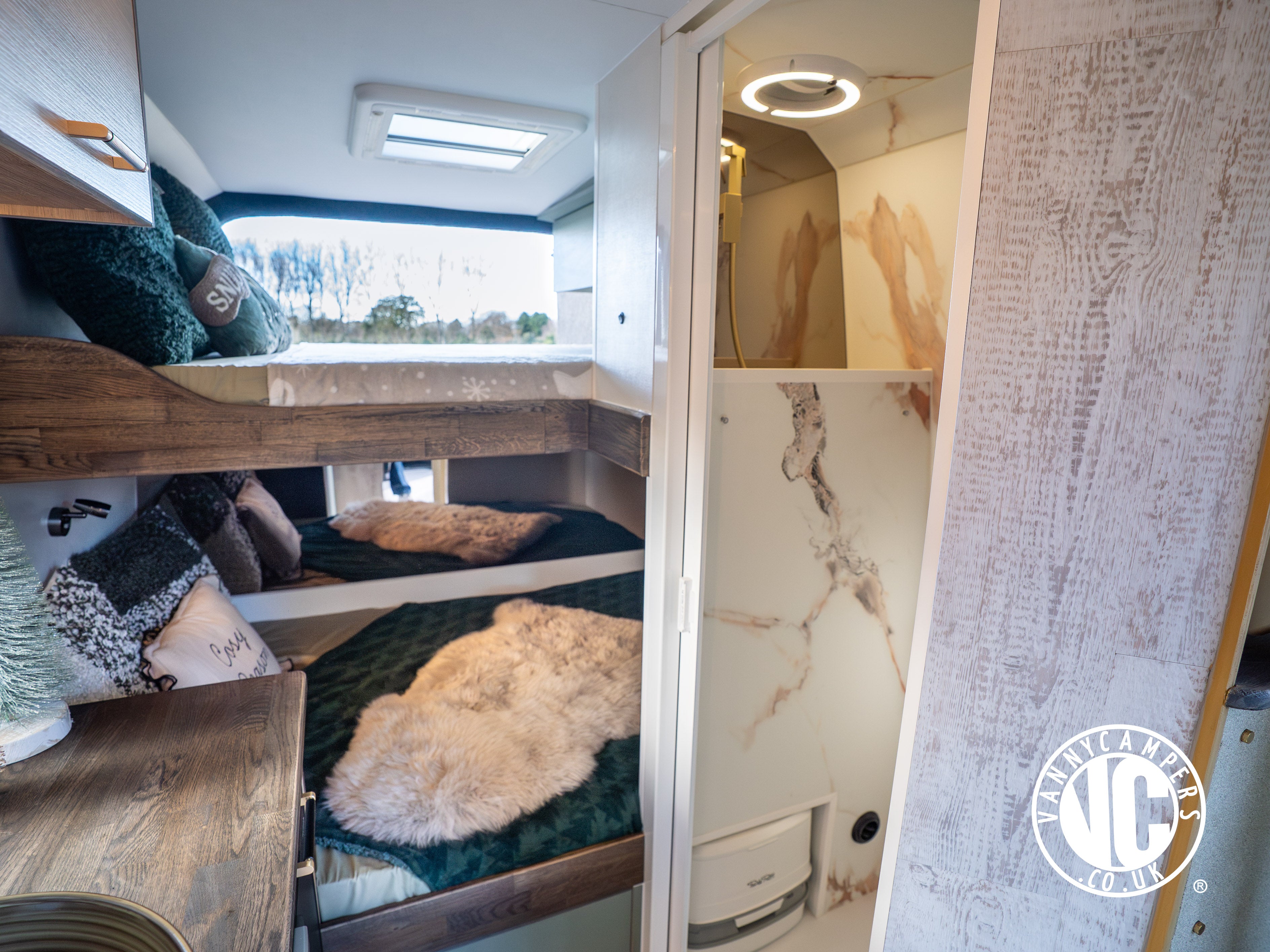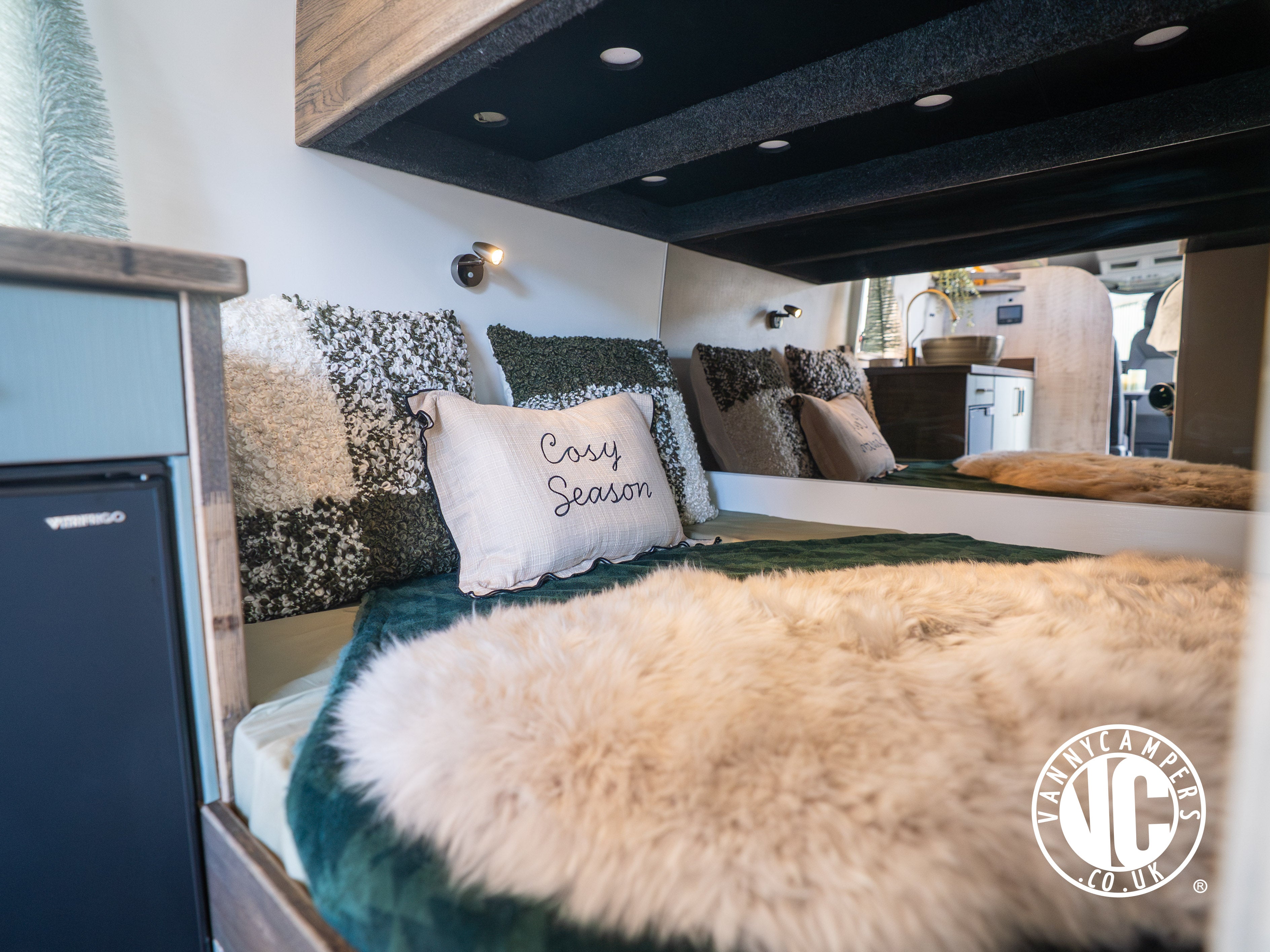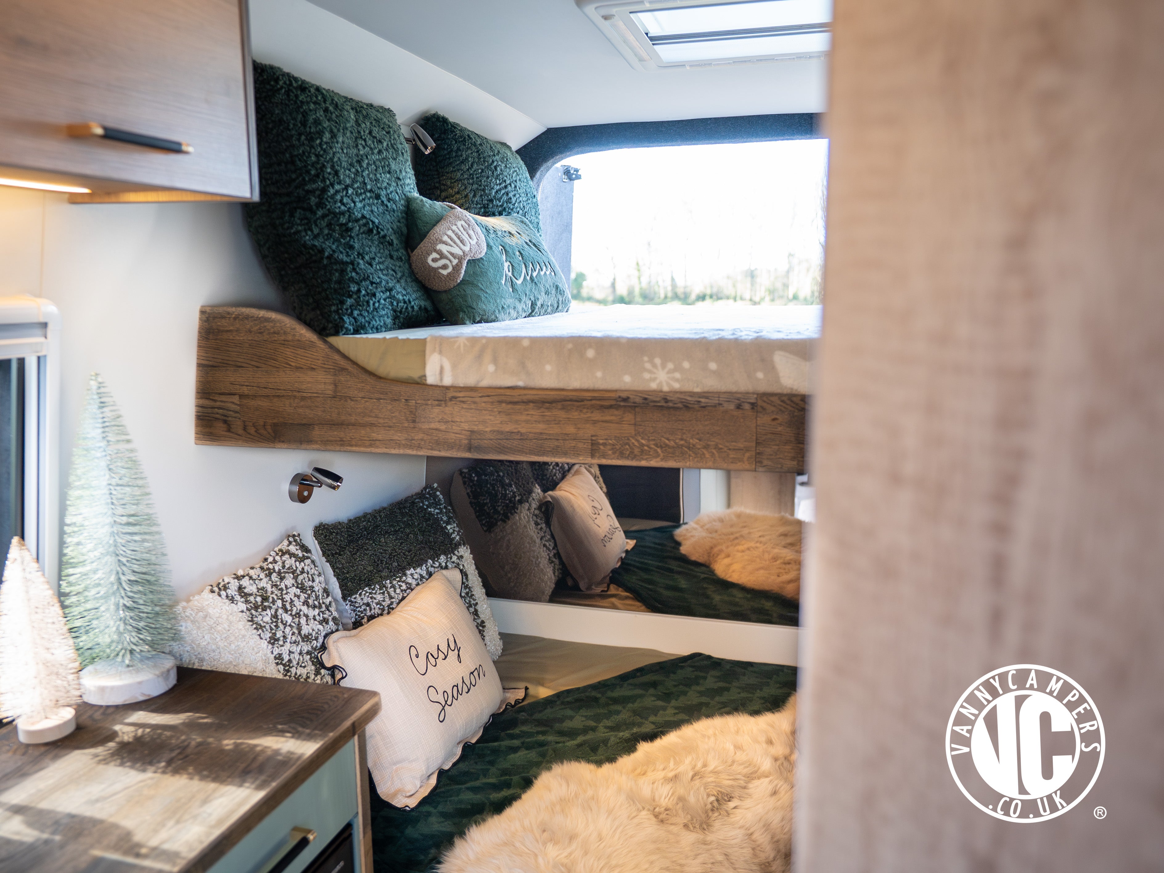 Designed for comfort, practicality, and a touch of luxury, Ember is packed with clever storage, modern electrical systems, and all the amenities you need for a stylish VannyCampers winter adventure. Whether it’s a weekend getaway or a longer escape, Ember’s got you covered with a welcoming living area, and a warm, inviting atmosphere that makes every trip feel like home.