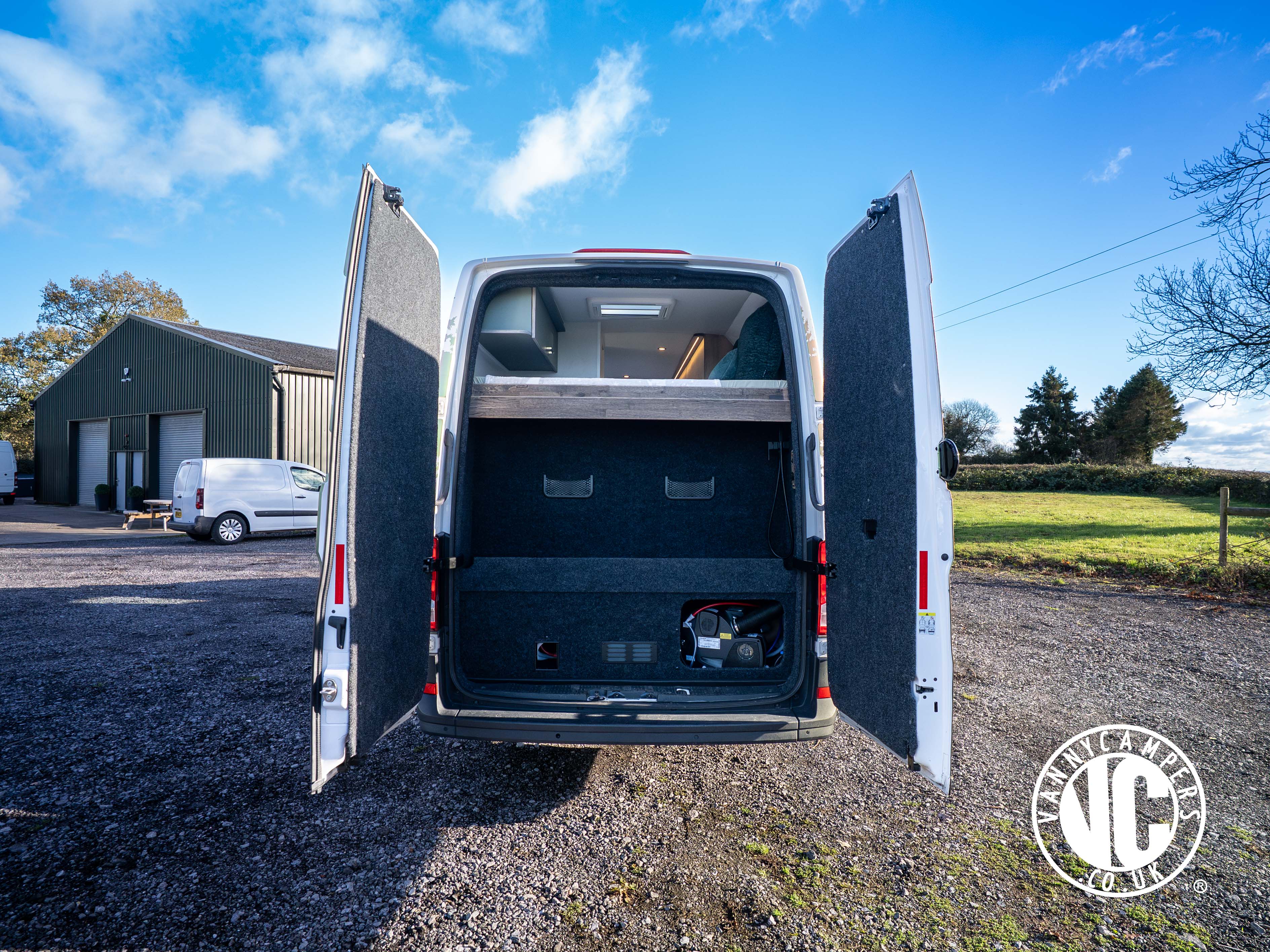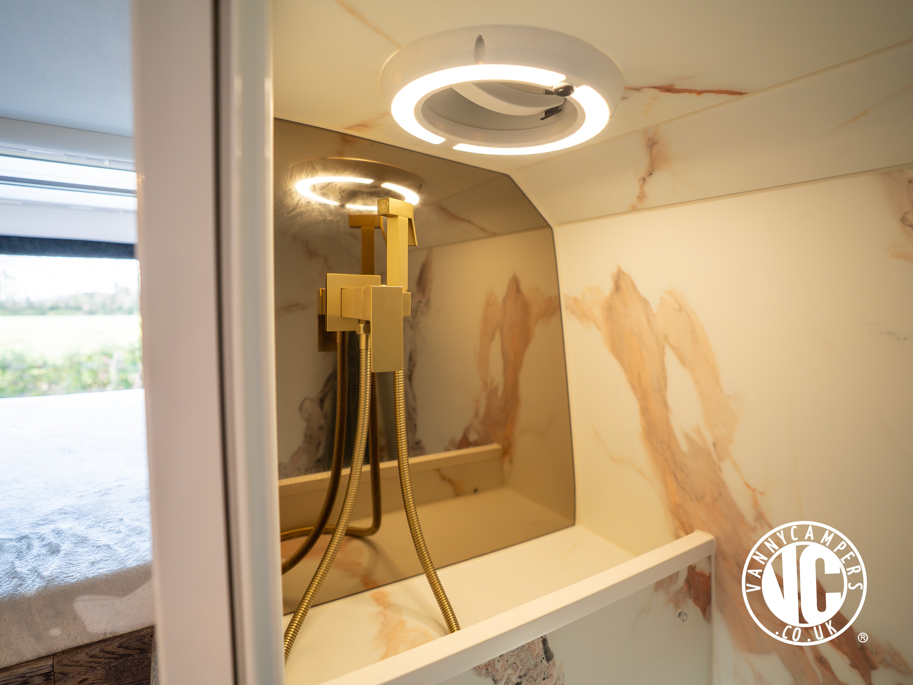 The garage and rear area of the van is designed for ultimate practicality on the move. Equipped with a hot shower, ample storage shelves, 12V plug, and built-in lighting, it’s perfect for keeping gear organised, freshening up after an adventure, and making life on the road easy and convenient.