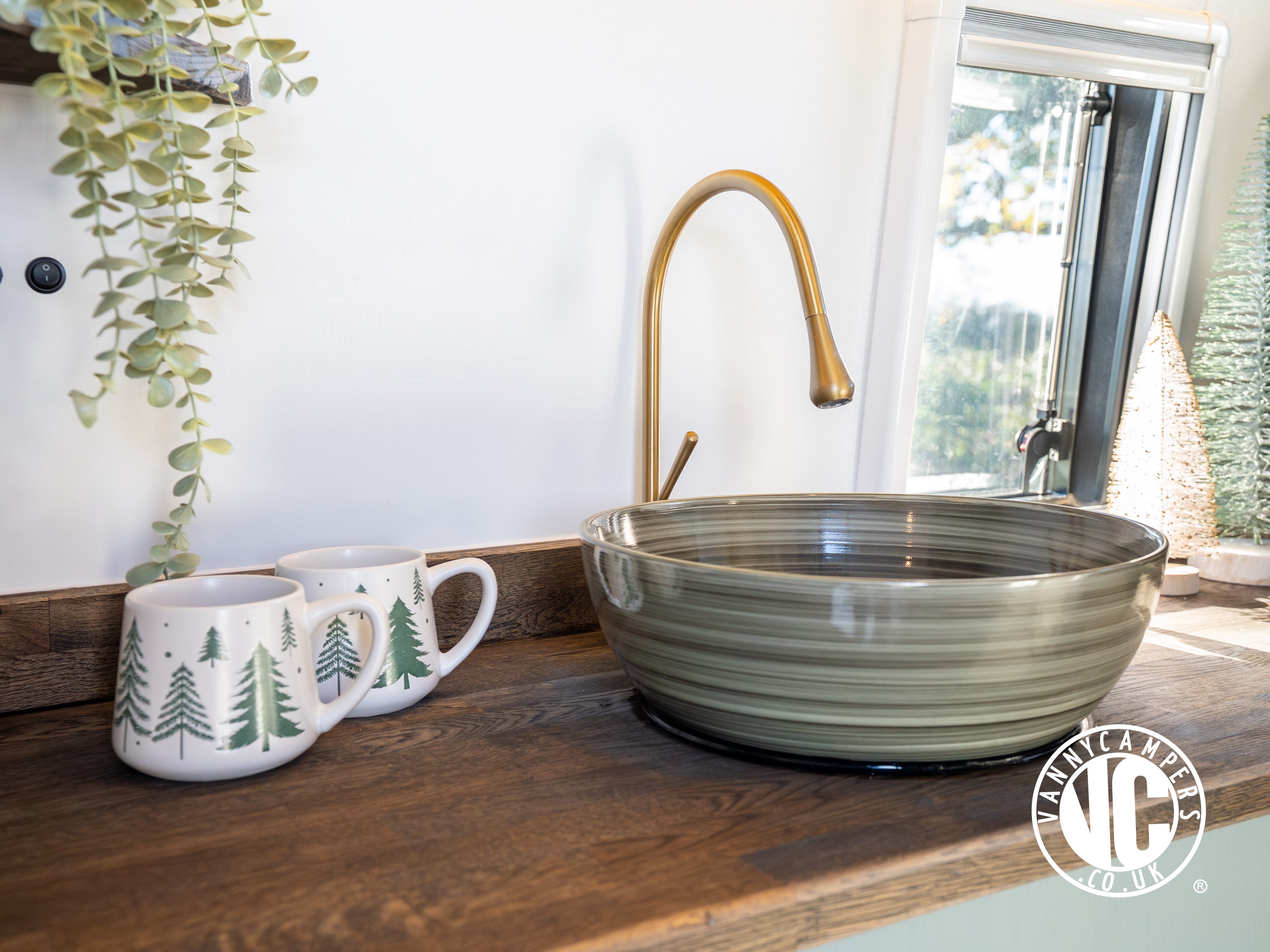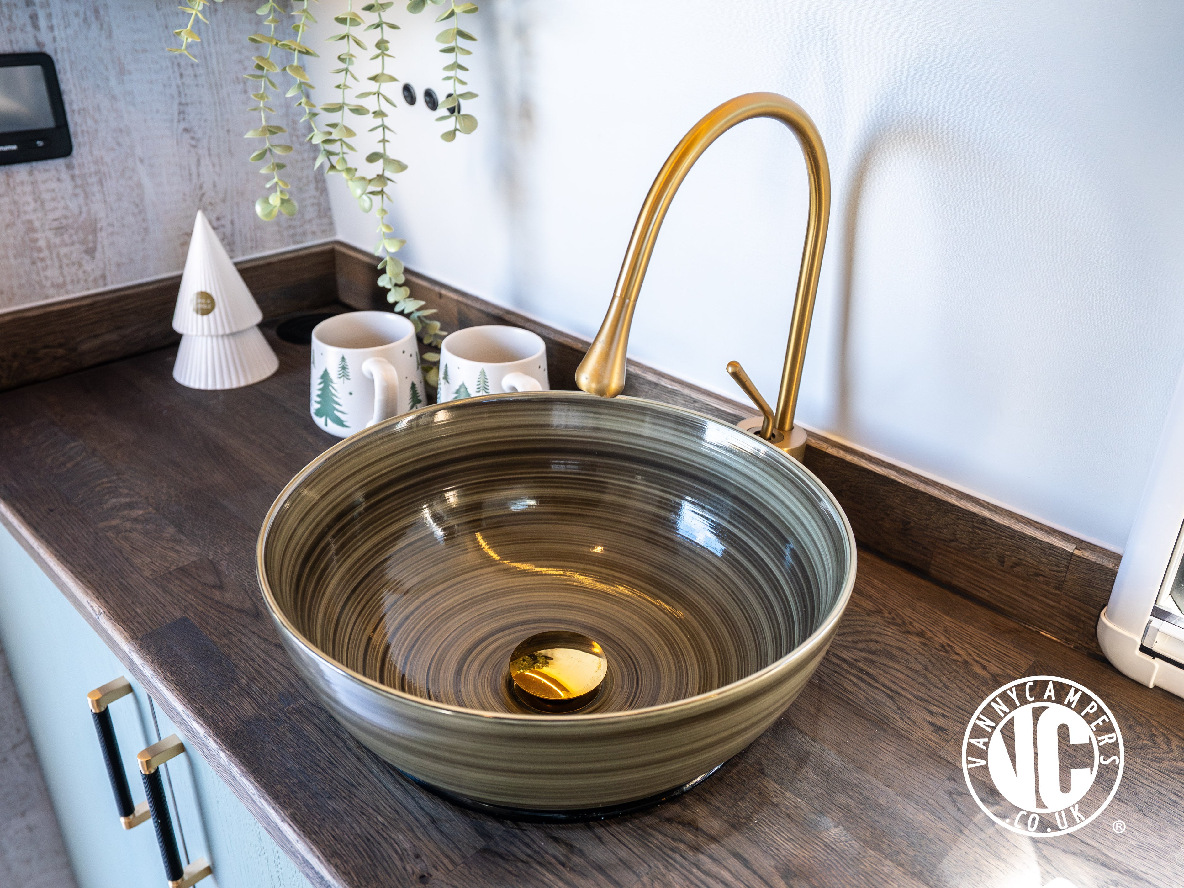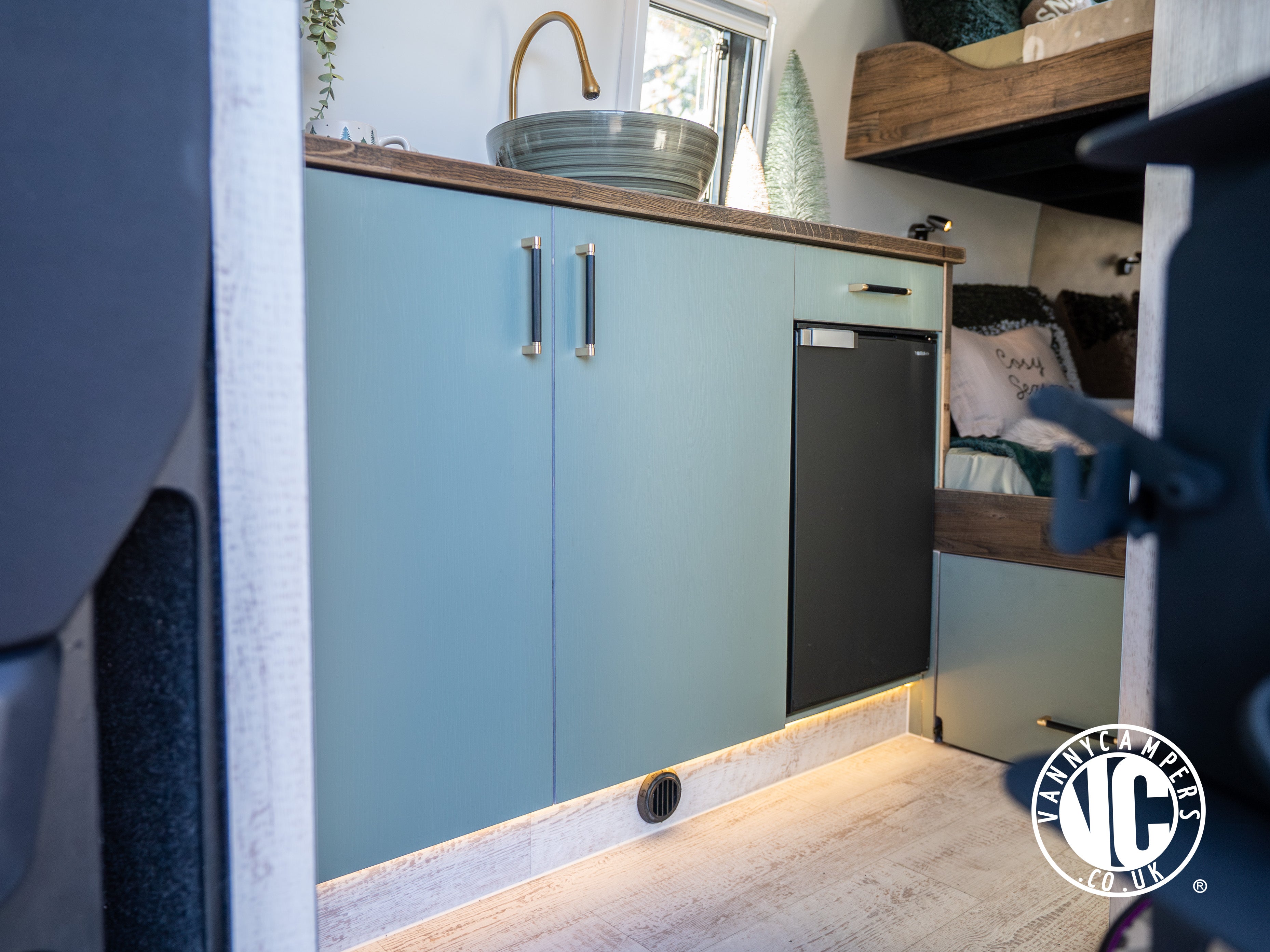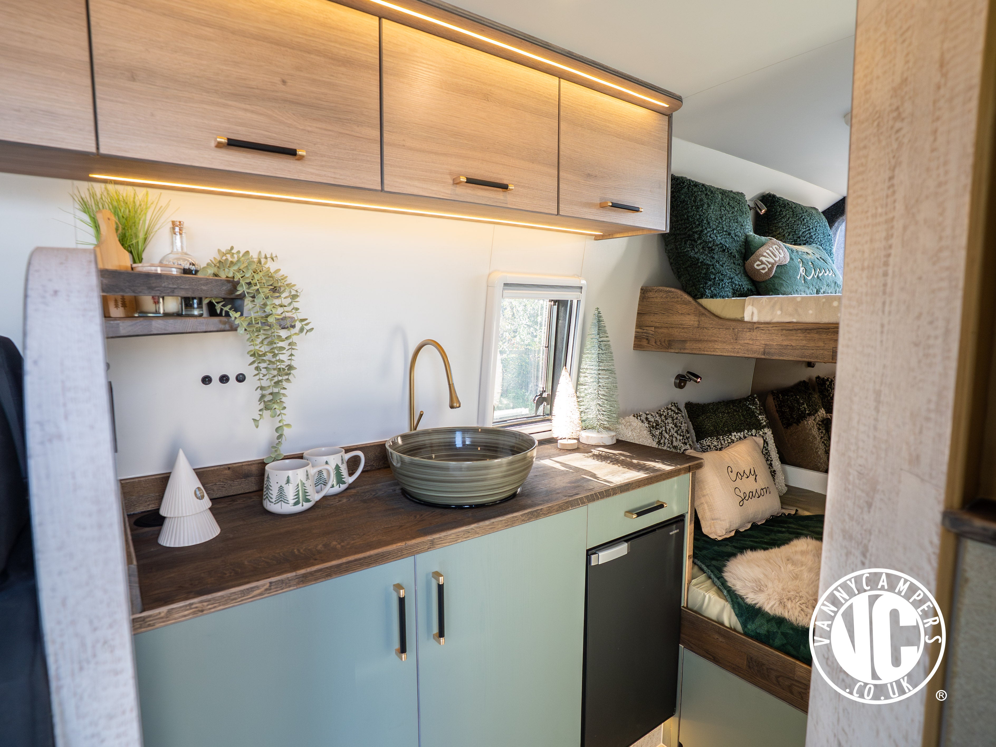 This gas-free camper kitchen is off-grid ready with lithium and solar power. Featuring a forest green countertop sink with gold waste, brushed gold swan neck tap, black oiled oak worktops, and handmade two-tone cupboards, it’s as stylish as it is practical. With a 50L Vitri Frigo fridge freezer, Vango twin induction hob, pull-out cutlery drawer, pop-out window, pop-up sockets, and clever mood and kicker lighting, it’s perfectly equipped for cooking anywhere.