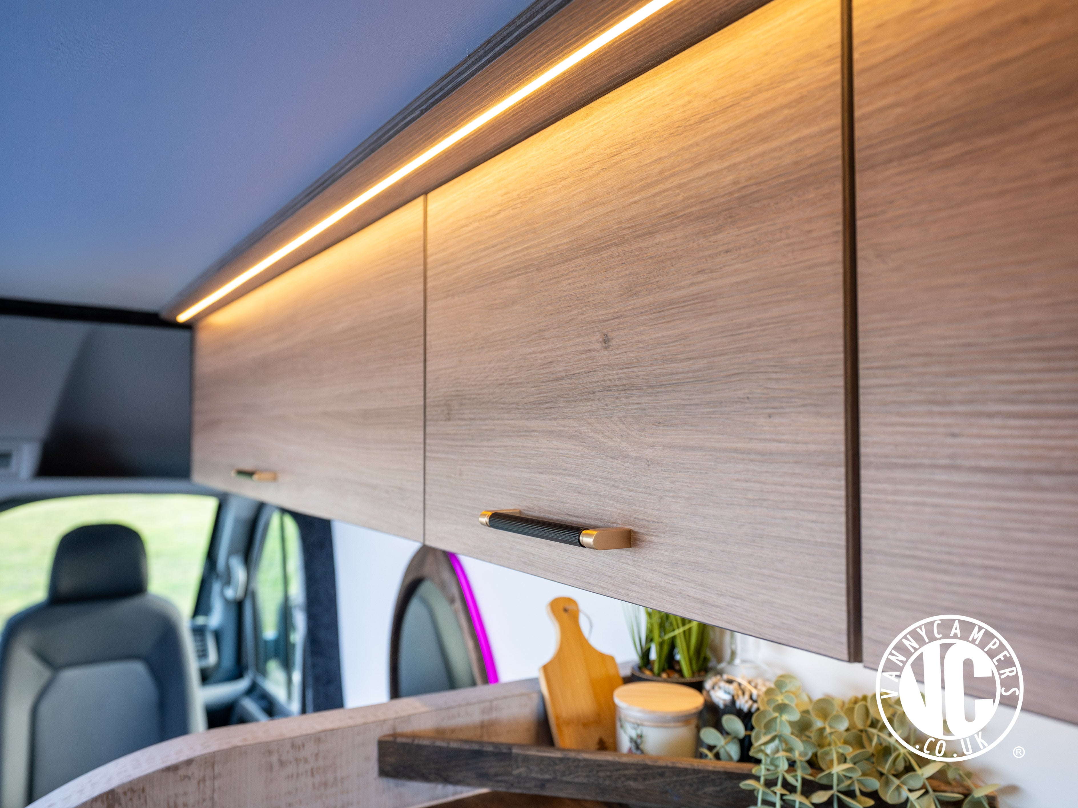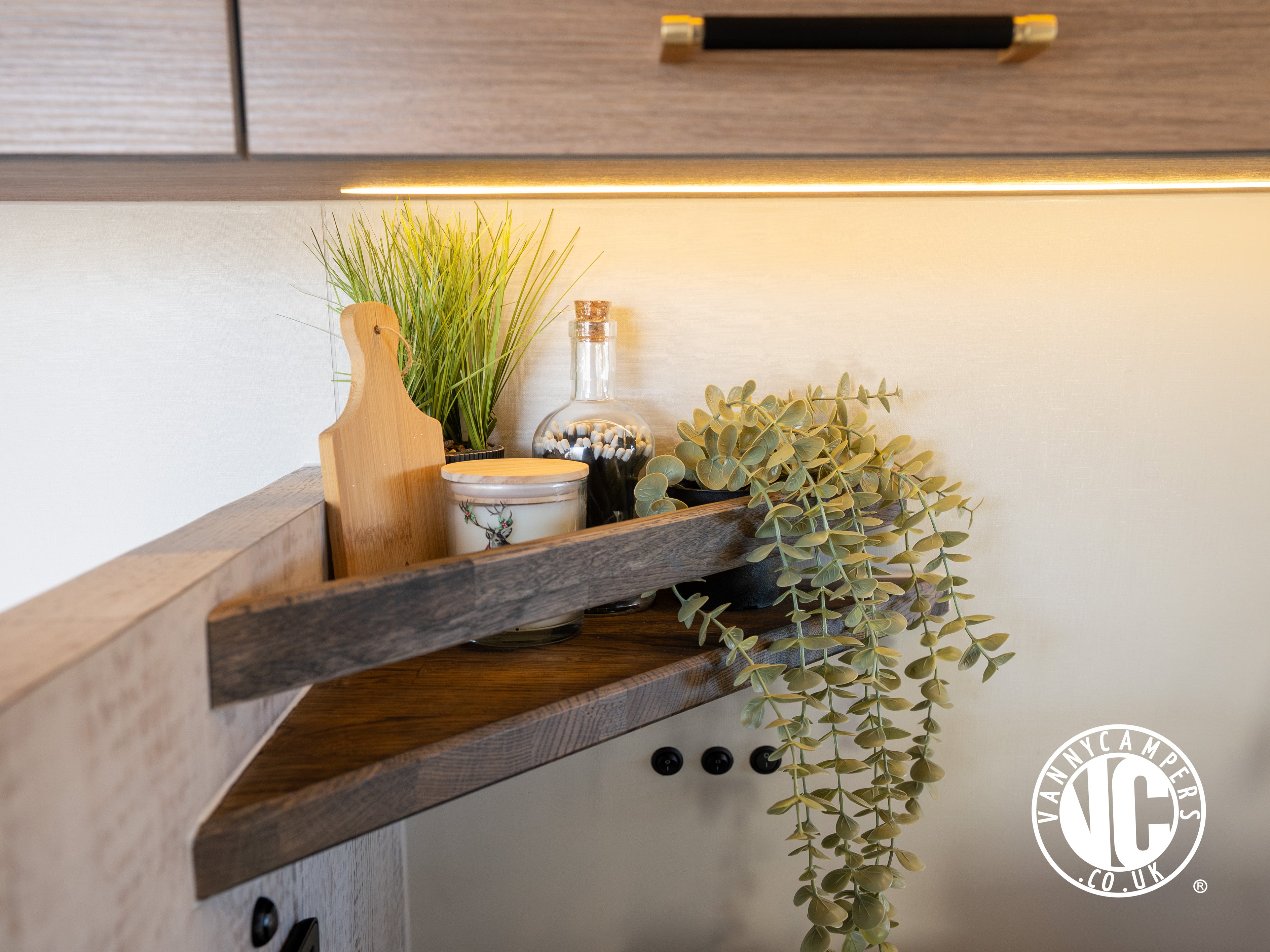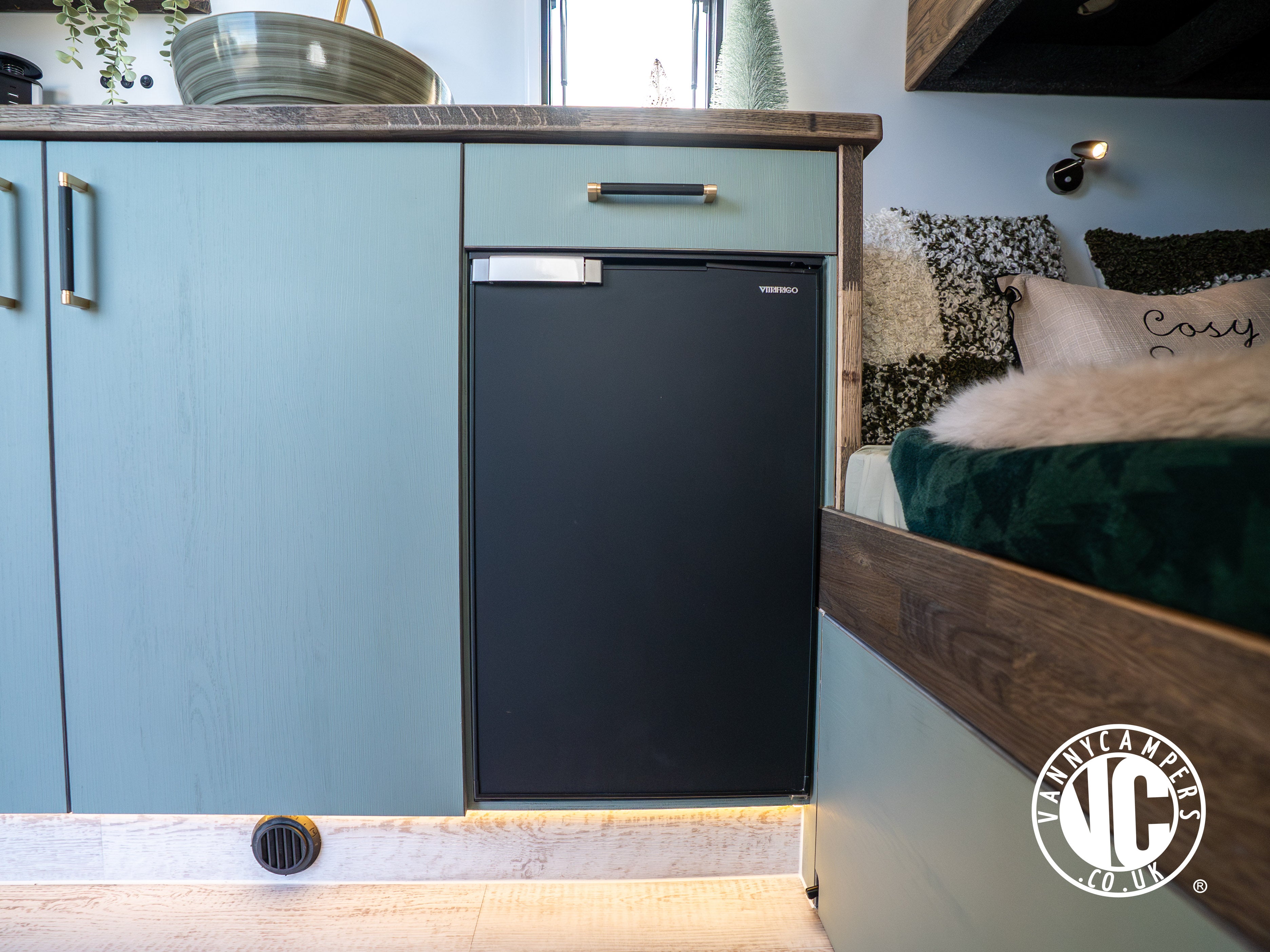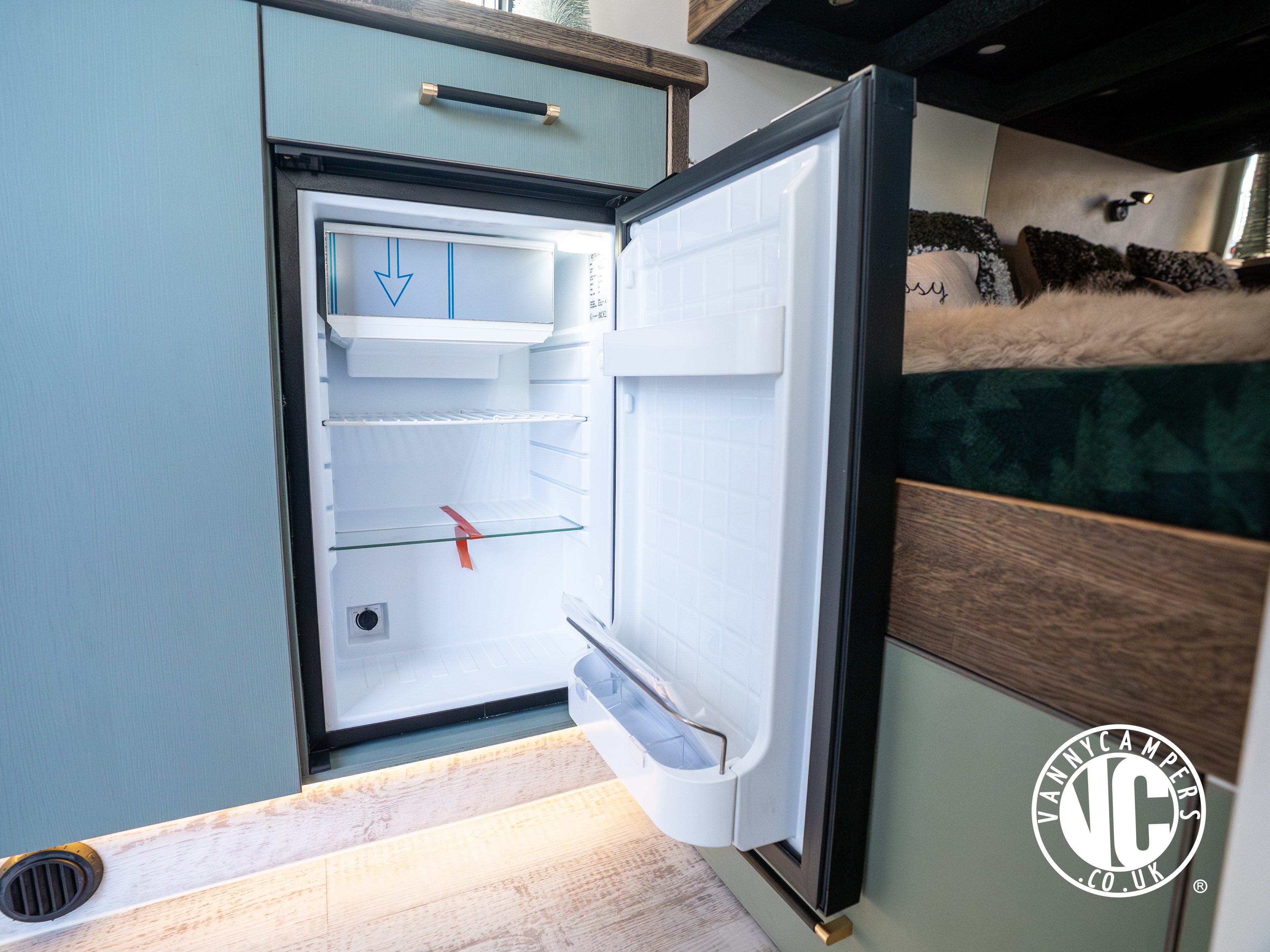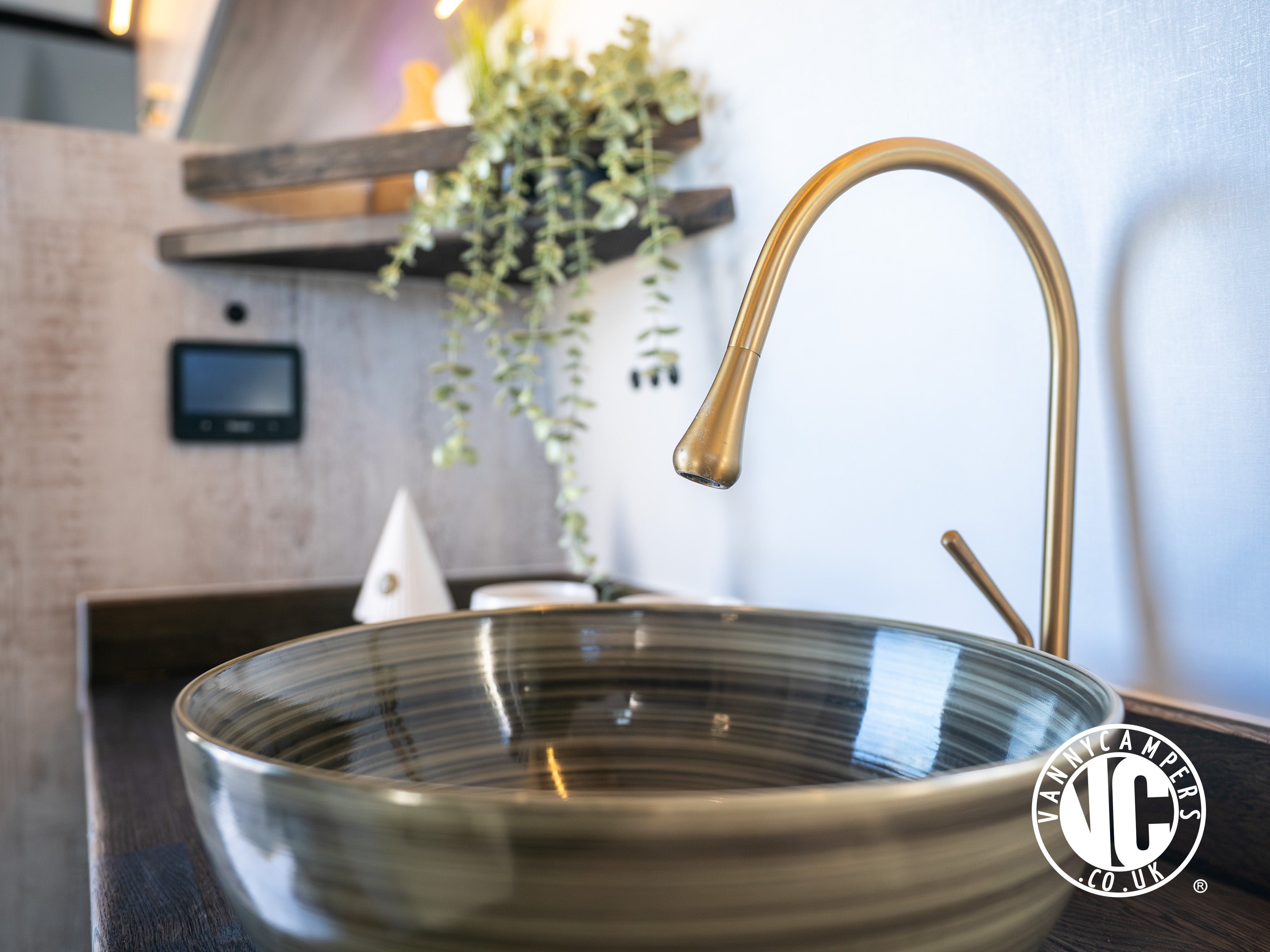 This gas-free camper kitchen is off-grid ready with lithium and solar power. Featuring a forest green countertop sink with gold waste, brushed gold swan neck tap, black oiled oak worktops, and handmade two-tone cupboards, it’s as stylish as it is practical. With a 50L Vitri Frigo fridge freezer, Vango twin induction hob, pull-out cutlery drawer, pop-out window, pop-up sockets, and clever mood and kicker lighting, it’s perfectly equipped for cooking anywhere.