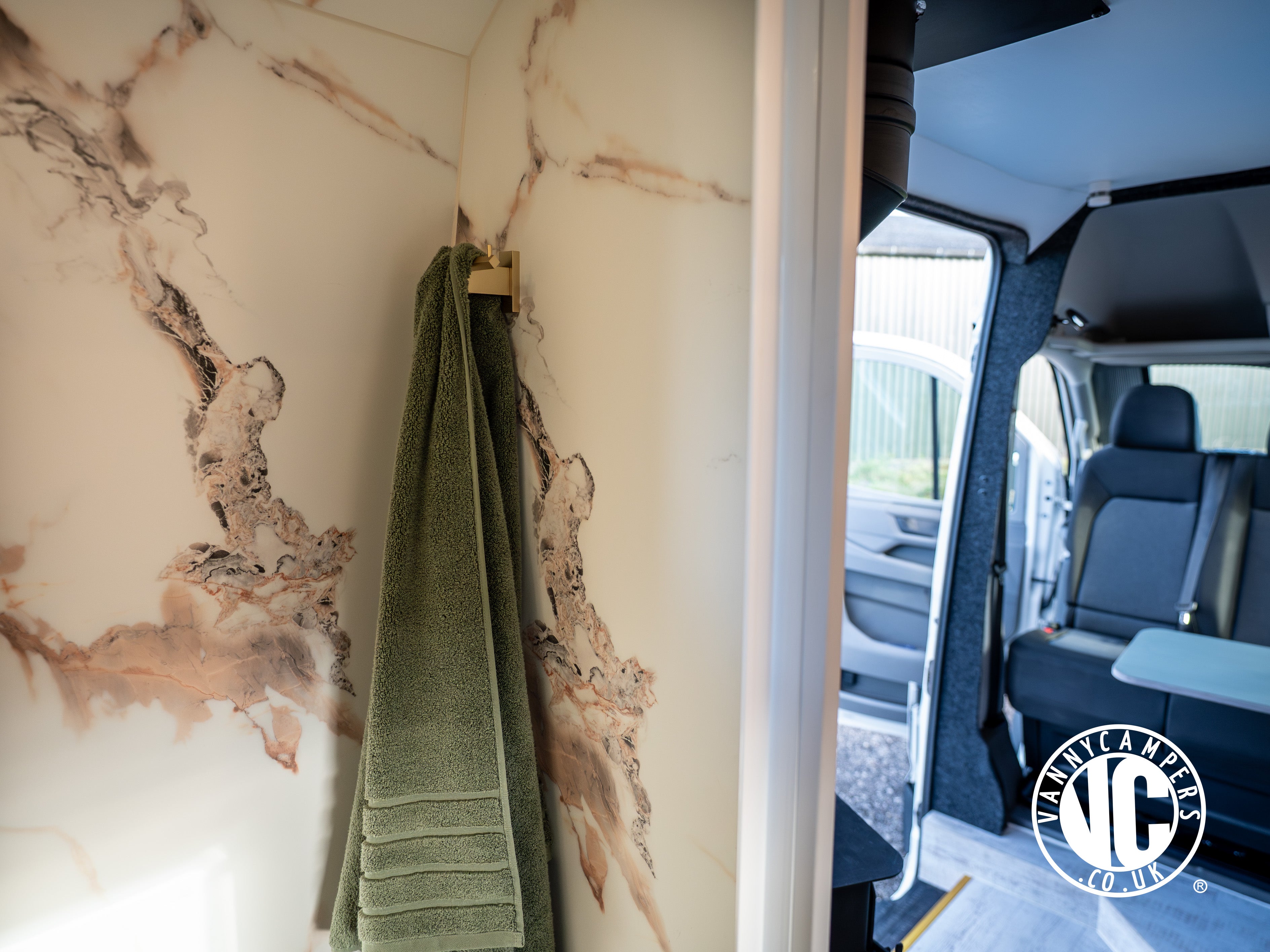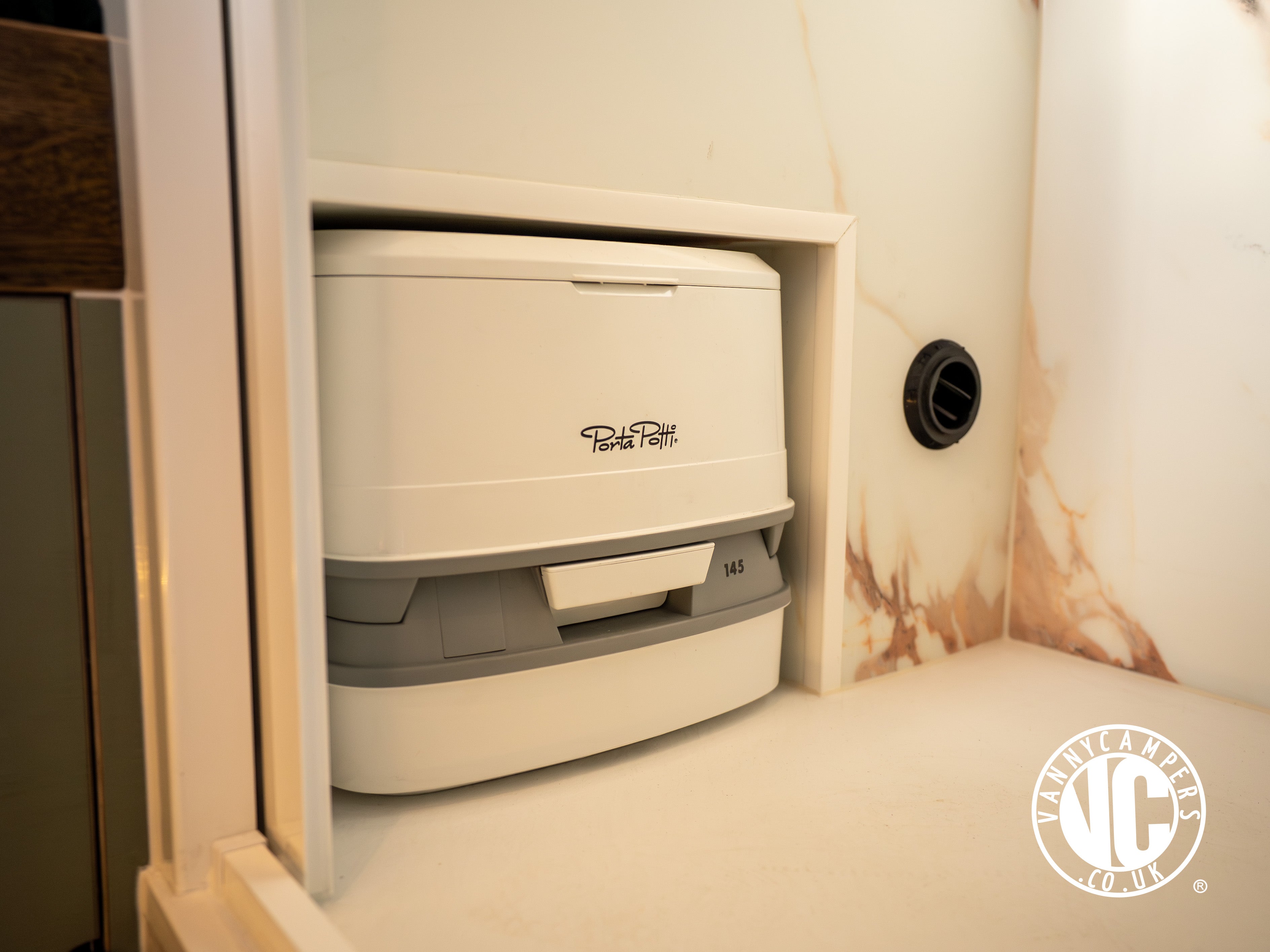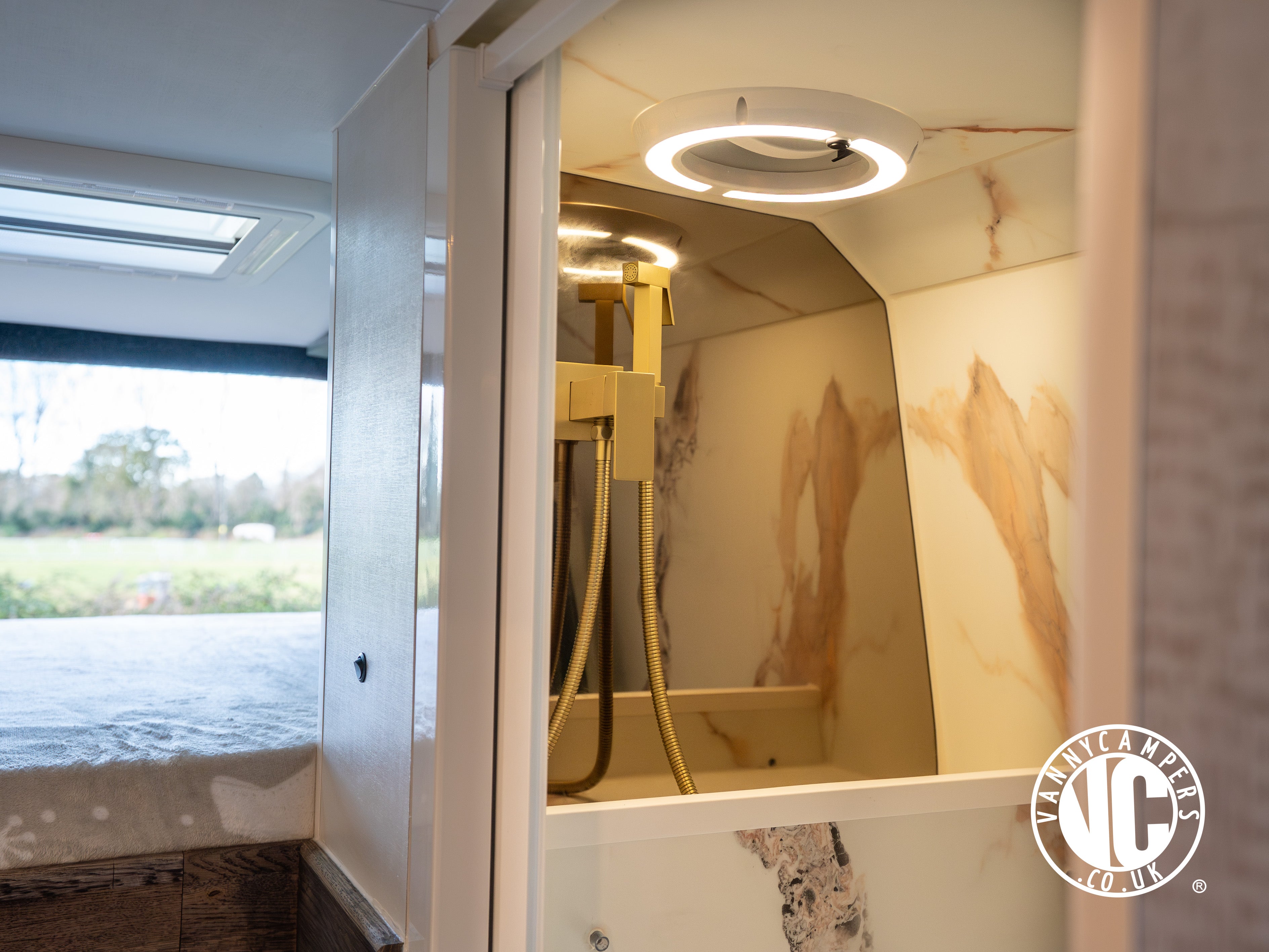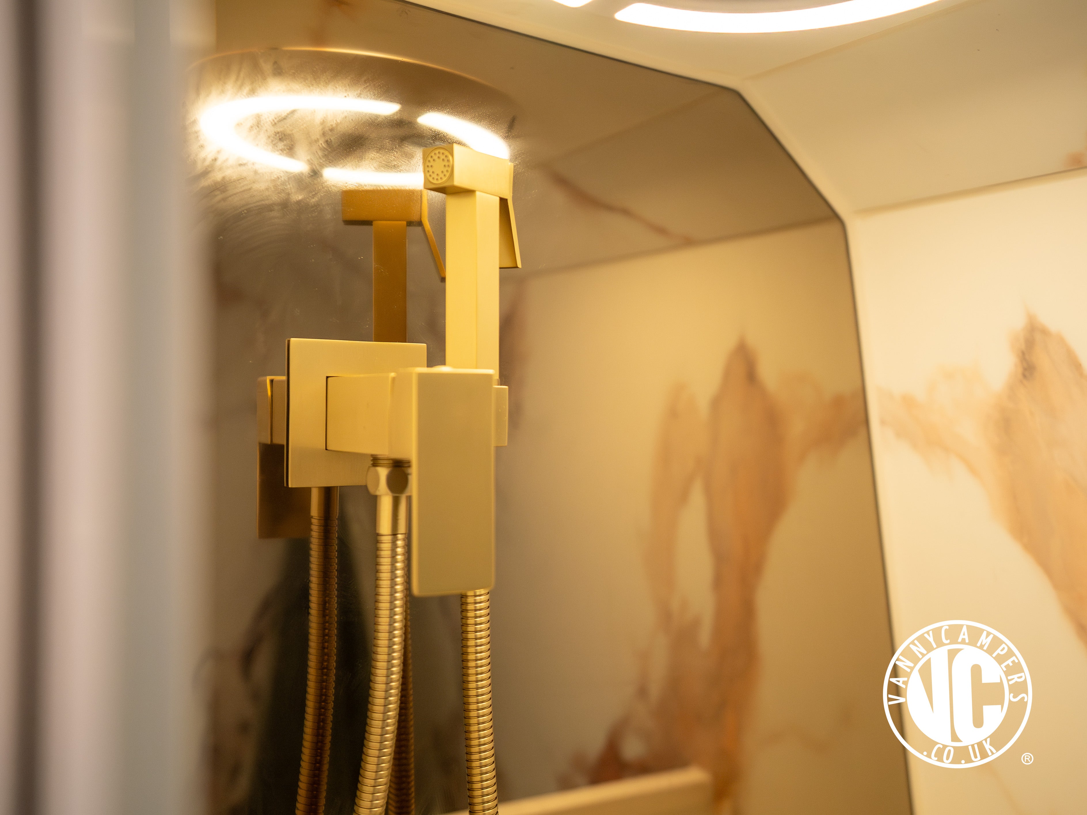The bathroom in this beauty is pure luxury. Cleverly designed with a toilet alcove to save space, it features opulent beige marble wall panels and a bronze mirror with a matching toiletries shelf unit. The white slate-effect textured shower tray and Nautilus self-cleaning opaque shower door add modern elegance, while the brushed gold water-saving trigger shower and towel hook bring a chic, contemporary touch. Practicality meets comfort with a Maxx Air fan dome/light, a heater vent that transforms the space into a drying area, and a Thetford Porta Potti 335 making this bathroom as functional as it is beautiful.