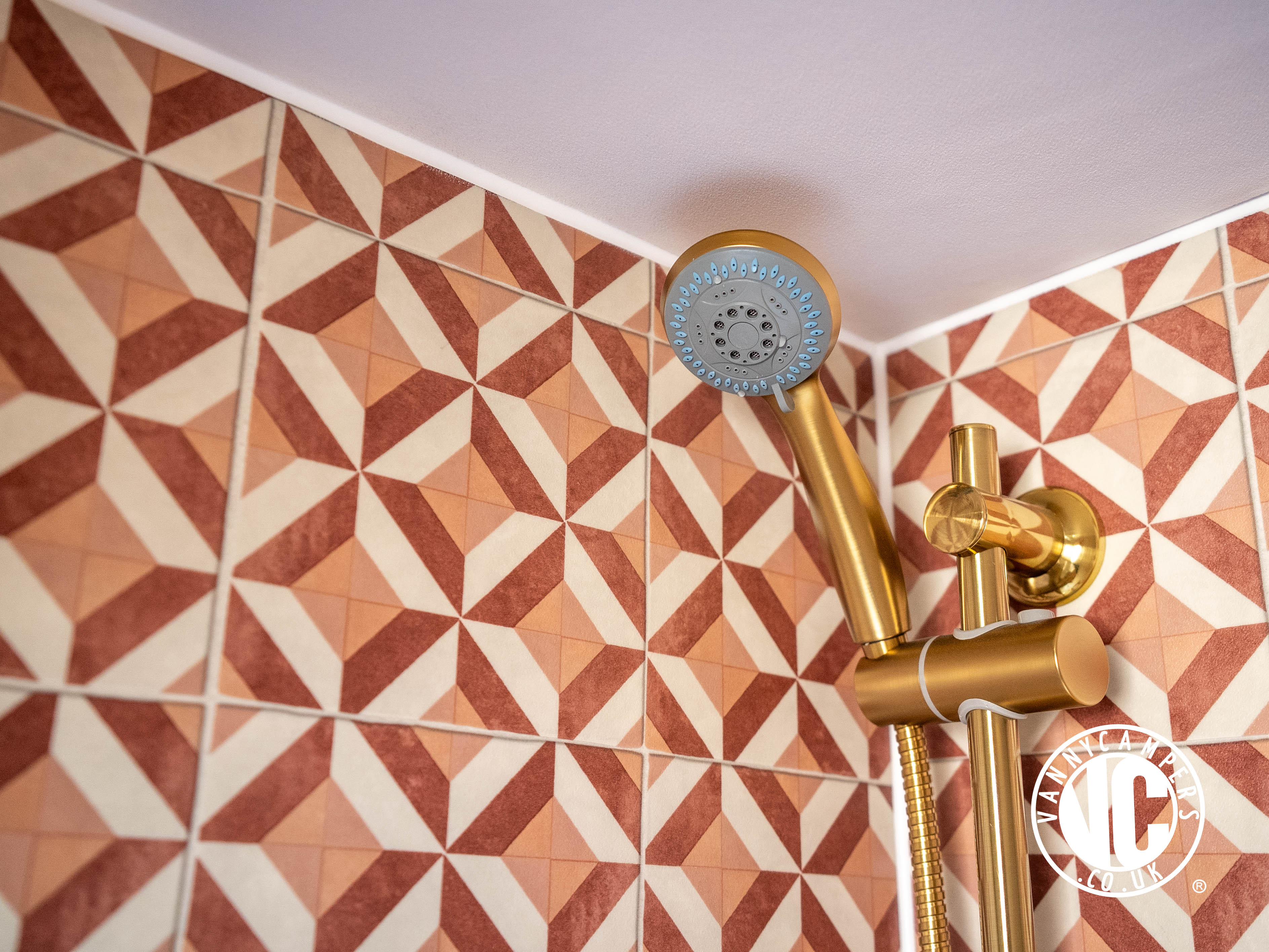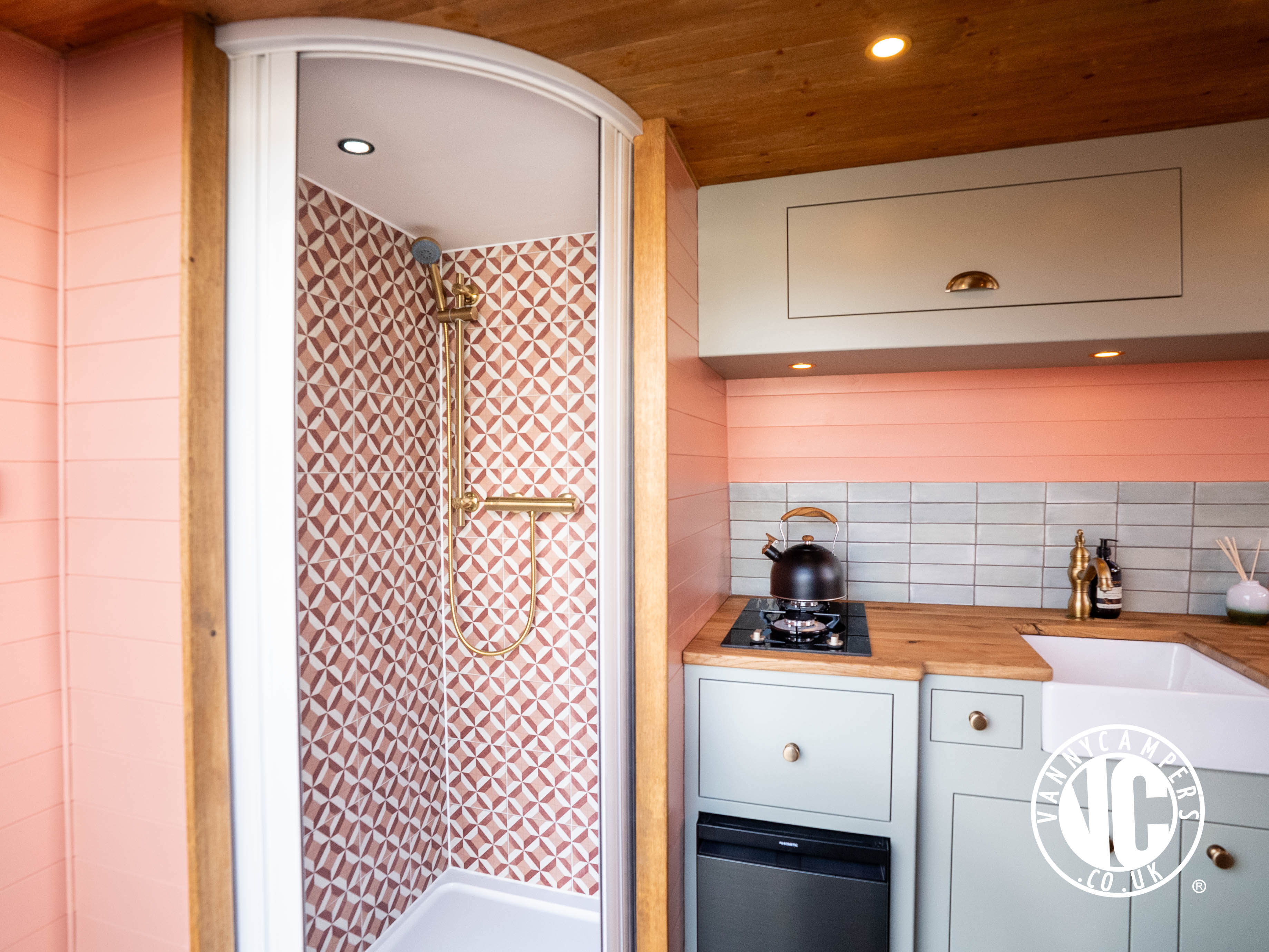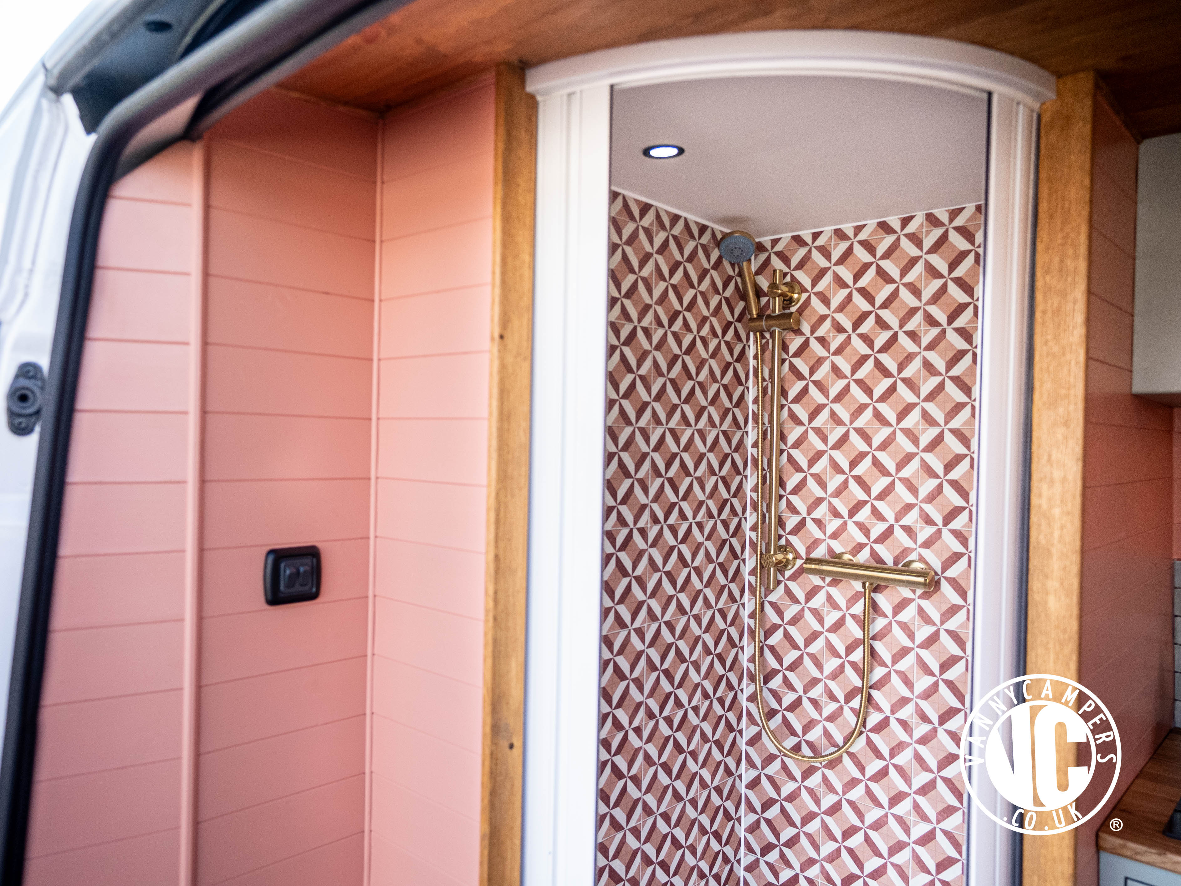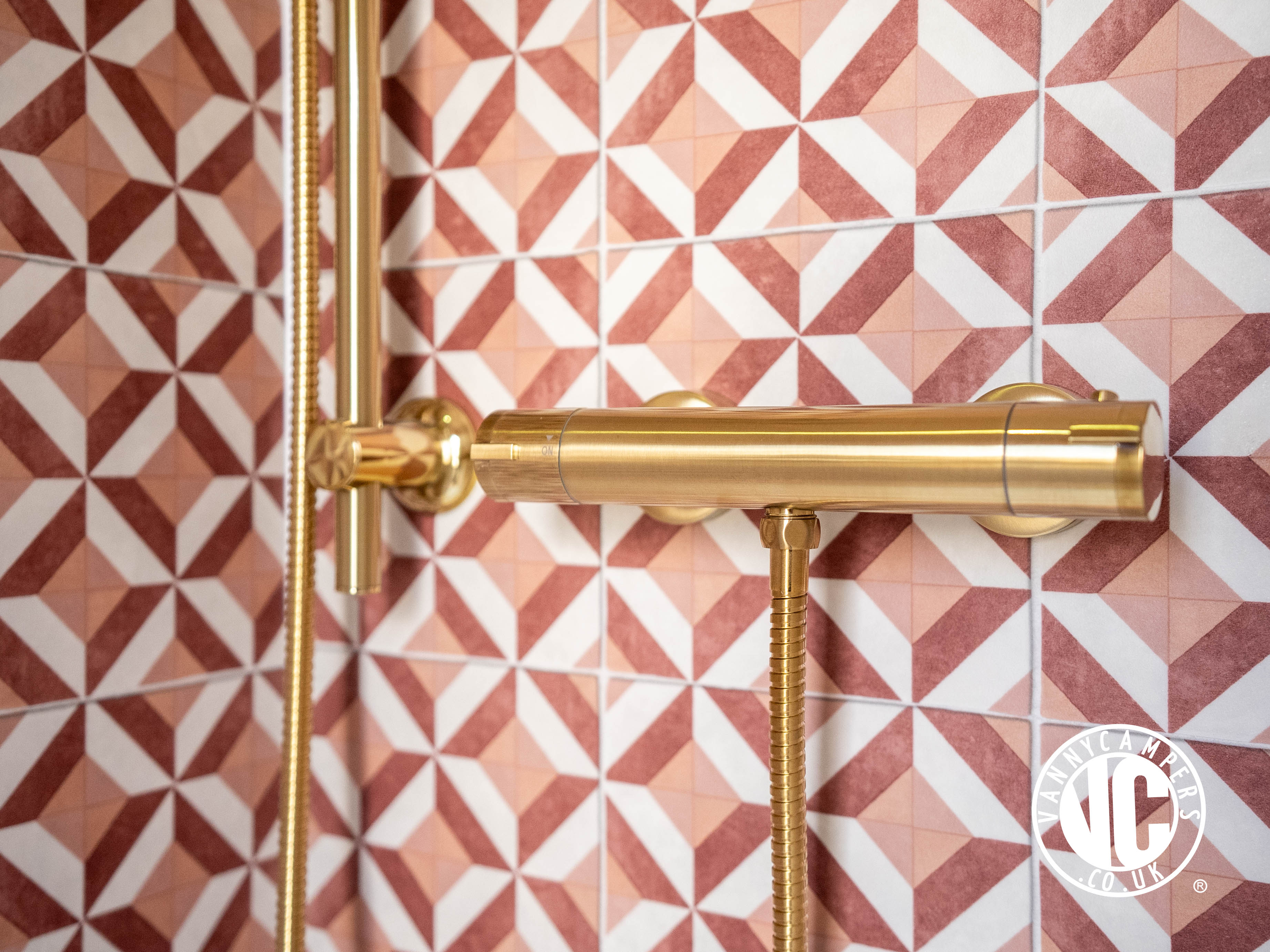 The bathroom is a beauty with a signature full-size quadrant shower cubicle which features custom-made sliding doors and a gold thermostatic shower mixer with hot and cold pressure-regulated running water. The bathroom includes a Thetford 365 Porta Potti and a Thetford toilet, set against lightweight patterned wall panels and a brilliant white shower tray. Hot water is powered by a Truma Combi 4E, while LED lighting ensures the space is bright and inviting.