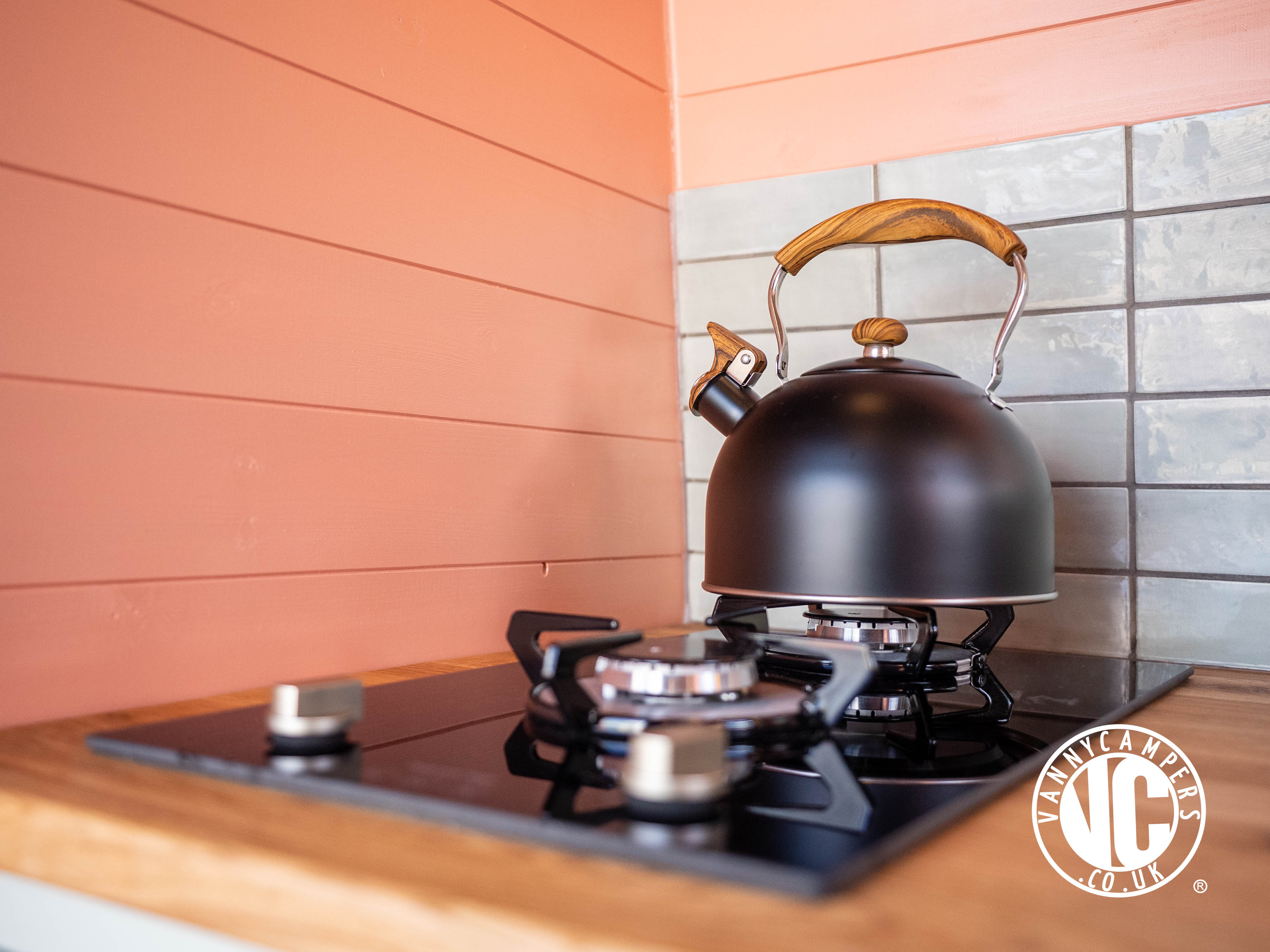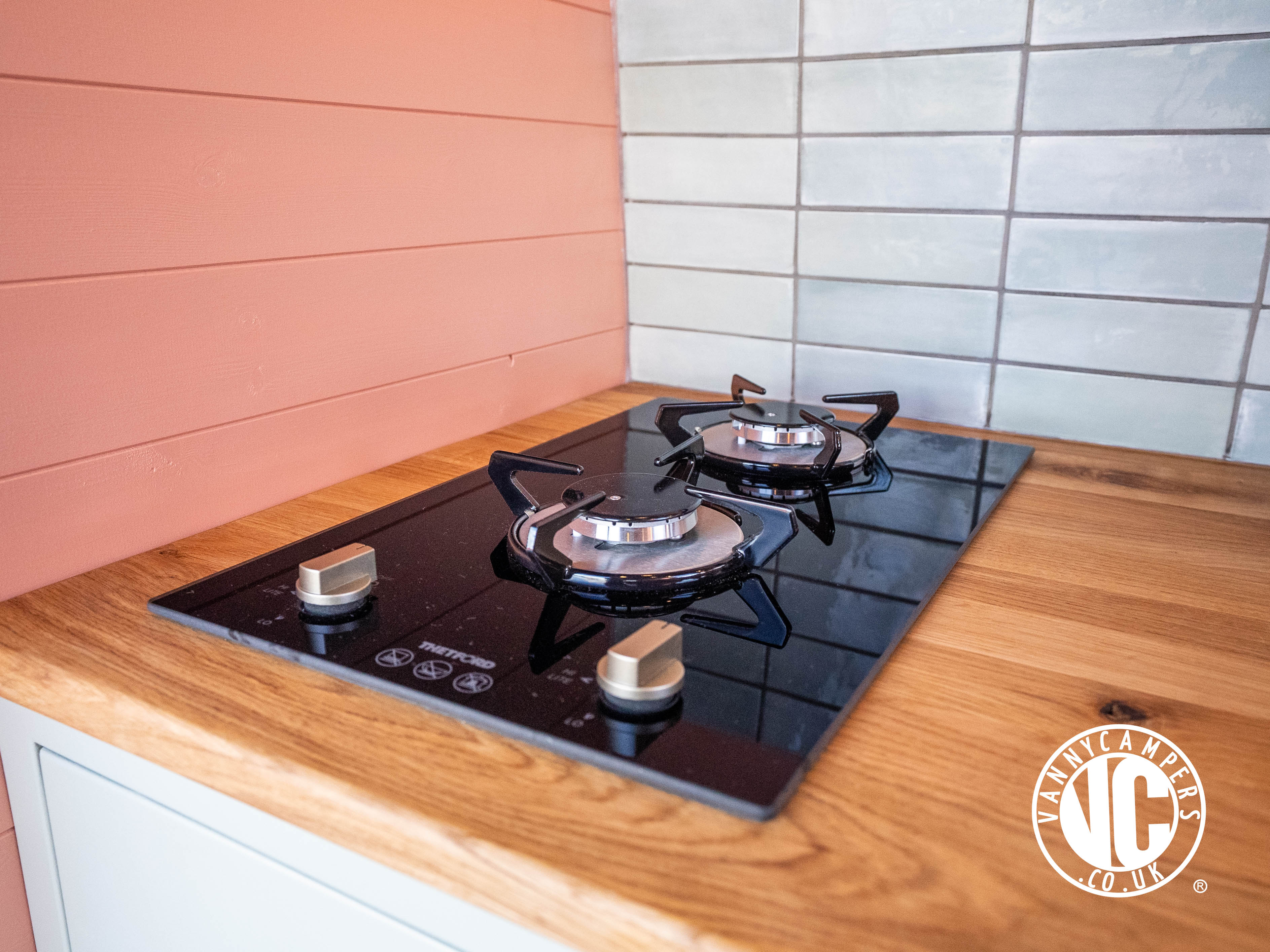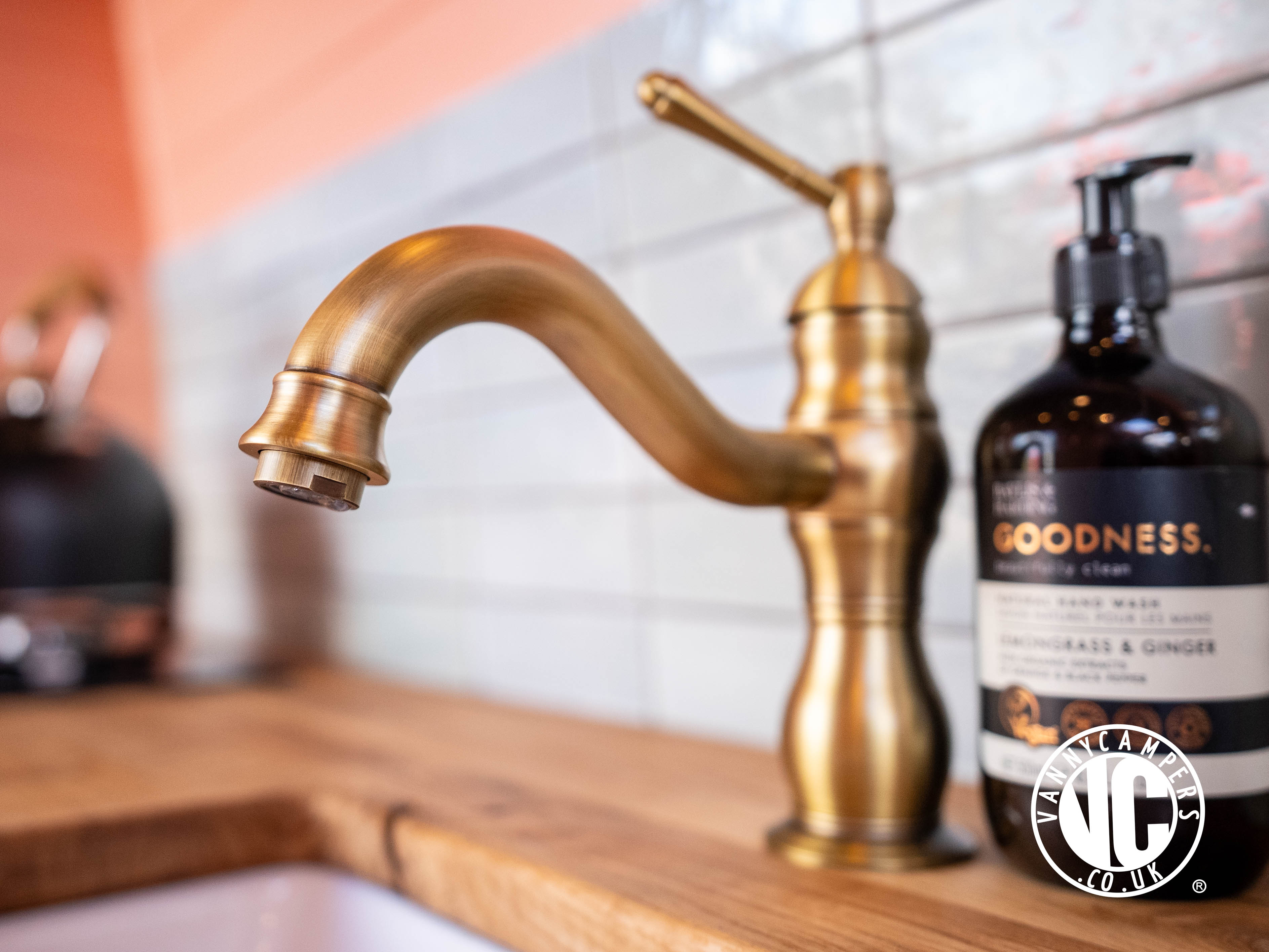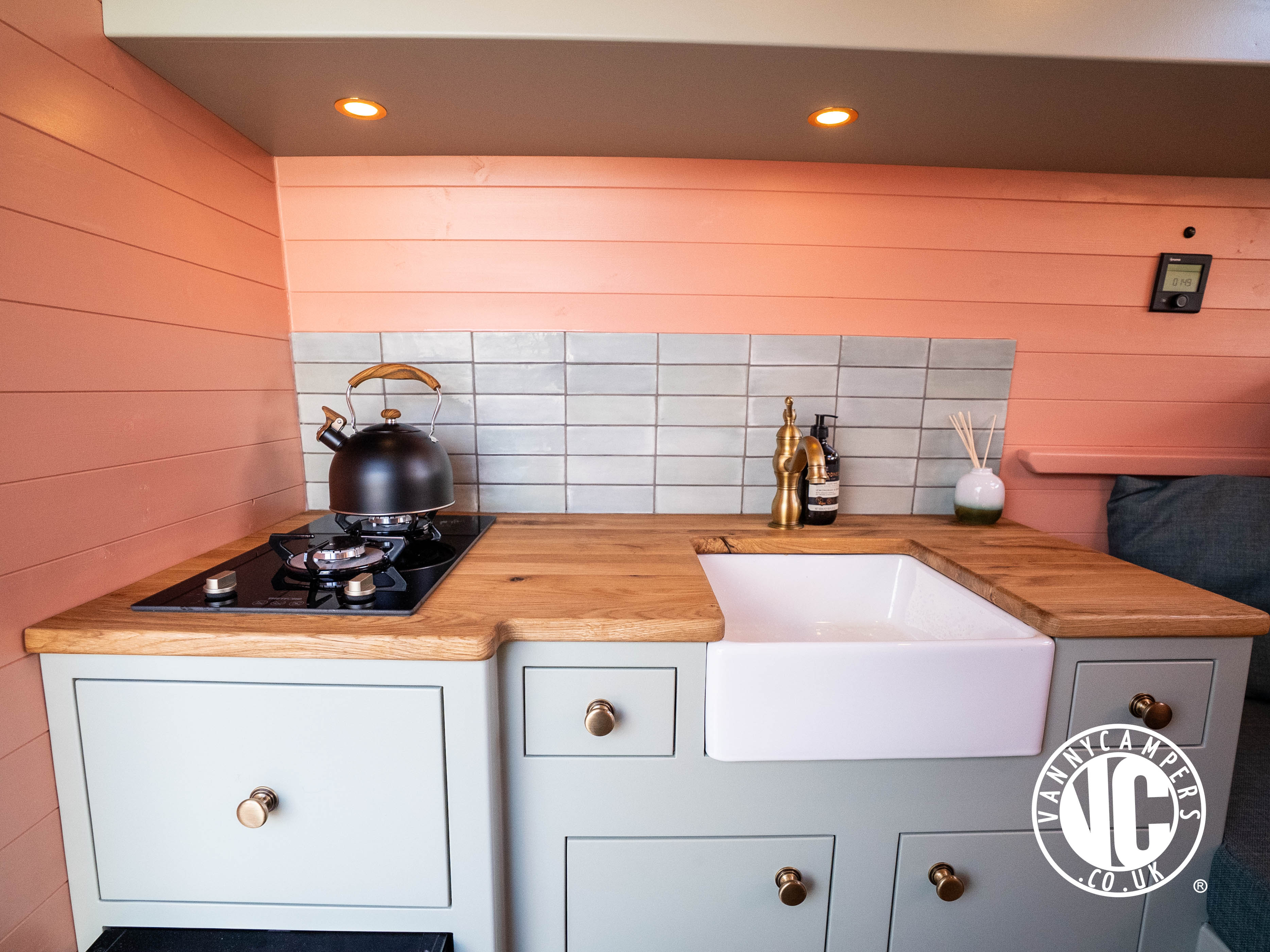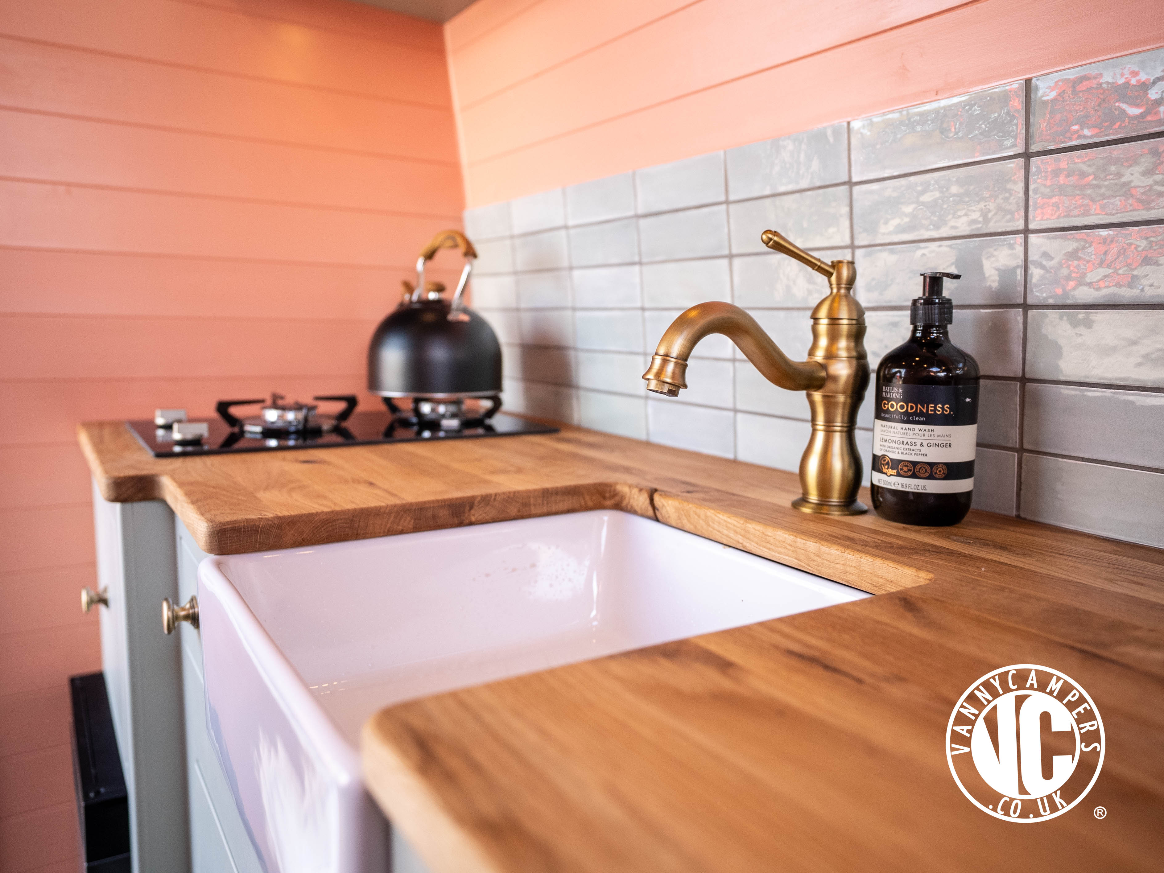 The kitchen features a white mini butler sink paired with a gold-coloured hot/cold tap, alongside a Thetford double gas burner hob and a 50L 12V compressor Dometic fridge. Bespoke kitchen units offer plenty of drawers and storage, including a cutlery drawer and hidden vanity station, all complemented by an oak worktop and antique brass handles and hinges. A fire-resistant splashback and glazed designer tiles add style and safety, while an under-sink Truma water and space heater running on LPG maximises space. A 75L fresh water tank is conveniently located in the garage.