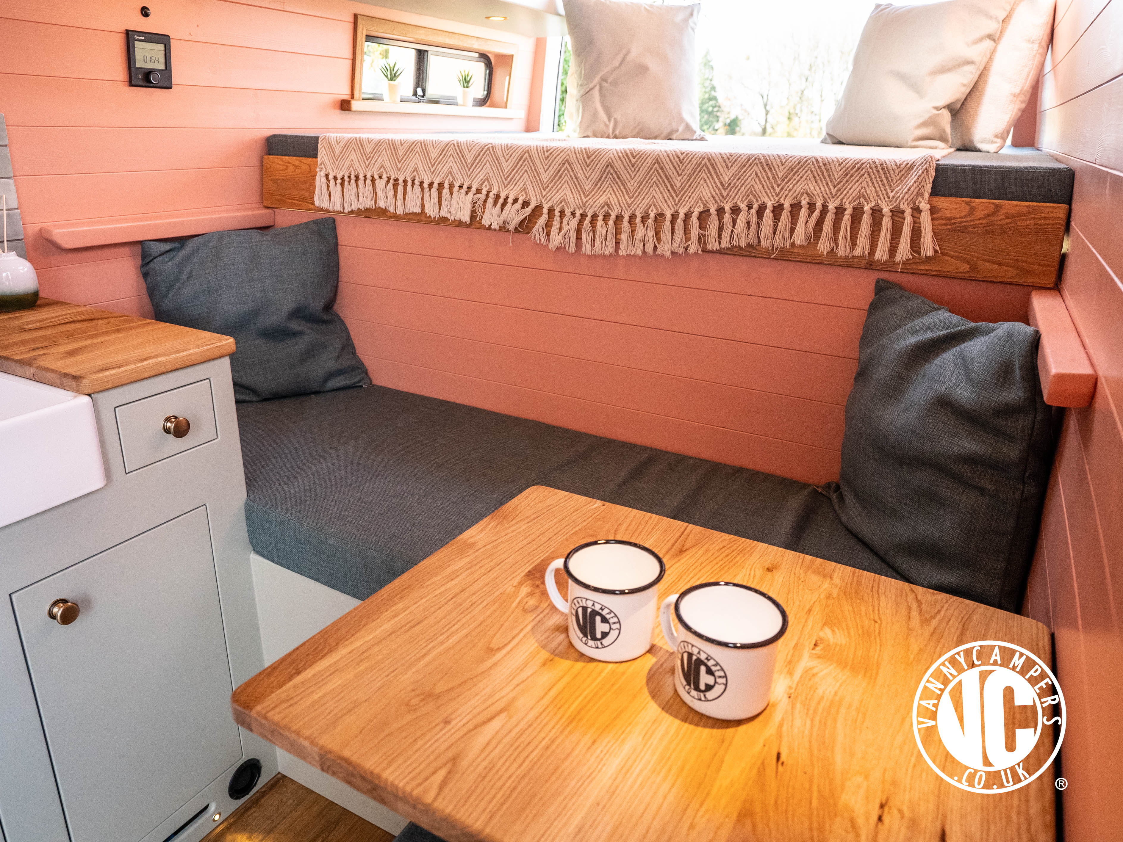 The living, working, and dining space is a stylish, open area filled with natural light from large windows on the side and a letterbox window next to the bed. It features a bench seat with under-hatch access to the garage, a removable oak table, and a movable seat pod that cleverly houses the Thetford 365 Porta Potti. Duck egg coloured linen effect upholstered cushions flows throughout, beautifully contrasted with Farrow & Ball ‘Naperon’ painted walls, and finished with three blue gray overhead cupboards perfect for clothes, food, or whatever else you need. Practical touches include USB ports, a 12V socket, double 240V sockets under the table, a reading wall light, and a Truma heater control panel on the wall. Cushions on the bench seat and the versatile, removable seat pod make the space both comfortable and functional.
