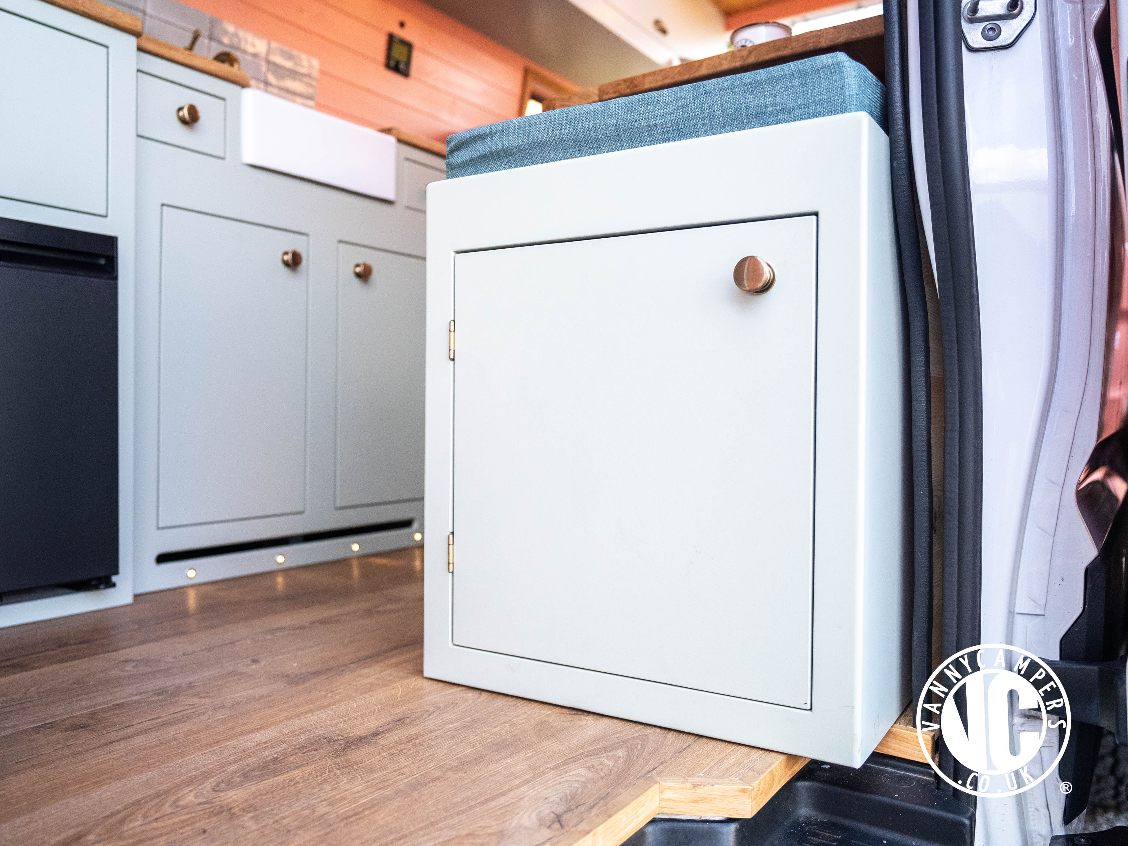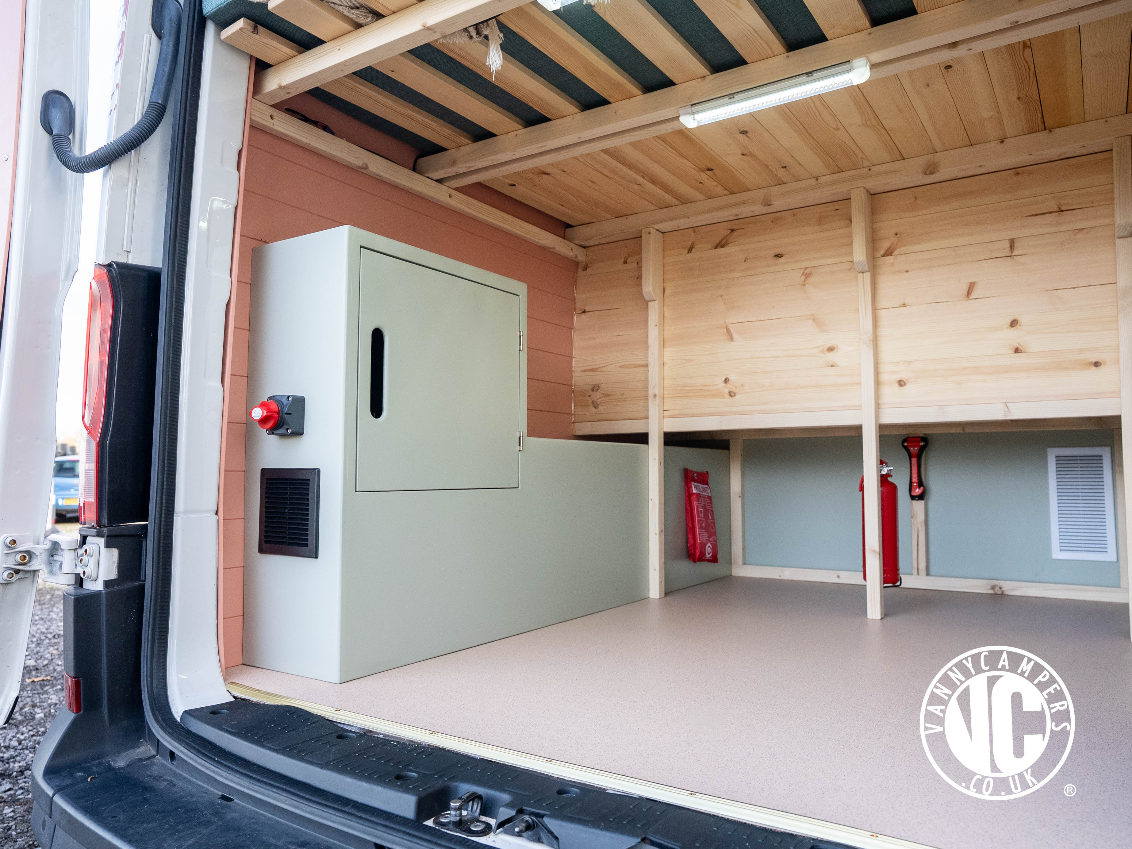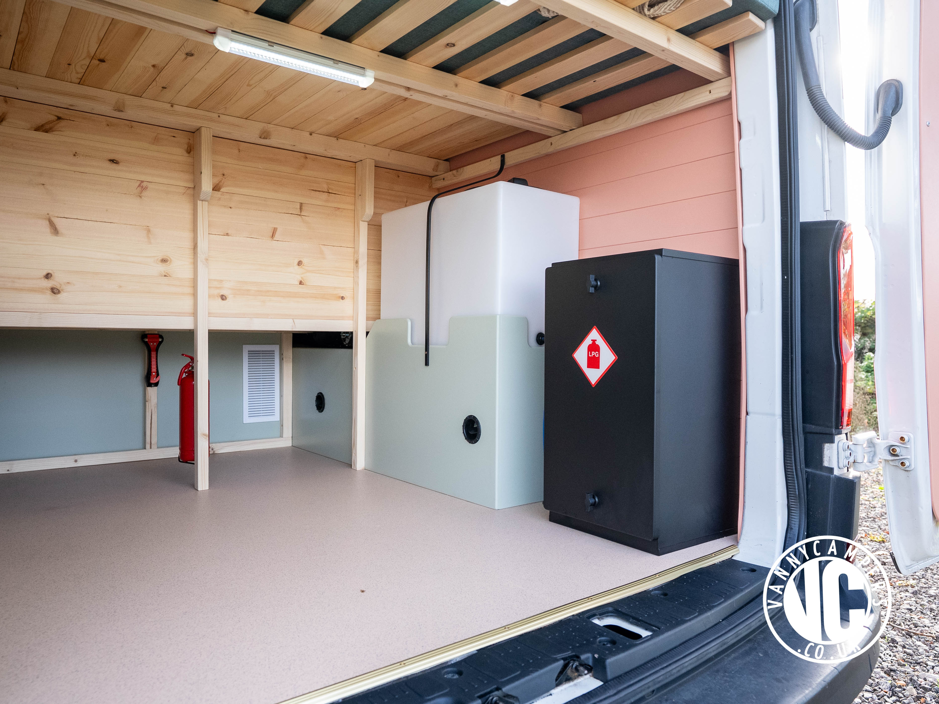 Reset and Chill have nailed it yet again with this garage. It’s a biggy! We think you could fit a couple of bikes, tents, BBQ, bags, paddleboards and still have room for a dog bed which in fact is built into this van! If the heavens happen to open when you’re wanting to access the area, you can slip through under the seating area. In the rear, you will find the electric cupboard and battery bank on the left-hand side along with the 75l water tank and gas storage on the right. The garage has its own LED lighting and some durable Altro flooring so you can throw what you like in there!