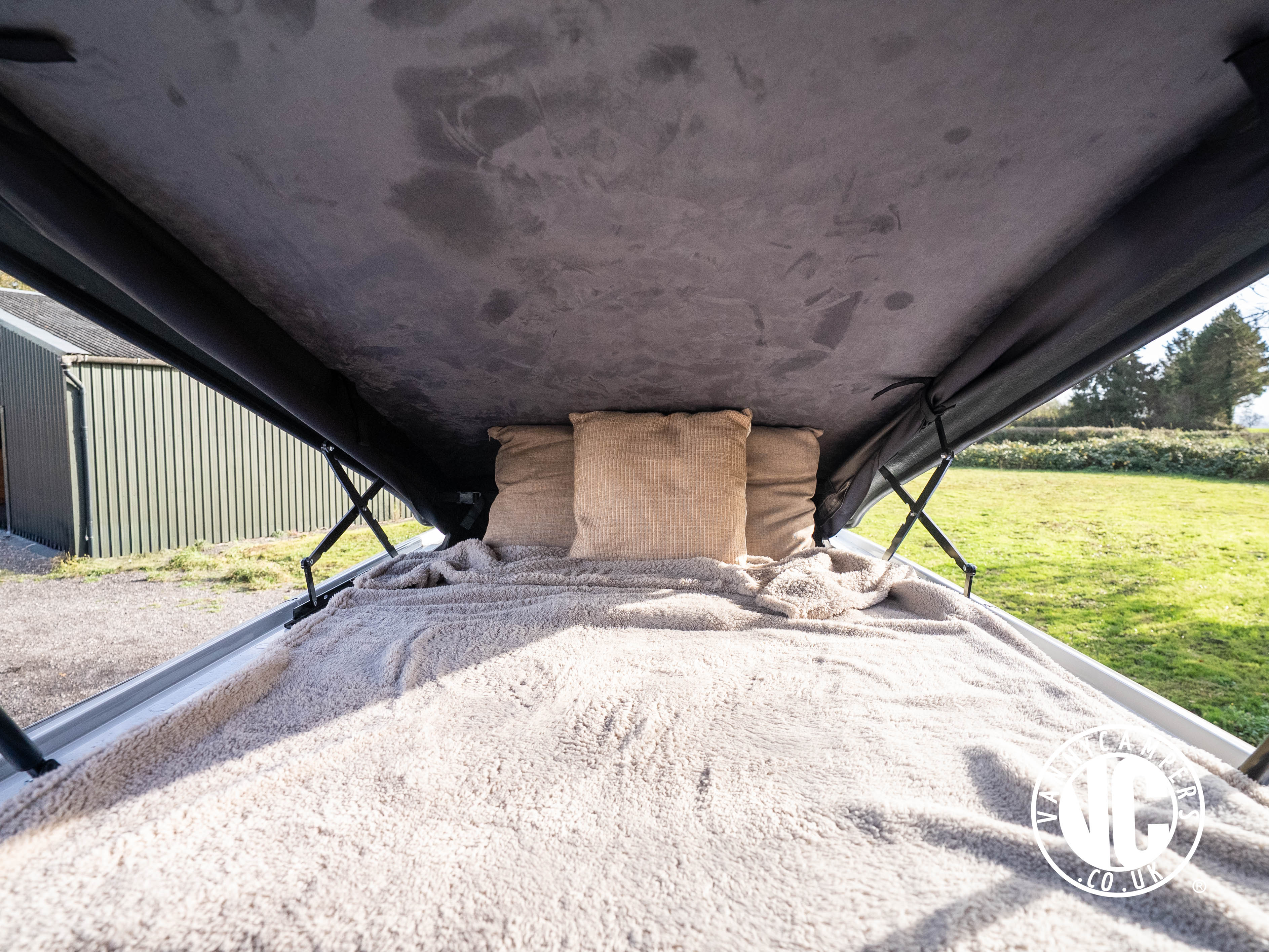 We do love a pop-top boudoir, and this one is no exception. Imagine unwinding in your very own private suite under the stars—camping luxury, anyone? As the sun sets and the night sky comes alive, you’ll be cosy in your pop-top haven, soaking in the view and basking in the warm glow of ambient lights. Up on the roof, you’ll spot the 300W solar panel and the roof itself has been finished with tough Raptor paint, combining style with durability.