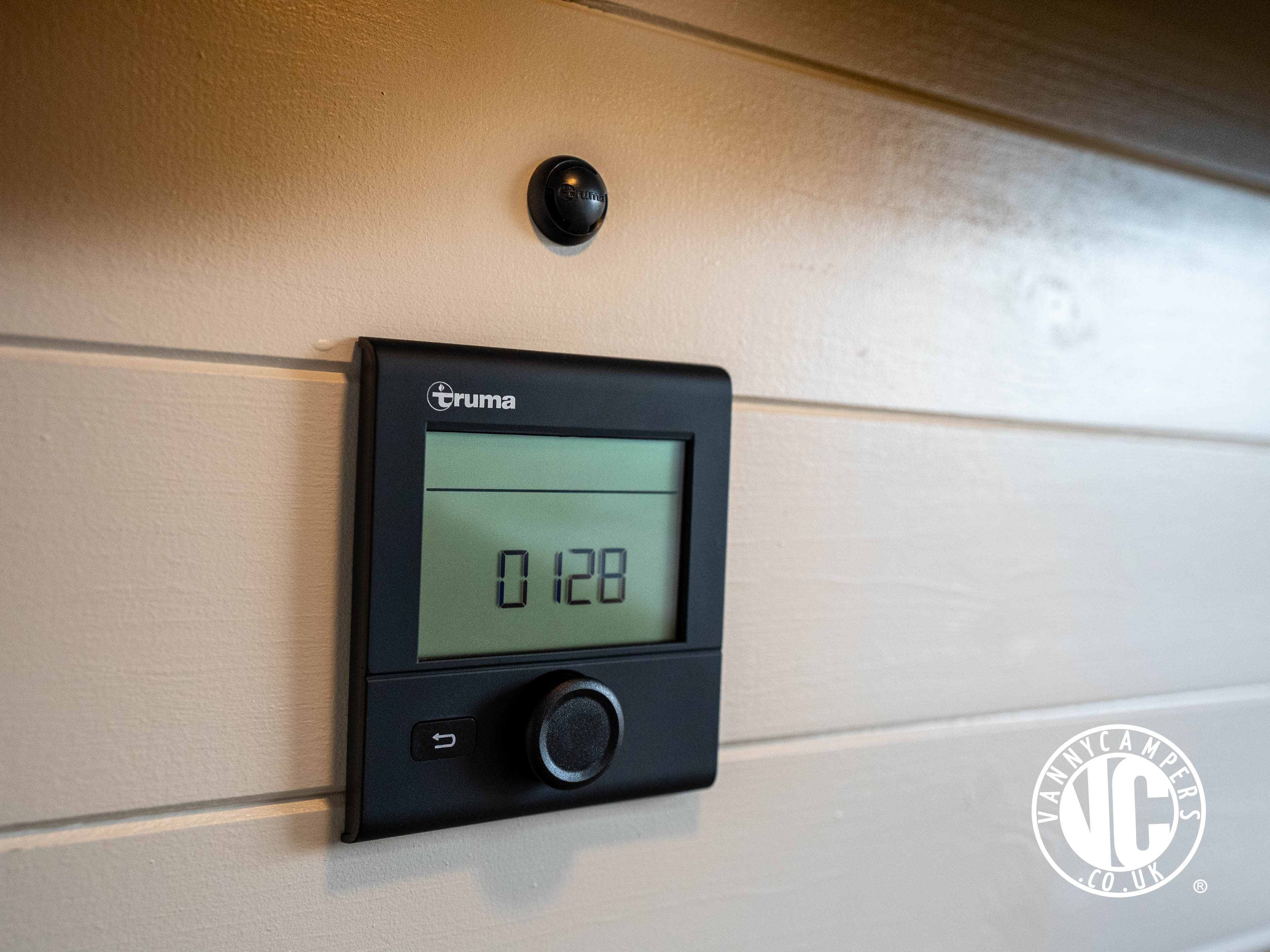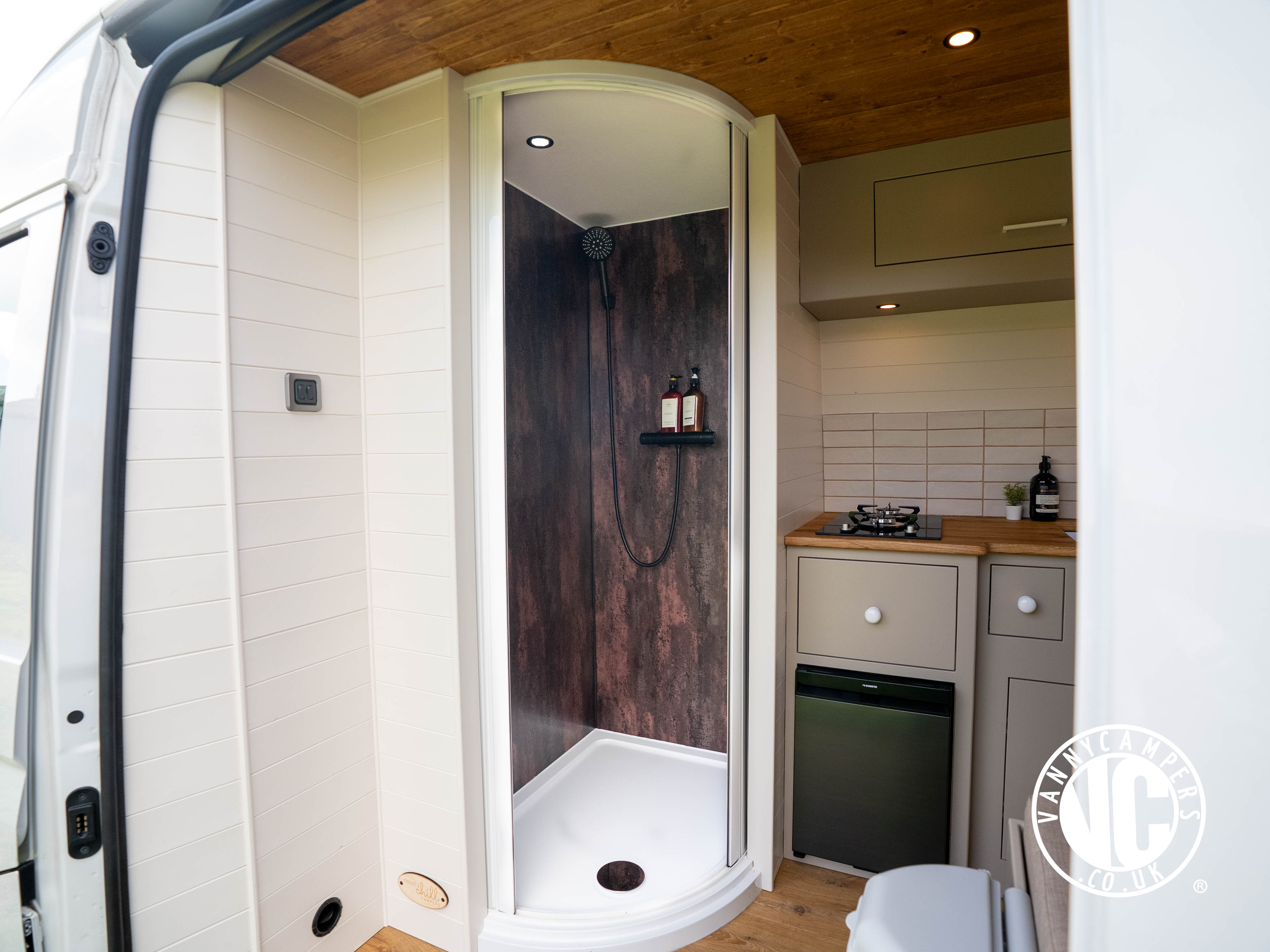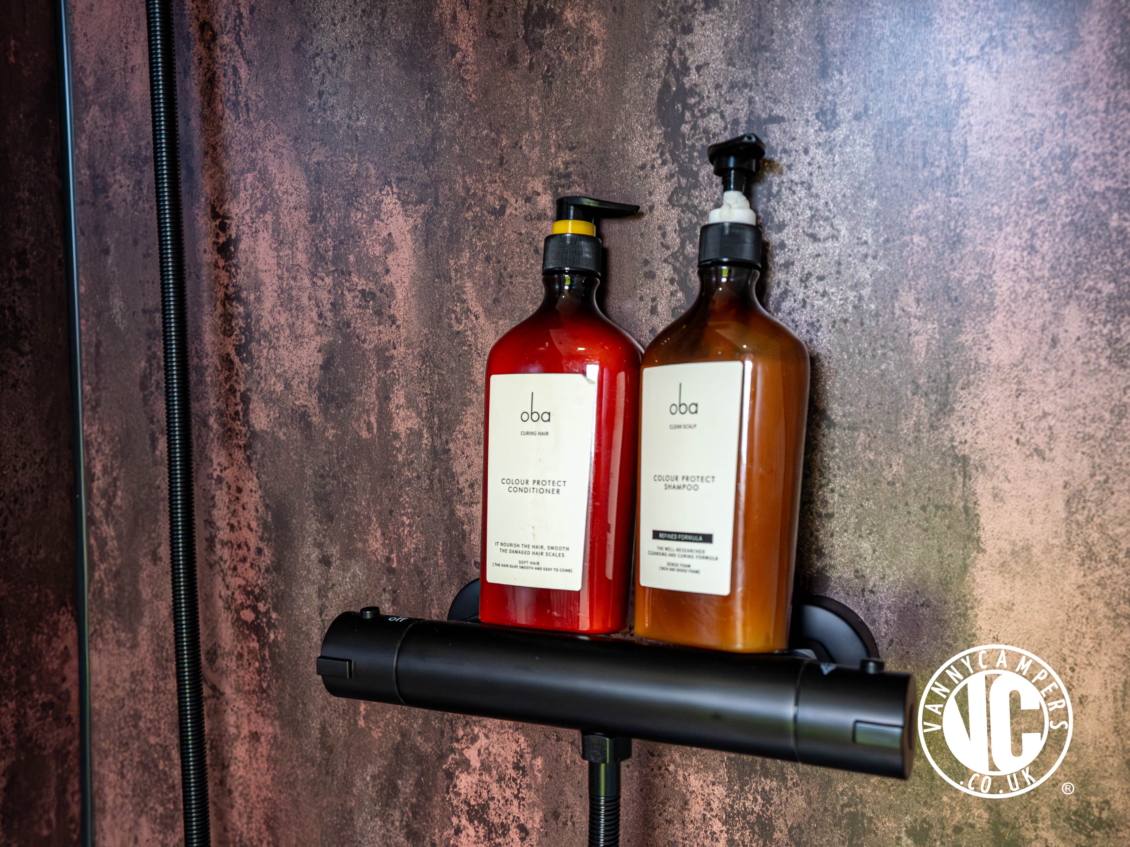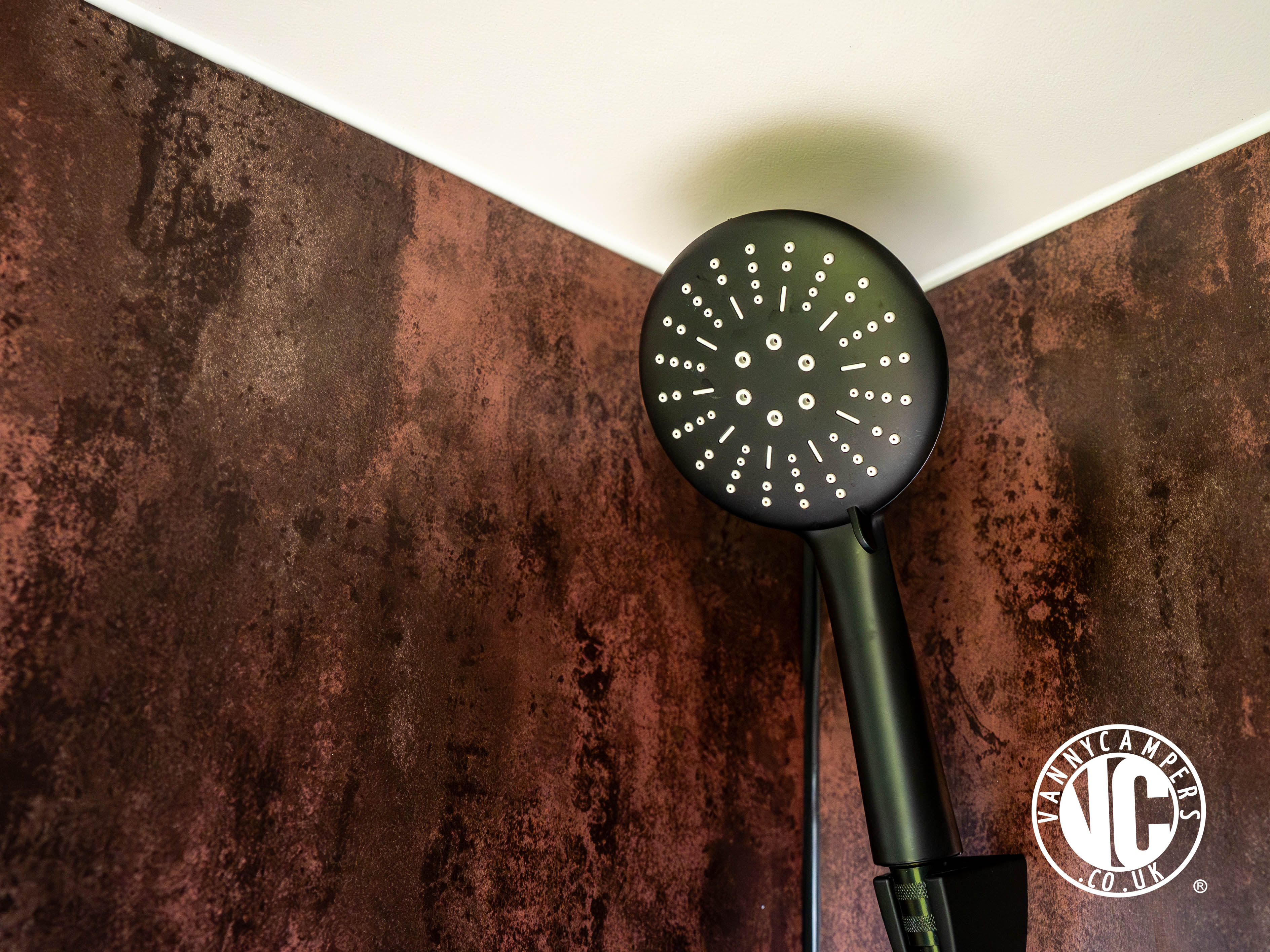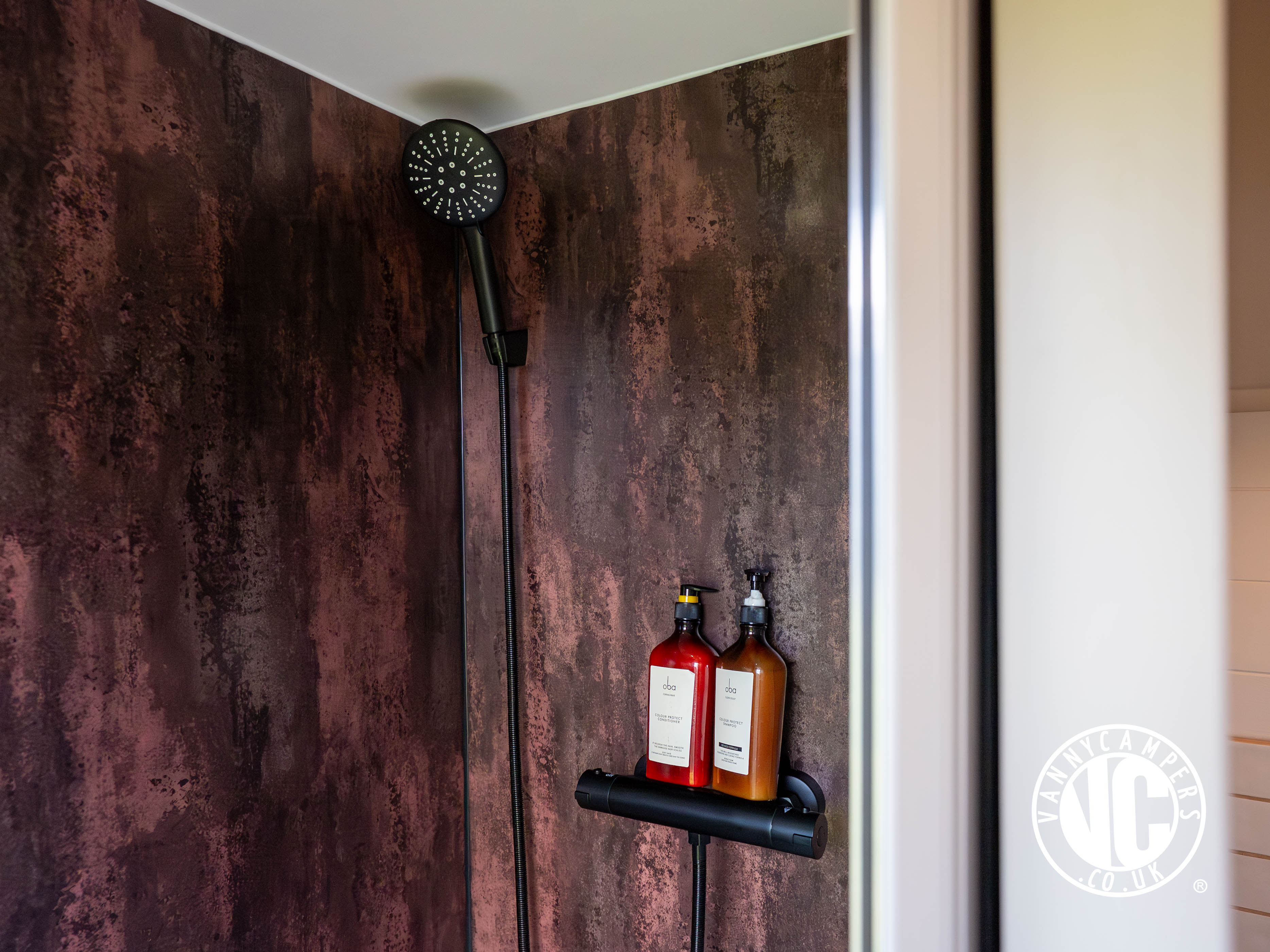 The bathroom is a beauty with a signature full-size quadrant shower cubicle which features custom-made sliding doors and a black metal thermostatic shower mixer with hot and cold pressure-regulated running water. The bathroom includes a Thetford 365 Porta Potti and a Thetford toilet, set against lightweight rusty-effect wall panels and a brilliant white shower tray. Hot water is powered by a Truma Combi 4E, while LED lighting ensures the space is bright and inviting.