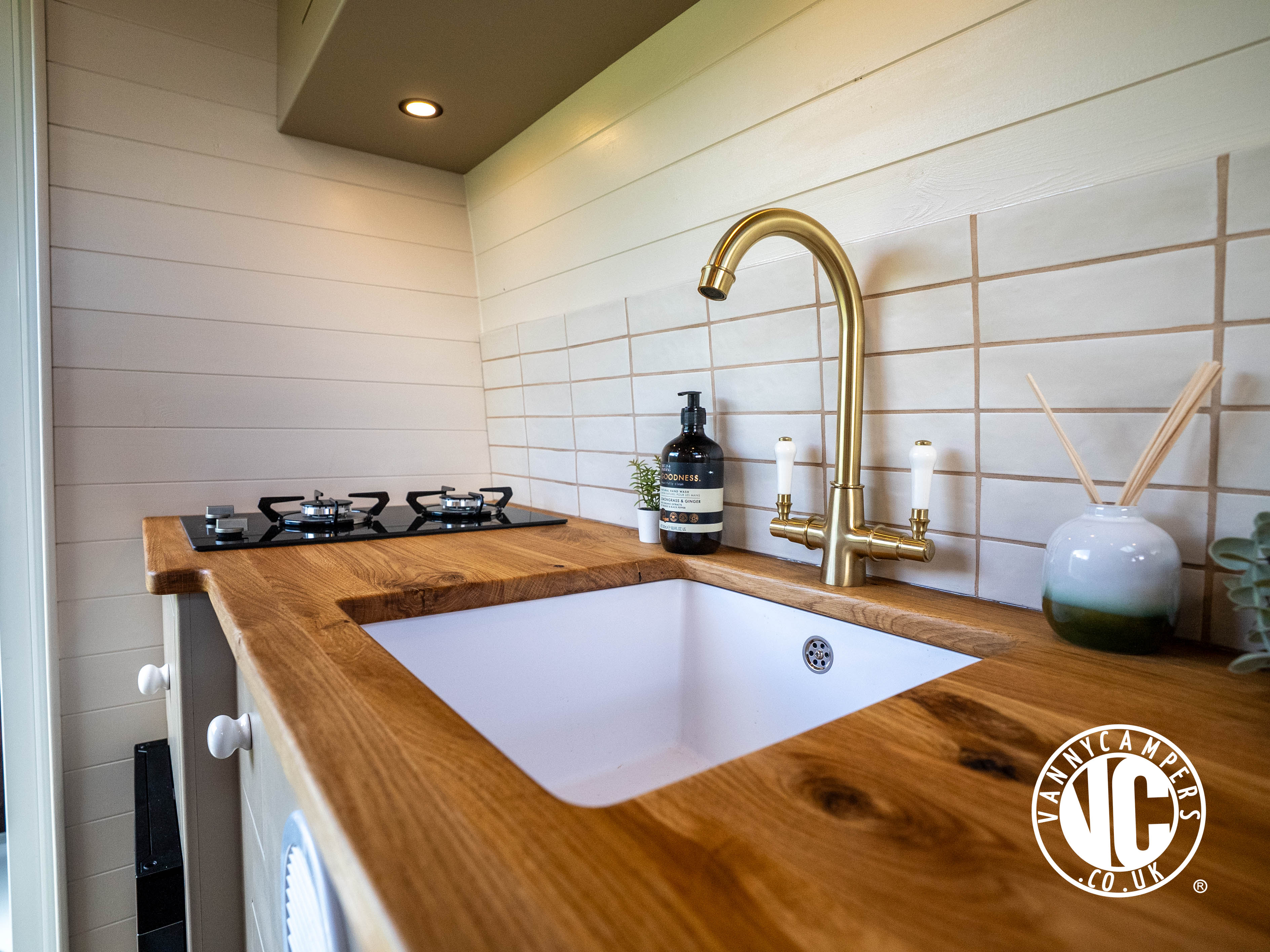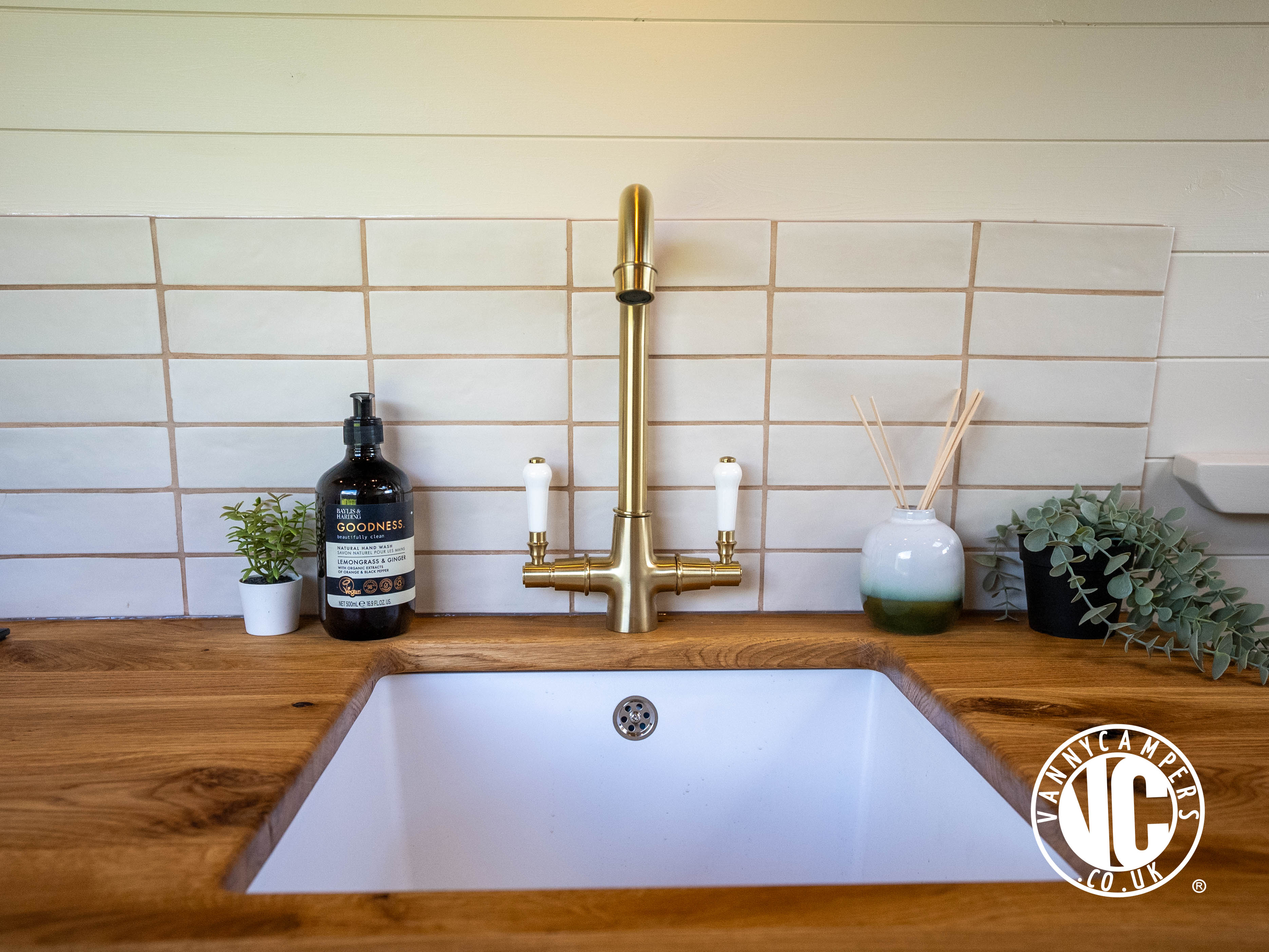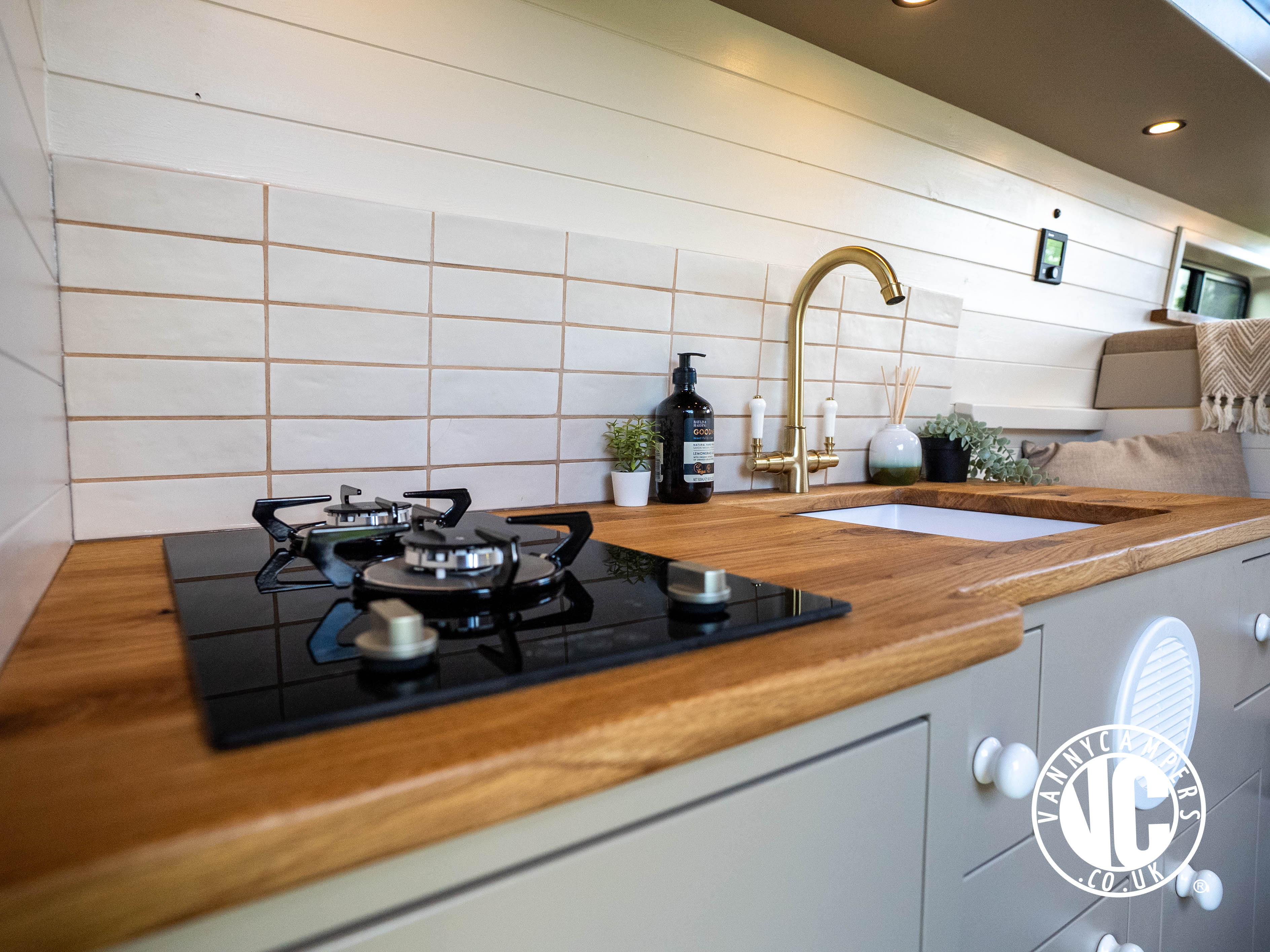 The kitchen features a white inset sink paired with a brass-coloured hot/cold tap, alongside a Thetford double gas burner hob and a 50L 12V compressor Dometic fridge. Bespoke kitchen units offer plenty of drawers and storage, including a cutlery drawer and a removable bin, all complemented by an oak worktop and white ceramic knobs. A fire-resistant splashback and glazed designer tiles add style and safety, while an under-sink Truma water and space heater running on LPG maximises space. A 75L fresh water tank is conveniently located in the garage.