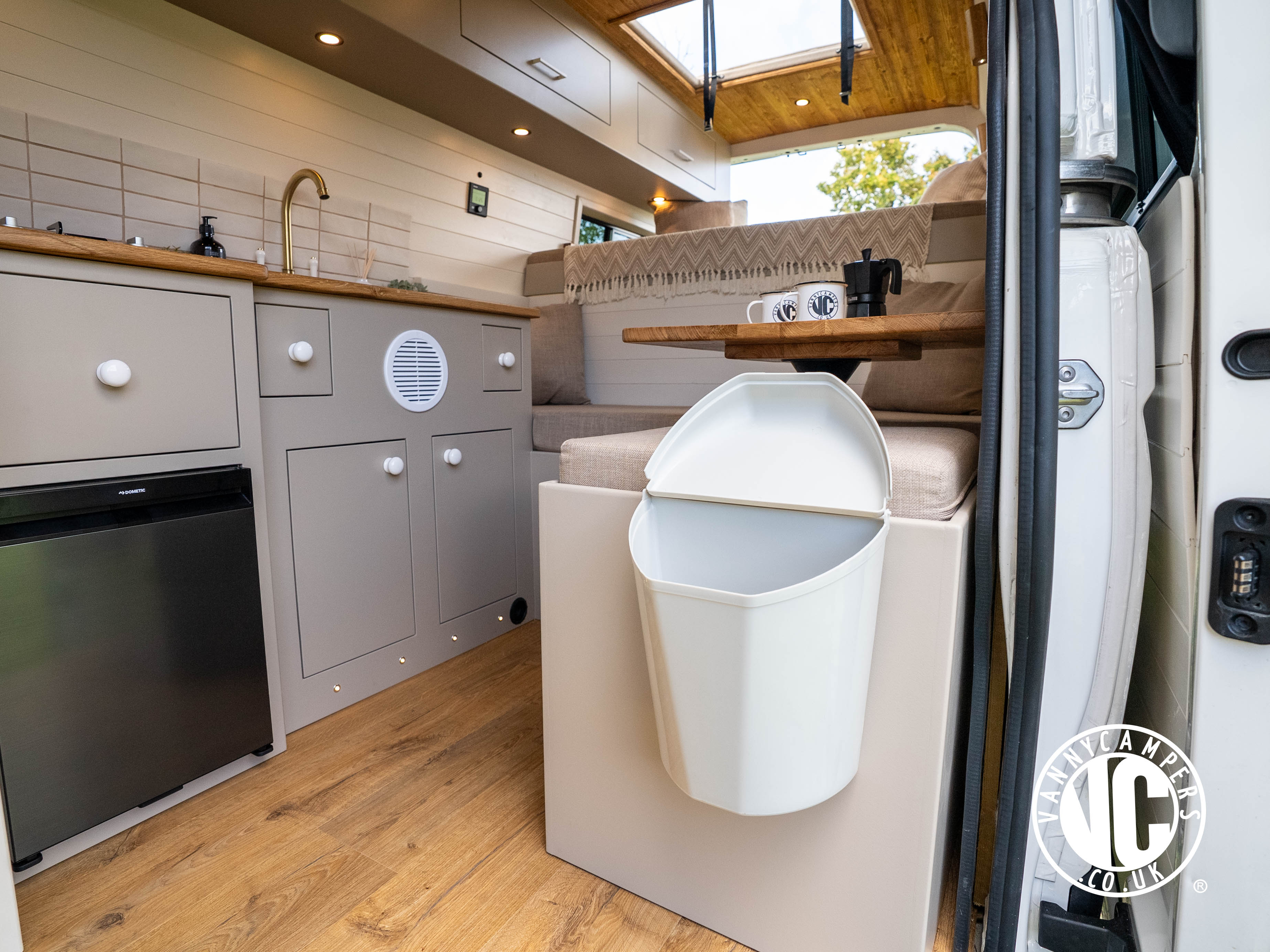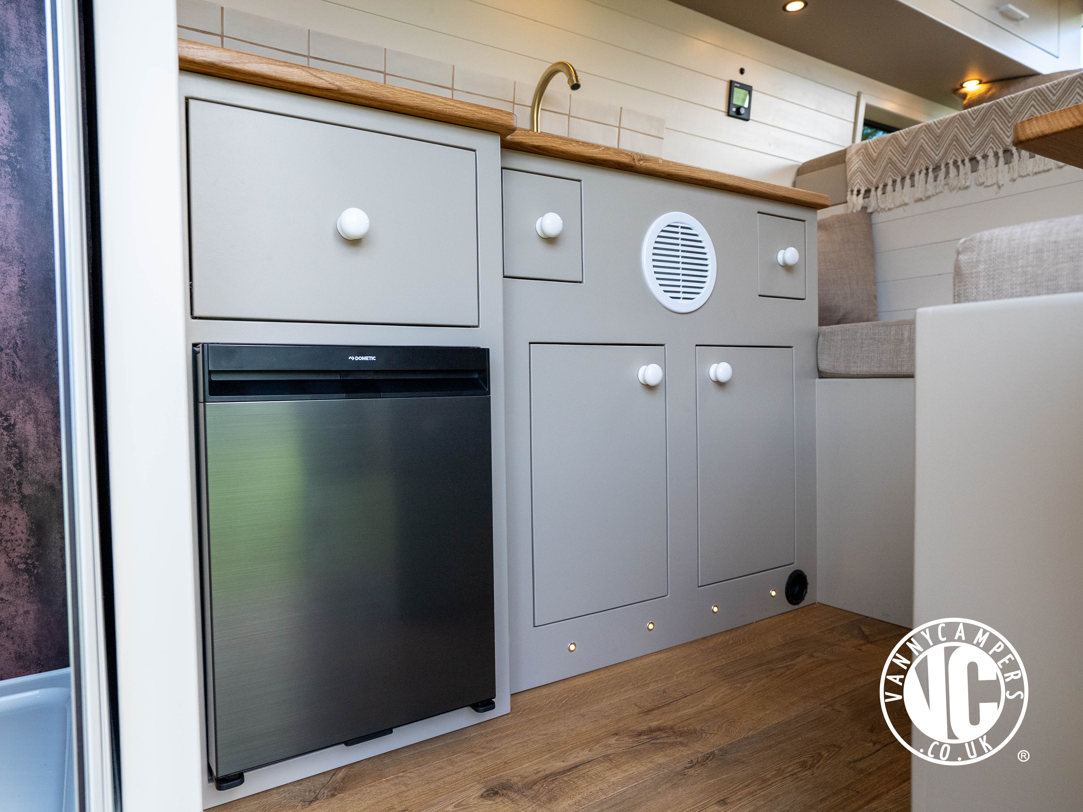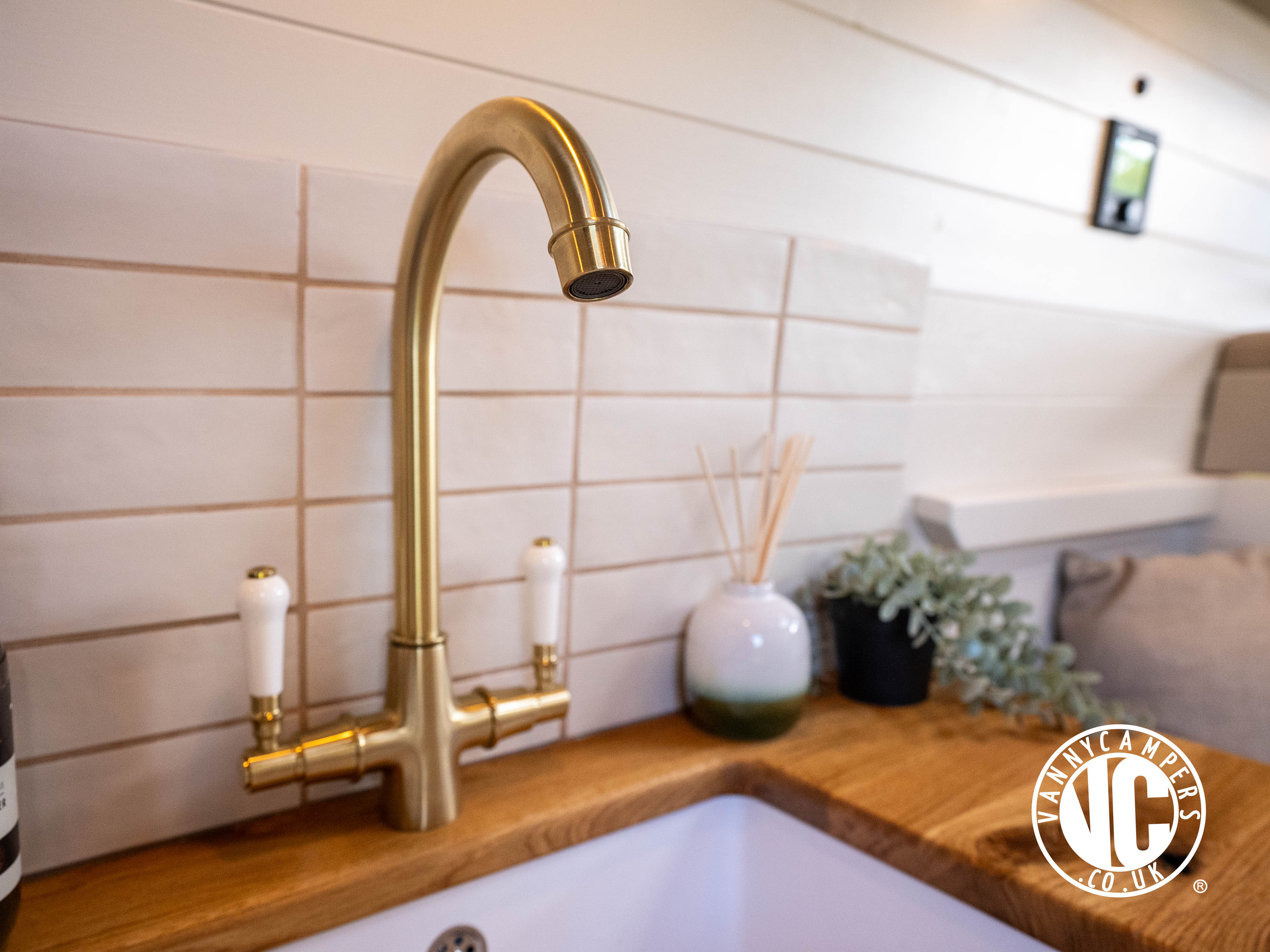 The kitchen features a white inset sink paired with a brass-coloured hot/cold tap, alongside a Thetford double gas burner hob and a 50L 12V compressor Dometic fridge. Bespoke kitchen units offer plenty of drawers and storage, including a cutlery drawer and a removable bin, all complemented by an oak worktop and white ceramic knobs. A fire-resistant splashback and glazed designer tiles add style and safety, while an under-sink Truma water and space heater running on LPG maximises space. A 75L fresh water tank is conveniently located in the garage.