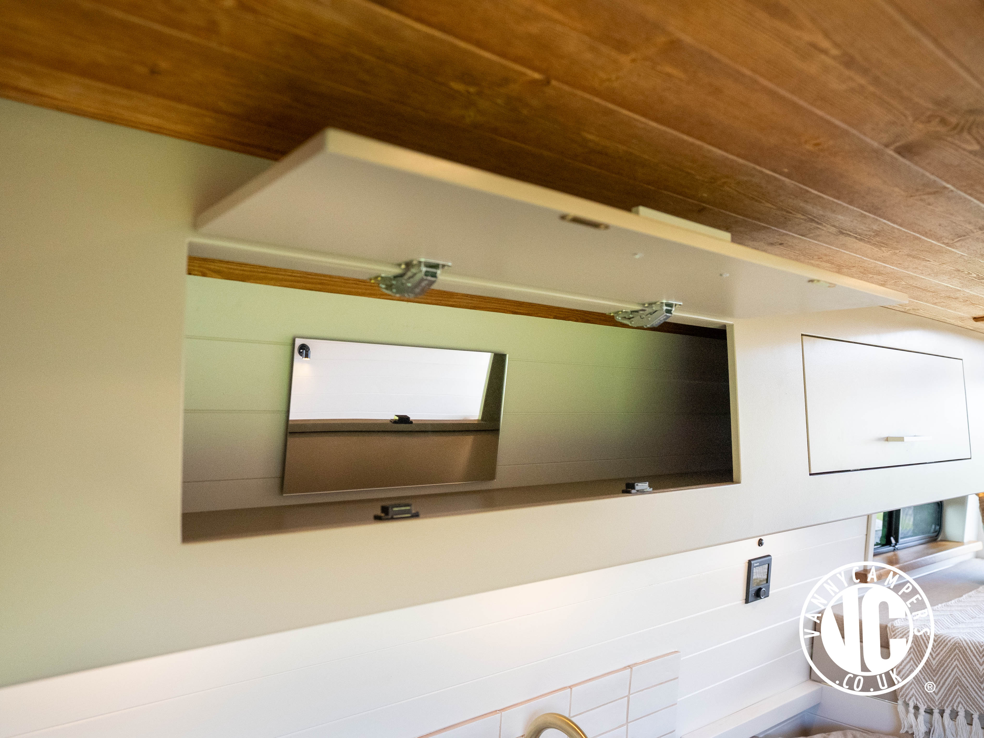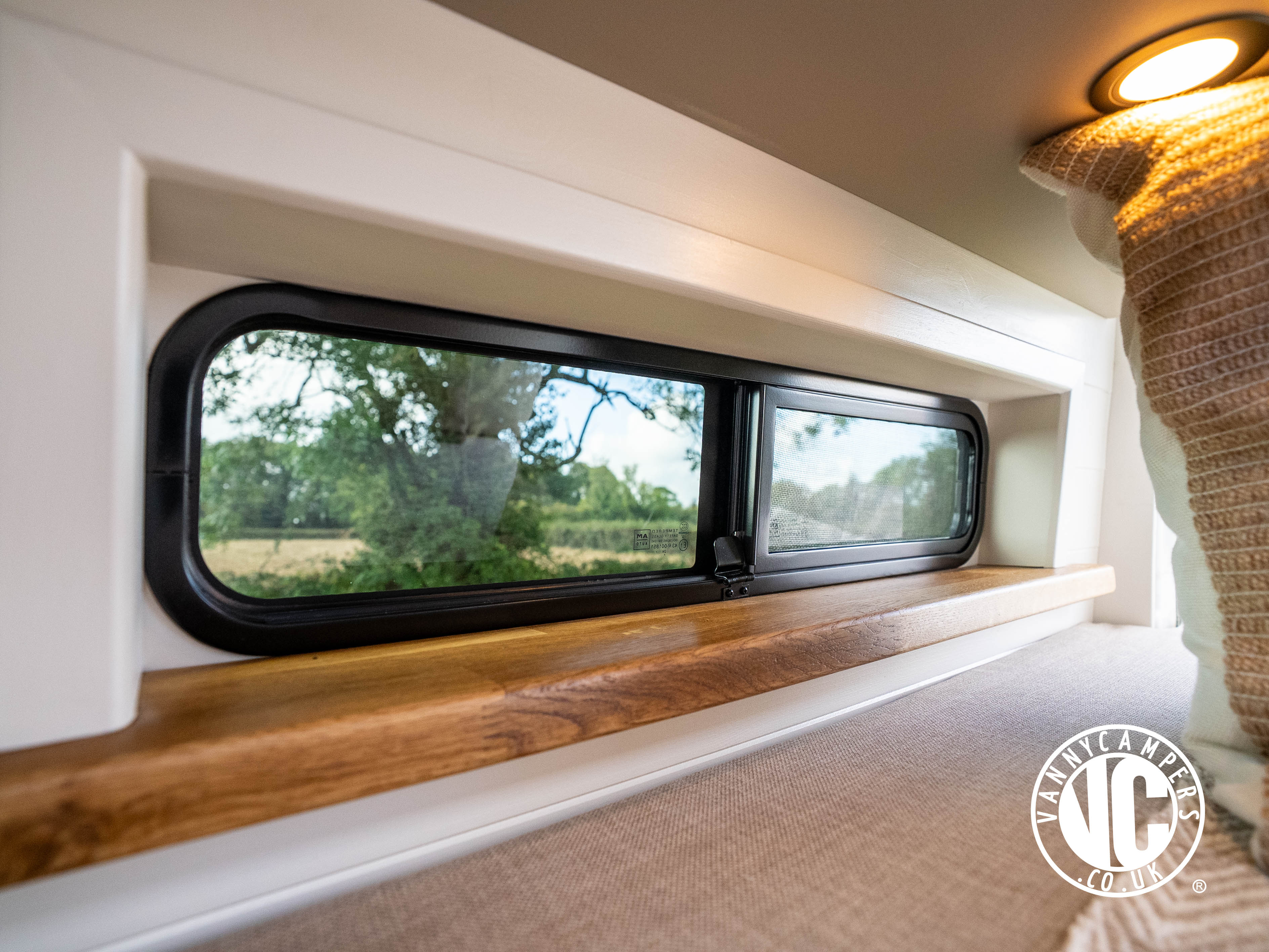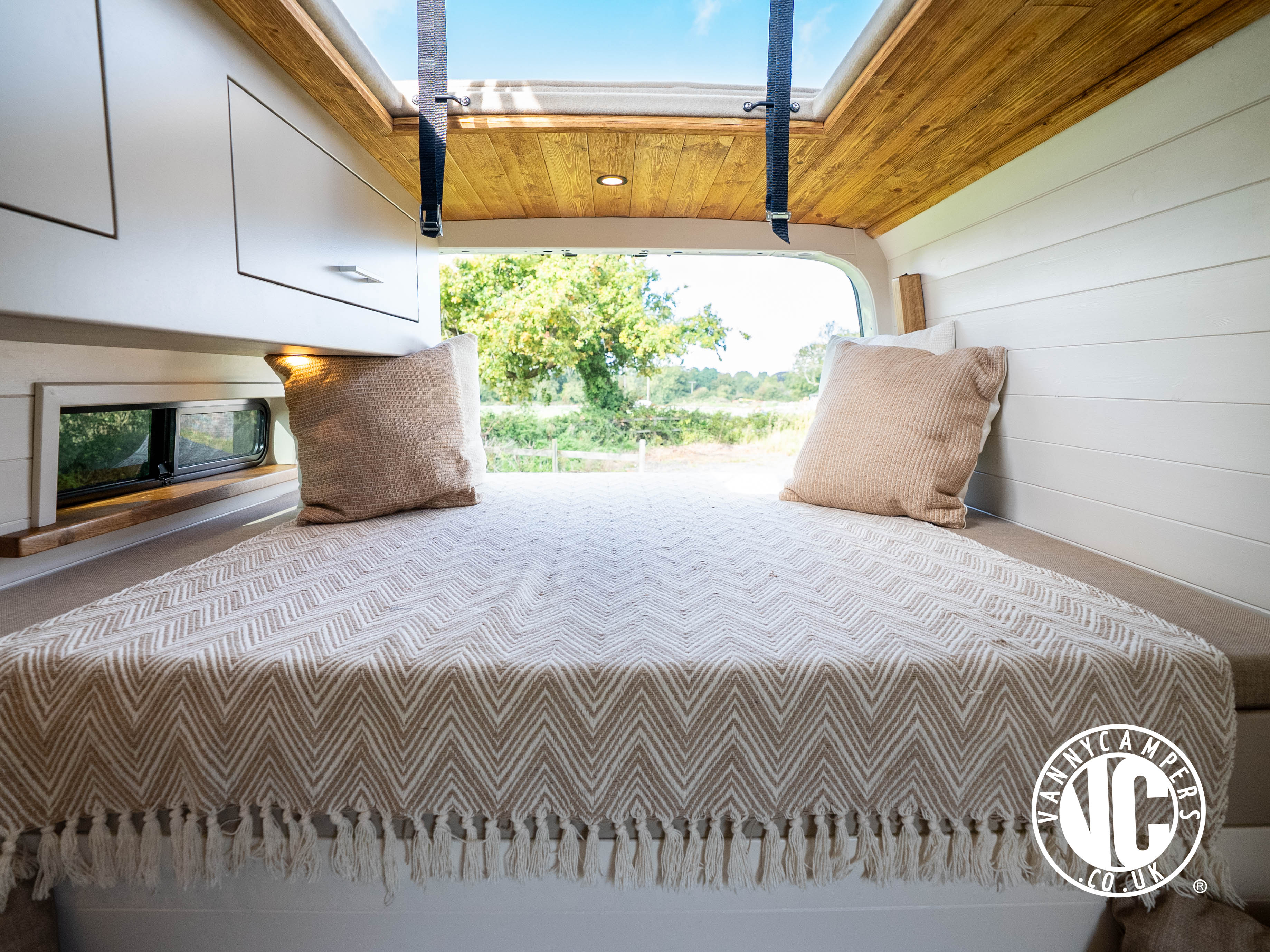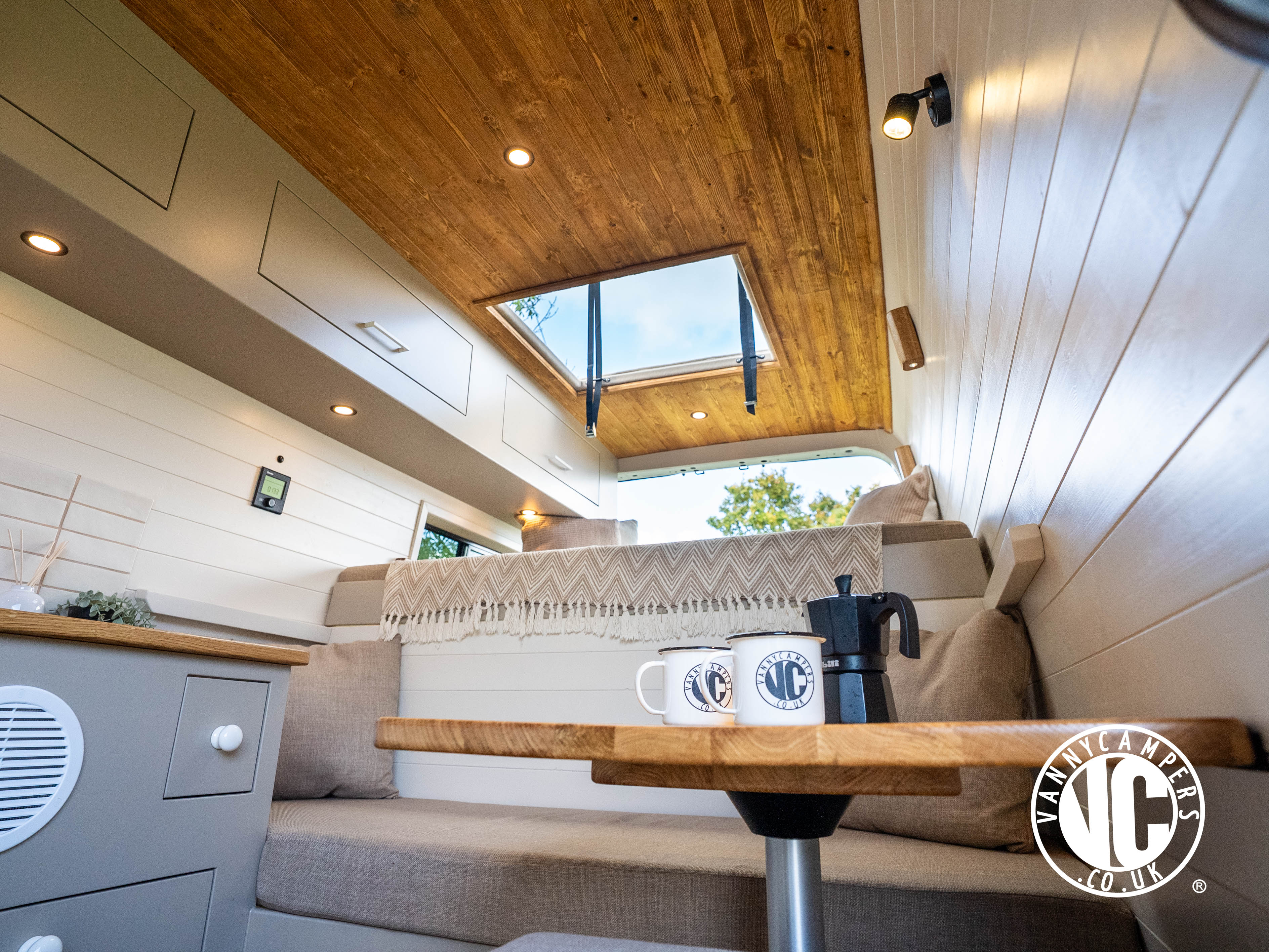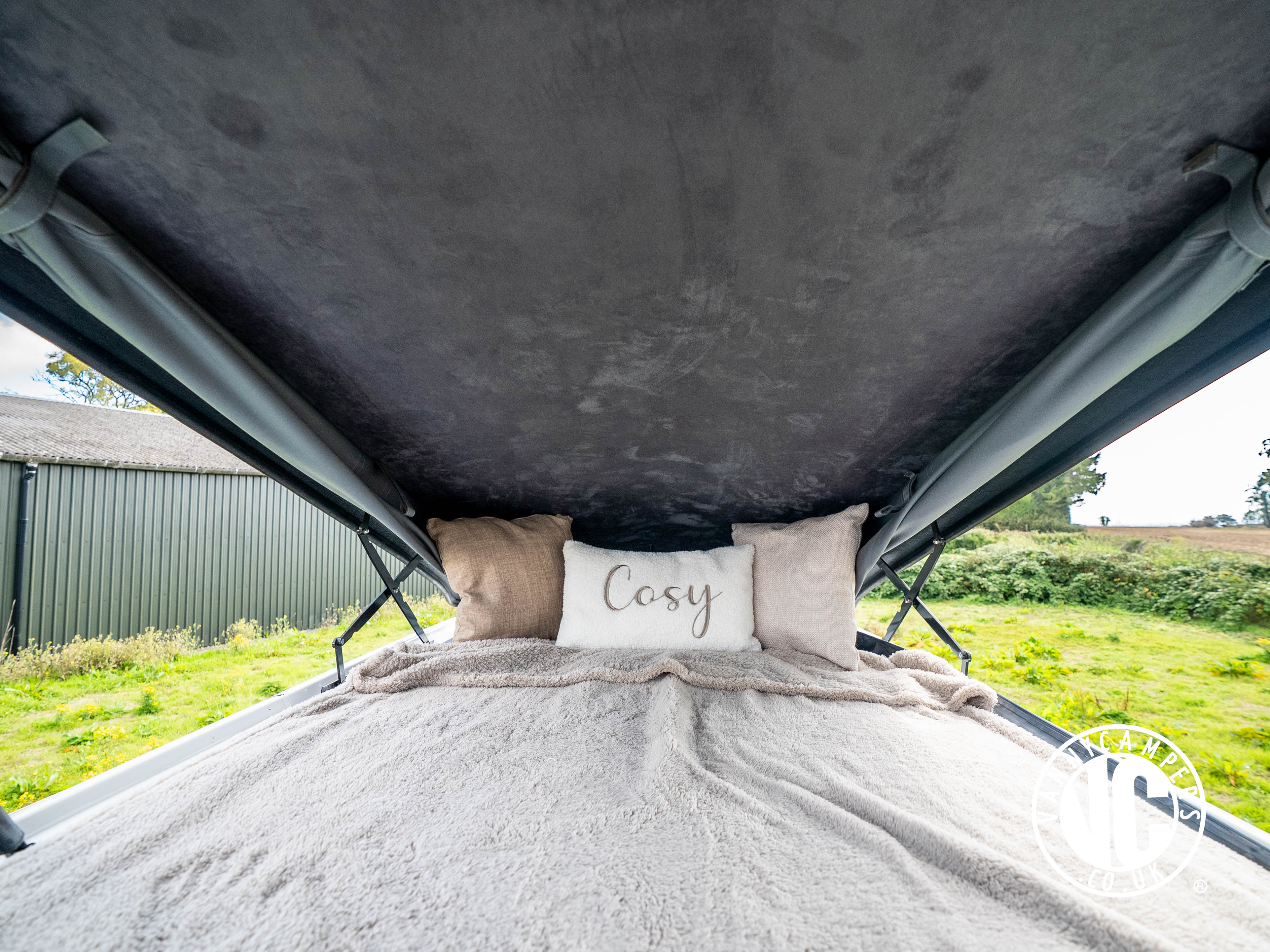 We do love a pop-top boudoir, and this one is no exception. Imagine unwinding in your very own private suite under the stars—camping royalty, anyone? As the sun sets and the night sky comes alive, you’ll be cosy in your pop-top haven, soaking in the view and basking in the warm glow of ambient lights. Up on the roof, you’ll spot the 300W solar panel, along with the Maxxair and bespoke extra-large bathroom skylights. The roof itself has been finished with tough Raptor paint, combining style with durability.
