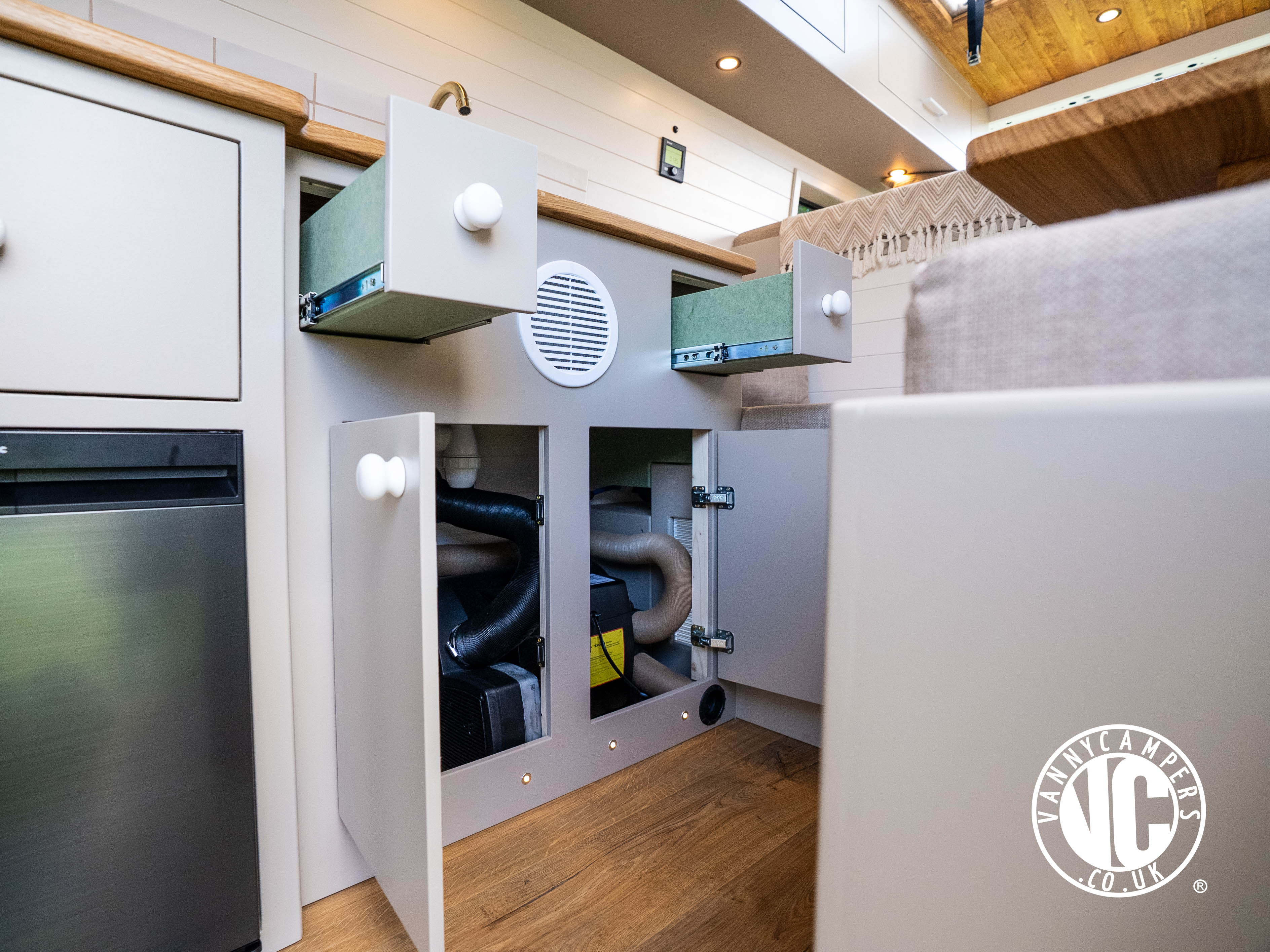 Reset and Chill have nailed it yet again with this garage. It’s a biggy! We think you could fit a couple of bikes, tents, BBQ, bags, paddleboards and still have room for a dog bed which in fact is built into this van! If the heavens happen to open when you’re wanting to access the area, you can slip through under the seating area. In the rear, you will find the electric cupboard and battery bank on the left-hand side along with the 75l water tank and gas storage on the right. The garage has its own LED lighting and some durable Altro flooring so you can throw what you like in there!