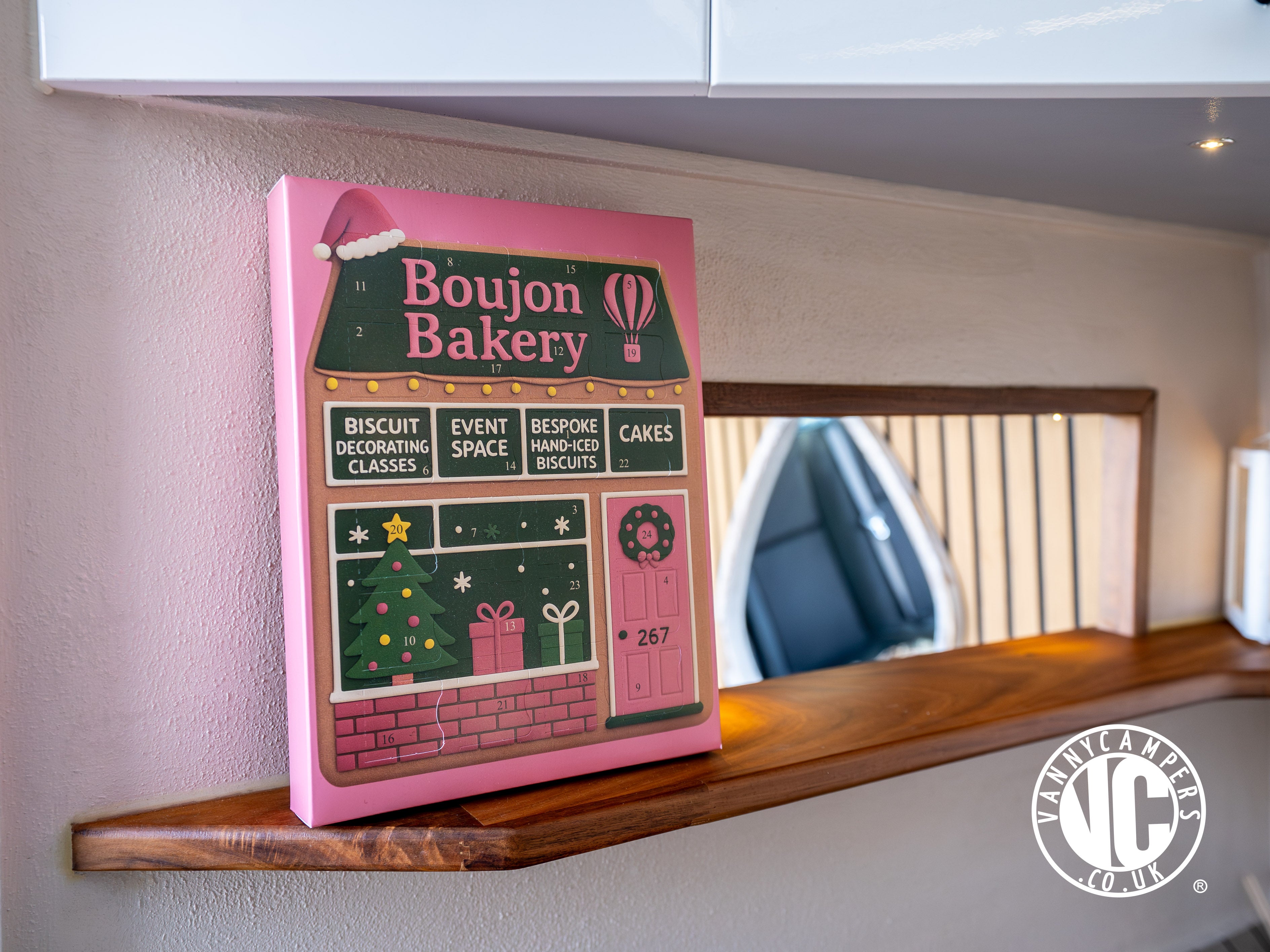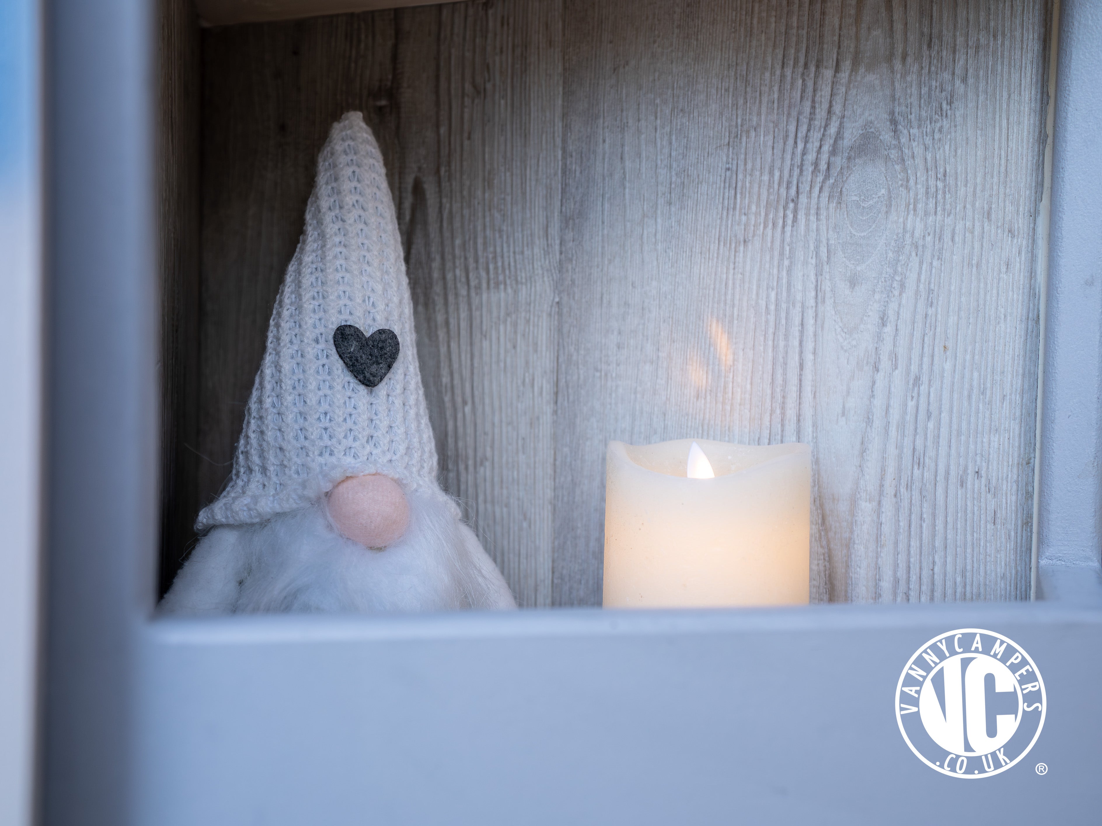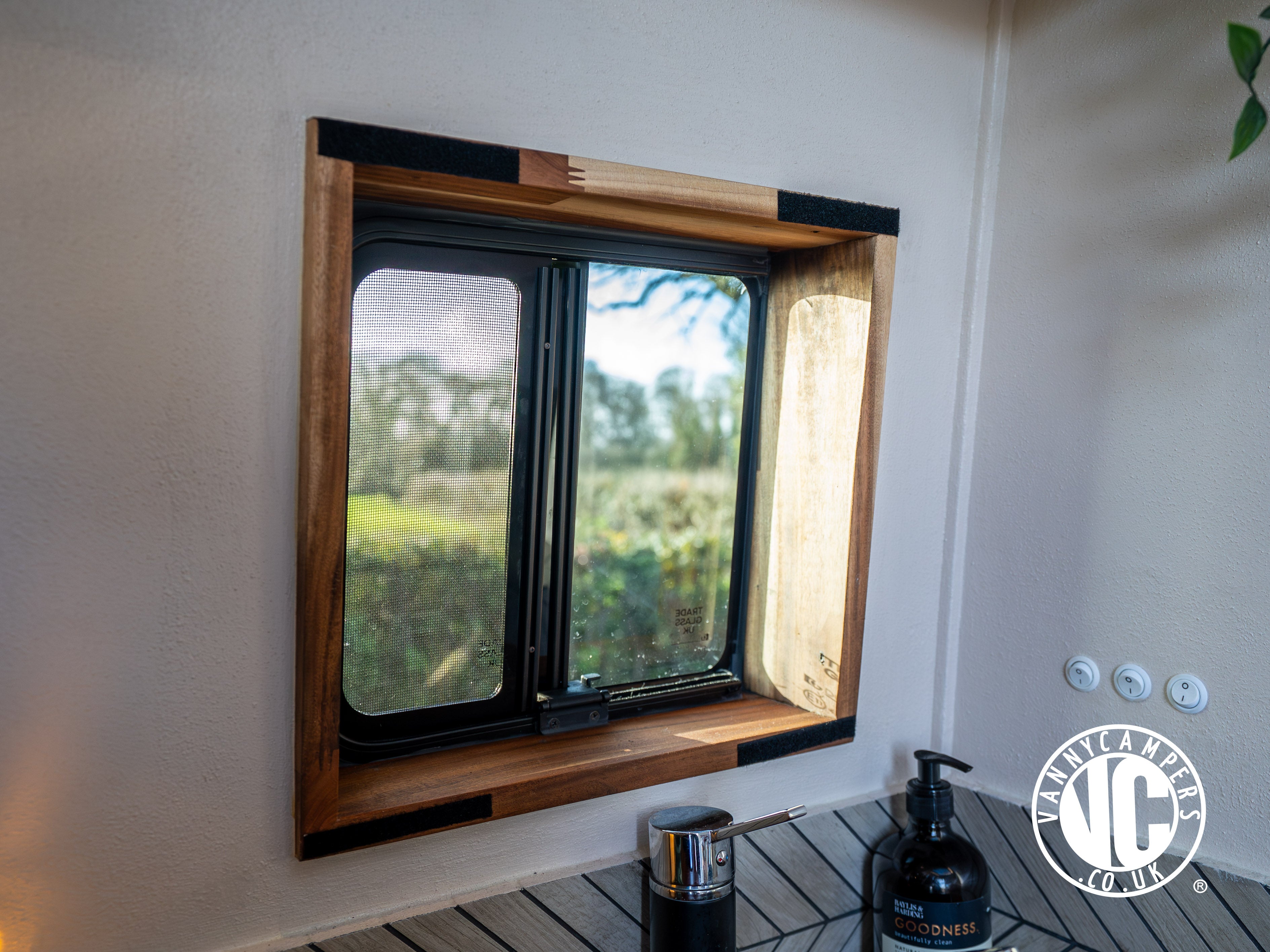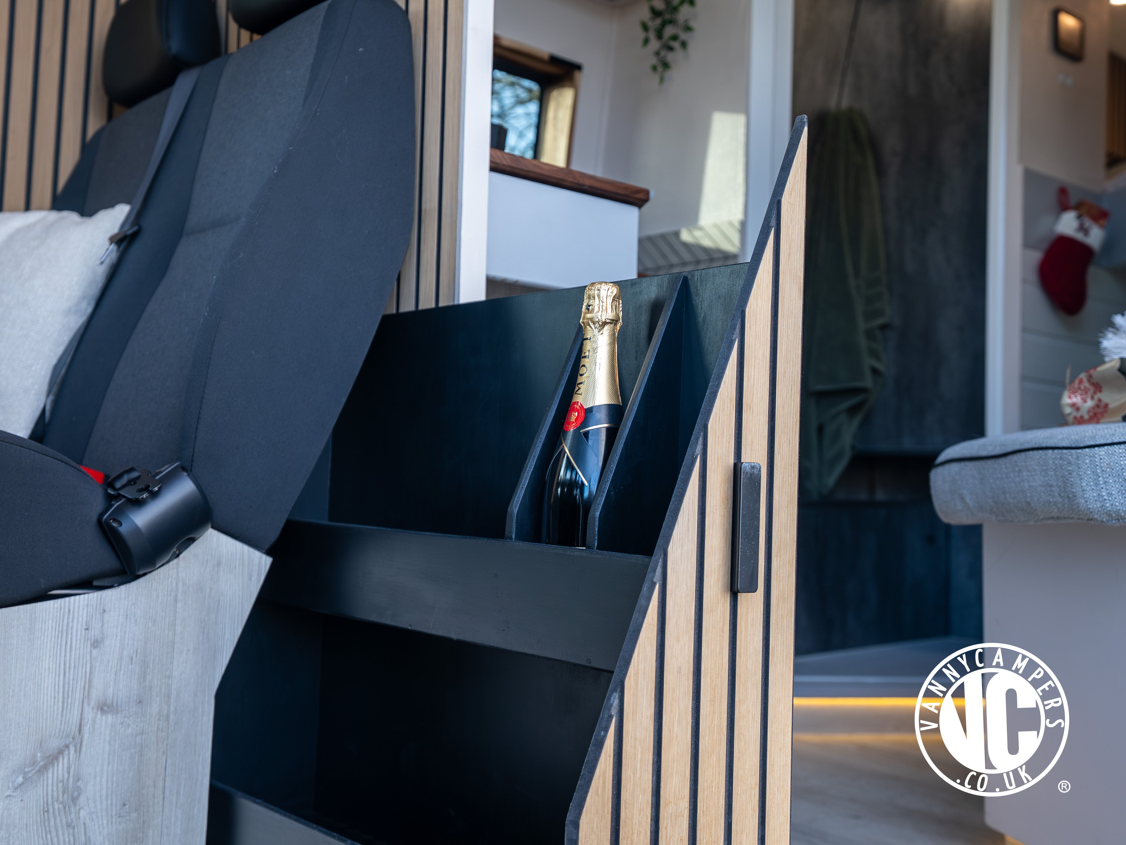 This vibrant living area is truly the one! With seating and dining for five, there's room for everyone to relax and enjoy the journey. Plentiful storage awaits beneath both double seats, ensuring that every item has its place keeping the space tidy and organised. With two handmade wooden swivel tables this space is perfect for dining, working, or playing games late into the night. Sit back, relax and admire the view through the sliding door pop-out window, complete with an integral blind for privacy when needed. This camper comes with luxury Nordic iced wood LVT flooring and its very own hidden pull-out storage draw which doubles up as a wine cellar!