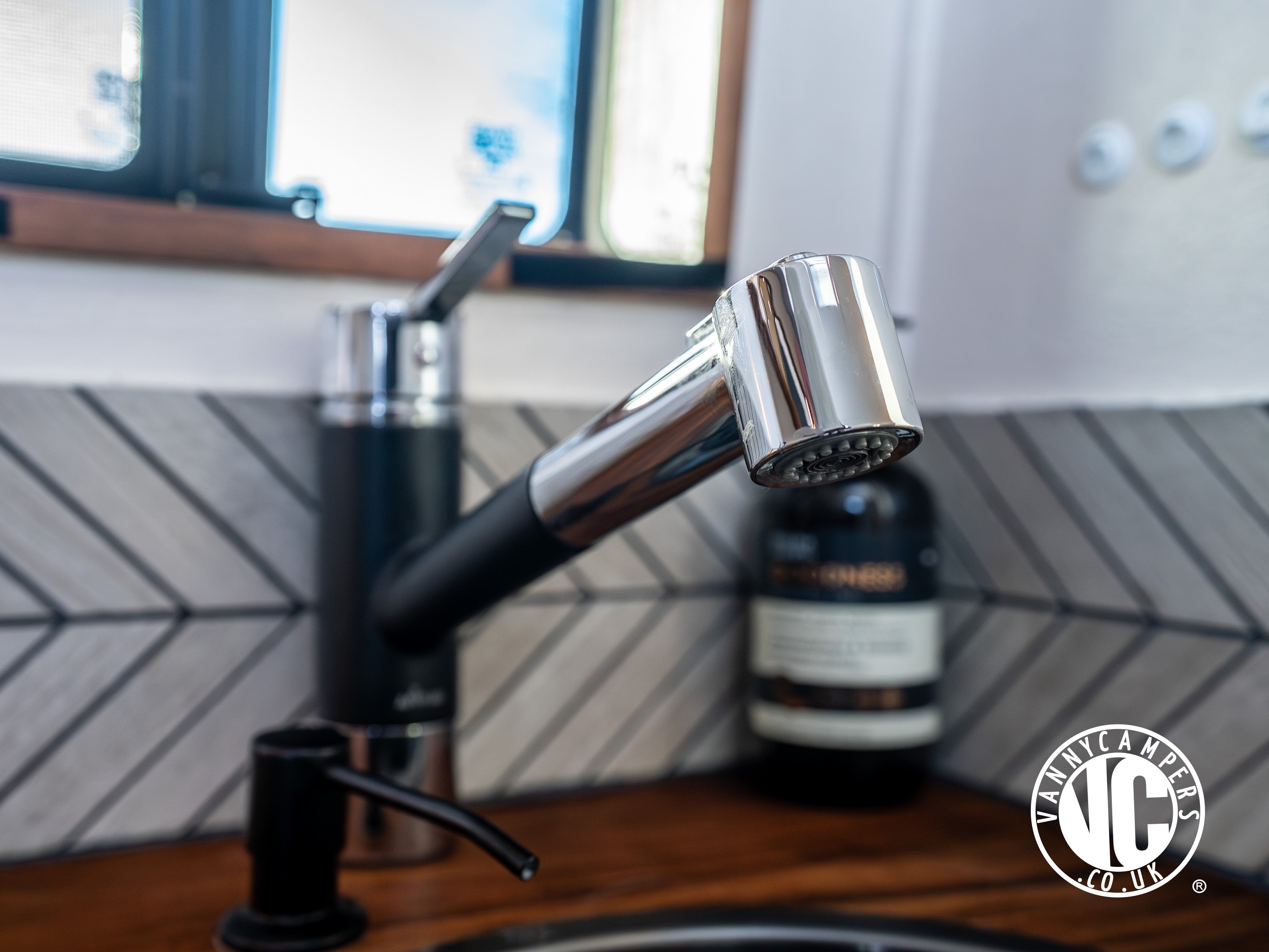 This kitchen is an absolute beauty, with a uniquely angled design and Acacia natural wooden worktops that beg to be cooked upon. The Vango twin induction hob and a pop-up electrical socket featuring multiple ports make cooking on the road a breeze. Enjoy the sunshine and fresh air through the sliding kitchen window with an integral fly screen, while the feature real tiles and textured earthy walls add charm. Stay organised with bespoke open-ended shelves and illuminate your space with mood lighting. Cleanup is too easy with a pull-out mixer tap and scratch-resistant sink, while the Vitro Frigo 50L slimline fridge/freezer keeps ingredients fresh. Get ready to whip up delicious meals and unforgettable memories in this compact yet fully-equipped kitchen!