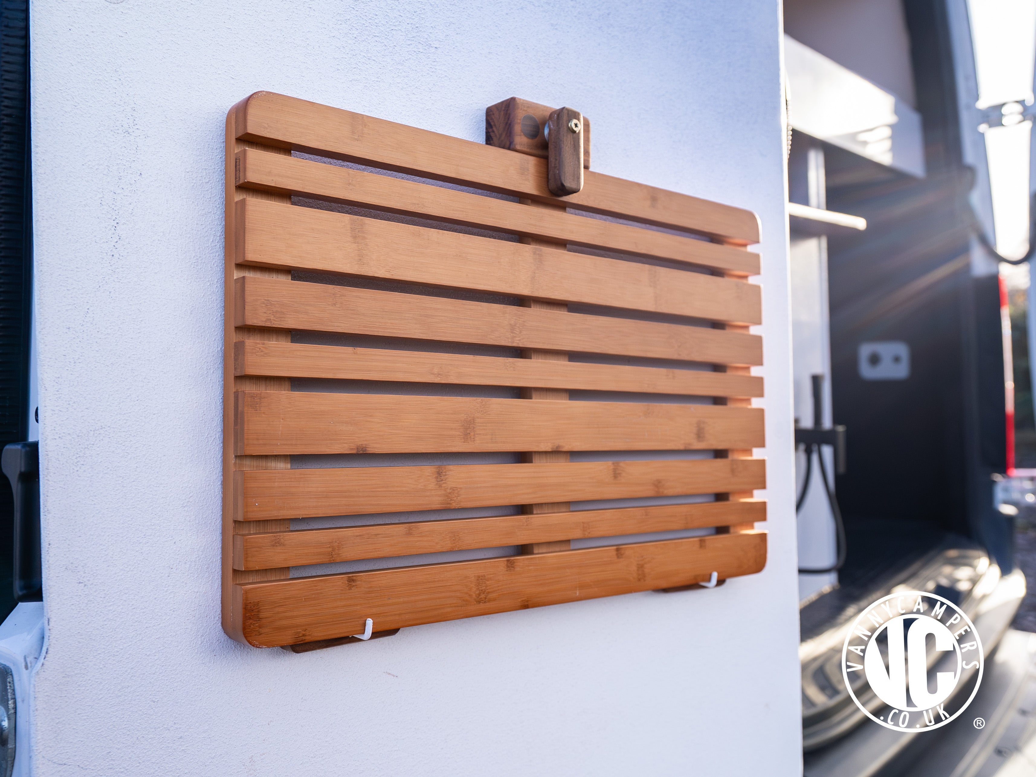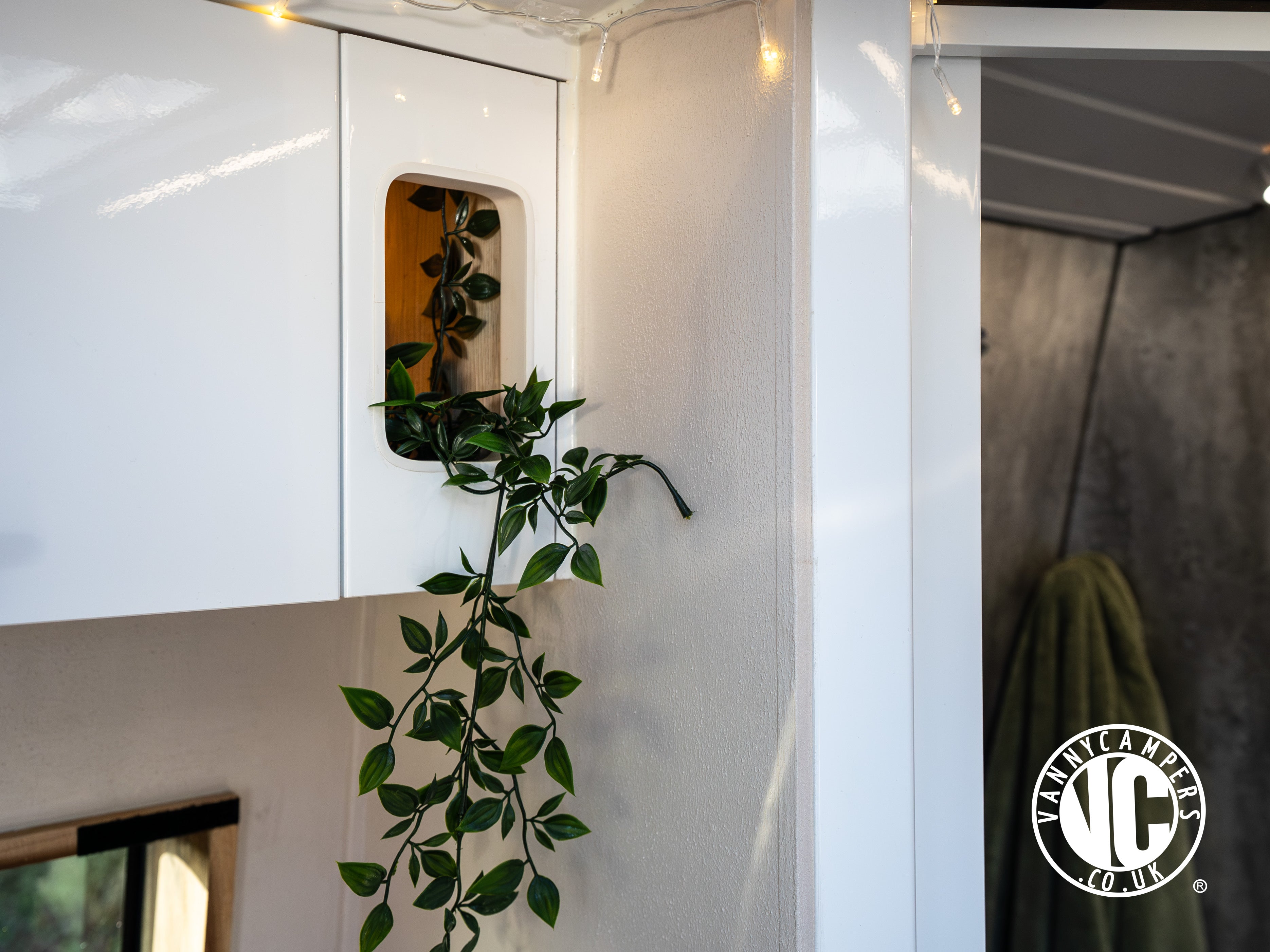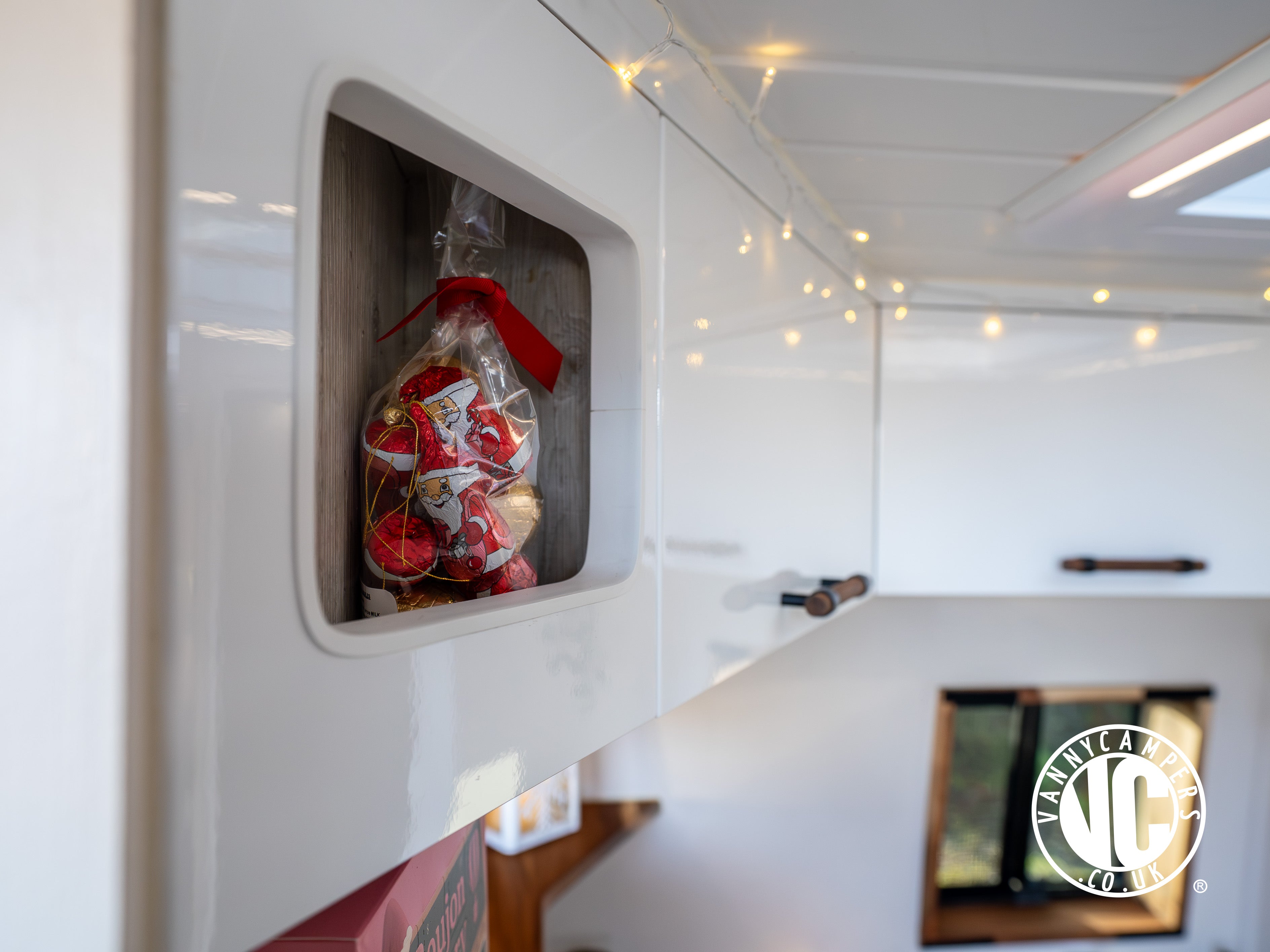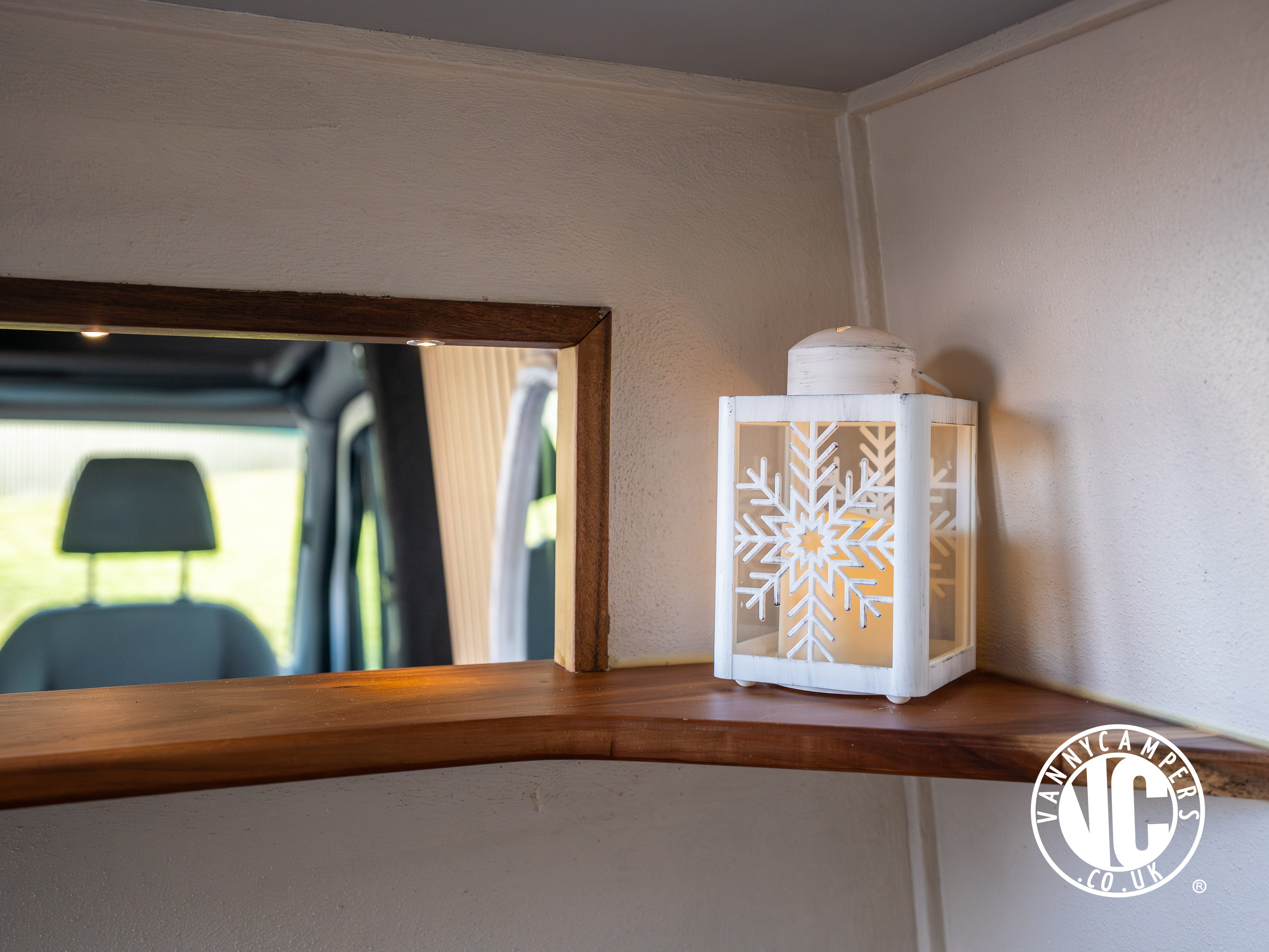 Anyone fancy a hot outdoor shower? Well Sasha has you covered! With the second shower situated at the back and featuring a duckboard, this luxury bonus is ready and waiting to wash off the mucky pups or yourself after a day of adventure. Ample storage and shelves are cleverly integrated, providing a place for all your essentials, keeping your space tidy and organised. Admire the feature look through sideboard, illuminated with soft lighting, where you can store towels and other necessities within arm's reach. From the invigorating shower experience to the thoughtful storage solutions, this campervan is designed to elevate your travel experience to new heights of comfort and convenience.