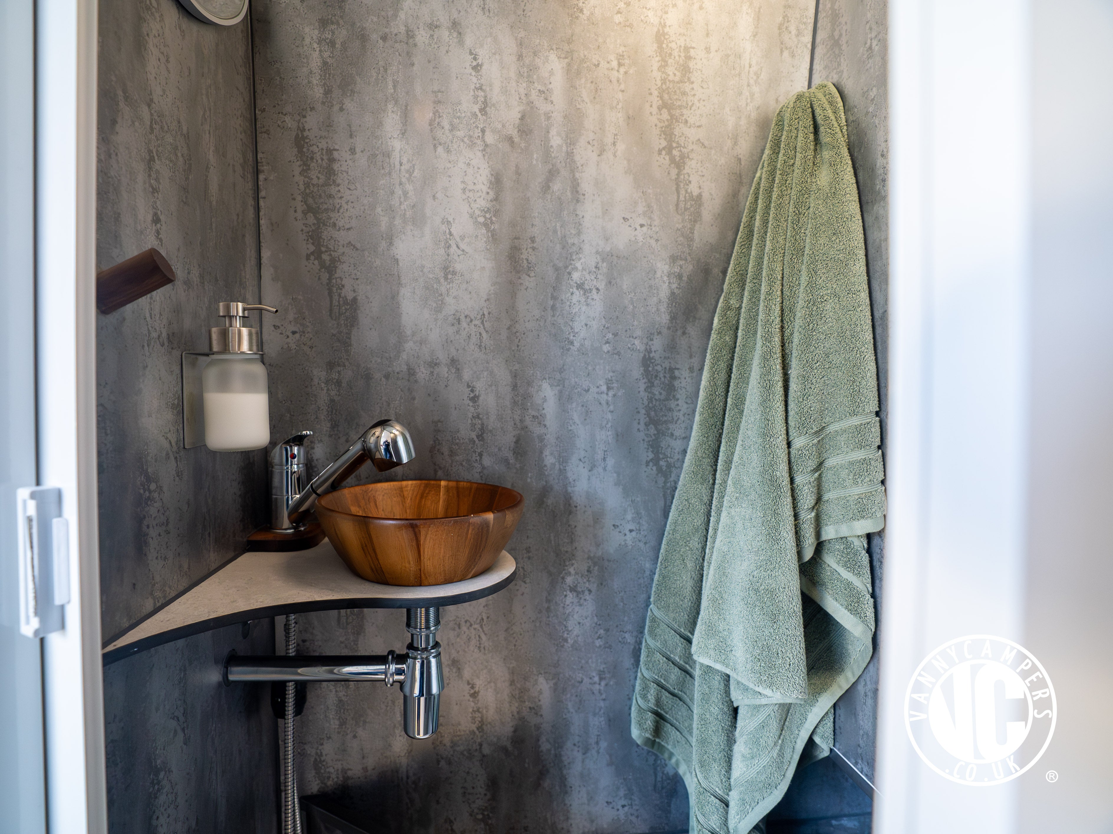 This bathroom is all about comfort and convenience. With its clever angled design, this space creates a feeling of spaciousness, ensuring you feel relaxed and at ease. Luxurious stone effect walls and a wooden acacia sink add a touch of elegance, while a heater vent doubles as a drying room for warm towels. You can sit back and enjoy the convenience of a mixer tap with a pull-out shower head for easy rinsing. Not only that but the opaque shower door is self- cleaning which ensures effortless maintenance and a pristine appearance. That’s a win in our opinion, no nagging the other half or mates to clean up.